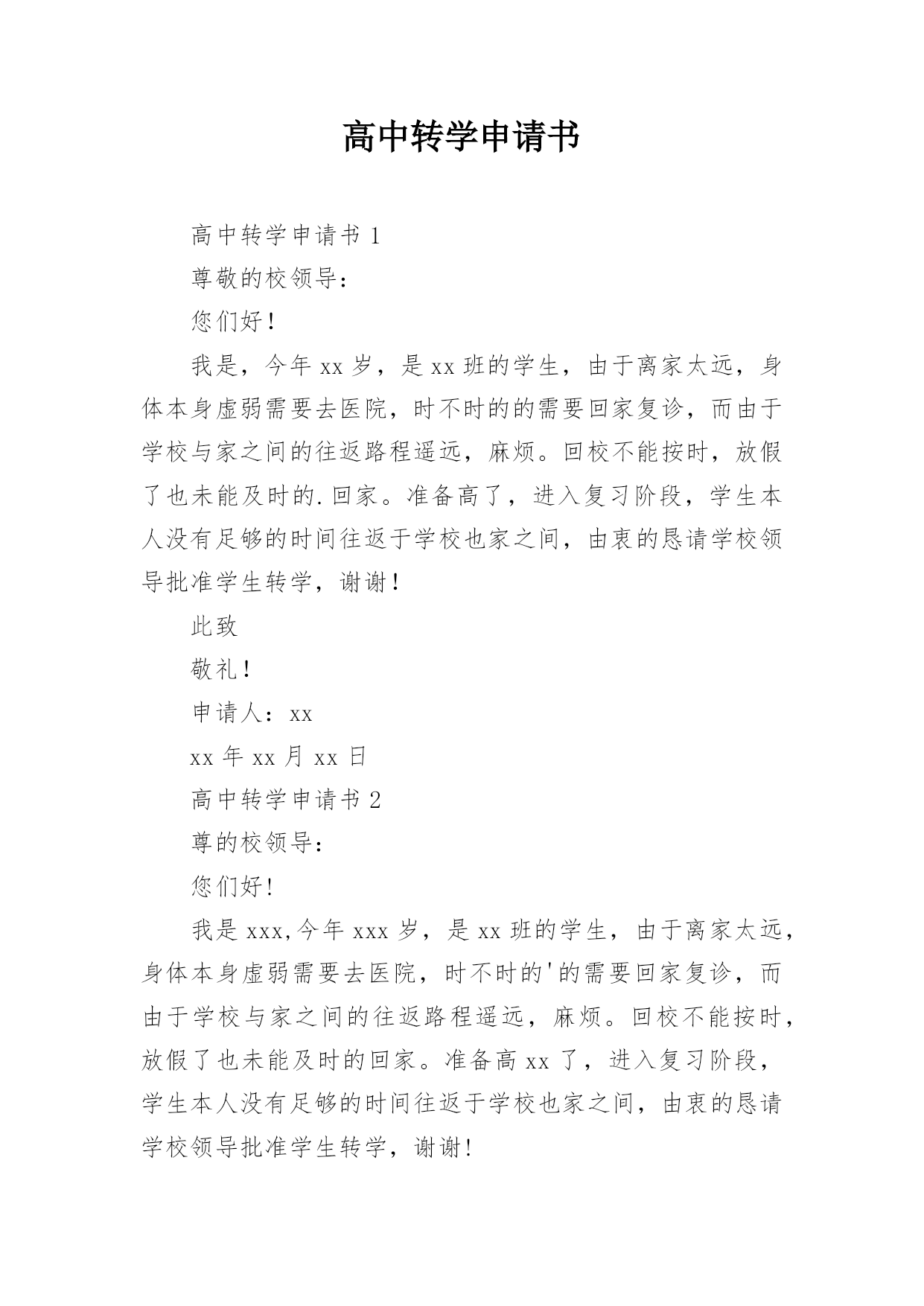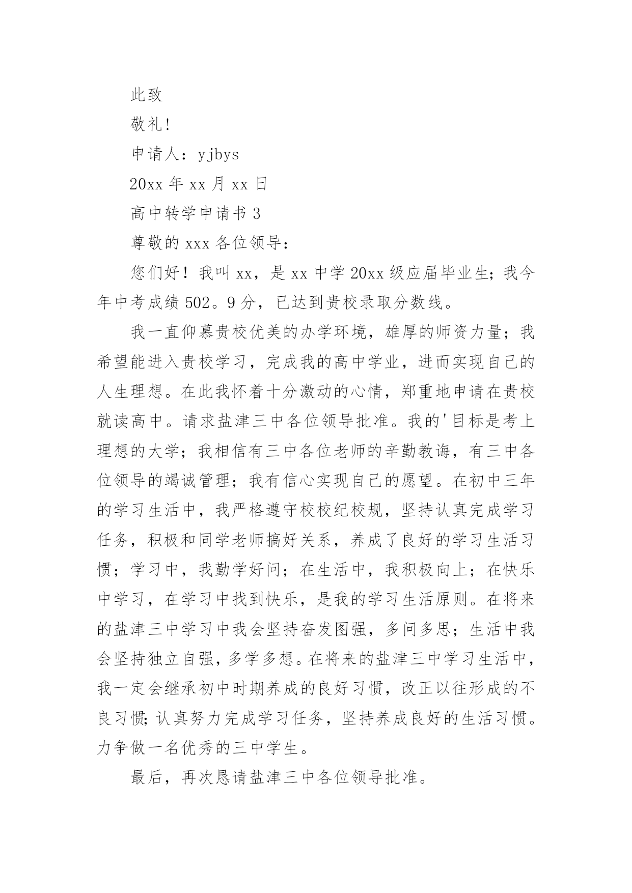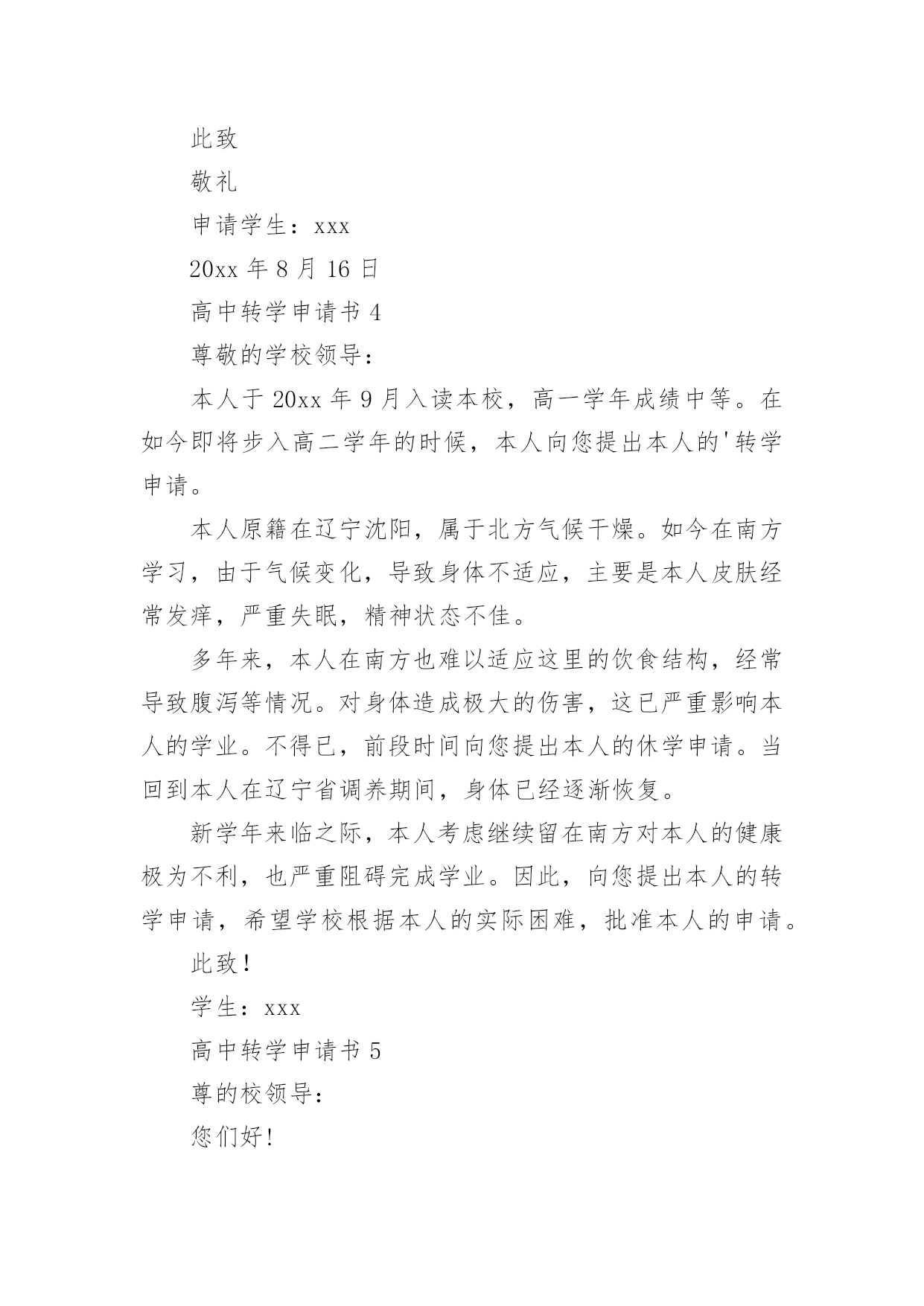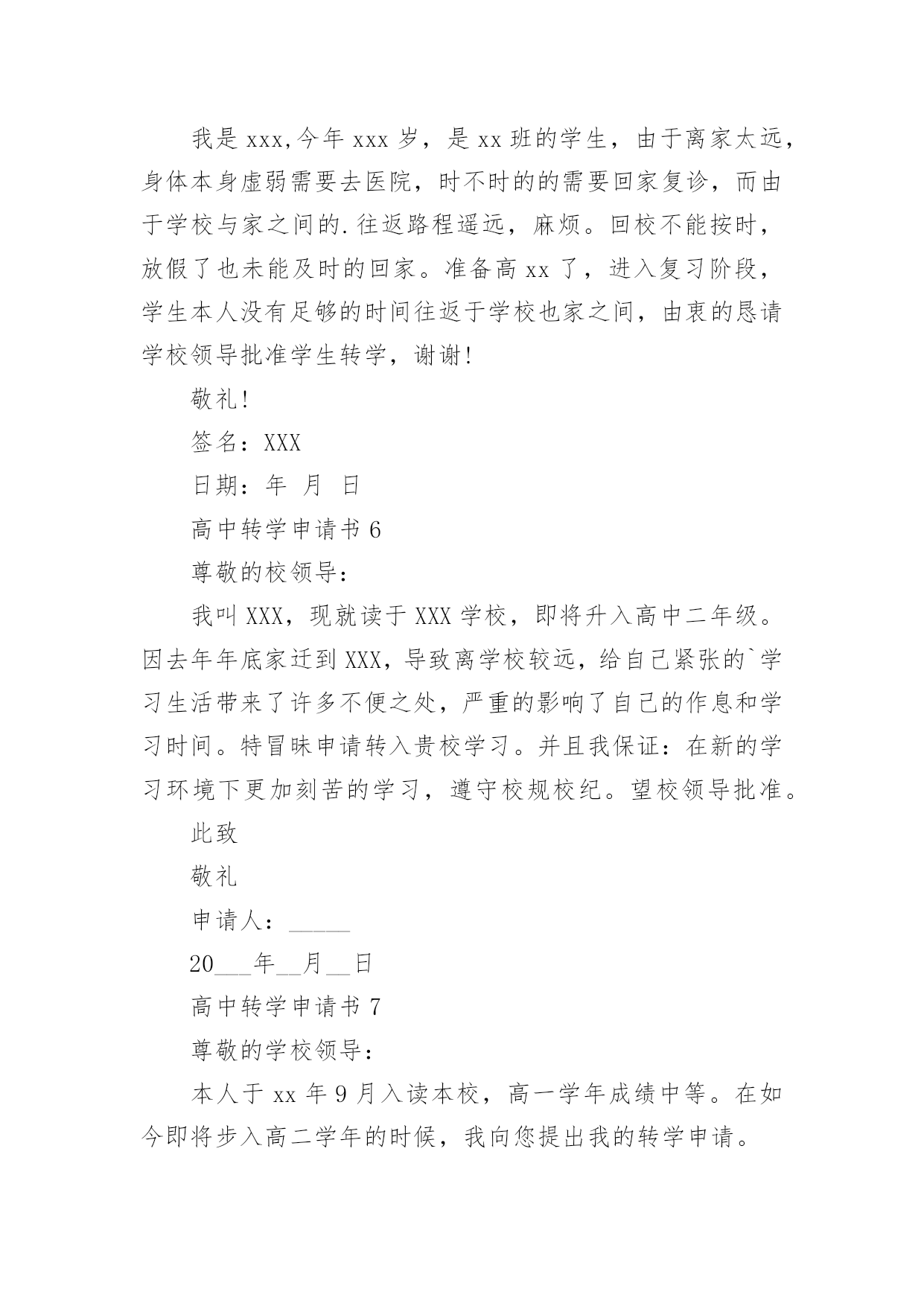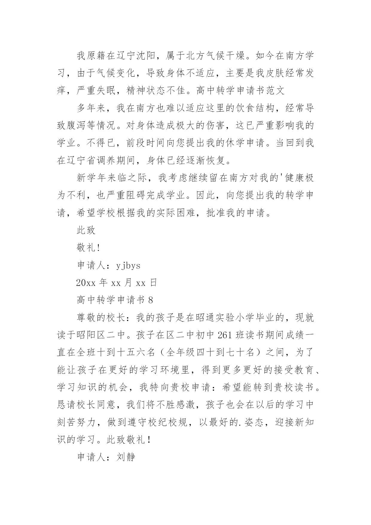 高中转学申请书 高中转学申请书1尊敬的校领导:您们好!我是,今年xx岁,是xx班的学生,由于离家太远,身体本身虚弱需要去医院,时不时的的需要回家复诊,而由于学校与家之间的往返路程遥远,麻烦。回校不能按时,放假了也未能及时的.回家。准备高了,进入复习阶段,学生本人没有足够的时间往返于学校也家之间,由衷的恳请学校领导批准学生转学,谢谢!此致敬礼!申请人:xxxx年xx月xx日高中转学申请书2尊的校领导:您们好!我是xxx,今年xxx岁,是xx班的学生,由于离家太远,身体本身虚弱需要去医院,时不时的'的需要回家复诊,而由于学校与家之间的往返路程遥远,麻烦。回校不能按时,放假了也未能及时的回家。准备高xx了,进入复习阶段,学生本人没有足够的时间往返于学校也家之间,由衷的恳请学校领导批准学生转学,谢谢!此致敬礼!申请人:yjbys20xx年xx月xx日高中转学申请书3尊敬的xxx各位领导:您们好!我叫xx,是xx中学20xx级应届毕业生;我今年中考成绩502。9分,已达到贵校录取分数线。我一直仰慕贵校优美的办学环境,雄厚的师资力量;我希望能进入贵校学习,完成我的高中学业,进而实现自己的人生理想。在此我怀着十分激动的心情,郑重地申请在贵校就读高中。请求盐津三中各位领导批准。我的'目标是考上理想的大学;我相信有三中各位老师的辛勤教诲,有三中各位领导的竭诚管理;我有信心实现自己的愿望。在初中三年的学习生活中,我严格遵守校校纪校规,坚持认真完成学习任务,积极和同学老师搞好关系,养成了良好的学习生活习惯;学习中,我勤学好问;在生活中,我积极向上;在快乐中学习,在学习中找到快乐,是我的学习生活原则。在将来的盐津三中学习中我会坚持奋发图强,多问多思;生活中我会坚持独立自强,多学多想。在将来的盐津三中学习生活中,我一定会继承初中时期养成的良好习惯,改正以往形成的不良习惯;认真努力完成学习任务,坚持养成良好的生活习惯。力争做一名优秀的三中学生。最后,再次恳请盐津三中各位领导批准。此致敬礼申请学生:xxx20xx年8月16日高中转学申请书4尊敬的学校领导:本人于20xx年9月入读本校,高一学年成绩中等。在如今即将步入高二学年的时候,本人向您提出本人的'转学申请。本人原籍在辽宁沈阳,属于北方气候干燥。如今在南方学习,由于气候变化,导致身体不适应,主要是本人皮肤经常发痒,严重失眠,精神状态不佳。多年来,本人在南方也难以适应这里的饮食结构,经常导致腹泻等情况。对身体造成极大的伤害,这已严重影响本人的学业。不得已,前段时间向您提出本人的休学申请。当回到本人在辽宁省调养期间,身体已经逐渐恢复。新学年来临之际,本人考虑继续留在南方对本人的健康极为不利,也严重阻碍完成学业。因此,向您提出本人的转学申请,希望学校根据本人的实际困难,批准本人的申请。此致!学生:xxx高中转学申请书5尊的校领导:您们好!我是xxx,今年xxx岁,是xx班的学生,由于离家太远,身体本身虚弱需要去医院,时不时的的需要回家复诊,而由于学校与家之间的.往返路程遥远,麻烦。回校不能按时,放假了也未能及时的回家。准备高xx了,进入复习阶段,学生本人没有足够的时间往返于学校也家之间,由衷的恳请学校领导批准学生转学,谢谢!敬礼!签名:XXX日期:年月日高中转学申请书6尊敬的校领导:我叫XXX,现就读于XXX学校,即将升入高中二年级。因去年年底家迁到XXX,导致离学校较远,给自己紧张的`学习生活带来了许多不便之处,严重的影响了自己的作息和学习时间。特冒昧申请转入贵校学习。并且我保证:在新的学习环境下更加刻苦的学习,遵守校规校纪。望校领导批准。此致敬礼申请人:_____20___年__月__日高中转学申请书7尊敬的学校领导:本人于xx年9月入读本校,高一学年成绩中等。在如今即将步入高二学年的时候,我向您提出我的转学申请。我原籍在辽宁沈阳,属于北方气候干燥。如今在南方学习,由于气候变化,导致身体不适应,主要是我皮肤经常发痒,严重失眠,精神状态不佳。高中转学申请书范文多年来,我在南方也难以适应这里的饮食结构,经常导致腹泻等情况。对身体造成极大的伤害,这已严重影响我的学业。不得已,前段时间向您提出我的休学申请。当回到我在辽宁省调养期间,身体已经逐渐恢复。新学年来临之际,我考虑继续留在南方对我的'健康极为不利,也严重阻碍完成学业。因此,向您提出我的转学申请,希望学校根据我的实际困难,批准我的申请。此致敬礼!申请人:yjbys20xx年xx月xx日高中转学申请书8尊敬的校长:我的孩子是在昭通实验小学毕业的,现就读于昭阳区二中。孩子在区二中初中261班读书期间成绩一直在全班十到十五六名(全年级四十到七十名)之间,为了能让孩子在更好的学习环境里,得到更多更好的接受教育、学习知识的机会,我特向贵校申请:希望能转到贵校读书。恳