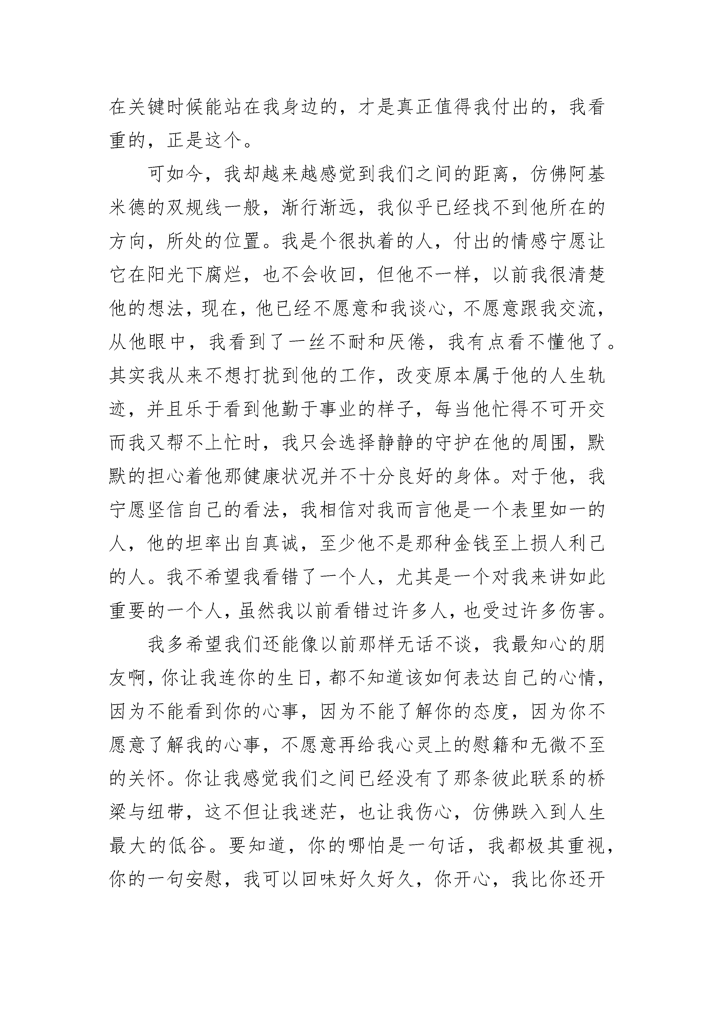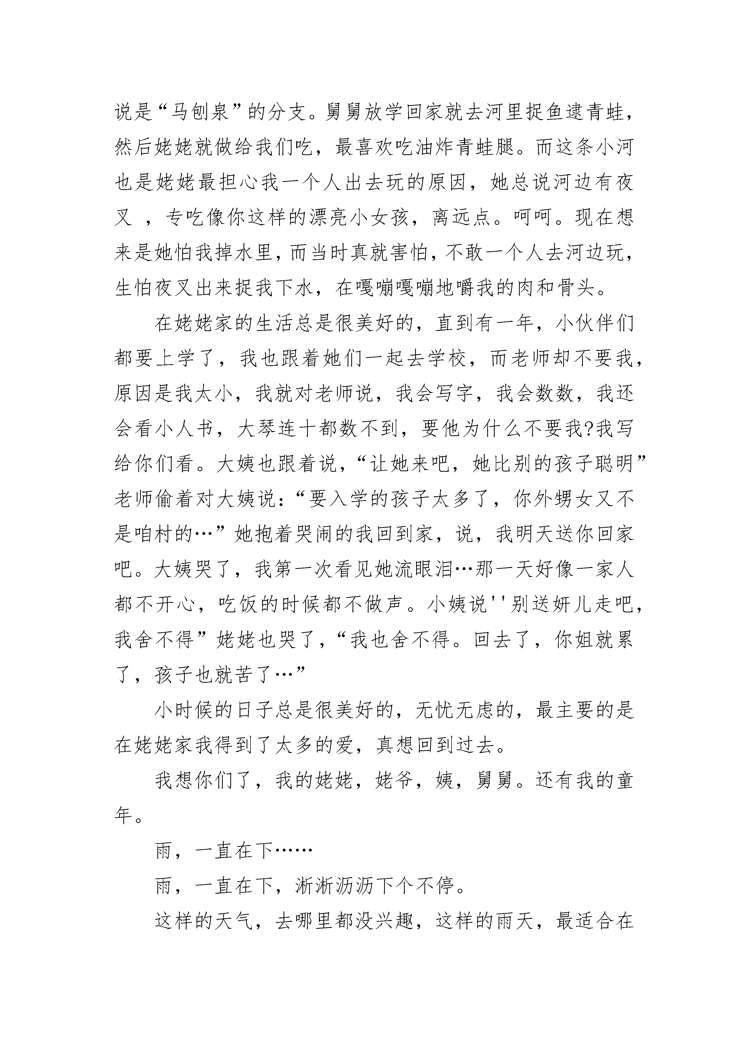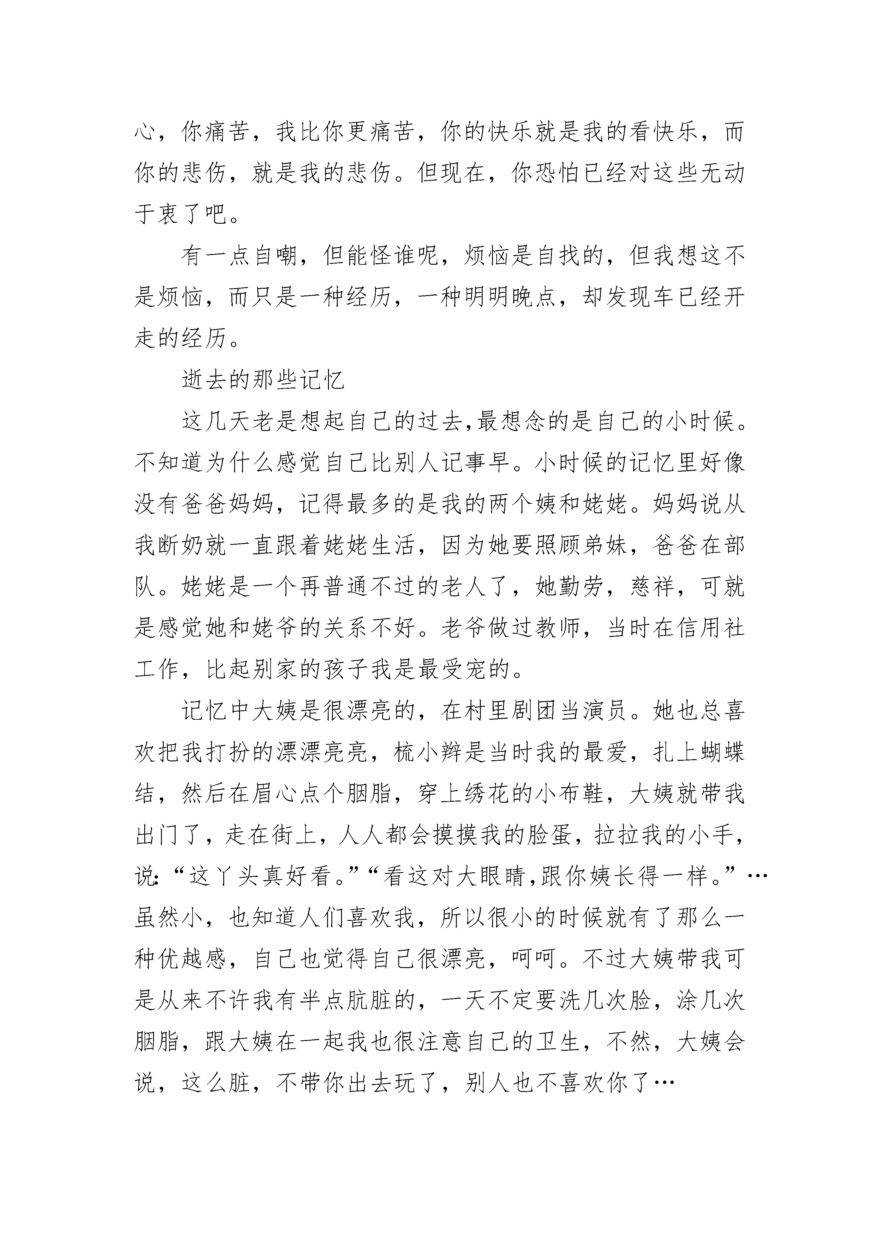 关于很悲的爱情文章晚点,车却开了对我来说生命中很重要的一个人快过生日了。本来我应该很高兴很快慰才对,但很遗憾,我高兴不起来,相反,内心却感觉到一丝丝冰凉,我不想用凄惨来形容我的心情,但事实却离此不远。我是一个无论在生活中还是思维上都比较细腻的人,虽然有的时候略显莽撞,有时候还会犯些许错误,但一直以来,我都深刻的检讨着自己,凡事谨慎。我的生活本来是毫无头绪,充满寂寞的,自从遇见他,活力就再一次从我的脑海里迸发出来,他是我唯一的知己,是我精神上独一无二的精神支柱,很多时候,只有他可以读懂我,而只在他面前,我也会彻底放开自己,时常表现出一种儿女之态。我一度认为,能够遇见像他这样善解人意的成熟的人,是我的福气,也是我的运气。我知道他拥有幸福的家庭,所以从来没有太多非分的想法,只希望他能够作为我唯一的,无话不谈的蓝颜知己,常伴身边,我就心满意足了。以前我没有太多感觉,现在我能够深切体会到:寂寞和冷酷是这个世界最常规的现实,而这时候有一个最知心的人为你开脱,那将如久旱的大地适逢甘霖,垂死的鱼儿蹦入清泉一般,是多么的爽心惬意。一直以来,他都是我心目中份量最重的人,我可以不遗余力的为他做任何事,而对他的默然与忽视,我从来都不以为意,因为在关键时候能站在我身边的,才是真正值得我付出的,我看重的,正是这个。可如今,我却越来越感觉到我们之间的距离,仿佛阿基米德的双规线一般,渐行渐远,我似乎已经找不到他所在的方向,所处的位置。我是个很执着的人,付出的情感宁愿让它在阳光下腐烂,也不会收回,但他不一样,以前我很清楚他的想法,现在,他已经不愿意和我谈心,不愿意跟我交流,从他眼中,我看到了一丝不耐和厌倦,我有点看不懂他了。其实我从来不想打扰到他的工作,改变原本属于他的人生轨迹,并且乐于看到他勤于事业的样子,每当他忙得不可开交而我又帮不上忙时,我只会选择静静的守护在他的周围,默默的担心着他那健康状况并不十分良好的身体。对于他,我宁愿坚信自己的看法,我相信对我而言他是一个表里如一的人,他的坦率出自真诚,至少他不是那种金钱至上损人利己的人。我不希望我看错了一个人,尤其是一个对我来讲如此重要的一个人,虽然我以前看错过许多人,也受过许多伤害。我多希望我们还能像以前那样无话不谈,我最知心的朋友啊,你让我连你的生日,都不知道该如何表达自己的心情,因为不能看到你的心事,因为不能了解你的态度,因为你不愿意了解我的心事,不愿意再给我心灵上的慰籍和无微不至的关怀。你让我感觉我们之间已经没有了那条彼此联系的桥梁与纽带,这不但让我迷茫,也让我伤心,仿佛跌入到人生最大的低谷。要知道,你的哪怕是一句话,我都极其重视,你的一句安慰,我可以回味好久好久,你开心,我比你还开心,你痛苦,我比你更痛苦,你的快乐就是我的看快乐,而你的悲伤,就是我的悲伤。但现在,你恐怕已经对这些无动于衷了吧。有一点自嘲,但能怪谁呢,烦恼是自找的,但我想这不是烦恼,而只是一种经历,一种明明晚点,却发现车已经开走的经历。逝去的那些记忆这几天老是想起自己的过去,最想念的是自己的小时候。不知道为什么感觉自己比别人记事早。小时候的记忆里好像没有爸爸妈妈,记得最多的是我的两个姨和姥姥。妈妈说从我断奶就一直跟着姥姥生活,因为她要照顾弟妹,爸爸在部队。姥姥是一个再普通不过的老人了,她勤劳,慈祥,可就是感觉她和姥爷的关系不好。老爷做过教师,当时在信用社工作,比起别家的孩子我是最受宠的。记忆中大姨是很漂亮的,在村里剧团当演员。她也总喜欢把我打扮的漂漂亮亮,梳小辫是当时我的最爱,扎上蝴蝶结,然后在眉心点个胭脂,穿上绣花的小布鞋,大姨就带我出门了,走在街上,人人都会摸摸我的脸蛋,拉拉我的小手,说:“这丫头真好看。”“看这对大眼睛,跟你姨长得一样。”…虽然小,也知道人们喜欢我,所以很小的时候就有了那么一种优越感,自己也觉得自己很漂亮,呵呵。不过大姨带我可是从来不许我有半点肮脏的,一天不定要洗几次脸,涂几次胭脂,跟大姨在一起我也很注意自己的卫生,不然,大姨会说,这么脏,不带你出去玩了,别人也不喜欢你了…姥姥家院子很大,菜园就在家里,那时候小姨总是在菜园里忙碌,最喜欢跟小姨一起种花,摘菜。菜园的四周都是小姨种的花,都是一些很普通的花,喇叭花、蝴蝶花、串红、小菊花,很漂亮,从远处看就是一个花园,走到近处才能看见里边的蔬菜。看到小姨忙碌,我就会在一边搬个小凳子看,听她给我讲这是什么花,那是什么菜,看我坐的久了,小姨就会在园子里摘个西红柿,或者小茄子之类的给我吃。小姨话不多,总记得我白天跟着大姨玩,晚上要跟着小姨睡。我的每件衣服小姨都要给我绣上漂亮的花,有的在领口,有的在口袋上,还有的在袖口,绣花鞋子都是小姨做的。而她的穿着却很很朴实。老爷脾气不好,但视我如“掌上明珠”,对我“言听计从”。每到礼拜天我最盼着老爷回来,他回来准会给我带好吃的果子——那