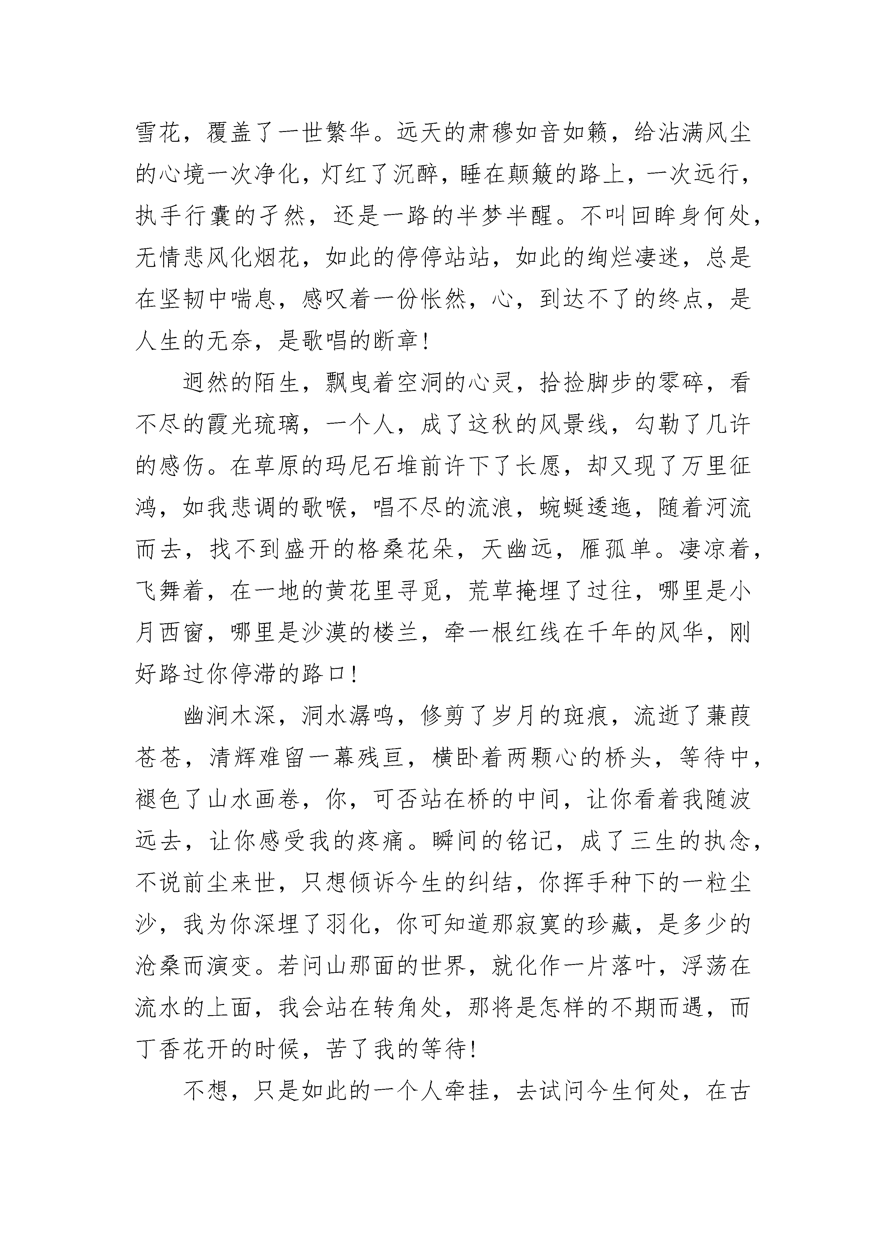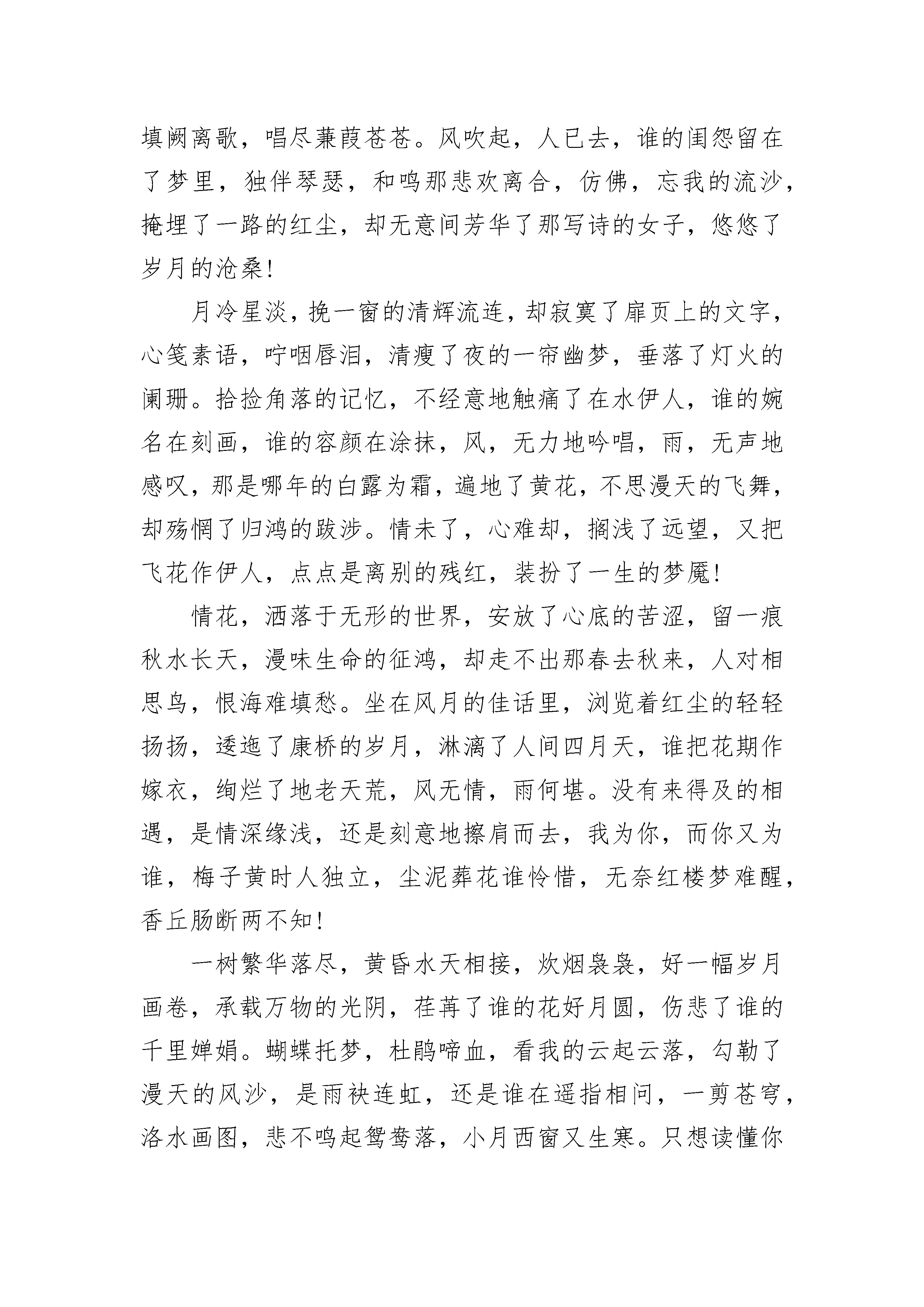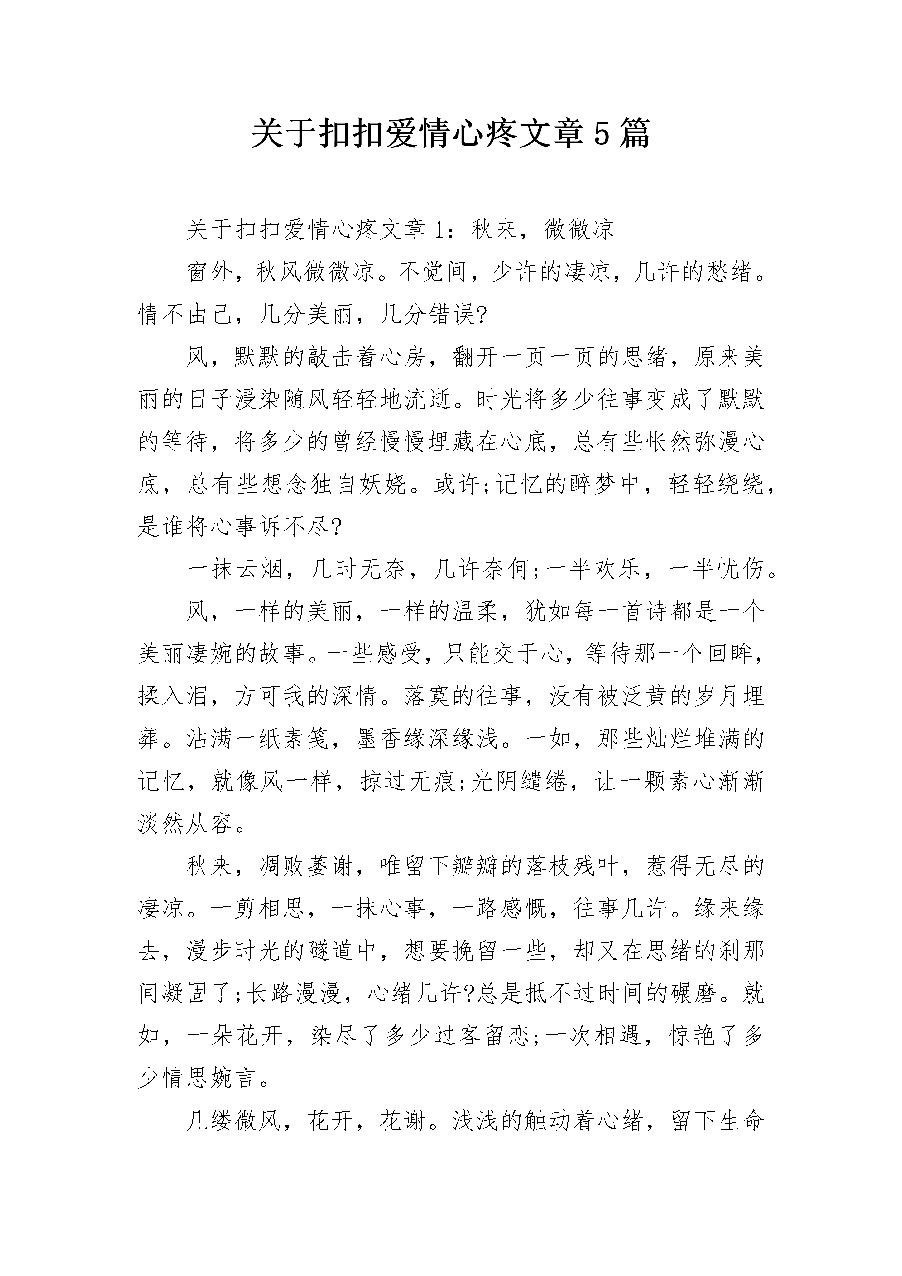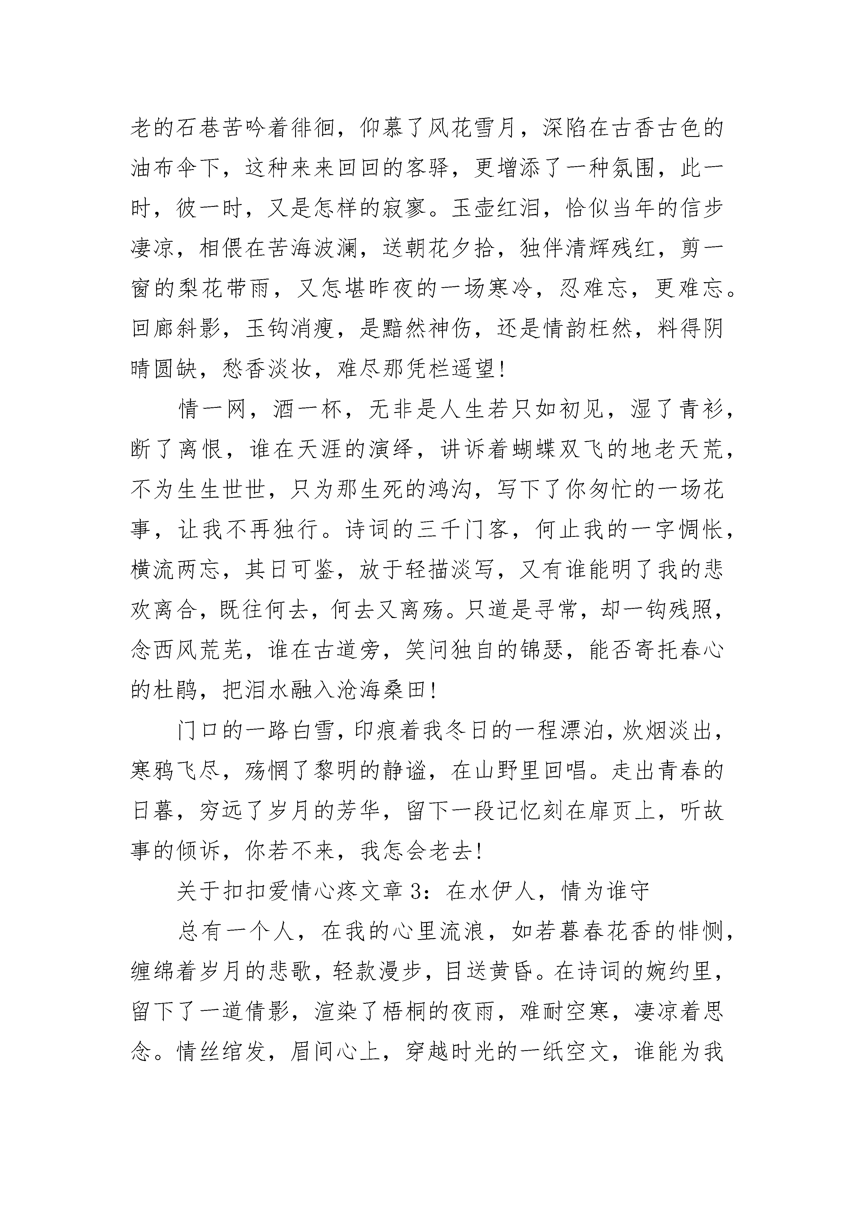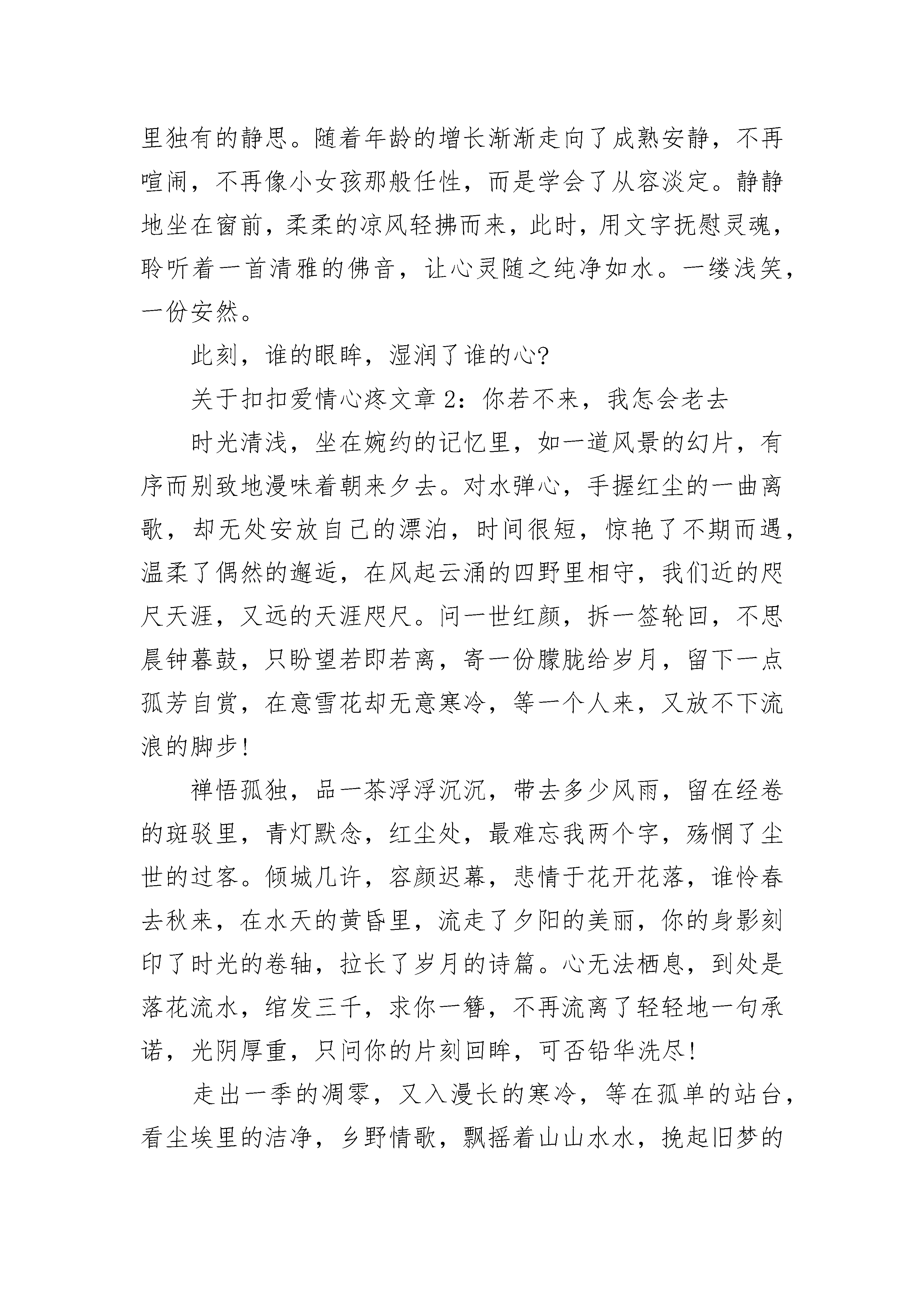 关于扣扣爱情心疼文章5篇关于扣扣爱情心疼文章1:秋来,微微凉窗外,秋风微微凉。不觉间,少许的凄凉,几许的愁绪。情不由己,几分美丽,几分错误?风,默默的敲击着心房,翻开一页一页的思绪,原来美丽的日子浸染随风轻轻地流逝。时光将多少往事变成了默默的等待,将多少的曾经慢慢埋藏在心底,总有些怅然弥漫心底,总有些想念独自妖娆。或许;记忆的醉梦中,轻轻绕绕,是谁将心事诉不尽?一抹云烟,几时无奈,几许奈何;一半欢乐,一半忧伤。风,一样的美丽,一样的温柔,犹如每一首诗都是一个美丽凄婉的故事。一些感受,只能交于心,等待那一个回眸,揉入泪,方可我的深情。落寞的往事,没有被泛黄的岁月埋葬。沾满一纸素笺,墨香缘深缘浅。一如,那些灿烂堆满的记忆,就像风一样,掠过无痕;光阴缱绻,让一颗素心渐渐淡然从容。秋来,凋败萎谢,唯留下瓣瓣的落枝残叶,惹得无尽的凄凉。一剪相思,一抹心事,一路感慨,往事几许。缘来缘去,漫步时光的隧道中,想要挽留一些,却又在思绪的刹那间凝固了;长路漫漫,心绪几许?总是抵不过时间的碾磨。就如,一朵花开,染尽了多少过客留恋;一次相遇,惊艳了多少情思婉言。几缕微风,花开,花谢。浅浅的触动着心绪,留下生命里独有的静思。随着年龄的增长渐渐走向了成熟安静,不再喧闹,不再像小女孩那般任性,而是学会了从容淡定。静静地坐在窗前,柔柔的凉风轻拂而来,此时,用文字抚慰灵魂,聆听着一首清雅的佛音,让心灵随之纯净如水。一缕浅笑,一份安然。此刻,谁的眼眸,湿润了谁的心?关于扣扣爱情心疼文章2:你若不来,我怎会老去时光清浅,坐在婉约的记忆里,如一道风景的幻片,有序而别致地漫味着朝来夕去。对水弹心,手握红尘的一曲离歌,却无处安放自己的漂泊,时间很短,惊艳了不期而遇,温柔了偶然的邂逅,在风起云涌的四野里相守,我们近的咫尺天涯,又远的天涯咫尺。问一世红颜,拆一签轮回,不思晨钟暮鼓,只盼望若即若离,寄一份朦胧给岁月,留下一点孤芳自赏,在意雪花却无意寒冷,等一个人来,又放不下流浪的脚步!禅悟孤独,品一茶浮浮沉沉,带去多少风雨,留在经卷的斑驳里,青灯默念,红尘处,最难忘我两个字,殇惘了尘世的过客。倾城几许,容颜迟幕,悲情于花开花落,谁怜春去秋来,在水天的黄昏里,流走了夕阳的美丽,你的身影刻印了时光的卷轴,拉长了岁月的诗篇。心无法栖息,到处是落花流水,绾发三千,求你一簪,不再流离了轻轻地一句承诺,光阴厚重,只问你的片刻回眸,可否铅华洗尽!走出一季的凋零,又入漫长的寒冷,等在孤单的站台,看尘埃里的洁净,乡野情歌,飘摇着山山水水,挽起旧梦的雪花,覆盖了一世繁华。远天的肃穆如音如籁,给沾满风尘的心境一次净化,灯红了沉醉,睡在颠簸的路上,一次远行,执手行囊的孑然,还是一路的半梦半醒。不叫回眸身何处,无情悲风化烟花,如此的停停站站,如此的绚烂凄迷,总是在坚韧中喘息,感叹着一份怅然,心,到达不了的终点,是人生的无奈,是歌唱的断章!迥然的陌生,飘曳着空洞的心灵,拾捡脚步的零碎,看不尽的霞光琉璃,一个人,成了这秋的风景线,勾勒了几许的感伤。在草原的玛尼石堆前许下了长愿,却又现了万里征鸿,如我悲调的歌喉,唱不尽的流浪,蜿蜒逶迤,随着河流而去,找不到盛开的格桑花朵,天幽远,雁孤单。凄凉着,飞舞着,在一地的黄花里寻觅,荒草掩埋了过往,哪里是小月西窗,哪里是沙漠的楼兰,牵一根红线在千年的风华,刚好路过你停滞的路口!幽涧木深,洞水潺鸣,修剪了岁月的斑痕,流逝了蒹葭苍苍,清辉难留一幕残亘,横卧着两颗心的桥头,等待中,褪色了山水画卷,你,可否站在桥的中间,让你看着我随波远去,让你感受我的疼痛。瞬间的铭记,成了三生的执念,不说前尘来世,只想倾诉今生的纠结,你挥手种下的一粒尘沙,我为你深埋了羽化,你可知道那寂寞的珍藏,是多少的沧桑而演变。若问山那面的世界,就化作一片落叶,浮荡在流水的上面,我会站在转角处,那将是怎样的不期而遇,而丁香花开的时候,苦了我的等待!不想,只是如此的一个人牵挂,去试问今生何处,在古老的石巷苦吟着徘徊,仰慕了风花雪月,深陷在古香古色的油布伞下,这种来来回回的客驿,更增添了一种氛围,此一时,彼一时,又是怎样的寂寥。玉壶红泪,恰似当年的信步凄凉,相偎在苦海波澜,送朝花夕拾,独伴清辉残红,剪一窗的梨花带雨,又怎堪昨夜的一场寒冷,忍难忘,更难忘。回廊斜影,玉钩消瘦,是黯然神伤,还是情韵枉然,料得阴晴圆缺,愁香淡妆,难尽那凭栏遥望!情一网,酒一杯,无非是人生若只如初见,湿了青衫,断了离恨,谁在天涯的演绎,讲诉着蝴蝶双飞的地老天荒,不为生生世世,只为那生死的鸿沟,写下了你匆忙的一场花事,让我不再独行。诗词的三千门客,何止我的一字惆怅,横流两忘,其日可鉴,放于轻描淡写,又有谁能明了我的悲欢离合,既往何去,何去又离殇。只道是寻常,却一钩残照,念西风荒芜,谁在古道旁,笑问独自的锦瑟,能否寄托春心的杜鹃,把泪