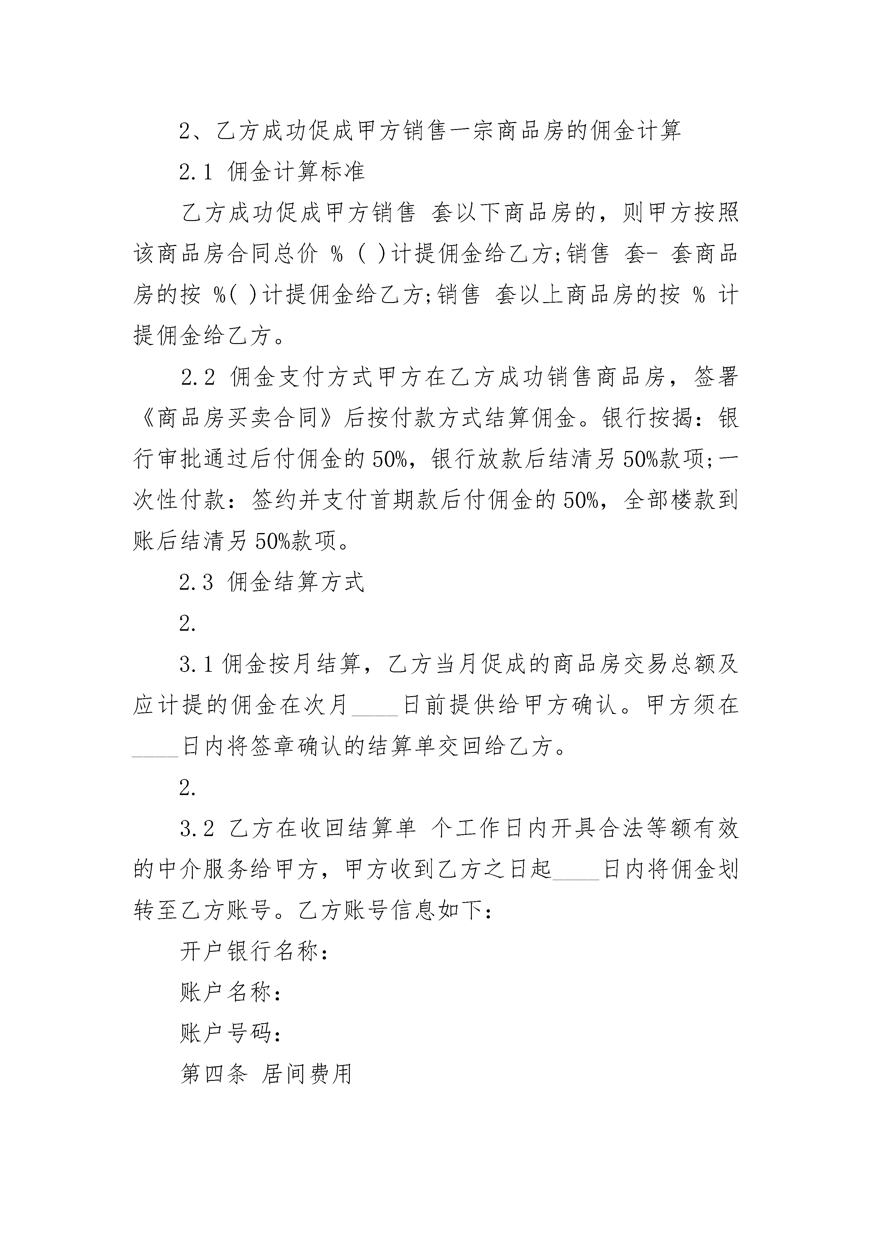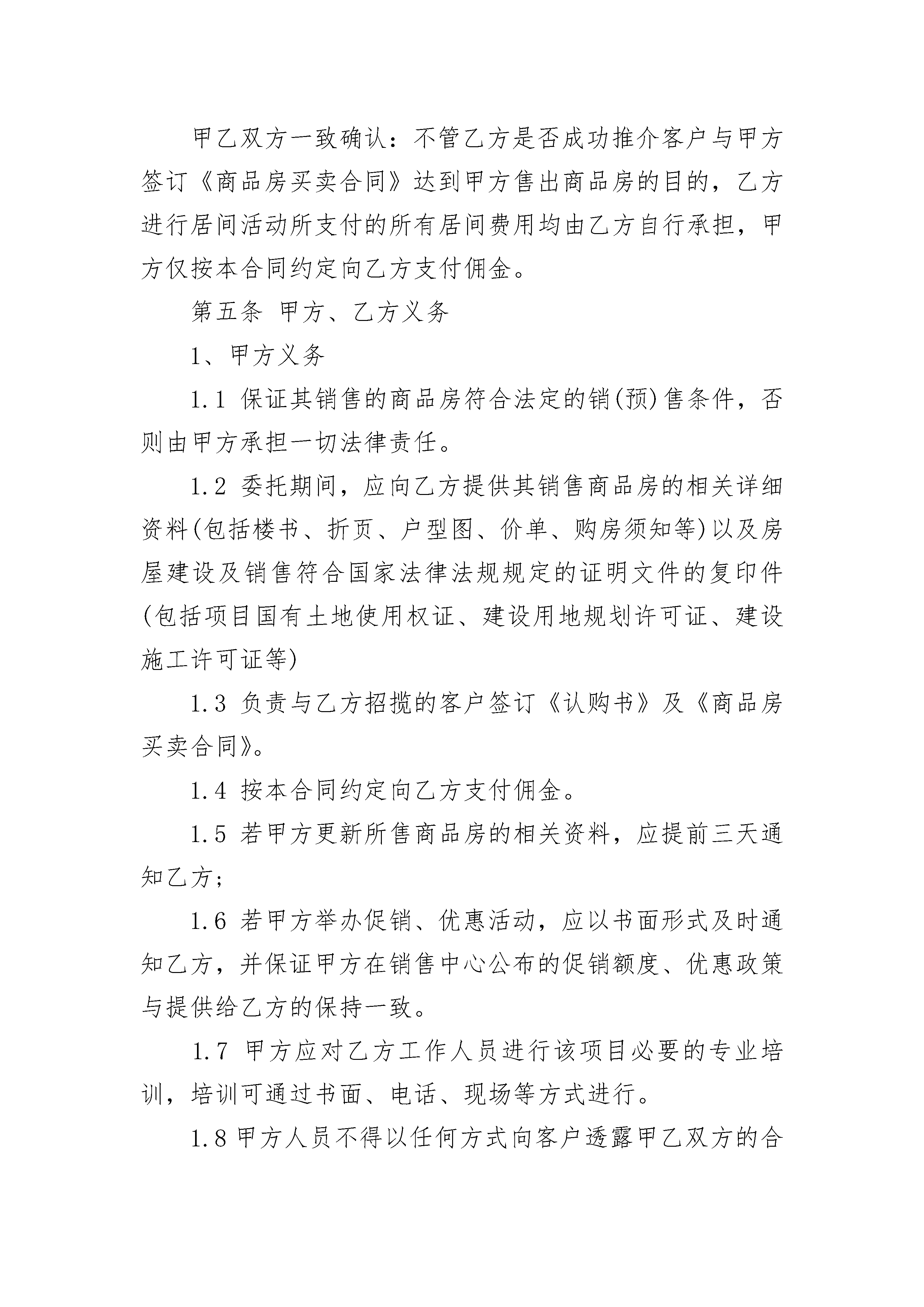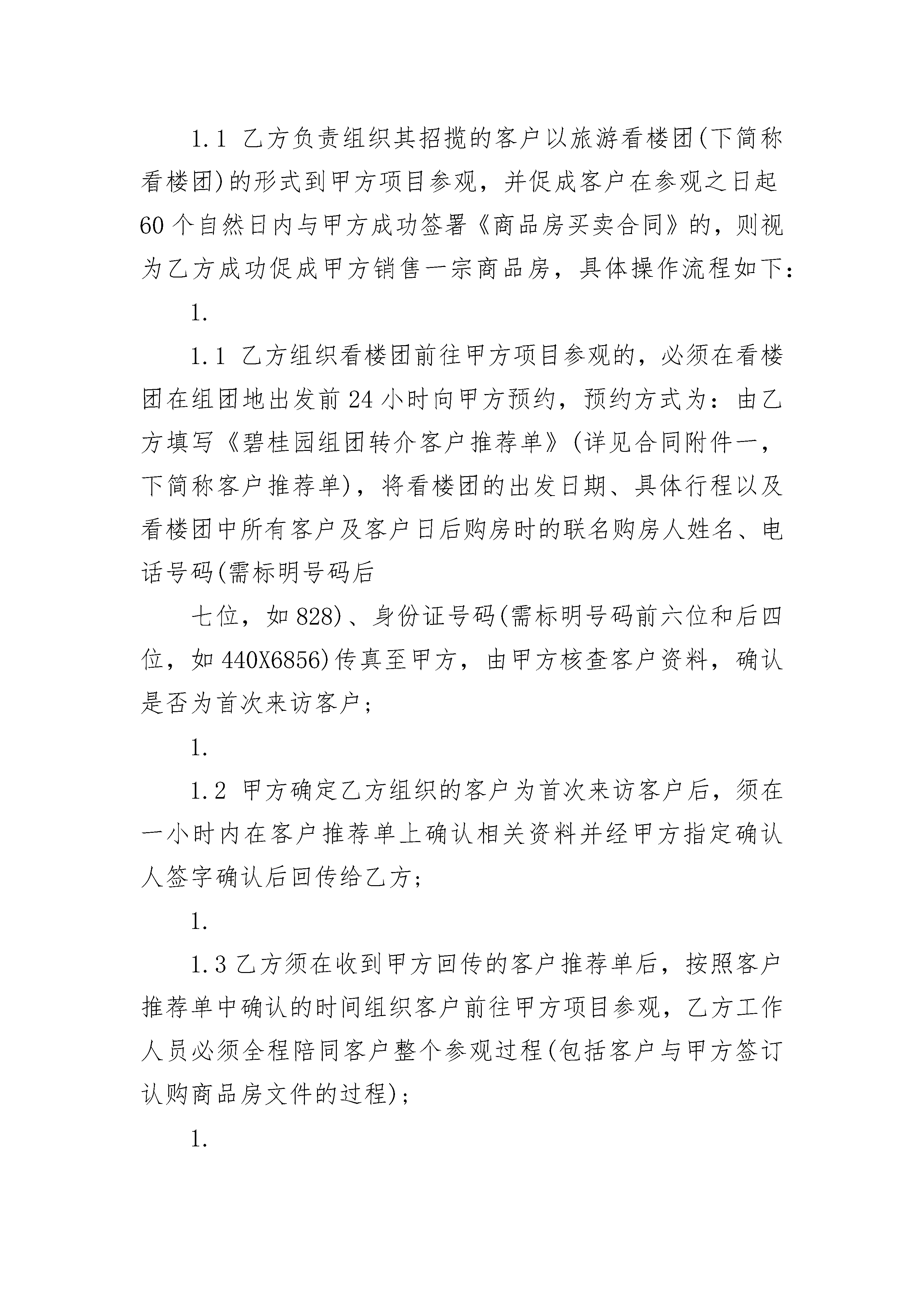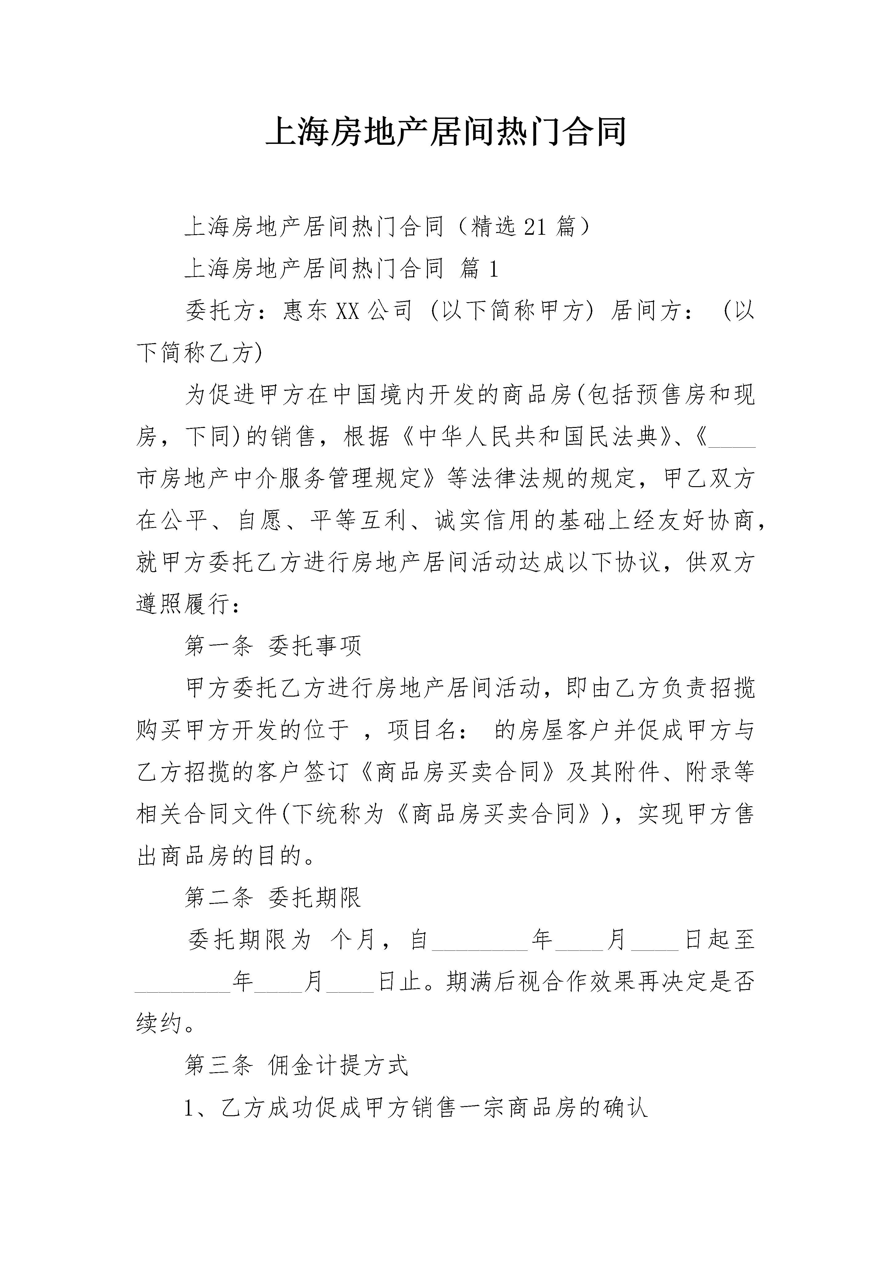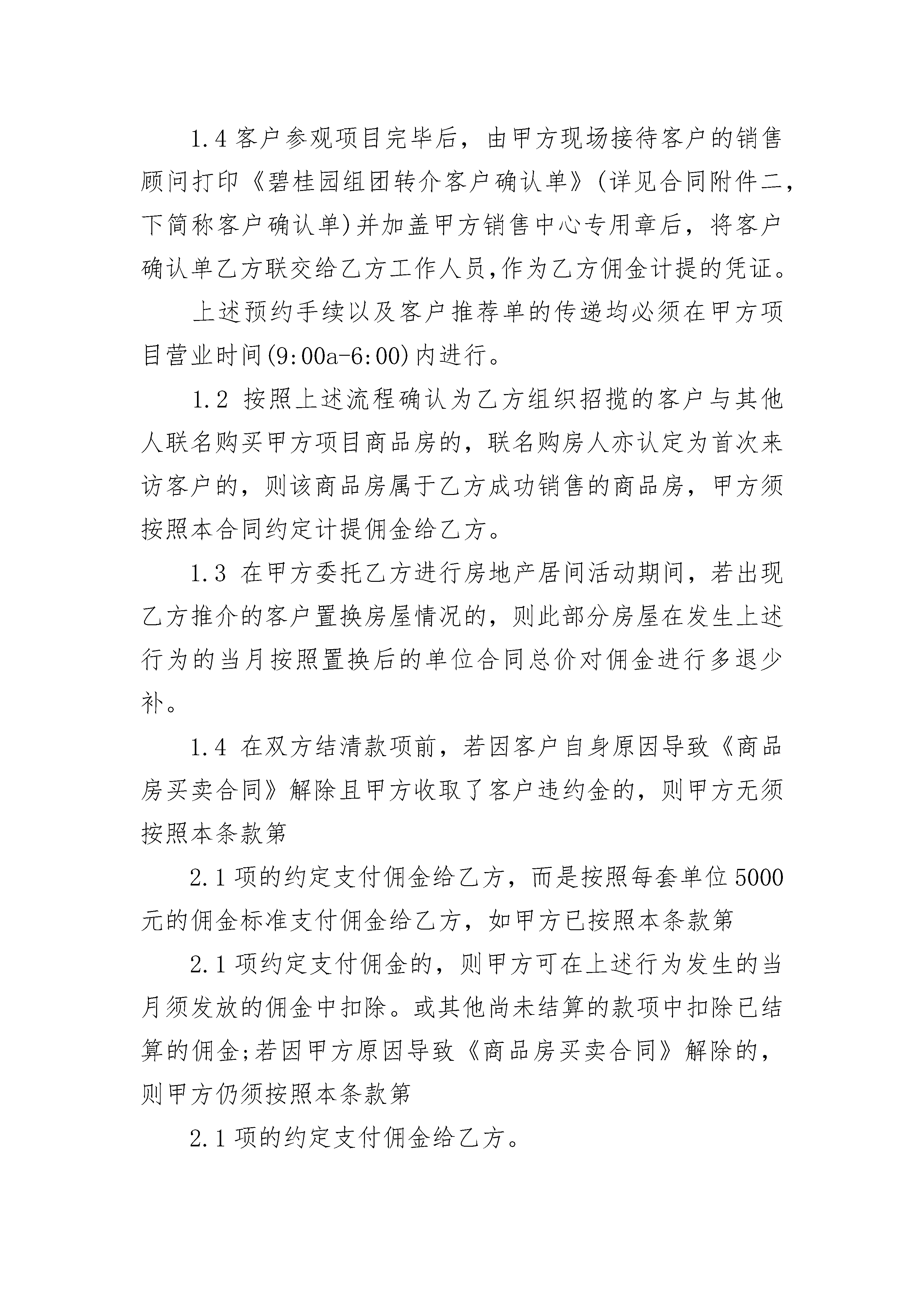 上海房地产居间热门合同上海房地产居间热门合同(精选21篇)上海房地产居间热门合同篇1委托方:惠东XX公司(以下简称甲方)居间方:(以下简称乙方)为促进甲方在中国境内开发的商品房(包括预售房和现房,下同)的销售,根据《中华人民共和国民法典》、《____市房地产中介服务管理规定》等法律法规的规定,甲乙双方在公平、自愿、平等互利、诚实信用的基础上经友好协商,就甲方委托乙方进行房地产居间活动达成以下协议,供双方遵照履行:第一条委托事项甲方委托乙方进行房地产居间活动,即由乙方负责招揽购买甲方开发的位于,项目名:的房屋客户并促成甲方与乙方招揽的客户签订《商品房买卖合同》及其附件、附录等相关合同文件(下统称为《商品房买卖合同》),实现甲方售出商品房的目的。第二条委托期限委托期限为个月,自________年____月____日起至________年____月____日止。期满后视合作效果再决定是否续约。第三条佣金计提方式1、乙方成功促成甲方销售一宗商品房的确认1.1乙方负责组织其招揽的客户以旅游看楼团(下简称看楼团)的形式到甲方项目参观,并促成客户在参观之日起60个自然日内与甲方成功签署《商品房买卖合同》的,则视为乙方成功促成甲方销售一宗商品房,具体操作流程如下:1.1.1乙方组织看楼团前往甲方项目参观的,必须在看楼团在组团地出发前24小时向甲方预约,预约方式为:由乙方填写《碧桂园组团转介客户推荐单》(详见合同附件一,下简称客户推荐单),将看楼团的出发日期、具体行程以及看楼团中所有客户及客户日后购房时的联名购房人姓名、电话号码(需标明号码后七位,如828)、身份证号码(需标明号码前六位和后四位,如440X6856)传真至甲方,由甲方核查客户资料,确认是否为首次来访客户;1.1.2甲方确定乙方组织的客户为首次来访客户后,须在一小时内在客户推荐单上确认相关资料并经甲方指定确认人签字确认后回传给乙方;1.1.3乙方须在收到甲方回传的客户推荐单后,按照客户推荐单中确认的时间组织客户前往甲方项目参观,乙方工作人员必须全程陪同客户整个参观过程(包括客户与甲方签订认购商品房文件的过程);1.1.4客户参观项目完毕后,由甲方现场接待客户的销售顾问打印《碧桂园组团转介客户确认单》(详见合同附件二,下简称客户确认单)并加盖甲方销售中心专用章后,将客户确认单乙方联交给乙方工作人员,作为乙方佣金计提的凭证。上述预约手续以及客户推荐单的传递均必须在甲方项目营业时间(9:00a-6:00)内进行。1.2按照上述流程确认为乙方组织招揽的客户与其他人联名购买甲方项目商品房的,联名购房人亦认定为首次来访客户的,则该商品房属于乙方成功销售的商品房,甲方须按照本合同约定计提佣金给乙方。1.3在甲方委托乙方进行房地产居间活动期间,若出现乙方推介的客户置换房屋情况的,则此部分房屋在发生上述行为的当月按照置换后的单位合同总价对佣金进行多退少补。1.4在双方结清款项前,若因客户自身原因导致《商品房买卖合同》解除且甲方收取了客户违约金的,则甲方无须按照本条款第2.1项的约定支付佣金给乙方,而是按照每套单位5000元的佣金标准支付佣金给乙方,如甲方已按照本条款第2.1项约定支付佣金的,则甲方可在上述行为发生的当月须发放的佣金中扣除。或其他尚未结算的款项中扣除已结算的佣金;若因甲方原因导致《商品房买卖合同》解除的,则甲方仍须按照本条款第2.1项的约定支付佣金给乙方。2、乙方成功促成甲方销售一宗商品房的佣金计算2.1佣金计算标准乙方成功促成甲方销售套以下商品房的,则甲方按照该商品房合同总价%()计提佣金给乙方;销售套-套商品房的按%()计提佣金给乙方;销售套以上商品房的按%计提佣金给乙方。2.2佣金支付方式甲方在乙方成功销售商品房,签署《商品房买卖合同》后按付款方式结算佣金。银行按揭:银行审批通过后付佣金的50%,银行放款后结清另50%款项;一次性付款:签约并支付首期款后付佣金的50%,全部楼款到账后结清另50%款项。2.3佣金结算方式2.3.1佣金按月结算,乙方当月促成的商品房交易总额及应计提的佣金在次月____日前提供给甲方确认。甲方须在____日内将签章确认的结算单交回给乙方。2.3.2乙方在收回结算单个工作日内开具合法等额有效的中介服务给甲方,甲方收到乙方之日起____日内将佣金划转至乙方账号。乙方账号信息如下:开户银行名称:账户名称:账户号码:第四条居间费用甲乙双方一致确认:不管乙方是否成功推介客户与甲方签订《商品房买卖合同》达到甲方售出商品房的目的,乙方进行居间活动所支付的所有居间费用均由乙方自行承担,甲方仅按本合同约定向乙方支付佣金。第五条甲方、乙方义务1、甲方义务1.1保证其销售的商品房符合法定的销(预)售条件,否则由甲方承担一切法律责任。1.2委托期间,应向乙方提供其销售商