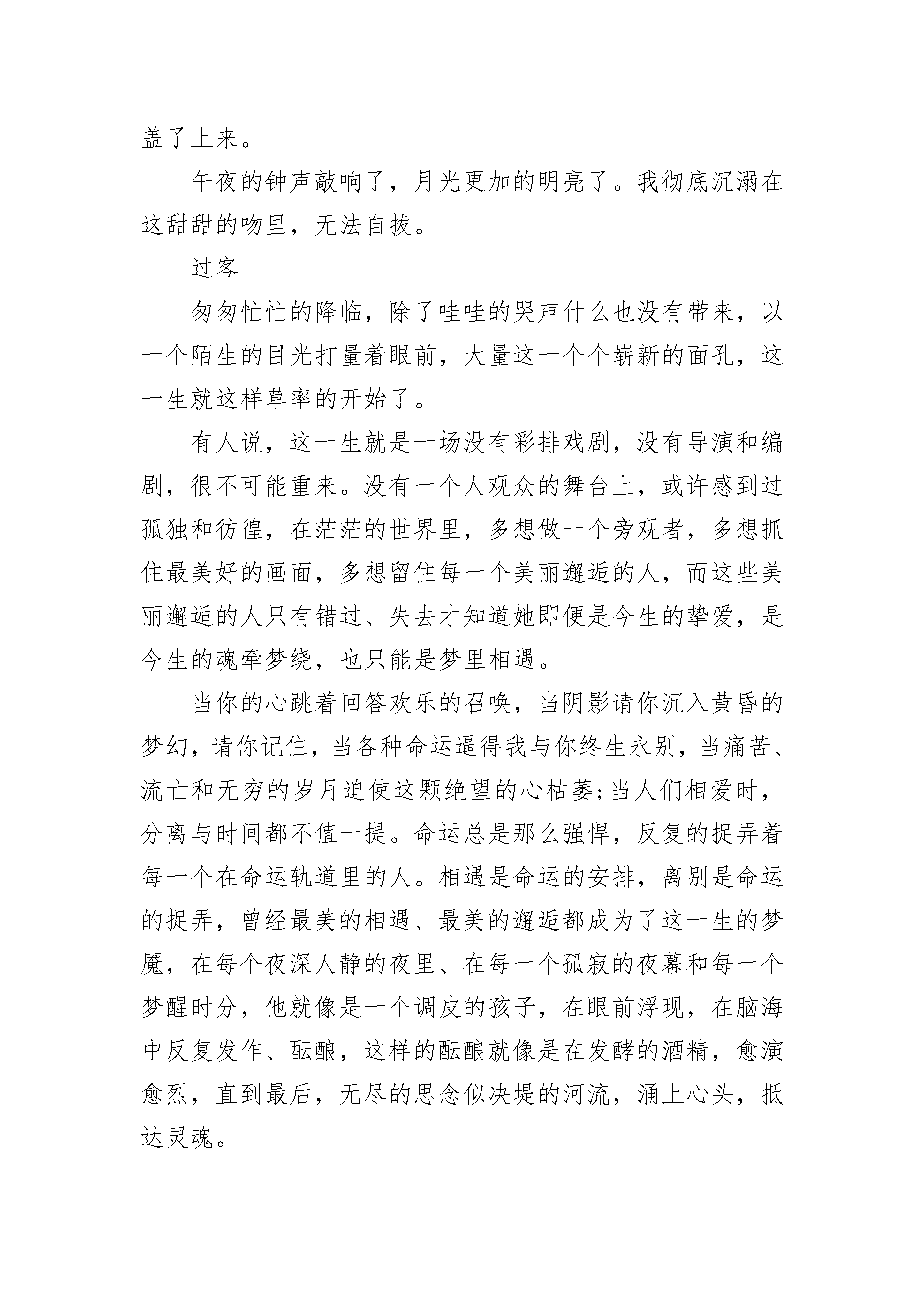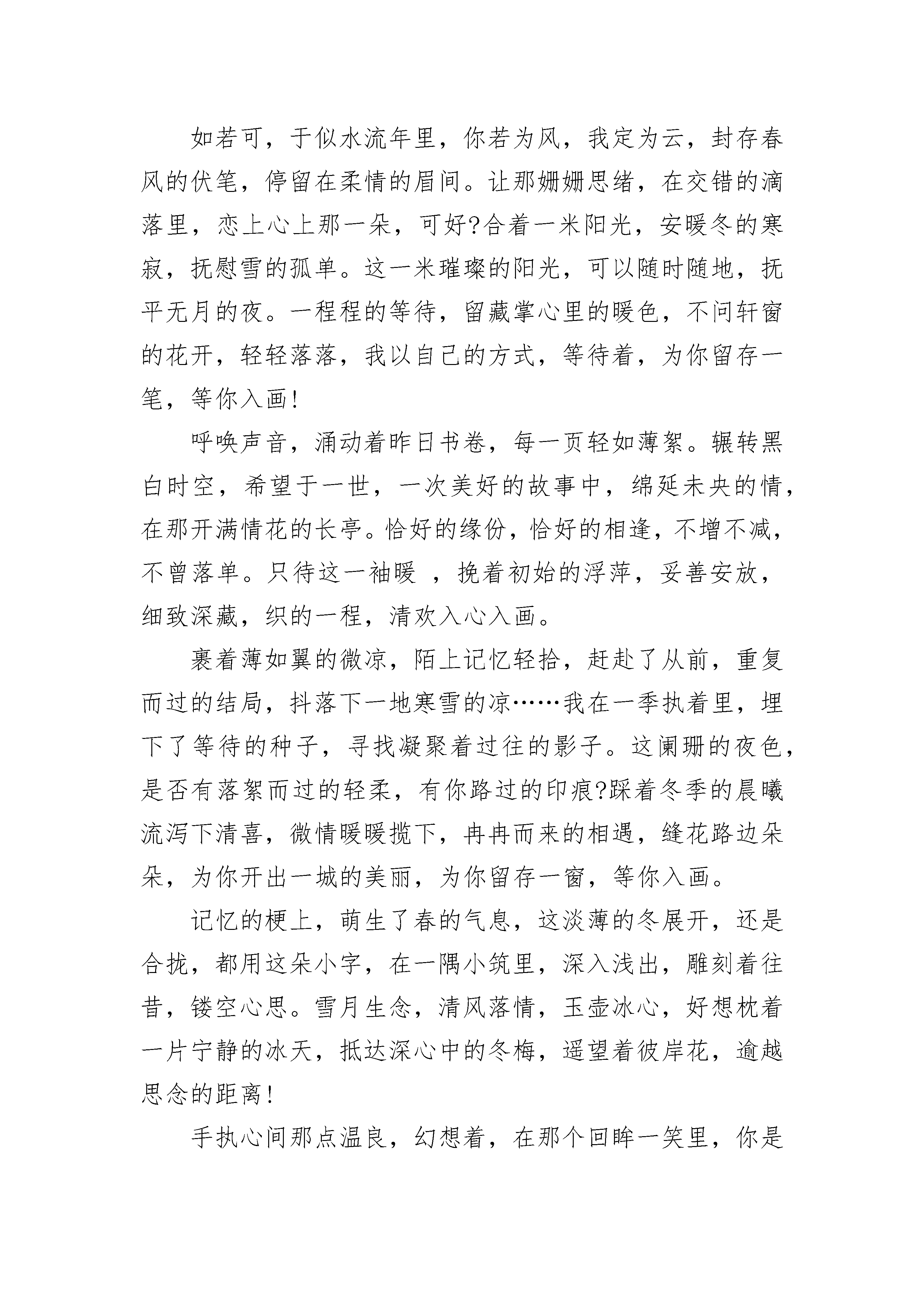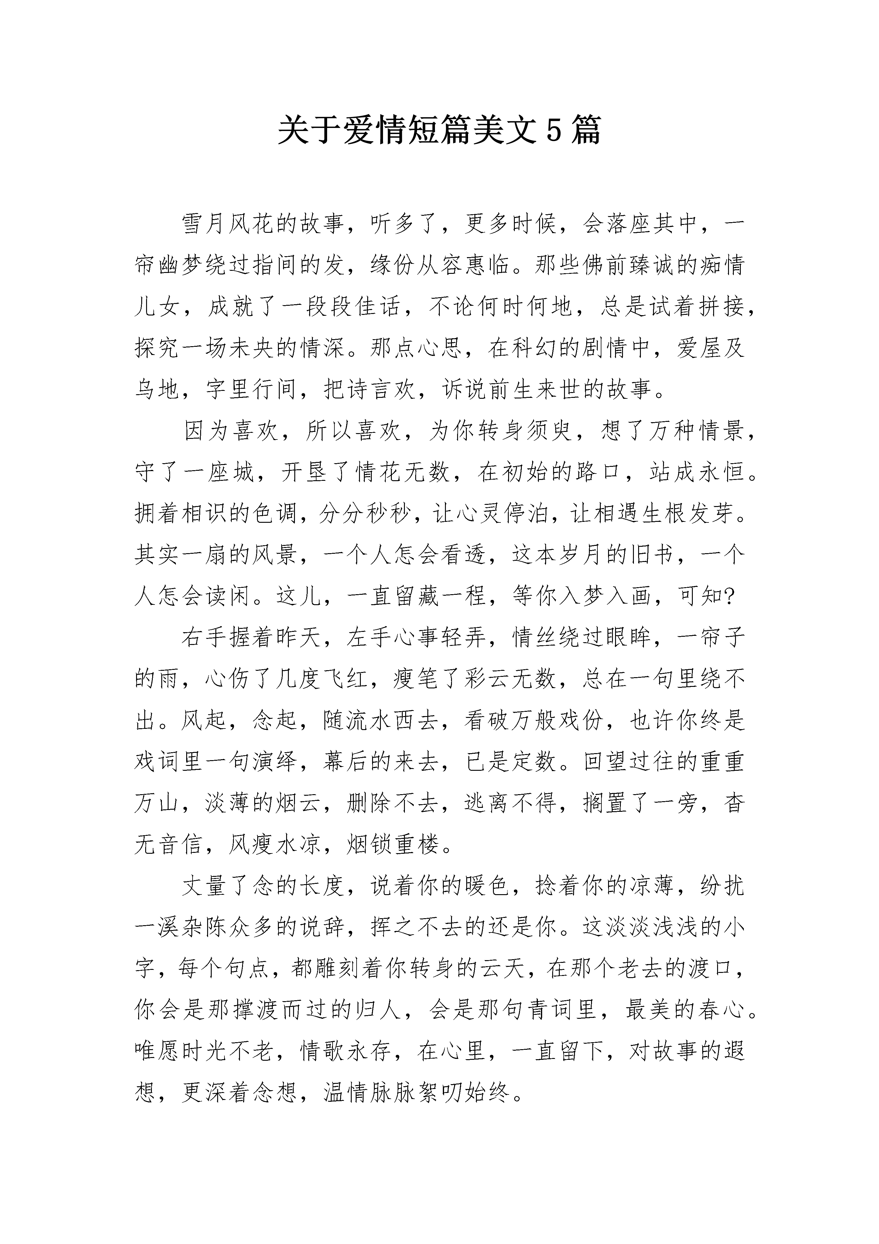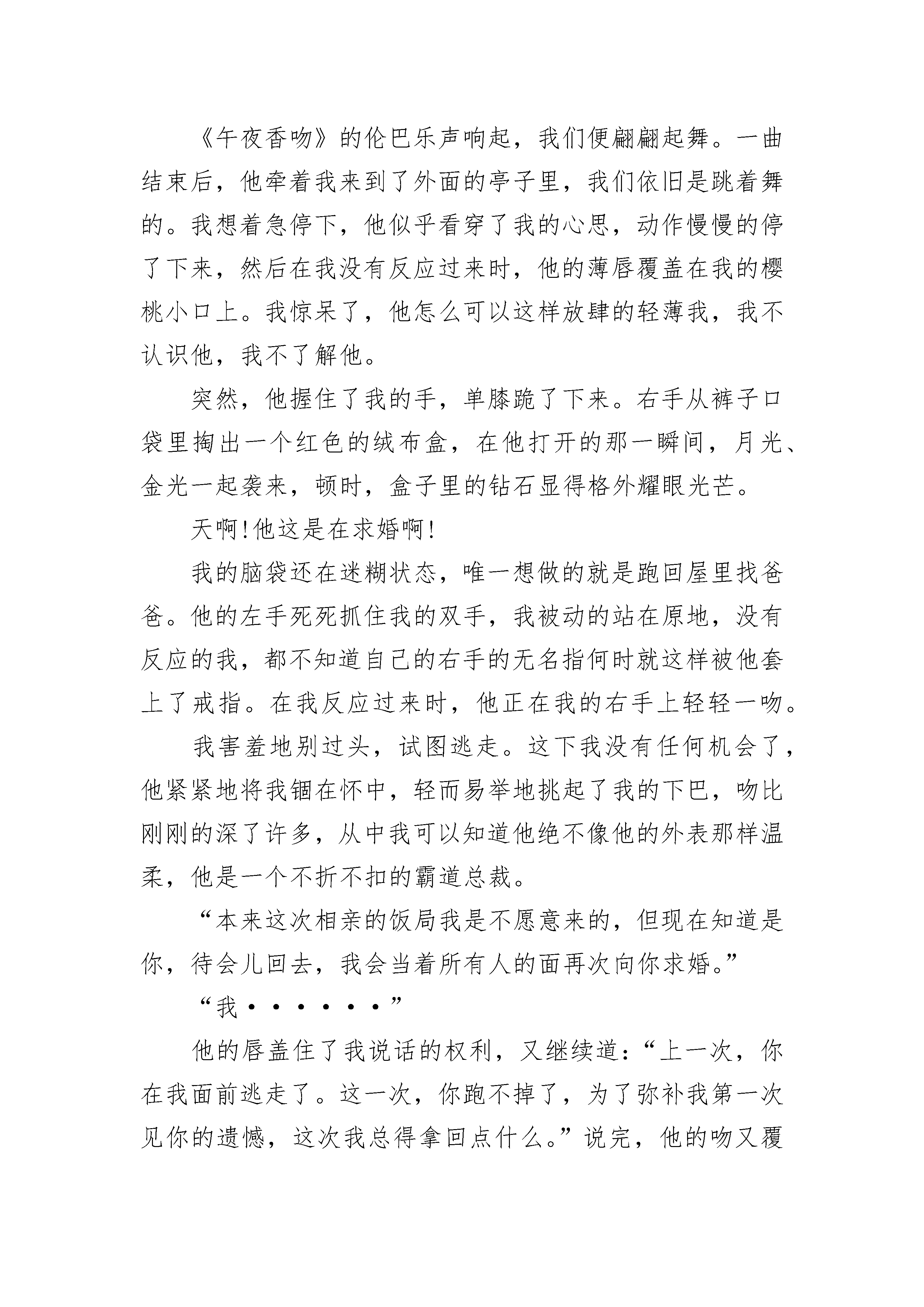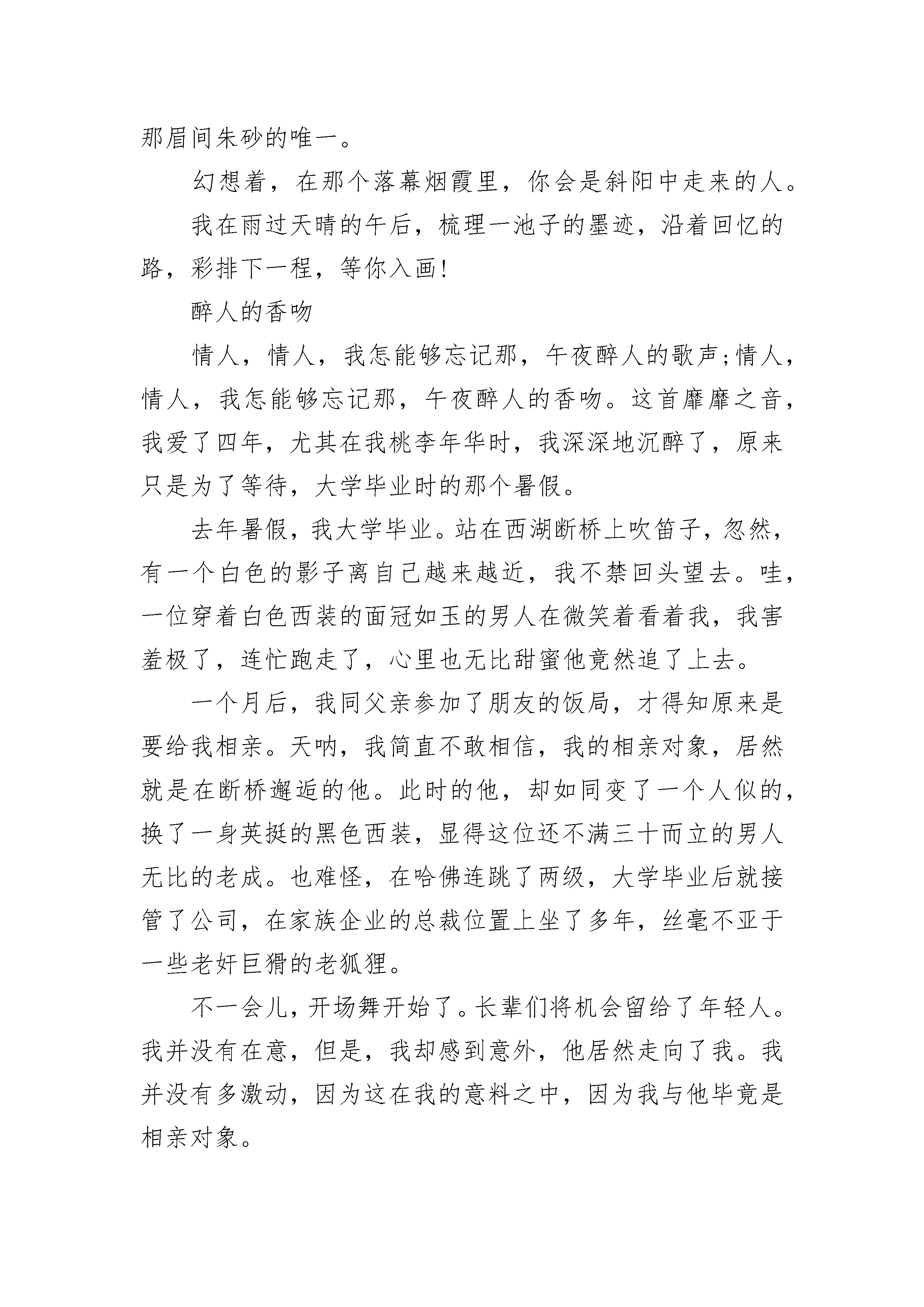 关于爱情短篇美文5篇雪月风花的故事,听多了,更多时候,会落座其中,一帘幽梦绕过指间的发,缘份从容惠临。那些佛前臻诚的痴情儿女,成就了一段段佳话,不论何时何地,总是试着拼接,探究一场未央的情深。那点心思,在科幻的剧情中,爱屋及乌地,字里行间,把诗言欢,诉说前生来世的故事。因为喜欢,所以喜欢,为你转身须臾,想了万种情景,守了一座城,开垦了情花无数,在初始的路口,站成永恒。拥着相识的色调,分分秒秒,让心灵停泊,让相遇生根发芽。其实一扇的风景,一个人怎会看透,这本岁月的旧书,一个人怎会读闲。这儿,一直留藏一程,等你入梦入画,可知?右手握着昨天,左手心事轻弄,情丝绕过眼眸,一帘子的雨,心伤了几度飞红,瘦笔了彩云无数,总在一句里绕不出。风起,念起,随流水西去,看破万般戏份,也许你终是戏词里一句演绎,幕后的来去,已是定数。回望过往的重重万山,淡薄的烟云,删除不去,逃离不得,搁置了一旁,杳无音信,风瘦水凉,烟锁重楼。丈量了念的长度,说着你的暖色,捻着你的凉薄,纷扰一溪杂陈众多的说辞,挥之不去的还是你。这淡淡浅浅的小字,每个句点,都雕刻着你转身的云天,在那个老去的渡口,你会是那撑渡而过的归人,会是那句青词里,最美的春心。唯愿时光不老,情歌永存,在心里,一直留下,对故事的遐想,更深着念想,温情脉脉絮叨始终。如若可,于似水流年里,你若为风,我定为云,封存春风的伏笔,停留在柔情的眉间。让那姗姗思绪,在交错的滴落里,恋上心上那一朵,可好?合着一米阳光,安暖冬的寒寂,抚慰雪的孤单。这一米璀璨的阳光,可以随时随地,抚平无月的夜。一程程的等待,留藏掌心里的暖色,不问轩窗的花开,轻轻落落,我以自己的方式,等待着,为你留存一笔,等你入画!呼唤声音,涌动着昨日书卷,每一页轻如薄絮。辗转黑白时空,希望于一世,一次美好的故事中,绵延未央的情,在那开满情花的长亭。恰好的缘份,恰好的相逢,不增不减,不曾落单。只待这一袖暖,挽着初始的浮萍,妥善安放,细致深藏,织的一程,清欢入心入画。裹着薄如翼的微凉,陌上记忆轻拾,赶赴了从前,重复而过的结局,抖落下一地寒雪的凉……我在一季执着里,埋下了等待的种子,寻找凝聚着过往的影子。这阑珊的夜色,是否有落絮而过的轻柔,有你路过的印痕?踩着冬季的晨曦流泻下清喜,微情暖暖揽下,冉冉而来的相遇,缝花路边朵朵,为你开出一城的美丽,为你留存一窗,等你入画。记忆的梗上,萌生了春的气息,这淡薄的冬展开,还是合拢,都用这朵小字,在一隅小筑里,深入浅出,雕刻着往昔,镂空心思。雪月生念,清风落情,玉壶冰心,好想枕着一片宁静的冰天,抵达深心中的冬梅,遥望着彼岸花,逾越思念的距离!手执心间那点温良,幻想着,在那个回眸一笑里,你是那眉间朱砂的唯一。幻想着,在那个落幕烟霞里,你会是斜阳中走来的人。我在雨过天晴的午后,梳理一池子的墨迹,沿着回忆的路,彩排下一程,等你入画!醉人的香吻情人,情人,我怎能够忘记那,午夜醉人的歌声;情人,情人,我怎能够忘记那,午夜醉人的香吻。这首靡靡之音,我爱了四年,尤其在我桃李年华时,我深深地沉醉了,原来只是为了等待,大学毕业时的那个暑假。去年暑假,我大学毕业。站在西湖断桥上吹笛子,忽然,有一个白色的影子离自己越来越近,我不禁回头望去。哇,一位穿着白色西装的面冠如玉的男人在微笑着看着我,我害羞极了,连忙跑走了,心里也无比甜蜜他竟然追了上去。一个月后,我同父亲参加了朋友的饭局,才得知原来是要给我相亲。天呐,我简直不敢相信,我的相亲对象,居然就是在断桥邂逅的他。此时的他,却如同变了一个人似的,换了一身英挺的黑色西装,显得这位还不满三十而立的男人无比的老成。也难怪,在哈佛连跳了两级,大学毕业后就接管了公司,在家族企业的总裁位置上坐了多年,丝毫不亚于一些老奸巨猾的老狐狸。不一会儿,开场舞开始了。长辈们将机会留给了年轻人。我并没有在意,但是,我却感到意外,他居然走向了我。我并没有多激动,因为这在我的意料之中,因为我与他毕竟是相亲对象。《午夜香吻》的伦巴乐声响起,我们便翩翩起舞。一曲结束后,他牵着我来到了外面的亭子里,我们依旧是跳着舞的。我想着急停下,他似乎看穿了我的心思,动作慢慢的停了下来,然后在我没有反应过来时,他的薄唇覆盖在我的樱桃小口上。我惊呆了,他怎么可以这样放肆的轻薄我,我不认识他,我不了解他。突然,他握住了我的手,单膝跪了下来。右手从裤子口袋里掏出一个红色的绒布盒,在他打开的那一瞬间,月光、金光一起袭来,顿时,盒子里的钻石显得格外耀眼光芒。天啊!他这是在求婚啊!我的脑袋还在迷糊状态,唯一想做的就是跑回屋里找爸爸。他的左手死死抓住我的双手,我被动的站在原地,没有反应的我,都不知道自己的右手的无名指何时就这样被他套上了戒指。在我反应过来时,他正在我的右手上轻轻一吻。我害羞地别过头,试图逃走。这下我没有任何机会了,他紧紧地将我锢在怀中,轻而