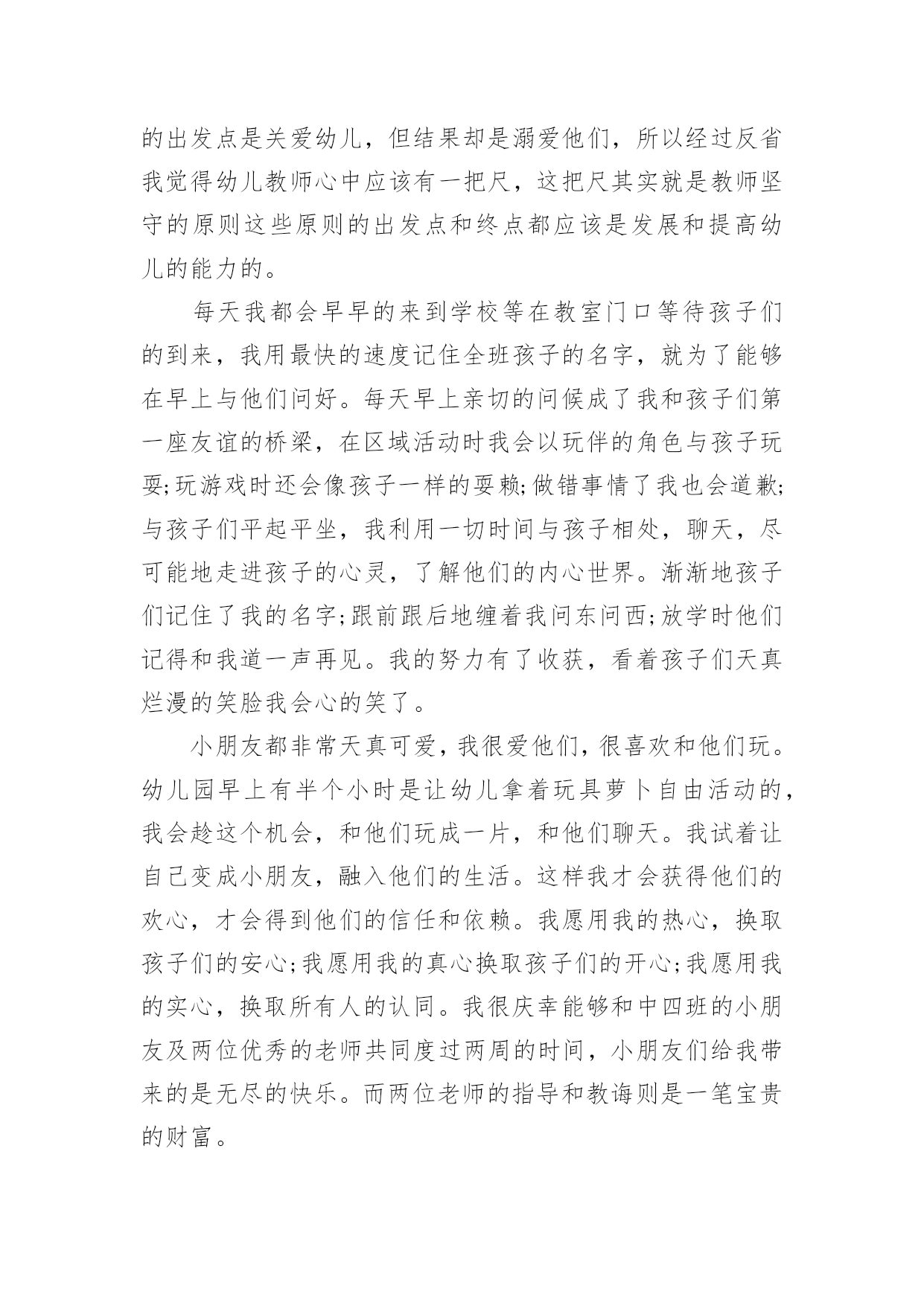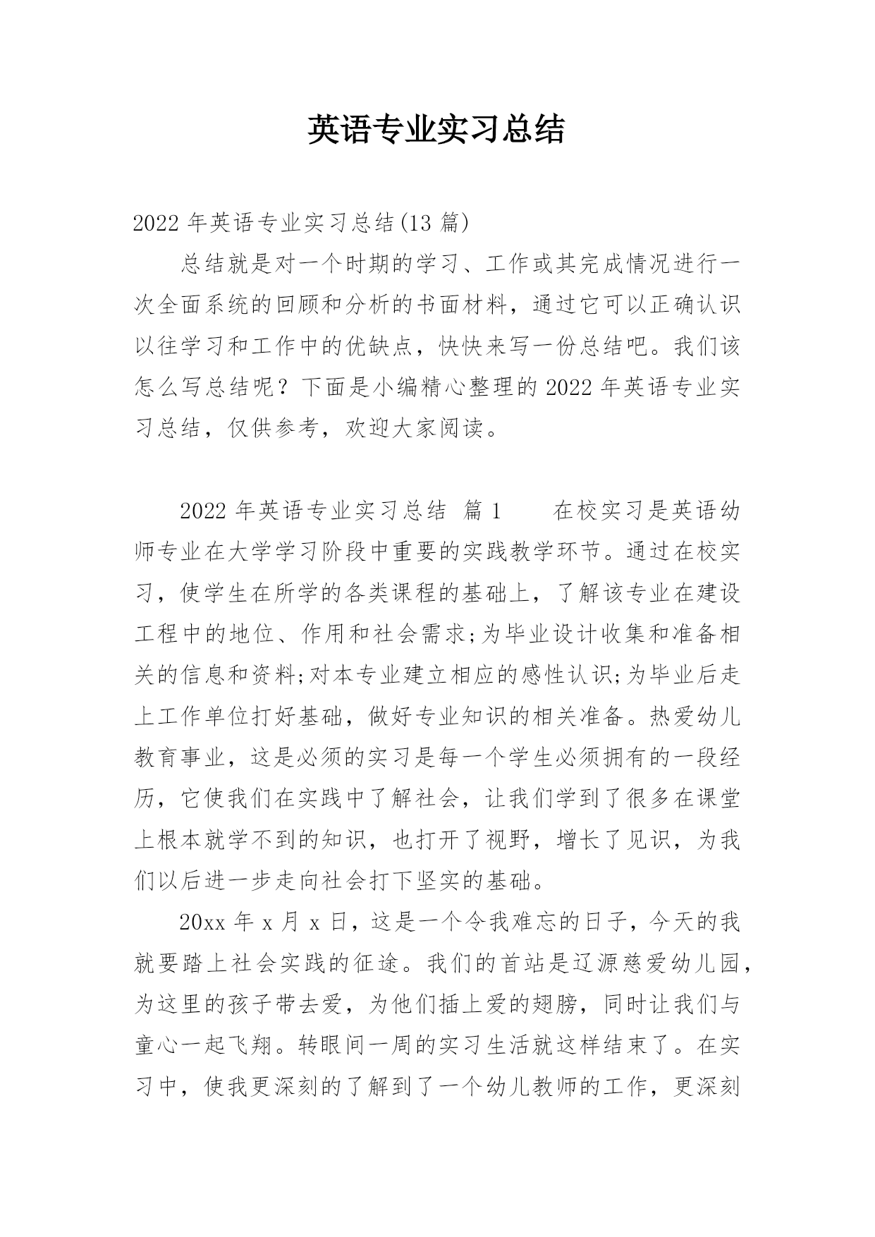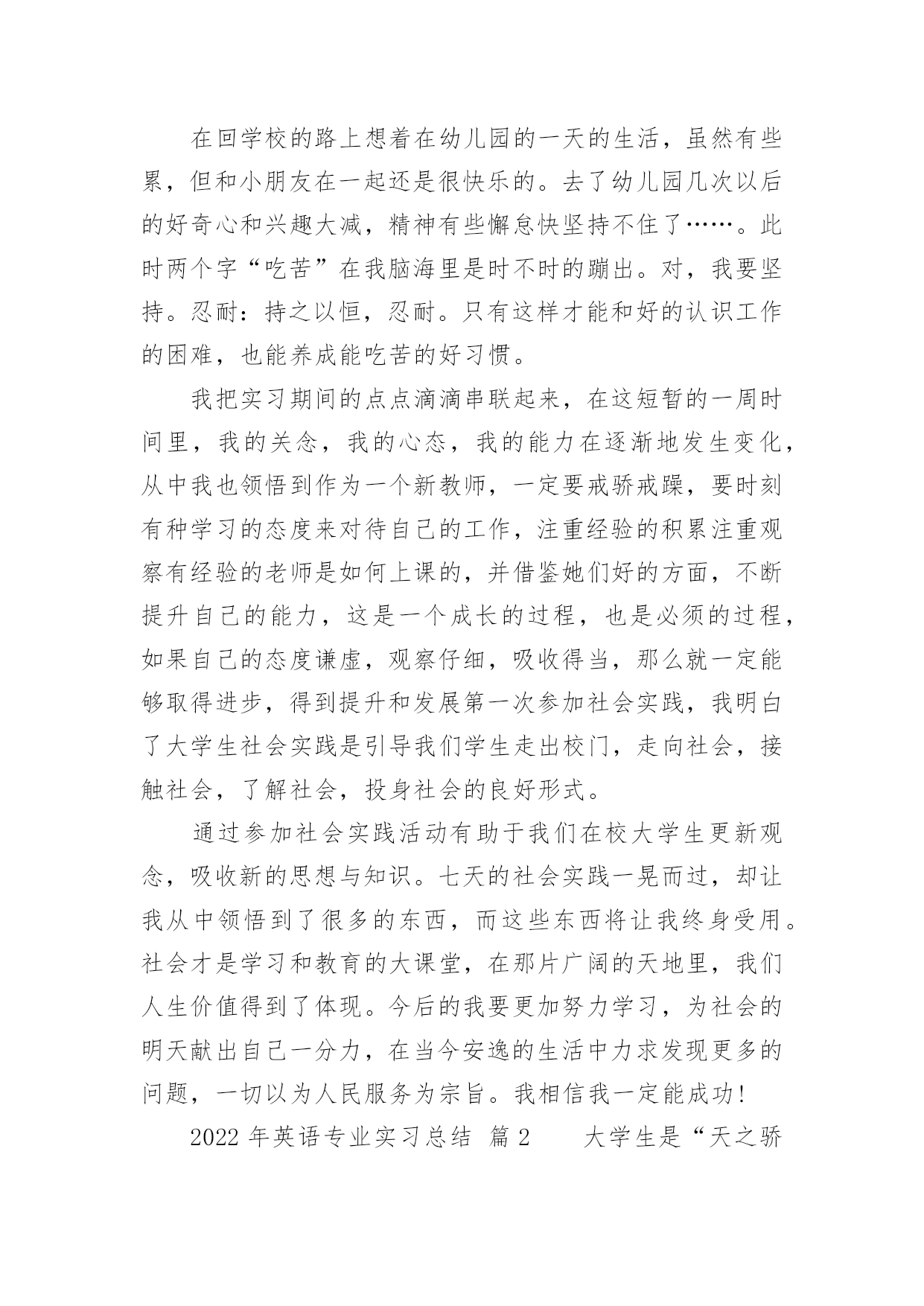 英语专业实习总结 2022年英语专业实习总结(13篇)总结就是对一个时期的学习、工作或其完成情况进行一次全面系统的回顾和分析的书面材料,通过它可以正确认识以往学习和工作中的优缺点,快快来写一份总结吧。我们该怎么写总结呢?下面是小编精心整理的2022年英语专业实习总结,仅供参考,欢迎大家阅读。2022年英语专业实习总结篇1在校实习是英语幼师专业在大学学习阶段中重要的实践教学环节。通过在校实习,使学生在所学的各类课程的基础上,了解该专业在建设工程中的地位、作用和社会需求;为毕业设计收集和准备相关的信息和资料;对本专业建立相应的感性认识;为毕业后走上工作单位打好基础,做好专业知识的相关准备。热爱幼儿教育事业,这是必须的实习是每一个学生必须拥有的一段经历,它使我们在实践中了解社会,让我们学到了很多在课堂上根本就学不到的知识,也打开了视野,增长了见识,为我们以后进一步走向社会打下坚实的基础。20xx年x月x日,这是一个令我难忘的日子,今天的我就要踏上社会实践的征途。我们的首站是辽源慈爱幼儿园,为这里的孩子带去爱,为他们插上爱的翅膀,同时让我们与童心一起飞翔。转眼间一周的实习生活就这样结束了。在实习中,使我更深刻的了解到了一个幼儿教师的工作,更深刻了解和掌握了学前班这一年龄阶段的幼儿的身心发展特点及其在保教工作方面与大班、中班,小班幼儿的区别。也认识到了作为一个幼儿教师,除了做好幼儿的教育工作外,如何做好与保育员、其他教师及家长的合作、协调工作也具有同样重要的地位。以前我比较注重于对有关幼儿身心发展特点及国内外幼儿教育研究的理论学习,常常忽略了对幼儿生活常规的关注。这次在幼儿园实习,第一次完整的观察了幼儿园一日的'生活,发现其实训练幼儿的生活常规培养他们的行为习惯及自理能力也是一项重要的任务,一门值得重视的学问。赵小娟老师很会利用机会对幼儿进行随机教育,把有计划的教育和随机教育相结合。我的行为的出发点是关爱幼儿,但结果却是溺爱他们,所以经过反省我觉得幼儿教师心中应该有一把尺,这把尺其实就是教师坚守的原则这些原则的出发点和终点都应该是发展和提高幼儿的能力的。这些日常生活突发的事件都成为教师培养幼儿良好行为习惯的机会。我在实习初期的时候,看到小朋友的椅子放得不整,我就会帮他们放好,他们告诉我饭菜吃不完,我就叫他们不要再吃了,他们要上厕所,不管当时在做什么活动,我都以为应该让他们去上厕所。他们不会脱掉衣服的时候,我会主动帮他们脱等等。我以为我是在帮助他们,可事实却并非如此,经过赵老师的提示后我才认识到我的行为的后果就是他们永远都不能学会自己的事情要自己做,不能养成良好的行为习惯。我的行为的出发点是关爱幼儿,但结果却是溺爱他们,所以经过反省我觉得幼儿教师心中应该有一把尺,这把尺其实就是教师坚守的原则这些原则的出发点和终点都应该是发展和提高幼儿的能力的。每天我都会早早的来到学校等在教室门口等待孩子们的到来,我用最快的速度记住全班孩子的名字,就为了能够在早上与他们问好。每天早上亲切的问候成了我和孩子们第一座友谊的桥梁,在区域活动时我会以玩伴的角色与孩子玩耍;玩游戏时还会像孩子一样的耍赖;做错事情了我也会道歉;与孩子们平起平坐,我利用一切时间与孩子相处,聊天,尽可能地走进孩子的心灵,了解他们的内心世界。渐渐地孩子们记住了我的名字;跟前跟后地缠着我问东问西;放学时他们记得和我道一声再见。我的努力有了收获,看着孩子们天真烂漫的笑脸我会心的笑了。小朋友都非常天真可爱,我很爱他们,很喜欢和他们玩。幼儿园早上有半个小时是让幼儿拿着玩具萝卜自由活动的,我会趁这个机会,和他们玩成一片,和他们聊天。我试着让自己变成小朋友,融入他们的生活。这样我才会获得他们的欢心,才会得到他们的信任和依赖。我愿用我的热心,换取孩子们的安心;我愿用我的真心换取孩子们的开心;我愿用我的实心,换取所有人的认同。我很庆幸能够和中四班的小朋友及两位优秀的老师共同度过两周的时间,小朋友们给我带来的是无尽的快乐。而两位老师的指导和教诲则是一笔宝贵的财富。在回学校的路上想着在幼儿园的一天的生活,虽然有些累,但和小朋友在一起还是很快乐的。去了幼儿园几次以后的好奇心和兴趣大减,精神有些懈怠快坚持不住了……。此时两个字“吃苦”在我脑海里是时不时的蹦出。对,我要坚持。忍耐:持之以恒,忍耐。只有这样才能和好的认识工作的困难,也能养成能吃苦的好习惯。我把实习期间的点点滴滴串联起来,在这短暂的一周时间里,我的关念,我的心态,我的能力在逐渐地发生变化,从中我也领悟到作为一个新教师,一定要戒骄戒躁,要时刻有种学习的态度来对待自己的工作,注重经验的积累注重观察有经验的老师是如何上课的,并借鉴她们好的方面,不断提升自己的能力,这是一个成长的过程,也是必须的过程,如果自己的态度谦虚,观察仔细,吸收得当,那么就一定能够取得进