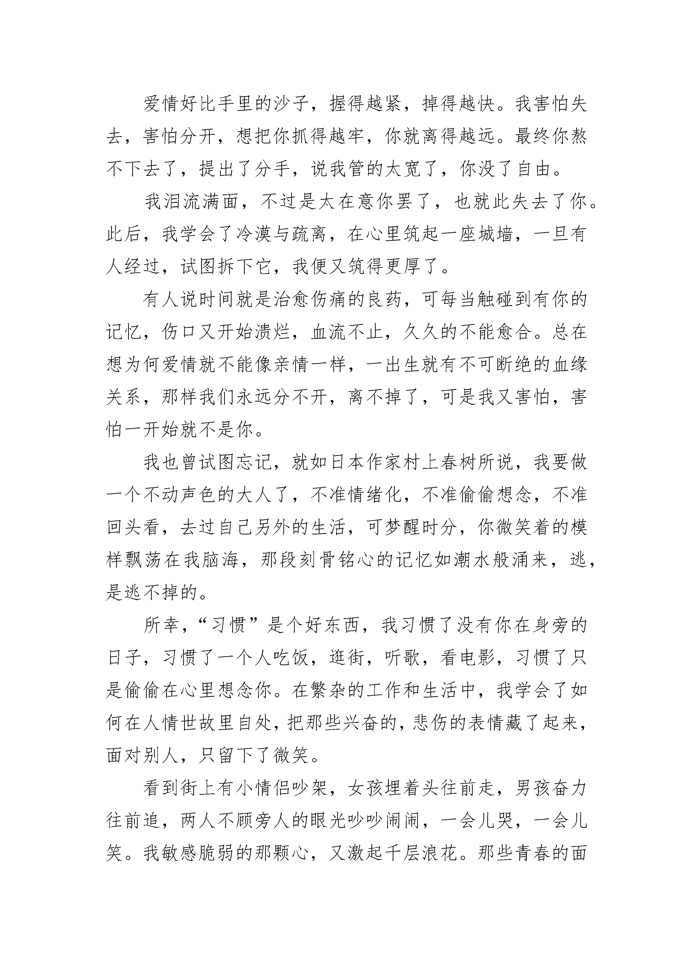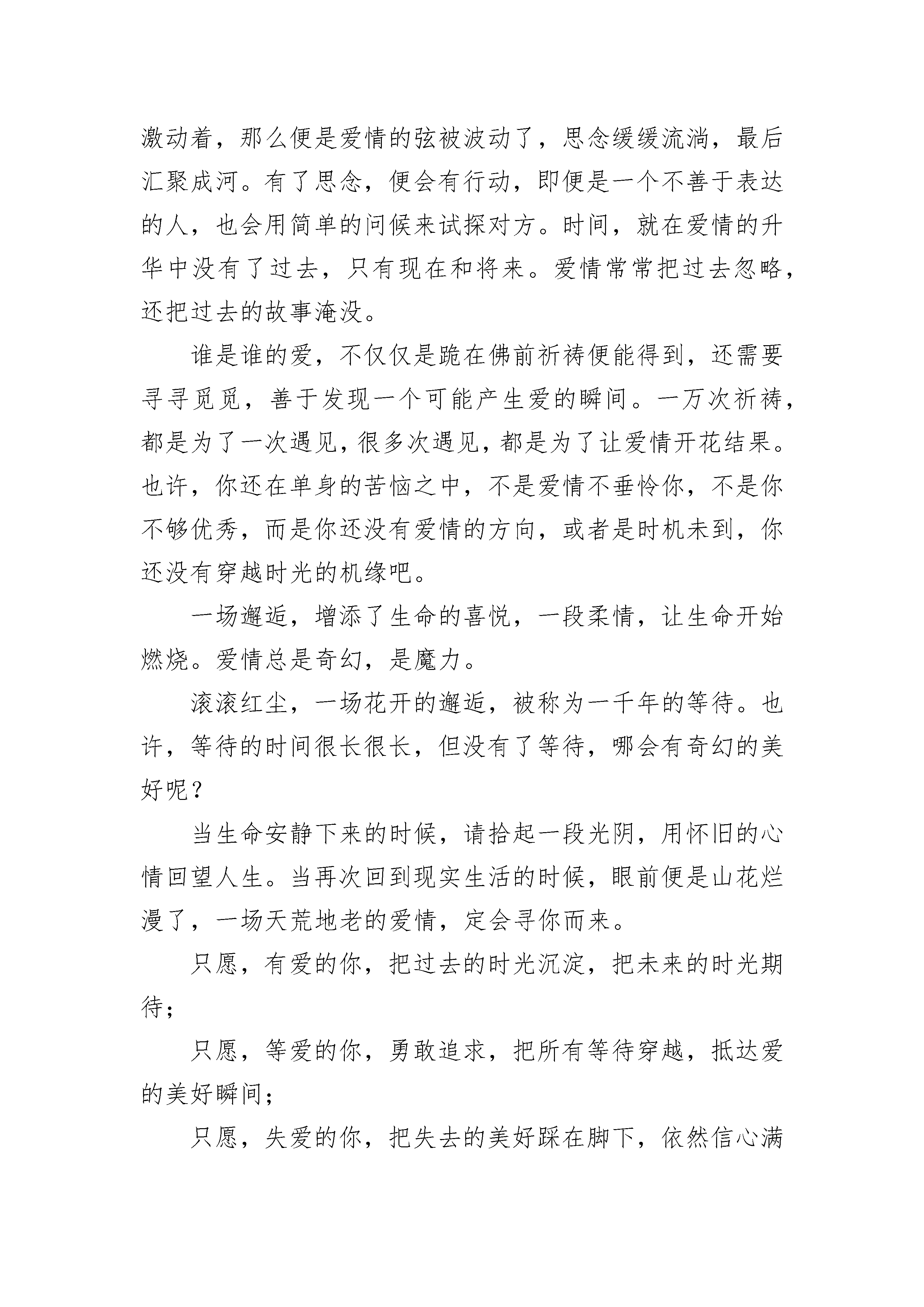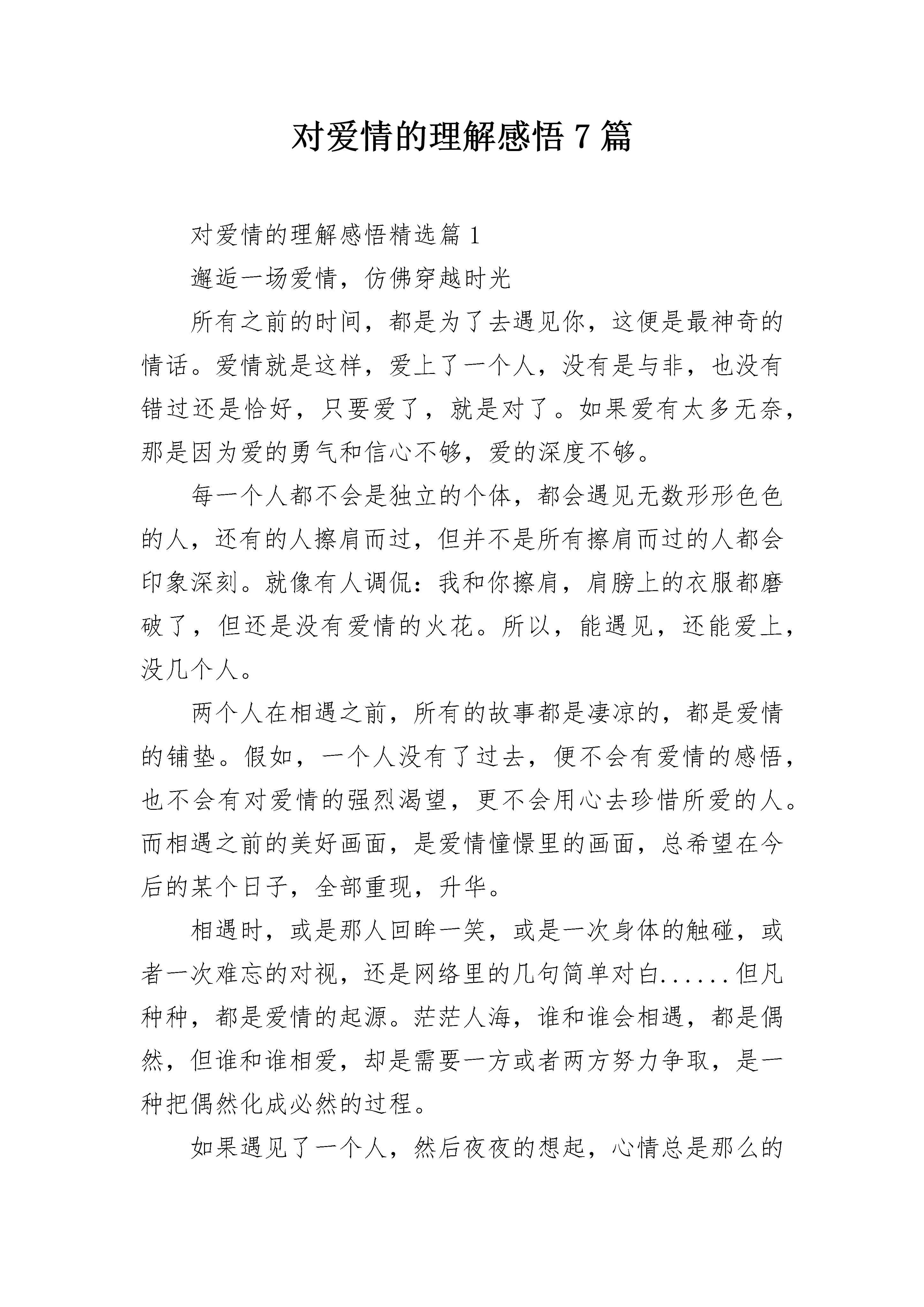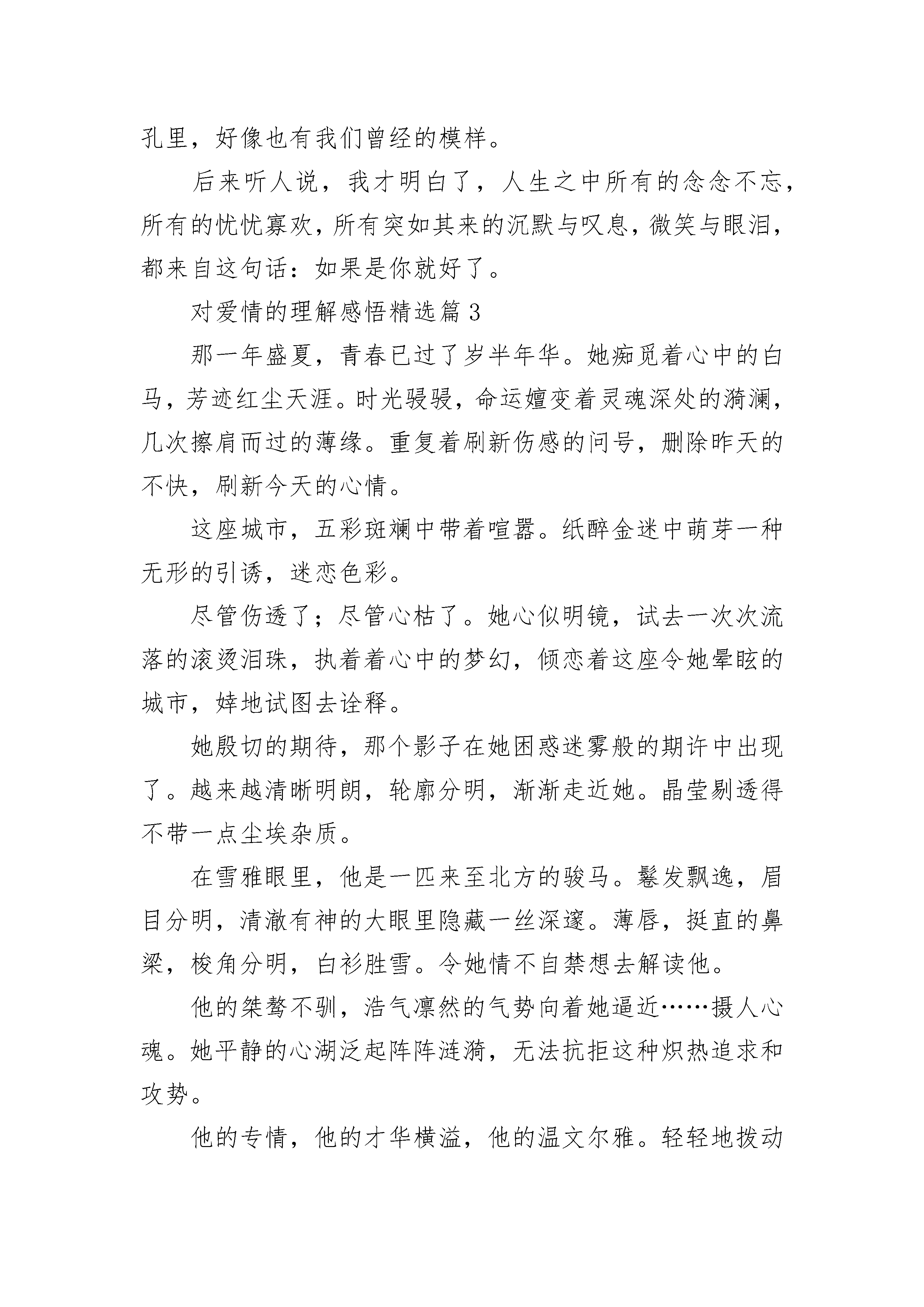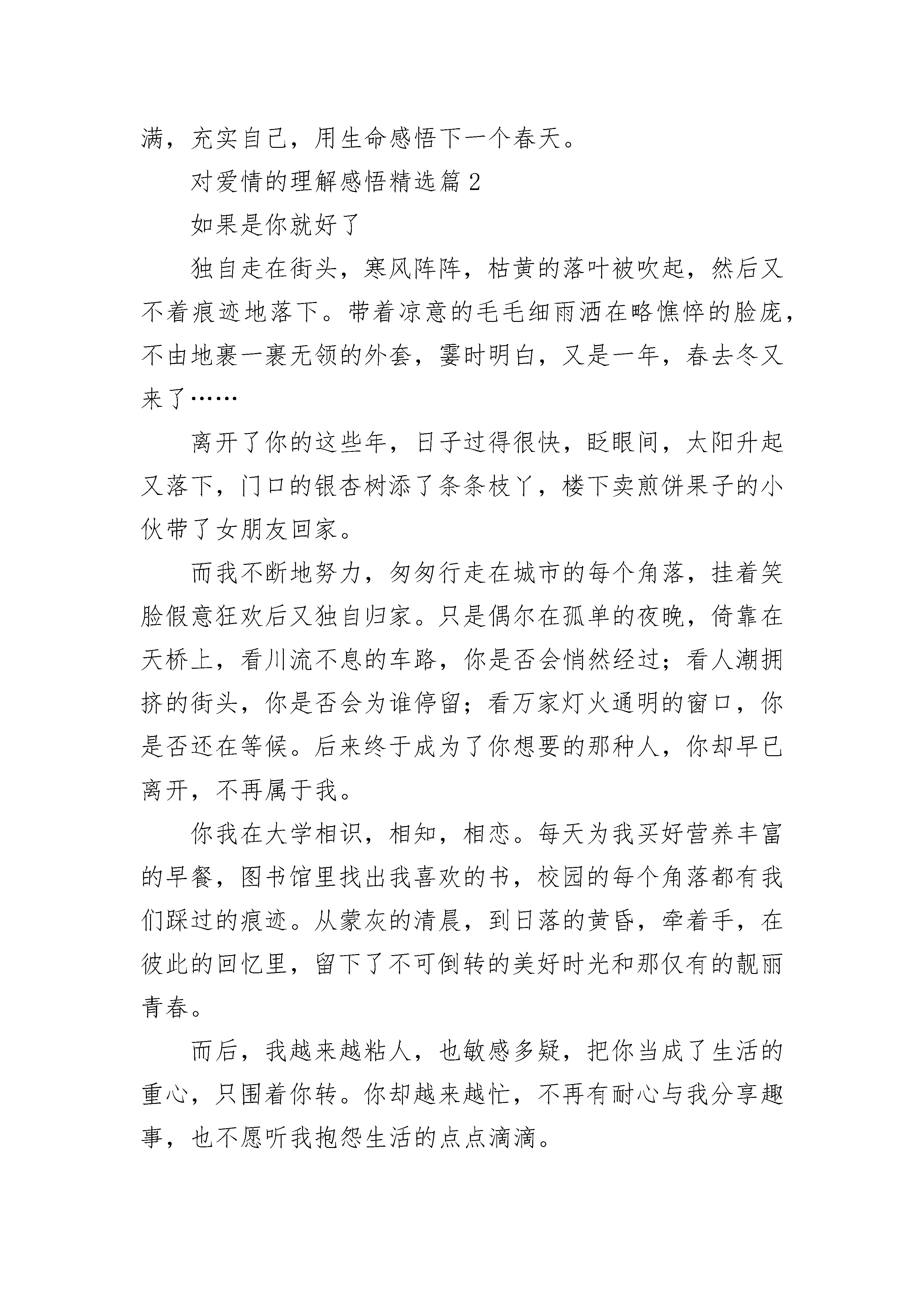 对爱情的理解感悟7篇对爱情的理解感悟精选篇1邂逅一场爱情,仿佛穿越时光所有之前的时间,都是为了去遇见你,这便是最神奇的情话。爱情就是这样,爱上了一个人,没有是与非,也没有错过还是恰好,只要爱了,就是对了。如果爱有太多无奈,那是因为爱的勇气和信心不够,爱的深度不够。每一个人都不会是独立的个体,都会遇见无数形形色色的人,还有的人擦肩而过,但并不是所有擦肩而过的人都会印象深刻。就像有人调侃:我和你擦肩,肩膀上的衣服都磨破了,但还是没有爱情的火花。所以,能遇见,还能爱上,没几个人。两个人在相遇之前,所有的故事都是凄凉的,都是爱情的铺垫。假如,一个人没有了过去,便不会有爱情的感悟,也不会有对爱情的强烈渴望,更不会用心去珍惜所爱的人。而相遇之前的美好画面,是爱情憧憬里的画面,总希望在今后的某个日子,全部重现,升华。相遇时,或是那人回眸一笑,或是一次身体的触碰,或者一次难忘的对视,还是网络里的几句简单对白......但凡种种,都是爱情的起源。茫茫人海,谁和谁会相遇,都是偶然,但谁和谁相爱,却是需要一方或者两方努力争取,是一种把偶然化成必然的过程。如果遇见了一个人,然后夜夜的想起,心情总是那么的激动着,那么便是爱情的弦被波动了,思念缓缓流淌,最后汇聚成河。有了思念,便会有行动,即便是一个不善于表达的人,也会用简单的问候来试探对方。时间,就在爱情的升华中没有了过去,只有现在和将来。爱情常常把过去忽略,还把过去的故事淹没。谁是谁的爱,不仅仅是跪在佛前祈祷便能得到,还需要寻寻觅觅,善于发现一个可能产生爱的瞬间。一万次祈祷,都是为了一次遇见,很多次遇见,都是为了让爱情开花结果。也许,你还在单身的苦恼之中,不是爱情不垂怜你,不是你不够优秀,而是你还没有爱情的方向,或者是时机未到,你还没有穿越时光的机缘吧。一场邂逅,增添了生命的喜悦,一段柔情,让生命开始燃烧。爱情总是奇幻,是魔力。滚滚红尘,一场花开的邂逅,被称为一千年的等待。也许,等待的时间很长很长,但没有了等待,哪会有奇幻的美好呢?当生命安静下来的时候,请拾起一段光阴,用怀旧的心情回望人生。当再次回到现实生活的时候,眼前便是山花烂漫了,一场天荒地老的爱情,定会寻你而来。只愿,有爱的你,把过去的时光沉淀,把未来的时光期待;只愿,等爱的你,勇敢追求,把所有等待穿越,抵达爱的美好瞬间;只愿,失爱的你,把失去的美好踩在脚下,依然信心满满,充实自己,用生命感悟下一个春天。对爱情的理解感悟精选篇2如果是你就好了独自走在街头,寒风阵阵,枯黄的落叶被吹起,然后又不着痕迹地落下。带着凉意的毛毛细雨洒在略憔悴的脸庞,不由地裹一裹无领的外套,霎时明白,又是一年,春去冬又来了……离开了你的这些年,日子过得很快,眨眼间,太阳升起又落下,门口的银杏树添了条条枝丫,楼下卖煎饼果子的小伙带了女朋友回家。而我不断地努力,匆匆行走在城市的每个角落,挂着笑脸假意狂欢后又独自归家。只是偶尔在孤单的夜晚,倚靠在天桥上,看川流不息的车路,你是否会悄然经过;看人潮拥挤的街头,你是否会为谁停留;看万家灯火通明的窗口,你是否还在等候。后来终于成为了你想要的那种人,你却早已离开,不再属于我。你我在大学相识,相知,相恋。每天为我买好营养丰富的早餐,图书馆里找出我喜欢的书,校园的每个角落都有我们踩过的痕迹。从蒙灰的清晨,到日落的黄昏,牵着手,在彼此的回忆里,留下了不可倒转的美好时光和那仅有的靓丽青春。而后,我越来越粘人,也敏感多疑,把你当成了生活的重心,只围着你转。你却越来越忙,不再有耐心与我分享趣事,也不愿听我抱怨生活的点点滴滴。爱情好比手里的沙子,握得越紧,掉得越快。我害怕失去,害怕分开,想把你抓得越牢,你就离得越远。最终你熬不下去了,提出了分手,说我管的太宽了,你没了自由。我泪流满面,不过是太在意你罢了,也就此失去了你。此后,我学会了冷漠与疏离,在心里筑起一座城墙,一旦有人经过,试图拆下它,我便又筑得更厚了。有人说时间就是治愈伤痛的良药,可每当触碰到有你的记忆,伤口又开始溃烂,血流不止,久久的不能愈合。总在想为何爱情就不能像亲情一样,一出生就有不可断绝的血缘关系,那样我们永远分不开,离不掉了,可是我又害怕,害怕一开始就不是你。我也曾试图忘记,就如日本作家村上春树所说,我要做一个不动声色的大人了,不准情绪化,不准偷偷想念,不准回头看,去过自己另外的生活,可梦醒时分,你微笑着的模样飘荡在我脑海,那段刻骨铭心的记忆如潮水般涌来,逃,是逃不掉的。所幸,“习惯”是个好东西,我习惯了没有你在身旁的日子,习惯了一个人吃饭,逛街,听歌,看电影,习惯了只是偷偷在心里想念你。在繁杂的工作和生活中,我学会了如何在人情世故里自处,把那些兴奋的,悲伤的表情藏了起来,面对别人,只留下了微笑。看到街上有小情侣吵架,女孩埋着头往前走,男孩奋力往前追,两人不顾旁人的眼光吵吵闹闹,