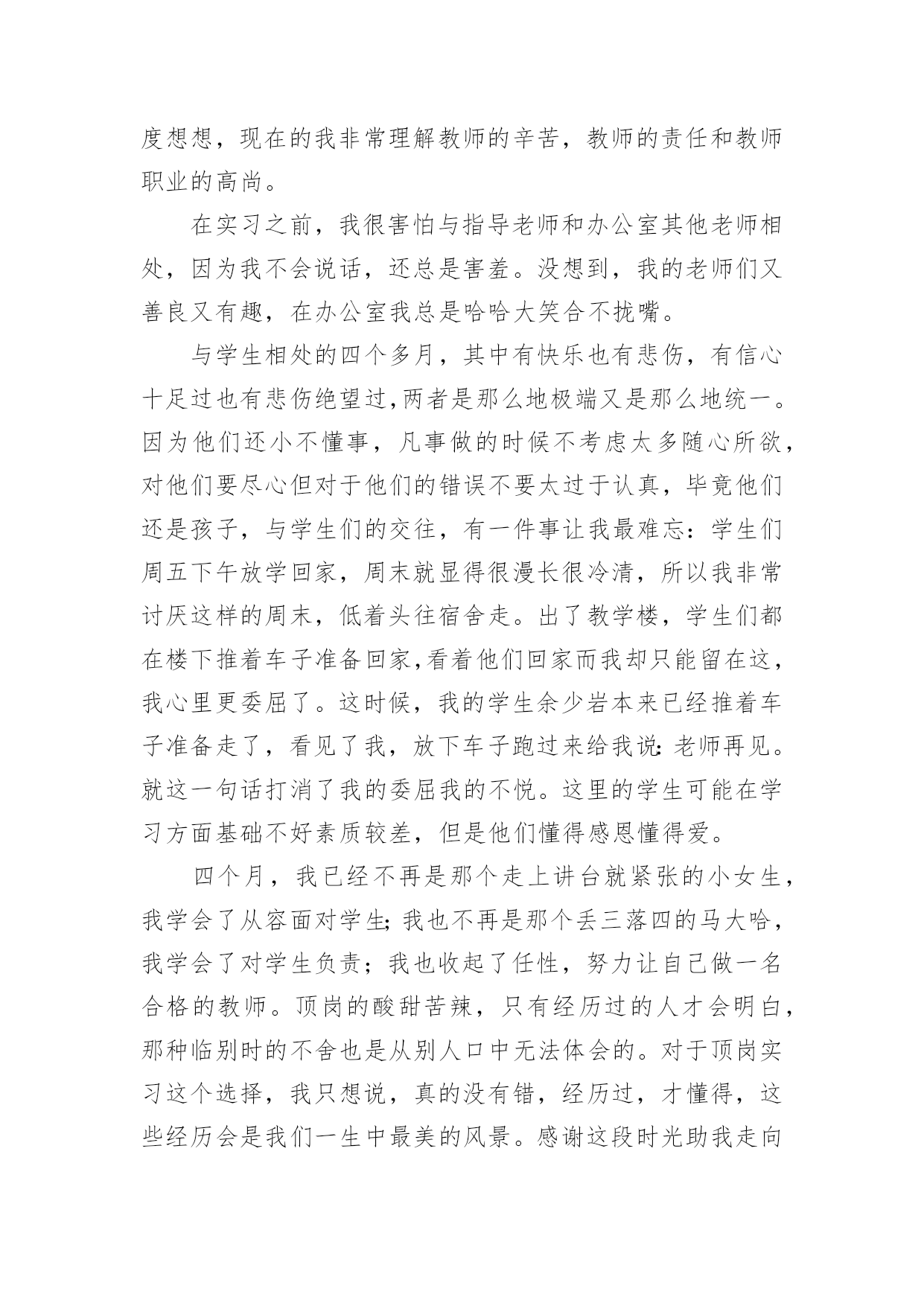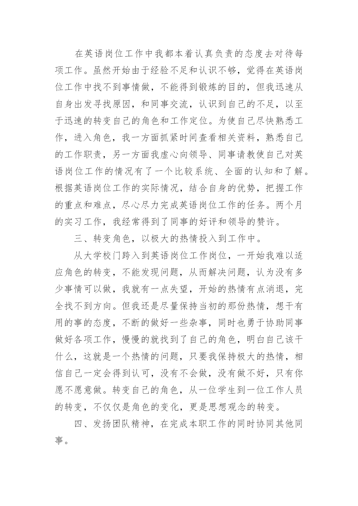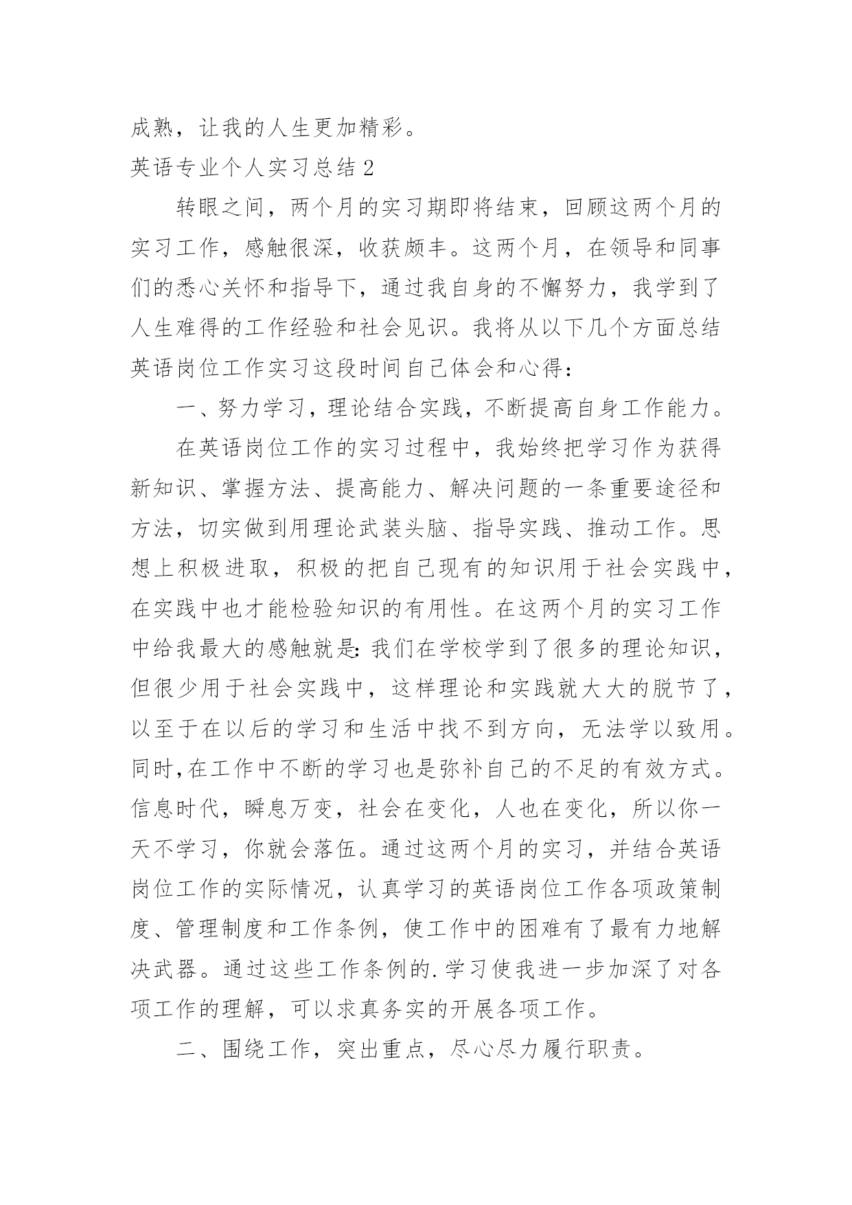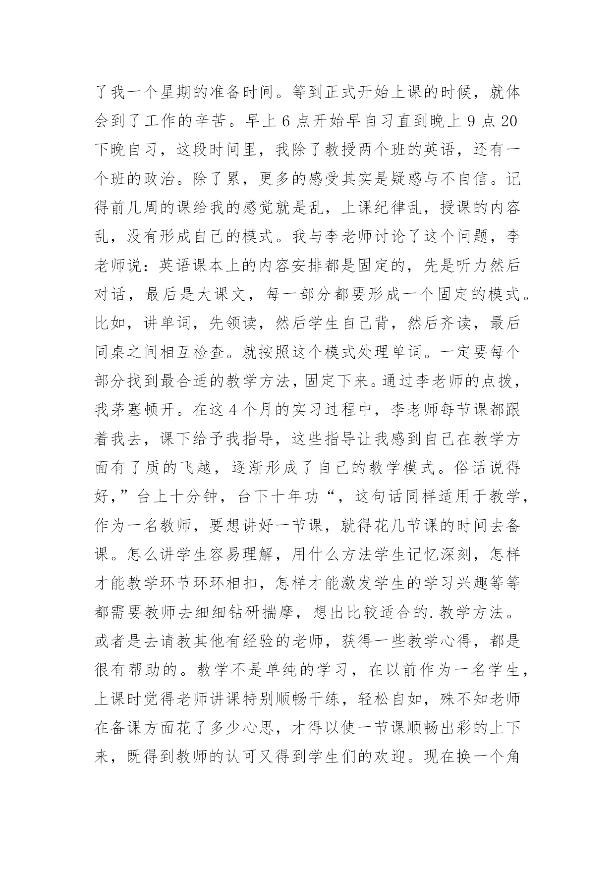 英语专业个人实习总结 英语专业个人实习总结总结是事后对某一阶段的学习或工作情况作加以回顾检查并分析评价的书面材料,他能够提升我们的书面表达能力,不如我们来制定一份总结吧。那么如何把总结写出新花样呢?以下是小编精心整理的英语专业个人实习总结,欢迎阅读,希望大家能够喜欢。英语专业个人实习总结19月我第一次真正的踏上社会,开始了四个月的工作实习体验生涯。时间不长,体会甚多。明白了那句读万里书,不如行万里路的深刻体会,也许在此时此刻的我,真实的将实习当做工作了吧。9月5日,我怀着激动地心情踏上了期待已久的顶岗实习之路。当我坐上离开汇华学院的班车的那一刻起,我就知道我将经历一段特殊的不平凡的并且充满收获的人生旅途,那旅程必定在我的生命中写下浓墨重彩的一笔,必定会在我的生命中留下绚灿多彩的回忆和无与伦比的财富。到达实习学校之后,我们接到通知,下午就开始上课。我慌了神,虽然暑假做了充足的准备,可是真的到了“上战场”的时候,还是会担心自己能不能行啊!我和我的指导老师李老师共教两个班,李老师可能看出来了我的担心,她给了我一个星期的准备时间。等到正式开始上课的时候,就体会到了工作的辛苦。早上6点开始早自习直到晚上9点20下晚自习,这段时间里,我除了教授两个班的英语,还有一个班的政治。除了累,更多的感受其实是疑惑与不自信。记得前几周的课给我的感觉就是乱,上课纪律乱,授课的内容乱,没有形成自己的模式。我与李老师讨论了这个问题,李老师说:英语课本上的内容安排都是固定的,先是听力然后对话,最后是大课文,每一部分都要形成一个固定的模式。比如,讲单词,先领读,然后学生自己背,然后齐读,最后同桌之间相互检查。就按照这个模式处理单词。一定要每个部分找到最合适的教学方法,固定下来。通过李老师的点拨,我茅塞顿开。在这4个月的实习过程中,李老师每节课都跟着我去,课下给予我指导,这些指导让我感到自己在教学方面有了质的飞越,逐渐形成了自己的教学模式。俗话说得好,”台上十分钟,台下十年功“,这句话同样适用于教学,作为一名教师,要想讲好一节课,就得花几节课的时间去备课。怎么讲学生容易理解,用什么方法学生记忆深刻,怎样才能教学环节环环相扣,怎样才能激发学生的学习兴趣等等都需要教师去细细钻研揣摩,想出比较适合的.教学方法。或者是去请教其他有经验的老师,获得一些教学心得,都是很有帮助的。教学不是单纯的学习,在以前作为一名学生,上课时觉得老师讲课特别顺畅干练,轻松自如,殊不知老师在备课方面花了多少心思,才得以使一节课顺畅出彩的上下来,既得到教师的认可又得到学生们的欢迎。现在换一个角度想想,现在的我非常理解教师的辛苦,教师的责任和教师职业的高尚。在实习之前,我很害怕与指导老师和办公室其他老师相处,因为我不会说话,还总是害羞。没想到,我的老师们又善良又有趣,在办公室我总是哈哈大笑合不拢嘴。与学生相处的四个多月,其中有快乐也有悲伤,有信心十足过也有悲伤绝望过,两者是那么地极端又是那么地统一。因为他们还小不懂事,凡事做的时候不考虑太多随心所欲,对他们要尽心但对于他们的错误不要太过于认真,毕竟他们还是孩子,与学生们的交往,有一件事让我最难忘:学生们周五下午放学回家,周末就显得很漫长很冷清,所以我非常讨厌这样的周末,低着头往宿舍走。出了教学楼,学生们都在楼下推着车子准备回家,看着他们回家而我却只能留在这,我心里更委屈了。这时候,我的学生余少岩本来已经推着车子准备走了,看见了我,放下车子跑过来给我说:老师再见。就这一句话打消了我的委屈我的不悦。这里的学生可能在学习方面基础不好素质较差,但是他们懂得感恩懂得爱。四个月,我已经不再是那个走上讲台就紧张的小女生,我学会了从容面对学生;我也不再是那个丢三落四的马大哈,我学会了对学生负责;我也收起了任性,努力让自己做一名合格的教师。顶岗的酸甜苦辣,只有经历过的人才会明白,那种临别时的不舍也是从别人口中无法体会的。对于顶岗实习这个选择,我只想说,真的没有错,经历过,才懂得,这些经历会是我们一生中最美的风景。感谢这段时光助我走向成熟,让我的人生更加精彩。英语专业个人实习总结2转眼之间,两个月的实习期即将结束,回顾这两个月的实习工作,感触很深,收获颇丰。这两个月,在领导和同事们的悉心关怀和指导下,通过我自身的不懈努力,我学到了人生难得的工作经验和社会见识。我将从以下几个方面总结英语岗位工作实习这段时间自己体会和心得:一、努力学习,理论结合实践,不断提高自身工作能力。在英语岗位工作的实习过程中,我始终把学习作为获得新知识、掌握方法、提高能力、解决问题的一条重要途径和方法,切实做到用理论武装头脑、指导实践、推动工作。思想上积极进取,积极的把自己现有的知识用于社会实践中,在实践中也才能检验知识的有用性。在这两个月的实习工作中给我最大的感触就是:我们在学校学到了很多的理