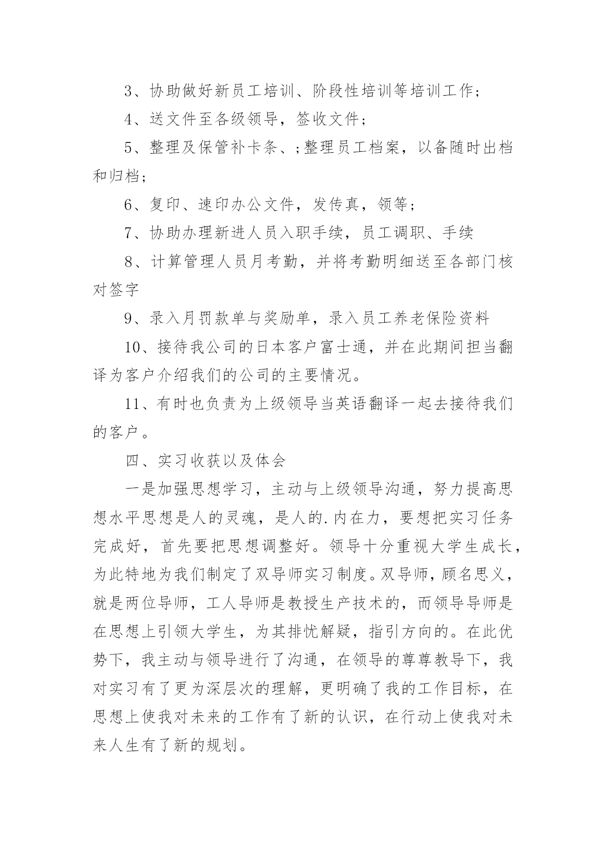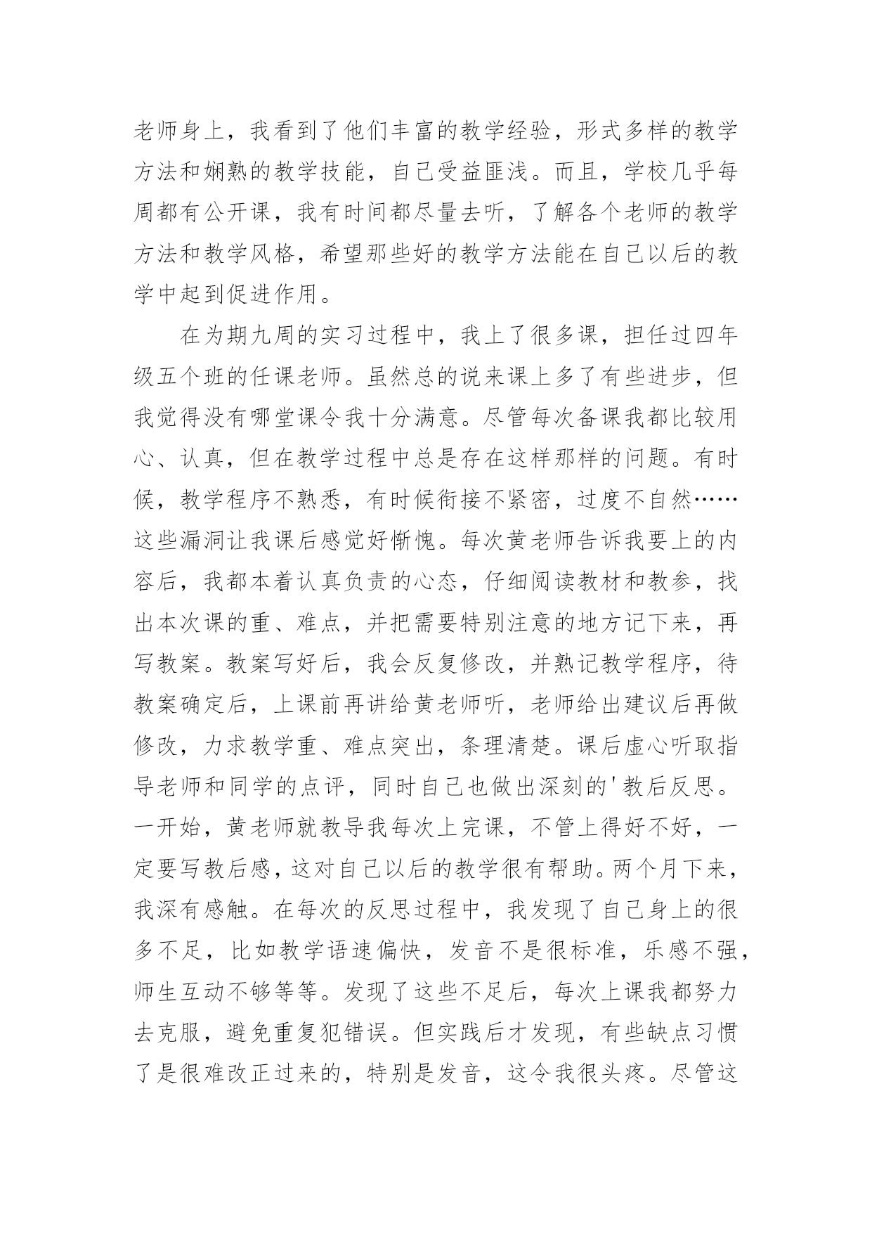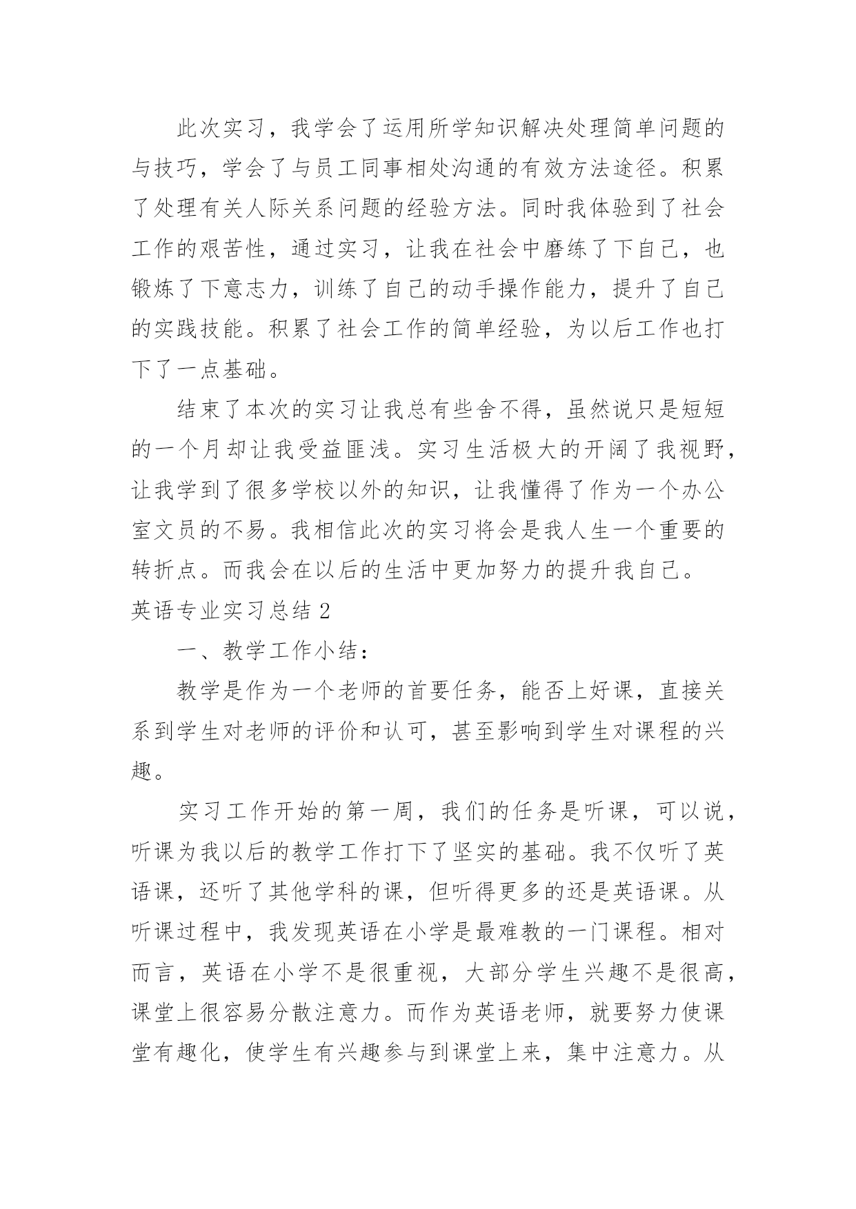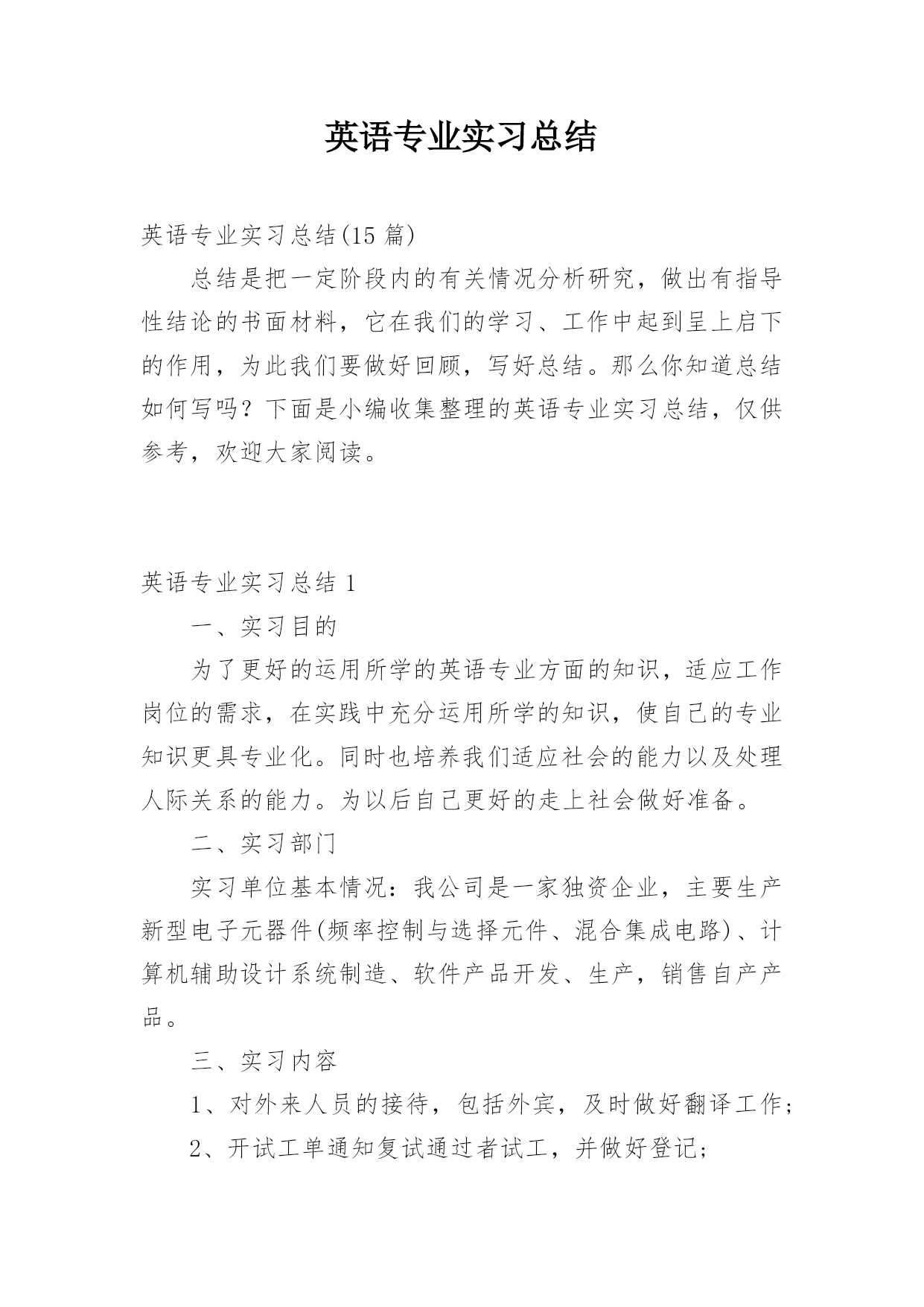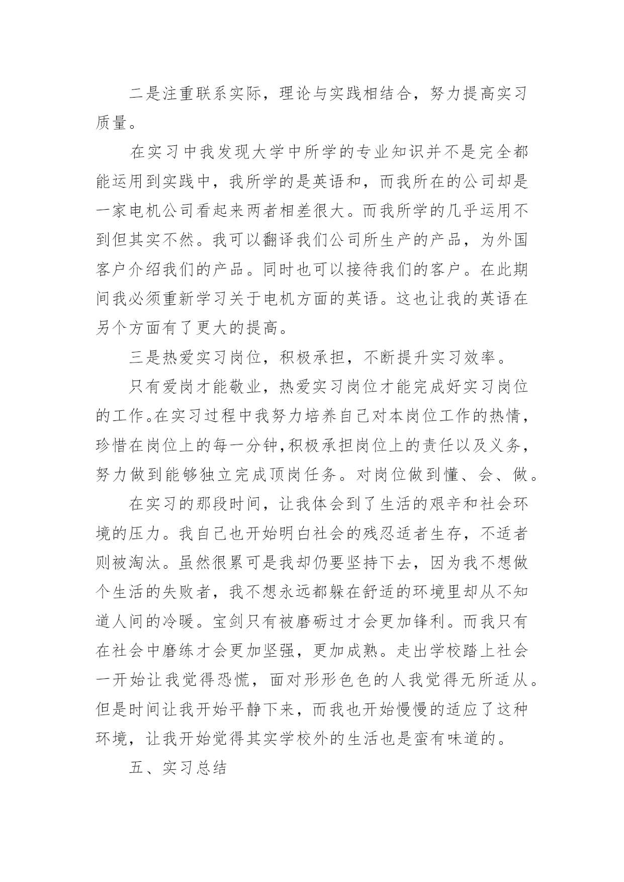 英语专业实习总结 英语专业实习总结(15篇)总结是把一定阶段内的有关情况分析研究,做出有指导性结论的书面材料,它在我们的学习、工作中起到呈上启下的作用,为此我们要做好回顾,写好总结。那么你知道总结如何写吗?下面是小编收集整理的英语专业实习总结,仅供参考,欢迎大家阅读。英语专业实习总结1一、实习目的为了更好的运用所学的英语专业方面的知识,适应工作岗位的需求,在实践中充分运用所学的知识,使自己的专业知识更具专业化。同时也培养我们适应社会的能力以及处理人际关系的能力。为以后自己更好的走上社会做好准备。二、实习部门实习单位基本情况:我公司是一家独资企业,主要生产新型电子元器件(频率控制与选择元件、混合集成电路)、计算机辅助设计系统制造、软件产品开发、生产,销售自产产品。三、实习内容1、对外来人员的接待,包括外宾,及时做好翻译工作;2、开试工单通知复试通过者试工,并做好登记;3、协助做好新员工培训、阶段性培训等培训工作;4、送文件至各级领导,签收文件;5、整理及保管补卡条、;整理员工档案,以备随时出档和归档;6、复印、速印办公文件,发传真,领等;7、协助办理新进人员入职手续,员工调职、手续8、计算管理人员月考勤,并将考勤明细送至各部门核对签字9、录入月罚款单与奖励单,录入员工养老保险资料10、接待我公司的日本客户富士通,并在此期间担当翻译为客户介绍我们的公司的主要情况。11、有时也负责为上级领导当英语翻译一起去接待我们的客户。四、实习收获以及体会一是加强思想学习,主动与上级领导沟通,努力提高思想水平思想是人的灵魂,是人的.内在力,要想把实习任务完成好,首先要把思想调整好。领导十分重视大学生成长,为此特地为我们制定了双导师实习制度。双导师,顾名思义,就是两位导师,工人导师是教授生产技术的,而领导导师是在思想上引领大学生,为其排忧解疑,指引方向的。在此优势下,我主动与领导进行了沟通,在领导的尊尊教导下,我对实习有了更为深层次的理解,更明确了我的工作目标,在思想上使我对未来的工作有了新的认识,在行动上使我对未来人生有了新的规划。二是注重联系实际,理论与实践相结合,努力提高实习质量。在实习中我发现大学中所学的专业知识并不是完全都能运用到实践中,我所学的是英语和,而我所在的公司却是一家电机公司看起来两者相差很大。而我所学的几乎运用不到但其实不然。我可以翻译我们公司所生产的产品,为外国客户介绍我们的产品。同时也可以接待我们的客户。在此期间我必须重新学习关于电机方面的英语。这也让我的英语在另个方面有了更大的提高。三是热爱实习岗位,积极承担,不断提升实习效率。只有爱岗才能敬业,热爱实习岗位才能完成好实习岗位的工作。在实习过程中我努力培养自己对本岗位工作的热情,珍惜在岗位上的每一分钟,积极承担岗位上的责任以及义务,努力做到能够独立完成顶岗任务。对岗位做到懂、会、做。在实习的那段时间,让我体会到了生活的艰辛和社会环境的压力。我自己也开始明白社会的残忍适者生存,不适者则被淘汰。虽然很累可是我却仍要坚持下去,因为我不想做个生活的失败者,我不想永远都躲在舒适的环境里却从不知道人间的冷暖。宝剑只有被磨砺过才会更加锋利。而我只有在社会中磨练才会更加坚强,更加成熟。走出学校踏上社会一开始让我觉得恐慌,面对形形色色的人我觉得无所适从。但是时间让我开始平静下来,而我也开始慢慢的适应了这种环境,让我开始觉得其实学校外的生活也是蛮有味道的。五、实习总结此次实习,我学会了运用所学知识解决处理简单问题的与技巧,学会了与员工同事相处沟通的有效方法途径。积累了处理有关人际关系问题的经验方法。同时我体验到了社会工作的艰苦性,通过实习,让我在社会中磨练了下自己,也锻炼了下意志力,训练了自己的动手操作能力,提升了自己的实践技能。积累了社会工作的简单经验,为以后工作也打下了一点基础。结束了本次的实习让我总有些舍不得,虽然说只是短短的一个月却让我受益匪浅。实习生活极大的开阔了我视野,让我学到了很多学校以外的知识,让我懂得了作为一个办公室文员的不易。我相信此次的实习将会是我人生一个重要的转折点。而我会在以后的生活中更加努力的提升我自己。英语专业实习总结2一、教学工作小结:教学是作为一个老师的首要任务,能否上好课,直接关系到学生对老师的评价和认可,甚至影响到学生对课程的兴趣。实习工作开始的第一周,我们的任务是听课,可以说,听课为我以后的教学工作打下了坚实的基础。我不仅听了英语课,还听了其他学科的课,但听得更多的还是英语课。从听课过程中,我发现英语在小学是最难教的一门课程。相对而言,英语在小学不是很重视,大部分学生兴趣不是很高,课堂上很容易分散注意力。而作为英语老师,就要努力使课堂有趣化,使学生有兴趣参与到课堂上来,集中注意力。从老师身上,我看到了他们丰富的教学经验,形式多样的教学方法和娴熟的教学