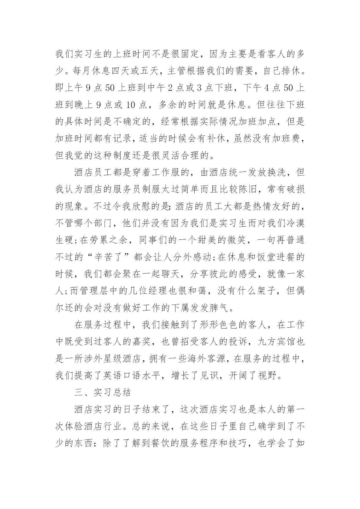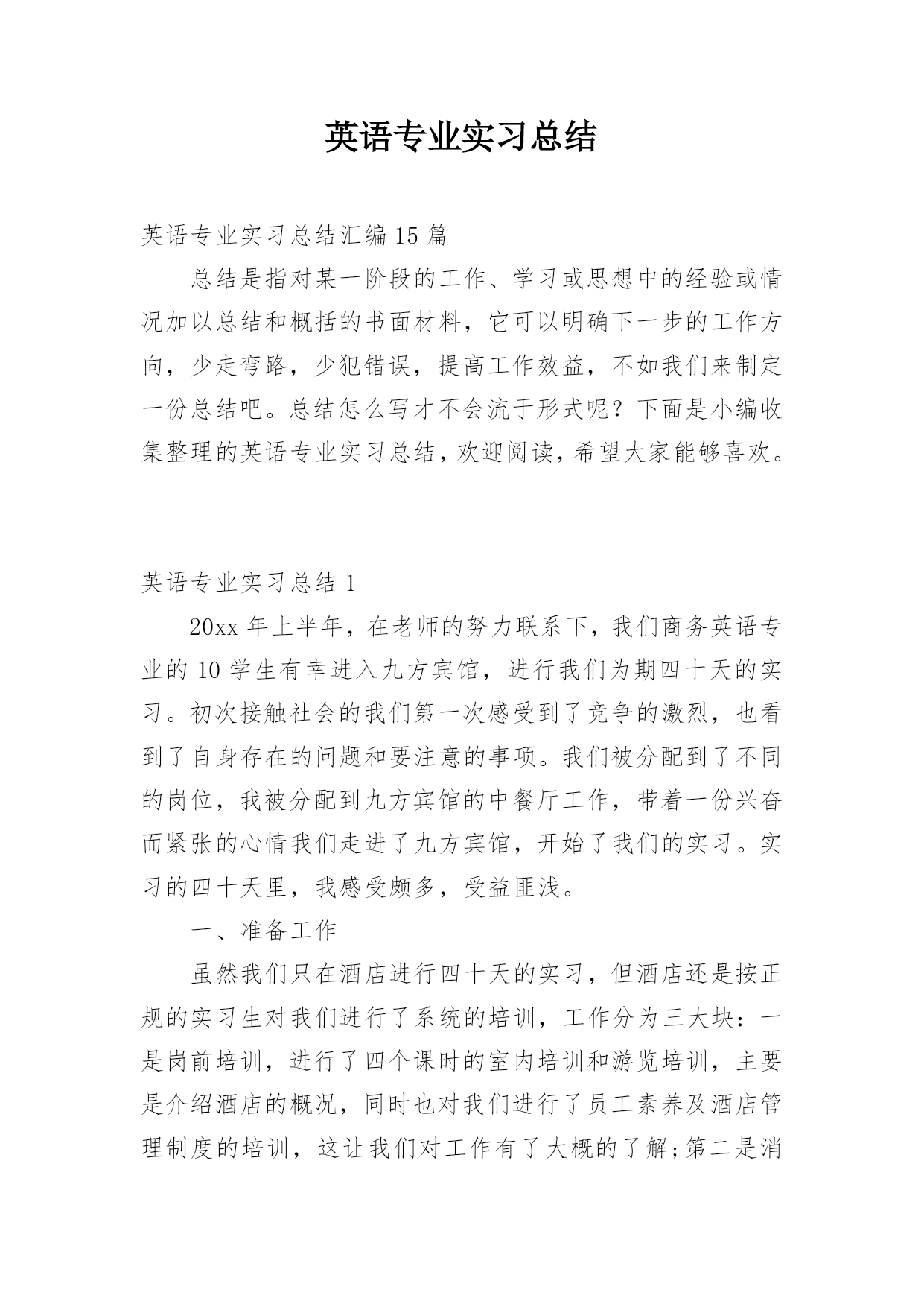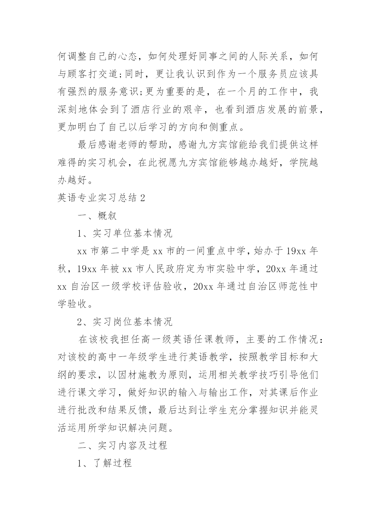 英语专业实习总结 英语专业实习总结汇编15篇总结是指对某一阶段的工作、学习或思想中的经验或情况加以总结和概括的书面材料,它可以明确下一步的工作方向,少走弯路,少犯错误,提高工作效益,不如我们来制定一份总结吧。总结怎么写才不会流于形式呢?下面是小编收集整理的英语专业实习总结,欢迎阅读,希望大家能够喜欢。英语专业实习总结120xx年上半年,在老师的努力联系下,我们商务英语专业的10学生有幸进入九方宾馆,进行我们为期四十天的实习。初次接触社会的我们第一次感受到了竞争的激烈,也看到了自身存在的问题和要注意的事项。我们被分配到了不同的岗位,我被分配到九方宾馆的中餐厅工作,带着一份兴奋而紧张的心情我们走进了九方宾馆,开始了我们的实习。实习的四十天里,我感受颇多,受益匪浅。一、准备工作虽然我们只在酒店进行四十天的实习,但酒店还是按正规的实习生对我们进行了系统的培训,工作分为三大块:一是岗前培训,进行了四个课时的室内培训和游览培训,主要是介绍酒店的概况,同时也对我们进行了员工素养及酒店管理制度的培训,这让我们对工作有了大概的了解;第二是消防安全意识培训,酒店特别安排了工程部的经理和主管为我们现场讲解授课,让我们对酒店安全和消防常识有了更深入系统的了解;第三是业务技能培训,这一培训贯穿着我们实习的四十天。由部门负责人员为我们进行不间断的技能指导,四十天的实习让我们对部门工作有了基本的了解,这也得益于酒店系统而全面的培训。这些培训对于我们以后的学习和工作都是非常有用的。我们实习的单位--九方宾馆是一所成立于20xx年的四星级涉外酒店,酒店管理先进,客源市场广阔。其餐饮部大致分成如下几个部门:中餐部和西餐部,我和同行7名同学的`工作岗位就是中餐部。九方食府是九方宾馆最主要的一个餐厅,主要承担的是宴席和宴请的用餐,餐厅员工有将近20人,包括主管两名和三名领班及服务员数名,工作比较繁忙。二、实习过程中餐厅是酒店餐饮部门中最为辛苦的部门,因为酒店并没有给服务员们制定具体的岗位职责和工作描述,在刚刚走进工作岗位的几天,我们就像无头苍蝇,完全不能领会工作的流程和要领,只是听从领班和老员工的安排和他们手把手的教导。庆幸的是基本所有的老员工对我们都特别的友好,主管还专门为我们每人安排了一名师傅,负责引导我们的工作。在后面的日子里,我们基本都能熟练各项工作了。我们的工作除了摆台、折口布、传菜、上菜、撤台外,也得兼职勤杂工,扛桌子椅子、铺地毯等一些脏活、重活。我们实习生的上班时间不是很固定,因为主要是看客人的多少。每月休息四天或五天,主管根据我们的需要,自己排休。即上午9点50上班到中午2点或3点下班,下午4点50上班到晚上9点或10点,多余的时间就是休息。但往往下班的具体时间是不确定的,经常根据实际情况加班加点,但是加班时间都有记录,适当的时候会有补休,虽然没有加班费,但我觉的这种制度还是很灵活合理的。酒店员工都是穿着工作服的,由酒店统一发放换洗,但我认为酒店的服务员制服太过简单而且比较陈旧,常有破损的现象。不过令我欣慰的是:酒店的员工大都是热情友好的,不管哪个部门,他们并没有因为我们是实习生而对我们冷漠生硬;在劳累之余,同事们的一个甜美的微笑,一句再普通不过的“辛苦了”都会让人分外感动;在休息和饭堂进餐的时候,我们都会聚在一起聊天,分享彼此的感受,就像一家人;而管理层中的几位经理也很和蔼,没有什么架子,但偶尔还的会对没有做好工作的下属发发脾气。在服务过程中,我们接触到了形形色色的客人,在工作中既受到过客人的嘉奖,也曾招受客人的投诉,九方宾馆也是一所涉外星级酒店,拥有一些海外客源,在服务的过程中,我们提高了英语口语水平,增长了见识,开阔了视野。三、实习总结酒店实习的日子结束了,这次酒店实习也是本人的第一次体验酒店行业。总的来说,在这些日子里自己确学到了不少的东西:除了了解到餐饮的服务程序和技巧,也学会了如何调整自己的心态,如何处理好同事之间的人际关系,如何与顾客打交道;同时,更让我认识到作为一个服务员应该具有强烈的服务意识;更为重要的是,在一个月的工作中,我深刻地体会到了酒店行业的艰辛,也看到酒店发展的前景,更加明白了自己以后学习的方向和侧重点。最后感谢老师的帮助,感谢九方宾馆能给我们提供这样难得的实习机会,在此祝愿九方宾馆能够越办越好,学院越办越好。英语专业实习总结2一、概叙1、实习单位基本情况xx市第二中学是xx市的一间重点中学,始办于19xx年秋,19xx年被xx市人民政府定为市实验中学,20xx年通过xx自治区一级学校评估验收,20xx年通过自治区师范性中学验收。2、实习岗位基本情况在该校我担任高一级英语任课教师,主要的工作情况:对该校的高中一年级学生进行英语教学,按照教学目标和大纲的要求,以因材施教为原则,运用相关教学技巧引导他们进行课文学习,做好知识
