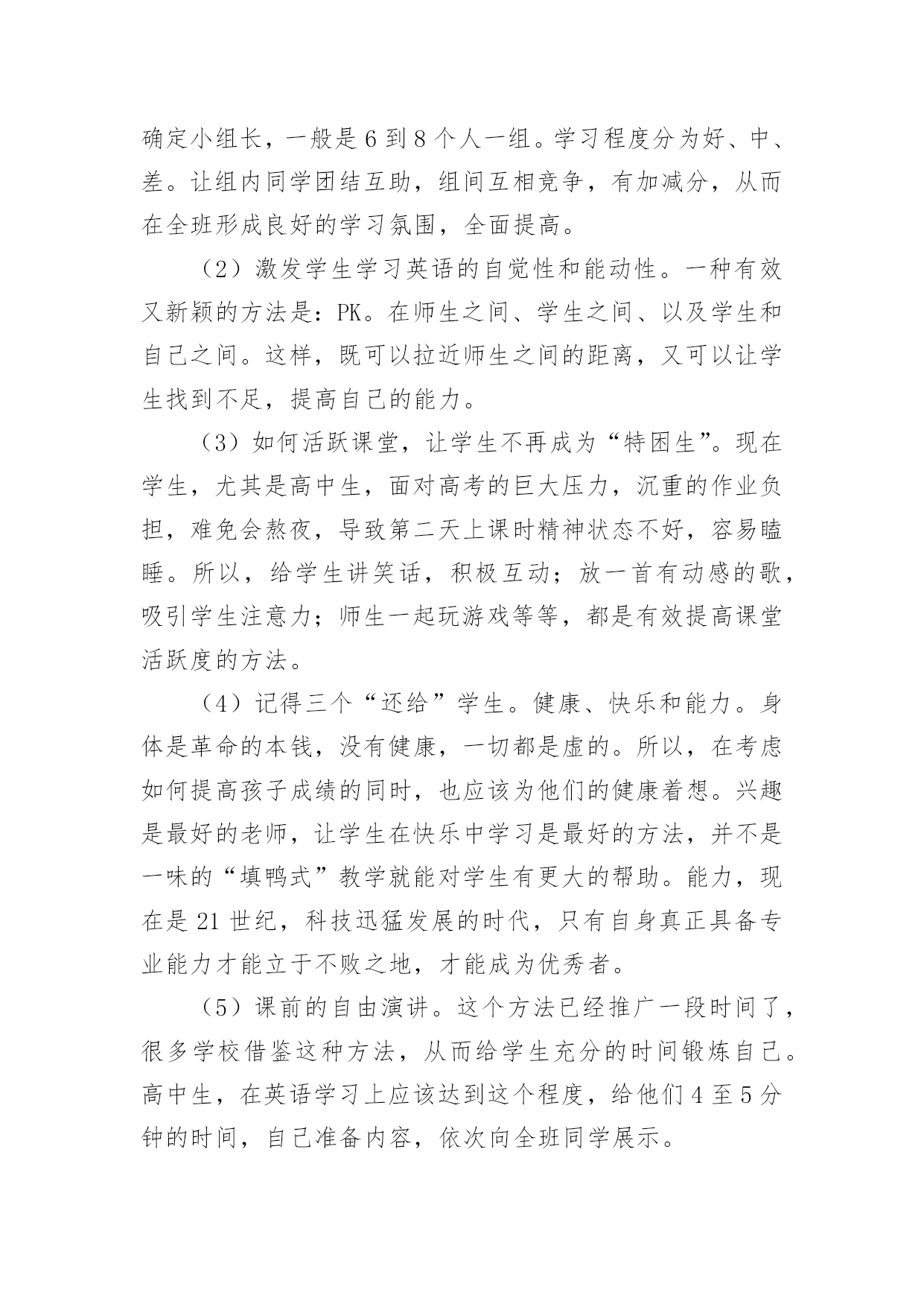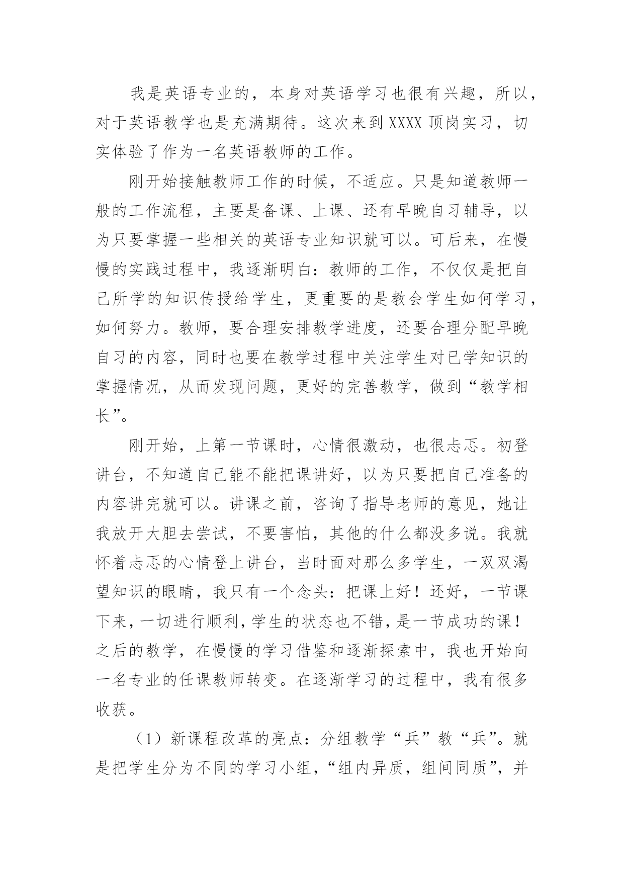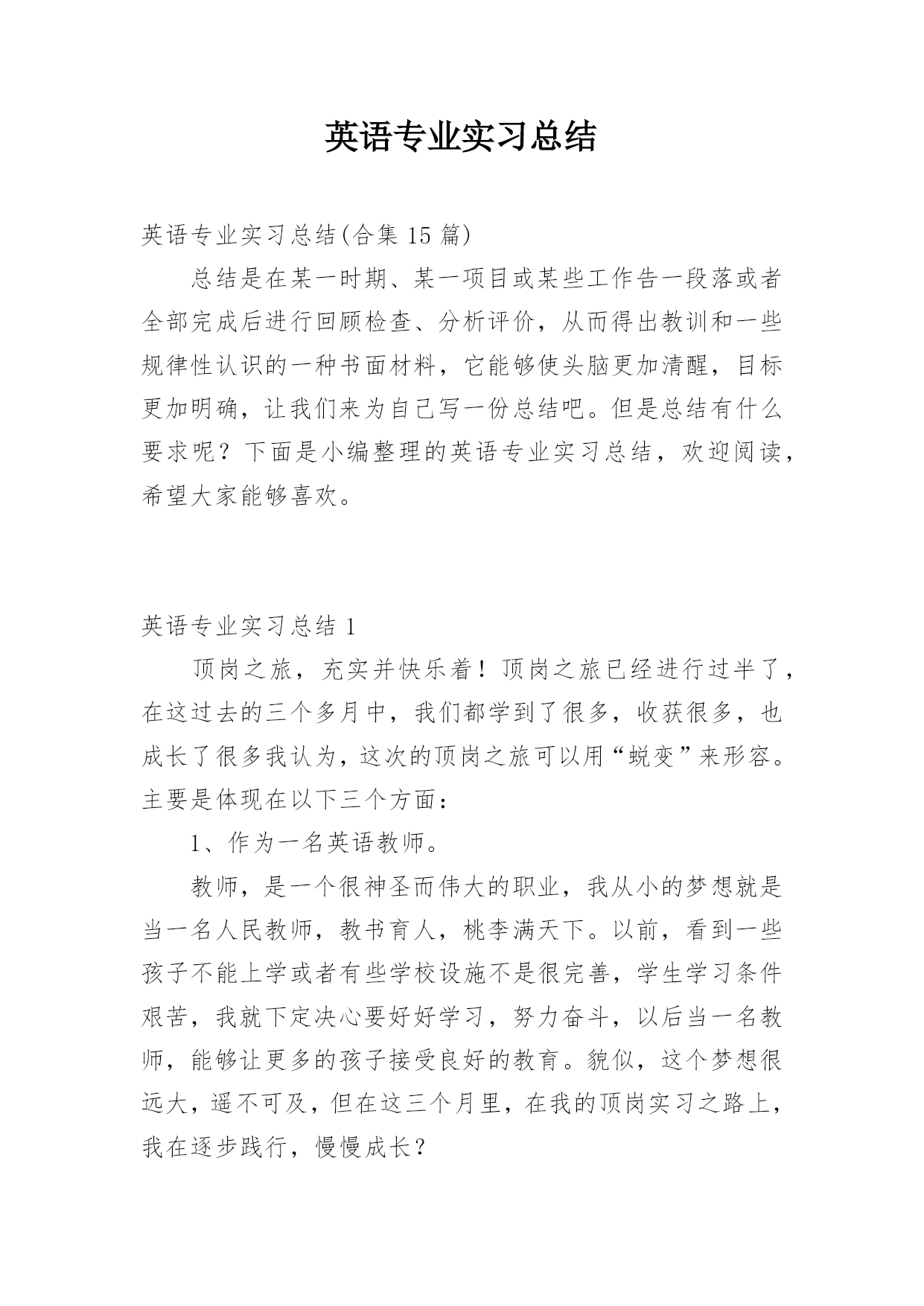 英语专业实习总结 英语专业实习总结(合集15篇)总结是在某一时期、某一项目或某些工作告一段落或者全部完成后进行回顾检查、分析评价,从而得出教训和一些规律性认识的一种书面材料,它能够使头脑更加清醒,目标更加明确,让我们来为自己写一份总结吧。但是总结有什么要求呢?下面是小编整理的英语专业实习总结,欢迎阅读,希望大家能够喜欢。英语专业实习总结1顶岗之旅,充实并快乐着!顶岗之旅已经进行过半了,在这过去的三个多月中,我们都学到了很多,收获很多,也成长了很多我认为,这次的顶岗之旅可以用“蜕变”来形容。主要是体现在以下三个方面:1、作为一名英语教师。教师,是一个很神圣而伟大的职业,我从小的梦想就是当一名人民教师,教书育人,桃李满天下。以前,看到一些孩子不能上学或者有些学校设施不是很完善,学生学习条件艰苦,我就下定决心要好好学习,努力奋斗,以后当一名教师,能够让更多的孩子接受良好的教育。貌似,这个梦想很远大,遥不可及,但在这三个月里,在我的顶岗实习之路上,我在逐步践行,慢慢成长?我是英语专业的,本身对英语学习也很有兴趣,所以,对于英语教学也是充满期待。这次来到XXXX顶岗实习,切实体验了作为一名英语教师的工作。刚开始接触教师工作的时候,不适应。只是知道教师一般的工作流程,主要是备课、上课、还有早晚自习辅导,以为只要掌握一些相关的英语专业知识就可以。可后来,在慢慢的实践过程中,我逐渐明白:教师的工作,不仅仅是把自己所学的知识传授给学生,更重要的是教会学生如何学习,如何努力。教师,要合理安排教学进度,还要合理分配早晚自习的内容,同时也要在教学过程中关注学生对已学知识的掌握情况,从而发现问题,更好的完善教学,做到“教学相长”。刚开始,上第一节课时,心情很激动,也很忐忑。初登讲台,不知道自己能不能把课讲好,以为只要把自己准备的内容讲完就可以。讲课之前,咨询了指导老师的意见,她让我放开大胆去尝试,不要害怕,其他的什么都没多说。我就怀着忐忑的心情登上讲台,当时面对那么多学生,一双双渴望知识的眼睛,我只有一个念头:把课上好!还好,一节课下来,一切进行顺利,学生的状态也不错,是一节成功的课!之后的教学,在慢慢的学习借鉴和逐渐探索中,我也开始向一名专业的任课教师转变。在逐渐学习的过程中,我有很多收获。(1)新课程改革的亮点:分组教学“兵”教“兵”。就是把学生分为不同的学习小组,“组内异质,组间同质”,并确定小组长,一般是6到8个人一组。学习程度分为好、中、差。让组内同学团结互助,组间互相竞争,有加减分,从而在全班形成良好的学习氛围,全面提高。(2)激发学生学习英语的自觉性和能动性。一种有效又新颖的方法是:PK。在师生之间、学生之间、以及学生和自己之间。这样,既可以拉近师生之间的距离,又可以让学生找到不足,提高自己的能力。(3)如何活跃课堂,让学生不再成为“特困生”。现在学生,尤其是高中生,面对高考的巨大压力,沉重的作业负担,难免会熬夜,导致第二天上课时精神状态不好,容易瞌睡。所以,给学生讲笑话,积极互动;放一首有动感的歌,吸引学生注意力;师生一起玩游戏等等,都是有效提高课堂活跃度的方法。(4)记得三个“还给”学生。健康、快乐和能力。身体是革命的本钱,没有健康,一切都是虚的。所以,在考虑如何提高孩子成绩的同时,也应该为他们的健康着想。兴趣是最好的老师,让学生在快乐中学习是最好的方法,并不是一味的“填鸭式”教学就能对学生有更大的帮助。能力,现在是21世纪,科技迅猛发展的时代,只有自身真正具备专业能力才能立于不败之地,才能成为优秀者。(5)课前的自由演讲。这个方法已经推广一段时间了,很多学校借鉴这种方法,从而给学生充分的时间锻炼自己。高中生,在英语学习上应该达到这个程度,给他们4至5分钟的时间,自己准备内容,依次向全班同学展示。(6)当堂检测。我注意到有部分老师很注重对学生的当堂检测,有的老师一节课时间不够用,所以没有时间看学生掌握的情况,我认为,当堂检测是很有必要的,现在提倡“高效课堂”,要充分高效地利用一节课的时间,对学生掌握情况的了解也是其中很重要的一环,这样,有利于学生对已学知识的掌握,也有利于老师接下来的教学。现在,如何备课、上课、安排早晚自习以及辅导个别学生,我已经很熟练了。面对,上课过程中可能出现的一系列问题,我都能够从容面对,及时处理。也知道应该怎样面对一些突发状况。我相信,我的学生是很优秀的,我可以成为一名优秀的教师!2、作为一名副班主任。副班主任,这个名词是我以前没有听说过的。只知道,有副班长,副班主任也是我来到XX才接触到的,而且还是落在我身上。第一次正式接触我们XXXX班的学生是在20xx年X月XX日,新生报道的时候。那时候,只知道接新生,看到他们一个个陌生又稚嫩的面孔,想到自己上高中时的样子。没想到,这么有缘,我们一起搬书,我还在当天晚上