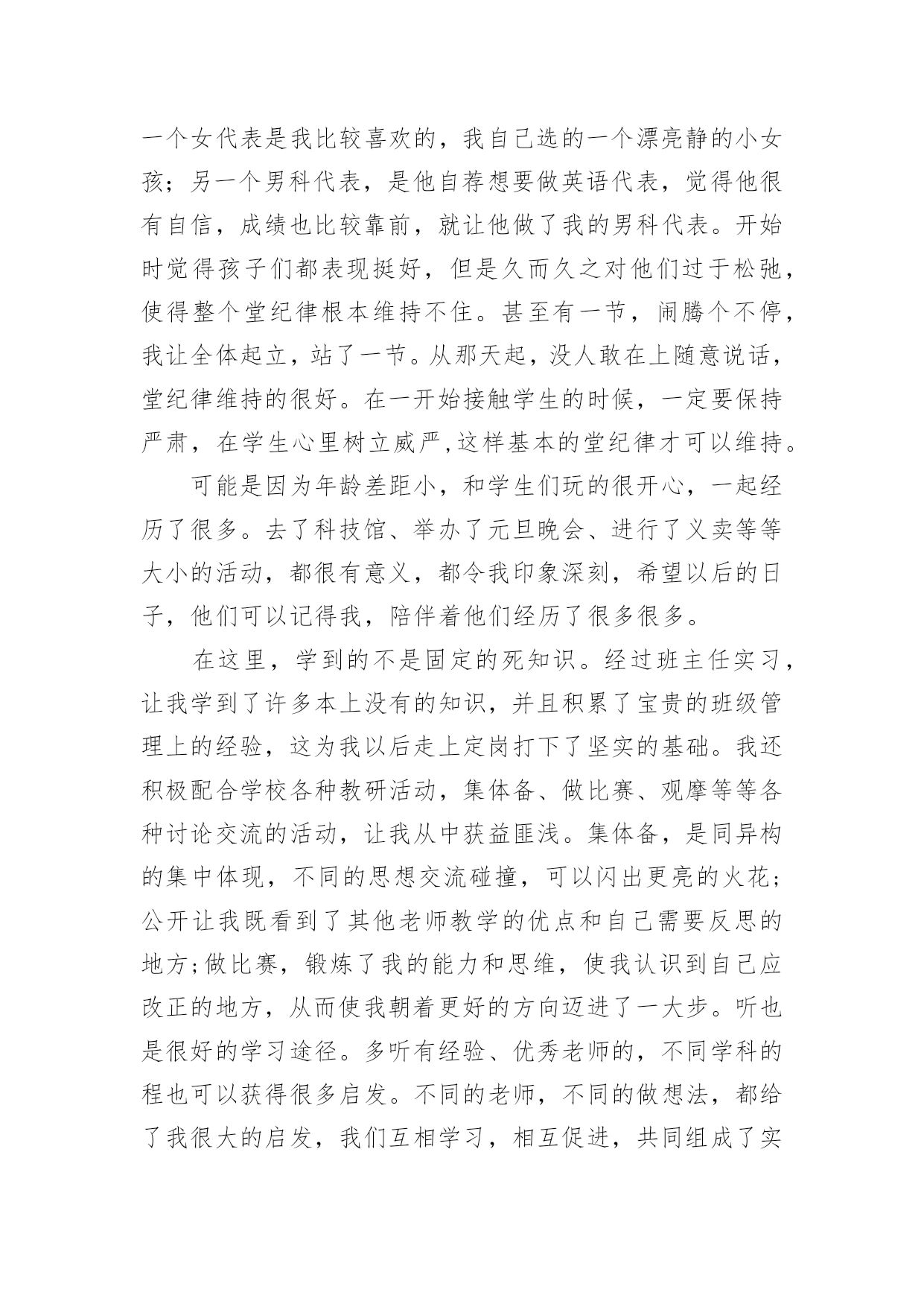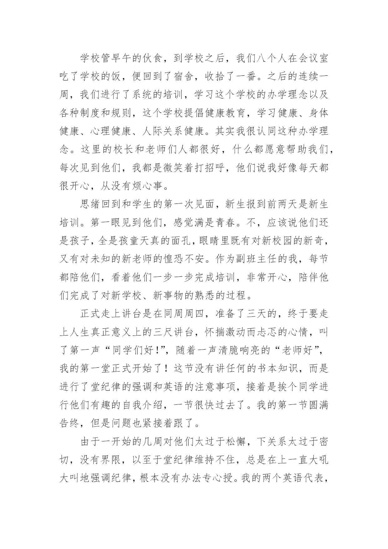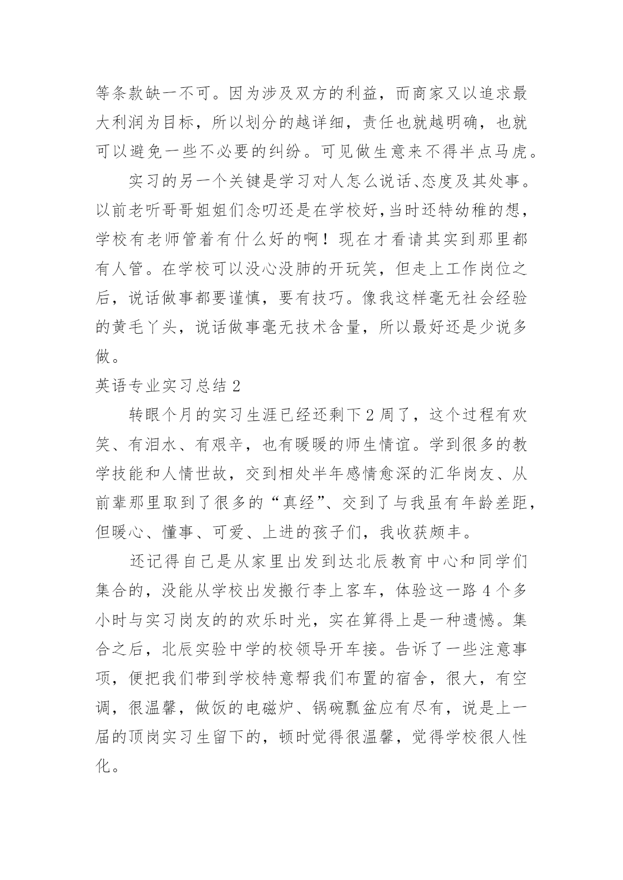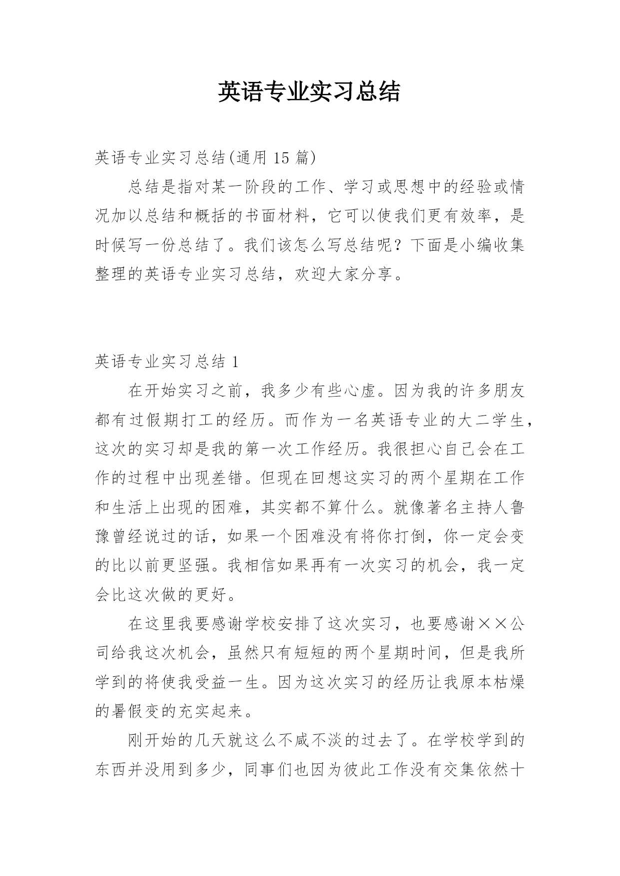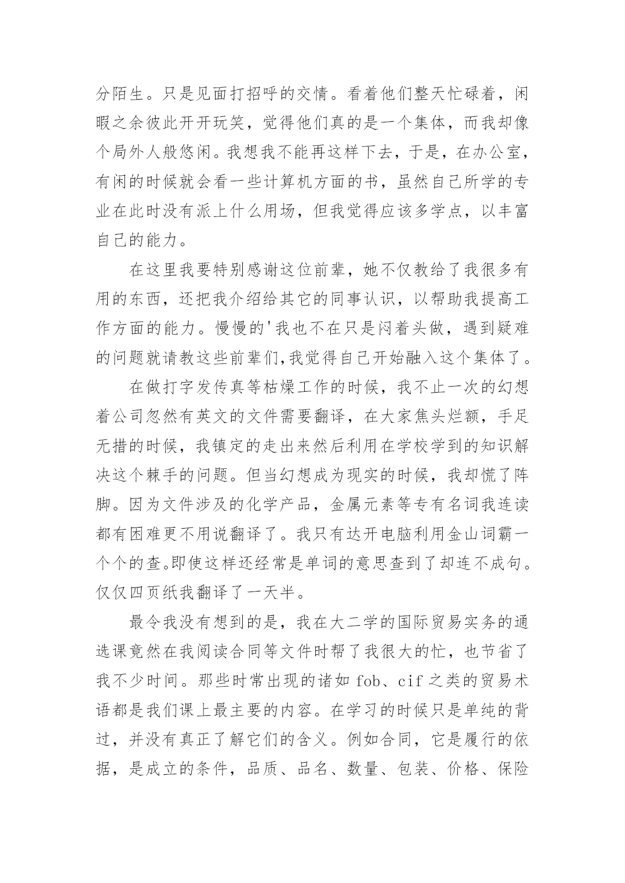 英语专业实习总结 英语专业实习总结(通用15篇)总结是指对某一阶段的工作、学习或思想中的经验或情况加以总结和概括的书面材料,它可以使我们更有效率,是时候写一份总结了。我们该怎么写总结呢?下面是小编收集整理的英语专业实习总结,欢迎大家分享。英语专业实习总结1在开始实习之前,我多少有些心虚。因为我的许多朋友都有过假期打工的经历。而作为一名英语专业的大二学生,这次的实习却是我的第一次工作经历。我很担心自己会在工作的过程中出现差错。但现在回想这实习的两个星期在工作和生活上出现的困难,其实都不算什么。就像著名主持人鲁豫曾经说过的话,如果一个困难没有将你打倒,你一定会变的比以前更坚强。我相信如果再有一次实习的机会,我一定会比这次做的更好。在这里我要感谢学校安排了这次实习,也要感谢××公司给我这次机会,虽然只有短短的两个星期时间,但是我所学到的将使我受益一生。因为这次实习的经历让我原本枯燥的暑假变的充实起来。刚开始的几天就这么不咸不淡的过去了。在学校学到的东西并没用到多少,同事们也因为彼此工作没有交集依然十分陌生。只是见面打招呼的交情。看着他们整天忙碌着,闲暇之余彼此开开玩笑,觉得他们真的是一个集体,而我却像个局外人般悠闲。我想我不能再这样下去,于是,在办公室,有闲的时候就会看一些计算机方面的书,虽然自己所学的专业在此时没有派上什么用场,但我觉得应该多学点,以丰富自己的能力。在这里我要特别感谢这位前辈,她不仅教给了我很多有用的东西,还把我介绍给其它的同事认识,以帮助我提高工作方面的能力。慢慢的'我也不在只是闷着头做,遇到疑难的问题就请教这些前辈们,我觉得自己开始融入这个集体了。在做打字发传真等枯燥工作的时候,我不止一次的幻想着公司忽然有英文的文件需要翻译,在大家焦头烂额,手足无措的时候,我镇定的走出来然后利用在学校学到的知识解决这个棘手的问题。但当幻想成为现实的时候,我却慌了阵脚。因为文件涉及的化学产品,金属元素等专有名词我连读都有困难更不用说翻译了。我只有达开电脑利用金山词霸一个个的查。即使这样还经常是单词的意思查到了却连不成句。仅仅四页纸我翻译了一天半。最令我没有想到的是,我在大二学的国际贸易实务的通选课竟然在我阅读合同等文件时帮了我很大的忙,也节省了我不少时间。那些时常出现的诸如fob、cif之类的贸易术语都是我们课上最主要的内容。在学习的时候只是单纯的背过,并没有真正了解它们的含义。例如合同,它是履行的依据,是成立的条件,品质、品名、数量、包装、价格、保险等条款缺一不可。因为涉及双方的利益,而商家又以追求最大利润为目标,所以划分的越详细,责任也就越明确,也就可以避免一些不必要的纠纷。可见做生意来不得半点马虎。实习的另一个关键是学习对人怎么说话、态度及其处事。以前老听哥哥姐姐们念叨还是在学校好,当时还特幼稚的想,学校有老师管着有什么好的啊!现在才看请其实到那里都有人管。在学校可以没心没肺的开玩笑,但走上工作岗位之后,说话做事都要谨慎,要有技巧。像我这样毫无社会经验的黄毛丫头,说话做事毫无技术含量,所以最好还是少说多做。英语专业实习总结2转眼个月的实习生涯已经还剩下2周了,这个过程有欢笑、有泪水、有艰辛,也有暖暖的师生情谊。学到很多的教学技能和人情世故,交到相处半年感情愈深的汇华岗友、从前辈那里取到了很多的“真经”、交到了与我虽有年龄差距,但暖心、懂事、可爱、上进的孩子们,我收获颇丰。还记得自己是从家里出发到达北辰教育中心和同学们集合的,没能从学校出发搬行李上客车,体验这一路4个多小时与实习岗友的的欢乐时光,实在算得上是一种遗憾。集合之后,北辰实验中学的校领导开车接。告诉了一些注意事项,便把我们带到学校特意帮我们布置的宿舍,很大,有空调,很温馨,做饭的电磁炉、锅碗瓢盆应有尽有,说是上一届的顶岗实习生留下的,顿时觉得很温馨,觉得学校很人性化。学校管早午的伙食,到学校之后,我们八个人在会议室吃了学校的饭,便回到了宿舍,收拾了一番。之后的连续一周,我们进行了系统的培训,学习这个学校的办学理念以及各种制度和规则,这个学校提倡健康教育,学习健康、身体健康、心理健康、人际关系健康。其实我很认同这种办学理念。这里的校长和老师们人都很好,什么都愿意帮助我们,每次见到他们,我都是微笑着打招呼,他们说我好像每天都很开心,从没有烦心事。思绪回到和学生的第一次见面,新生报到前两天是新生培训。第一眼见到他们,感觉满是青春。不,应该说他们还是孩子,全是孩童天真的面孔,眼睛里既有对新校园的新奇,又有对未知的新老师的惶恐不安。作为副班主任的我,每节都陪他们,看着他们一步一步完成培训,非常开心,陪伴他们完成了对新学校、新事物的熟悉的过程。正式走上讲台是在同周周四,准备了三天的,终于要走上人生真正意义上的三尺讲台,怀揣激动而忐忑的心情,叫了第一声“同学们好!”,随着一声