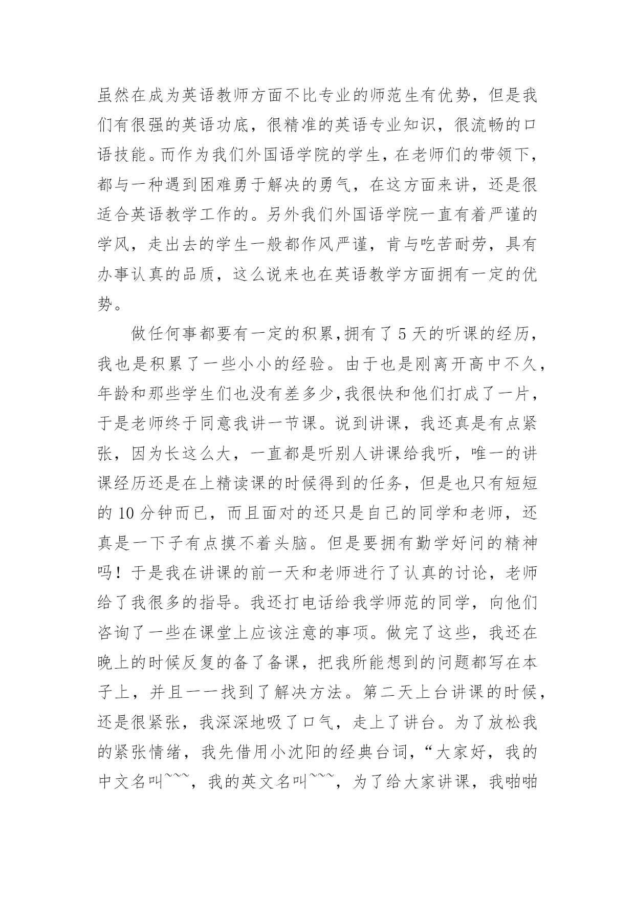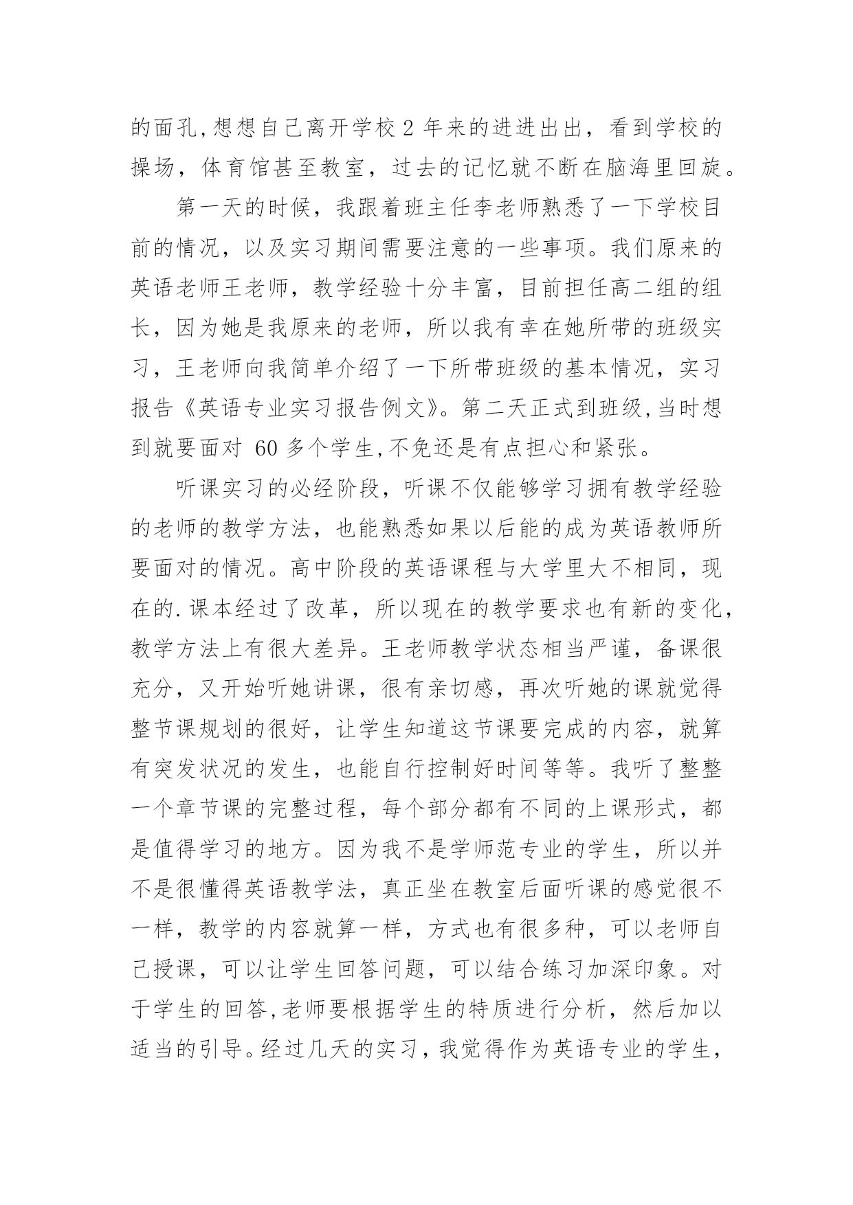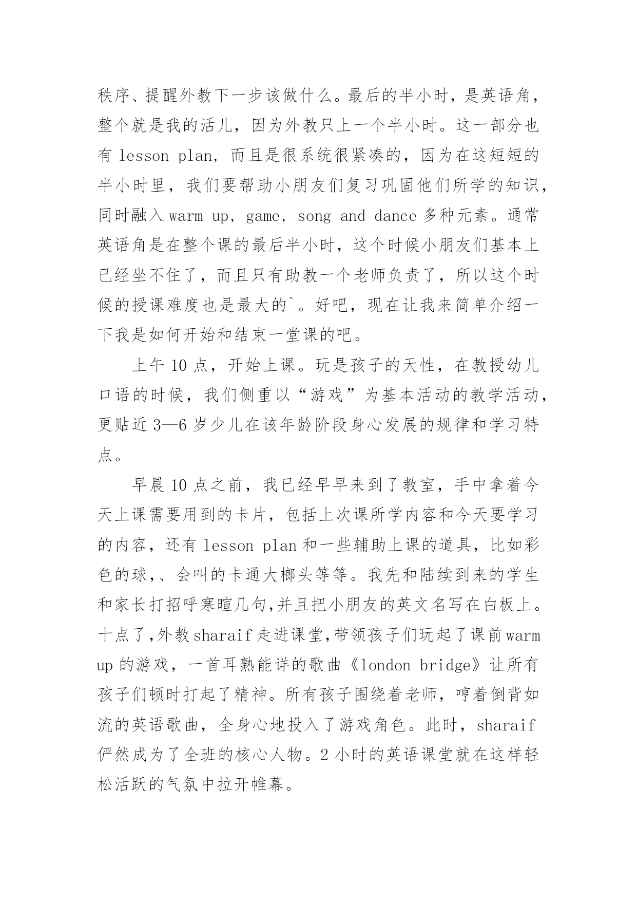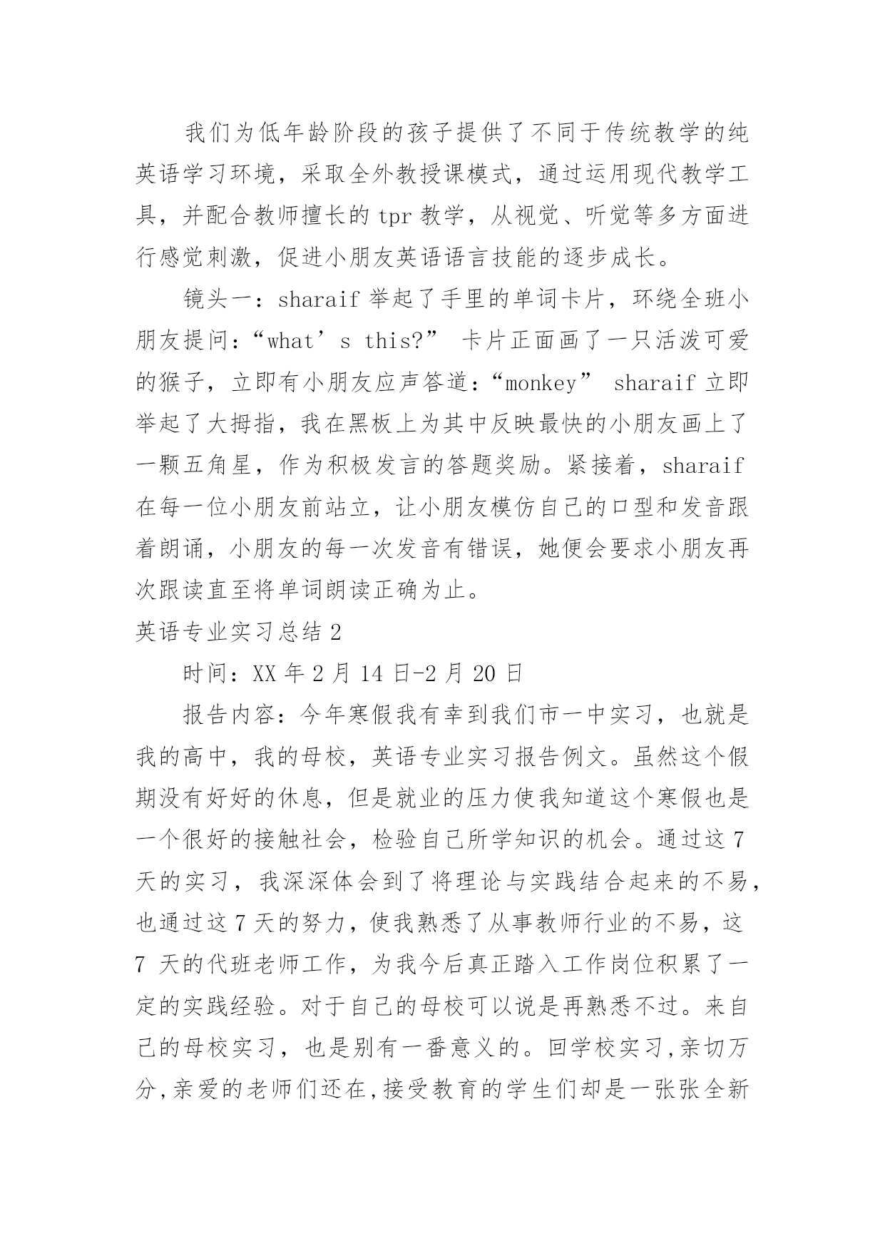 英语专业实习总结 【热门】英语专业实习总结总结就是把一个时段的学习、工作或其完成情况进行一次全面系统的总结,它可以促使我们思考,让我们好好写一份总结吧。但是总结有什么要求呢?以下是小编精心整理的英语专业实习总结,欢迎阅读与收藏。英语专业实习总结1暑假期间,作为一个英语师范专业的大三学生,我如愿以偿地来到了苏州太阳花英语学校进行了为期两个月的暑假实习。在这里,从对授课的概念还停留在书本上,到会设计有实际操作意义的lessonplan,再到能娴熟地进行授课活动;从面对孩子突然爆发的哭声茫然不知所措,到能妥善处理一些突发状况,我的确学到了很多,尤其是增长了许多的经历,这说长不长说短不短的两个月,是我在教育之路上的第一块敲门砖,也是我的第一桶金。从初试、复试、培训、听课再到正式授课,我经历了从student到studentteacher再到teacher的成长过程。作为助教,我们的作用是很大的。因为我们计划并且操作一堂课。课前,我们根据教科书编写lessonplan.就是一整堂课的流程,这是给外教用的,包括复习内容、新学内容、课堂游戏等等。课中,我们全程陪同,翻译、维护课堂秩序、提醒外教下一步该做什么。最后的半小时,是英语角,整个就是我的活儿,因为外教只上一个半小时。这一部分也有lessonplan,而且是很系统很紧凑的,因为在这短短的半小时里,我们要帮助小朋友们复习巩固他们所学的知识,同时融入warmup,game,songanddance多种元素。通常英语角是在整个课的最后半小时,这个时候小朋友们基本上已经坐不住了,而且只有助教一个老师负责了,所以这个时候的授课难度也是最大的`。好吧,现在让我来简单介绍一下我是如何开始和结束一堂课的吧。上午10点,开始上课。玩是孩子的天性,在教授幼儿口语的时候,我们侧重以“游戏”为基本活动的教学活动,更贴近3—6岁少儿在该年龄阶段身心发展的规律和学习特点。早晨10点之前,我已经早早来到了教室,手中拿着今天上课需要用到的卡片,包括上次课所学内容和今天要学习的内容,还有lessonplan和一些辅助上课的道具,比如彩色的球,、会叫的卡通大榔头等等。我先和陆续到来的学生和家长打招呼寒暄几句,并且把小朋友的英文名写在白板上。十点了,外教sharaif走进课堂,带领孩子们玩起了课前warmup的游戏,一首耳熟能详的歌曲《londonbridge》让所有孩子们顿时打起了精神。所有孩子围绕着老师,哼着倒背如流的英语歌曲,全身心地投入了游戏角色。此时,sharaif俨然成为了全班的核心人物。2小时的英语课堂就在这样轻松活跃的气氛中拉开帷幕。我们为低年龄阶段的孩子提供了不同于传统教学的纯英语学习环境,采取全外教授课模式,通过运用现代教学工具,并配合教师擅长的tpr教学,从视觉、听觉等多方面进行感觉刺激,促进小朋友英语语言技能的逐步成长。镜头一:sharaif举起了手里的单词卡片,环绕全班小朋友提问:“what’sthis?”卡片正面画了一只活泼可爱的猴子,立即有小朋友应声答道:“monkey”sharaif立即举起了大拇指,我在黑板上为其中反映最快的小朋友画上了一颗五角星,作为积极发言的答题奖励。紧接着,sharaif在每一位小朋友前站立,让小朋友模仿自己的口型和发音跟着朗诵,小朋友的每一次发音有错误,她便会要求小朋友再次跟读直至将单词朗读正确为止。英语专业实习总结2时间:XX年2月14日-2月20日报告内容:今年寒假我有幸到我们市一中实习,也就是我的高中,我的母校,英语专业实习报告例文。虽然这个假期没有好好的休息,但是就业的压力使我知道这个寒假也是一个很好的接触社会,检验自己所学知识的机会。通过这7天的实习,我深深体会到了将理论与实践结合起来的不易,也通过这7天的努力,使我熟悉了从事教师行业的不易,这7天的代班老师工作,为我今后真正踏入工作岗位积累了一定的实践经验。对于自己的母校可以说是再熟悉不过。来自己的母校实习,也是别有一番意义的。回学校实习,亲切万分,亲爱的老师们还在,接受教育的学生们却是一张张全新的面孔,想想自己离开学校2年来的进进出出,看到学校的操场,体育馆甚至教室,过去的记忆就不断在脑海里回旋。第一天的时候,我跟着班主任李老师熟悉了一下学校目前的情况,以及实习期间需要注意的一些事项。我们原来的英语老师王老师,教学经验十分丰富,目前担任高二组的组长,因为她是我原来的老师,所以我有幸在她所带的班级实习,王老师向我简单介绍了一下所带班级的基本情况,实习报告《英语专业实习报告例文》。第二天正式到班级,当时想到就要面对60多个学生,不免还是有点担心和紧张。听课实习的必经阶段,听课不仅能够学习拥有教学经验的老师的教学方法,也能熟悉如果以后能的成为英语教师所要面对的情况。高中阶段的英语课程与大学里大不相同,现在的