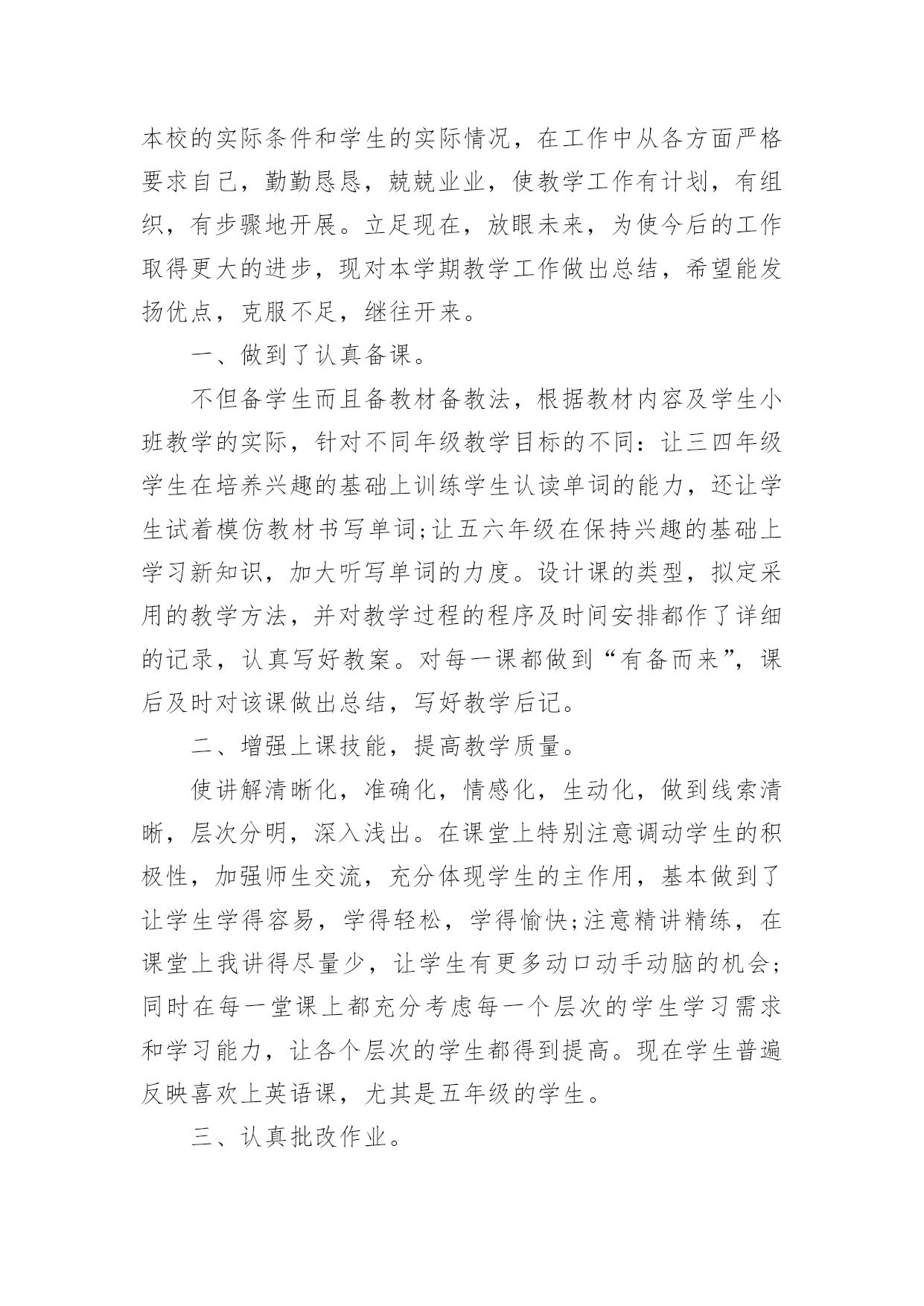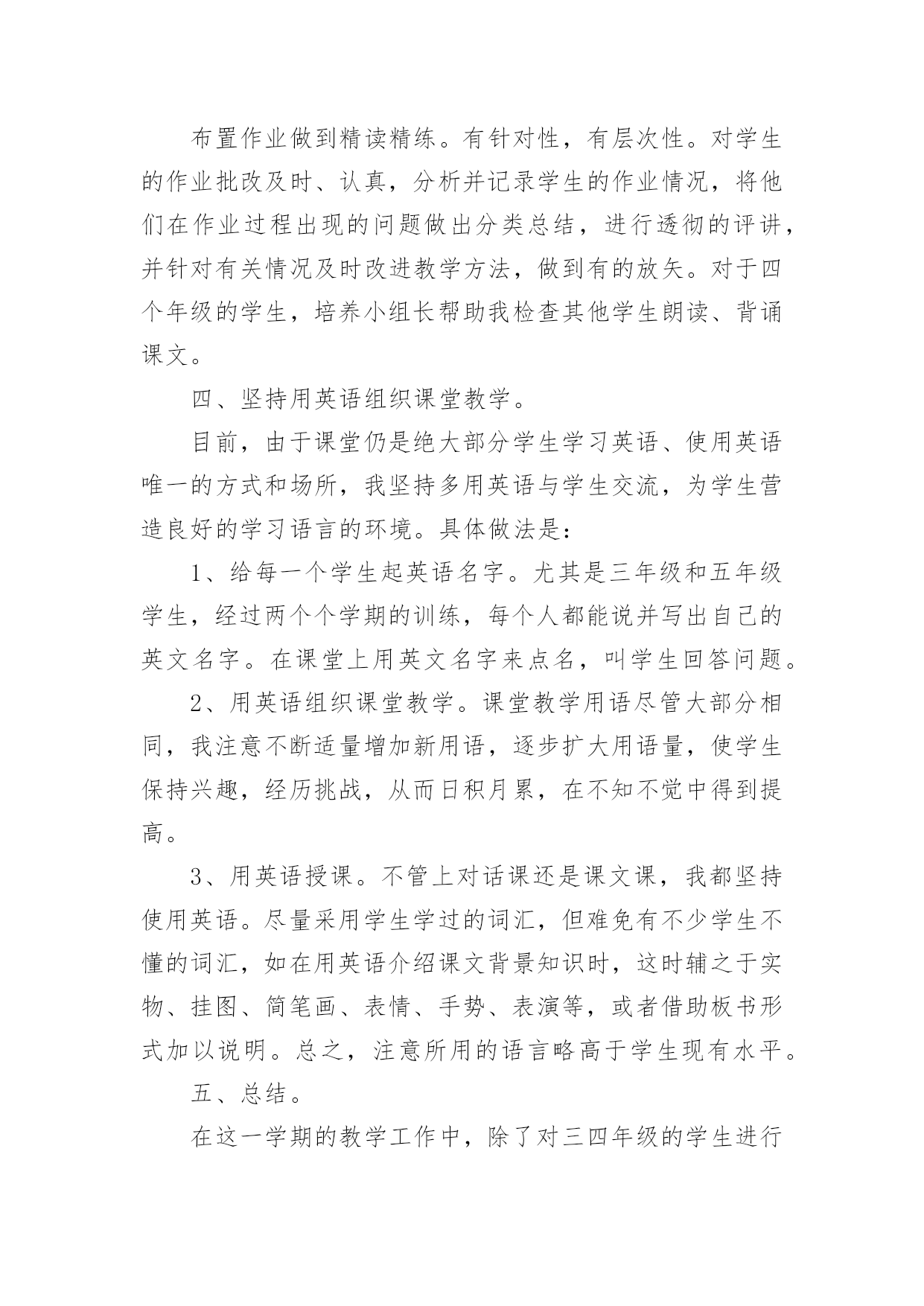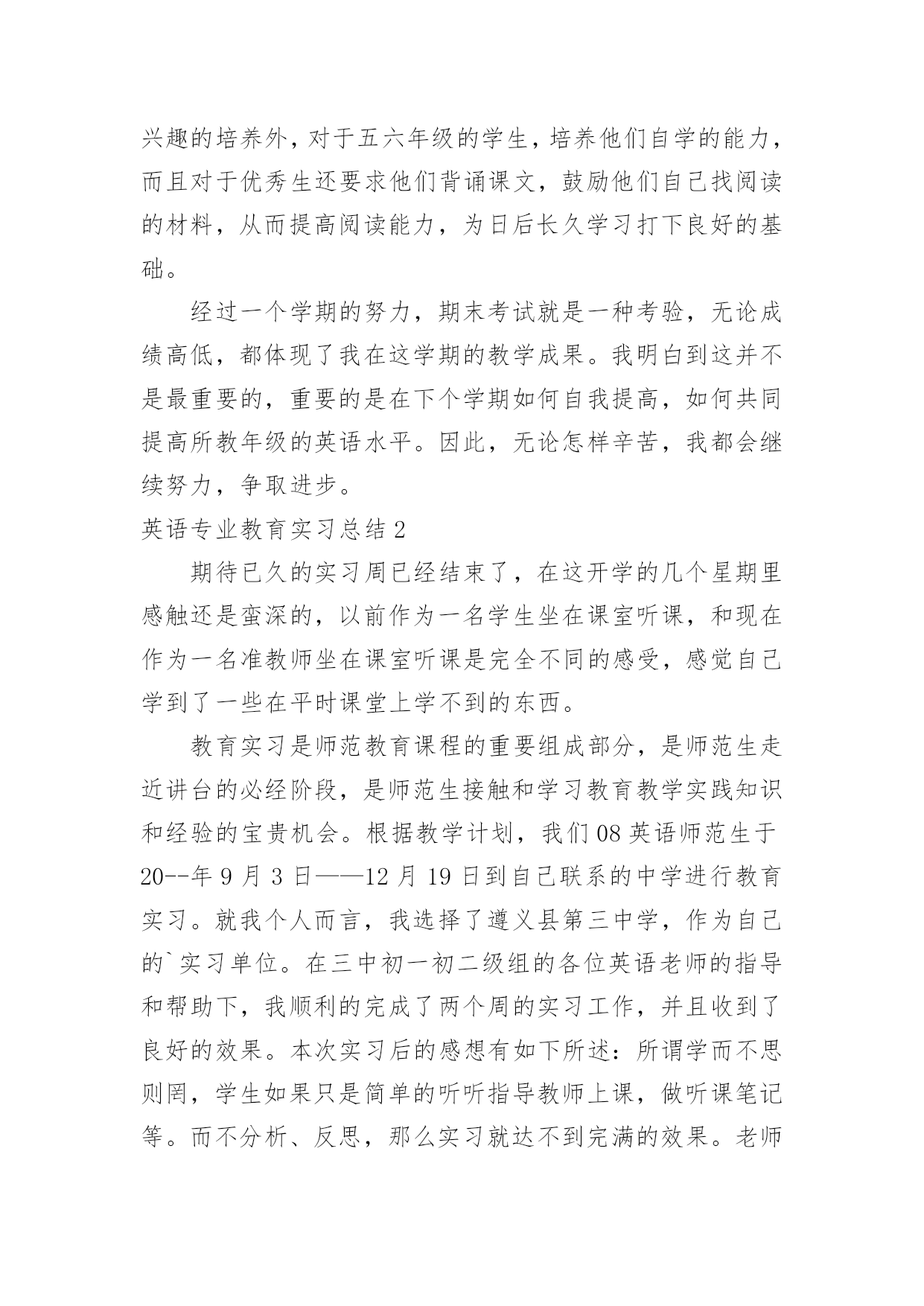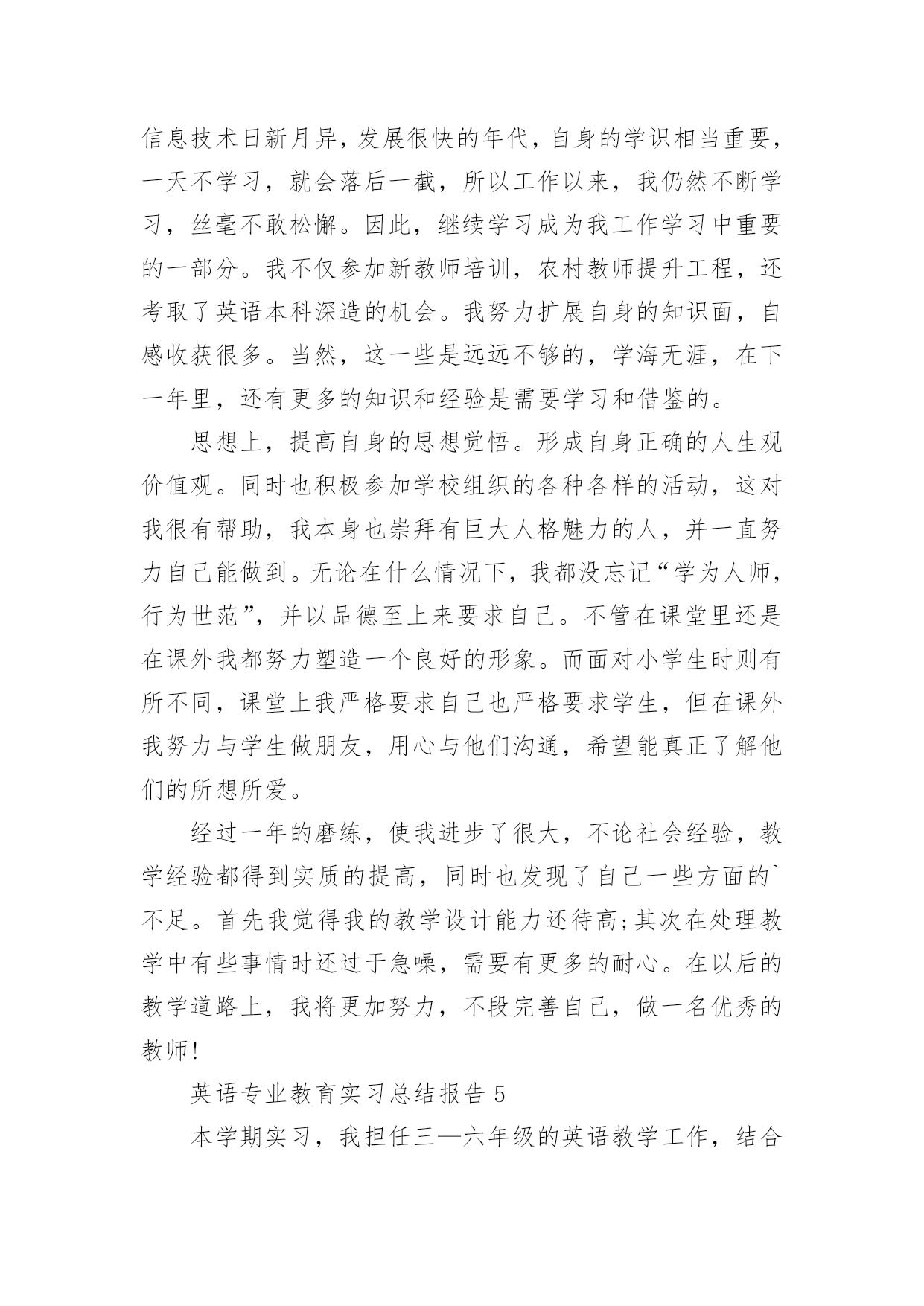 英语专业教育实习总结 英语专业教育实习总结5篇总结是在某一特定时间段对学习和工作生活或其完成情况,包括取得的成绩、存在的问题及得到的经验和教训加以回顾和分析的书面材料,它可以有效锻炼我们的语言组织能力,为此我们要做好回顾,写好总结。你想知道总结怎么写吗?下面是小编精心整理的英语专业教育实习总结,仅供参考,大家一起来看看吧。英语专业教育实习总结1从走上英语教师这个岗位已经有一年的实习时间了,在这一年里,我努力工作和不断学习,工作上取得比较理想的成绩,自身的知识面也得到提高,思想觉悟更加高,下面是工作的自我评定。教师岗位一年里,虽然教学方法还不是很成熟,但我已在教学中学到了很多。我经常思考小学英语的教学方法,学习教学设计,以及组织与我们农村学校相符合的教学活动。我也明白自身的学识不代表教学的好坏,教学是一项细致的工作,也是注重技巧的工作,于是我常常想把教学当成一门艺术来研究。所以我积极参与每次的教研活动,吸取前辈的教训和专家的指导,总结出自己的想法。虽然已经走上工作岗位,但是作为一名新老师,在如今信息技术日新月异,发展很快的年代,自身的学识相当重要,一天不学习,就会落后一截,所以工作以来,我仍然不断学习,丝毫不敢松懈。因此,继续学习成为我工作学习中重要的一部分。我不仅参加新教师培训,农村教师提升工程,还考取了英语本科深造的机会。我努力扩展自身的知识面,自感收获很多。当然,这一些是远远不够的,学海无涯,在下一年里,还有更多的知识和经验是需要学习和借鉴的。思想上,提高自身的思想觉悟。形成自身正确的人生观价值观。同时也积极参加学校组织的各种各样的活动,这对我很有帮助,我本身也崇拜有巨大人格魅力的人,并一直努力自己能做到。无论在什么情况下,我都没忘记“学为人师,行为世范”,并以品德至上来要求自己。不管在课堂里还是在课外我都努力塑造一个良好的形象。而面对小学生时则有所不同,课堂上我严格要求自己也严格要求学生,但在课外我努力与学生做朋友,用心与他们沟通,希望能真正了解他们的所想所爱。经过一年的磨练,使我进步了很大,不论社会经验,教学经验都得到实质的提高,同时也发现了自己一些方面的`不足。首先我觉得我的教学设计能力还待高;其次在处理教学中有些事情时还过于急噪,需要有更多的耐心。在以后的教学道路上,我将更加努力,不段完善自己,做一名优秀的教师!英语专业教育实习总结报告5本学期实习,我担任三—六年级的英语教学工作,结合本校的实际条件和学生的实际情况,在工作中从各方面严格要求自己,勤勤恳恳,兢兢业业,使教学工作有计划,有组织,有步骤地开展。立足现在,放眼未来,为使今后的工作取得更大的进步,现对本学期教学工作做出总结,希望能发扬优点,克服不足,继往开来。一、做到了认真备课。不但备学生而且备教材备教法,根据教材内容及学生小班教学的实际,针对不同年级教学目标的不同:让三四年级学生在培养兴趣的基础上训练学生认读单词的能力,还让学生试着模仿教材书写单词;让五六年级在保持兴趣的基础上学习新知识,加大听写单词的力度。设计课的类型,拟定采用的教学方法,并对教学过程的程序及时间安排都作了详细的记录,认真写好教案。对每一课都做到“有备而来”,课后及时对该课做出总结,写好教学后记。二、增强上课技能,提高教学质量。使讲解清晰化,准确化,情感化,生动化,做到线索清晰,层次分明,深入浅出。在课堂上特别注意调动学生的积极性,加强师生交流,充分体现学生的主作用,基本做到了让学生学得容易,学得轻松,学得愉快;注意精讲精练,在课堂上我讲得尽量少,让学生有更多动口动手动脑的机会;同时在每一堂课上都充分考虑每一个层次的学生学习需求和学习能力,让各个层次的学生都得到提高。现在学生普遍反映喜欢上英语课,尤其是五年级的学生。三、认真批改作业。布置作业做到精读精练。有针对性,有层次性。对学生的作业批改及时、认真,分析并记录学生的作业情况,将他们在作业过程出现的问题做出分类总结,进行透彻的评讲,并针对有关情况及时改进教学方法,做到有的放矢。对于四个年级的学生,培养小组长帮助我检查其他学生朗读、背诵课文。四、坚持用英语组织课堂教学。目前,由于课堂仍是绝大部分学生学习英语、使用英语唯一的方式和场所,我坚持多用英语与学生交流,为学生营造良好的学习语言的环境。具体做法是:1、给每一个学生起英语名字。尤其是三年级和五年级学生,经过两个个学期的训练,每个人都能说并写出自己的英文名字。在课堂上用英文名字来点名,叫学生回答问题。2、用英语组织课堂教学。课堂教学用语尽管大部分相同,我注意不断适量增加新用语,逐步扩大用语量,使学生保持兴趣,经历挑战,从而日积月累,在不知不觉中得到提高。3、用英语授课。不管上对话课还是课文课,我都坚持使用英语。尽量采用学生学过的词汇,但难免有不少学生不懂的词汇,如在用英语介绍课文背景知