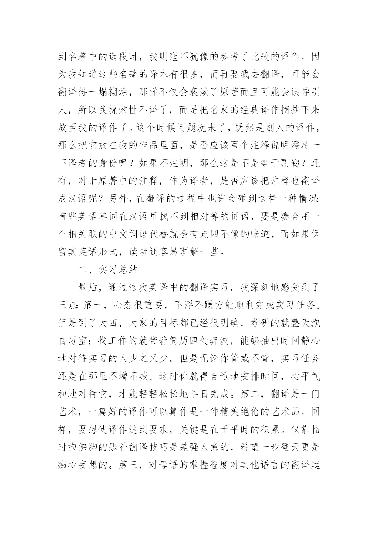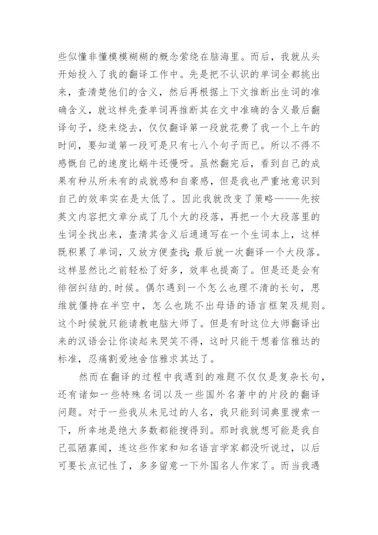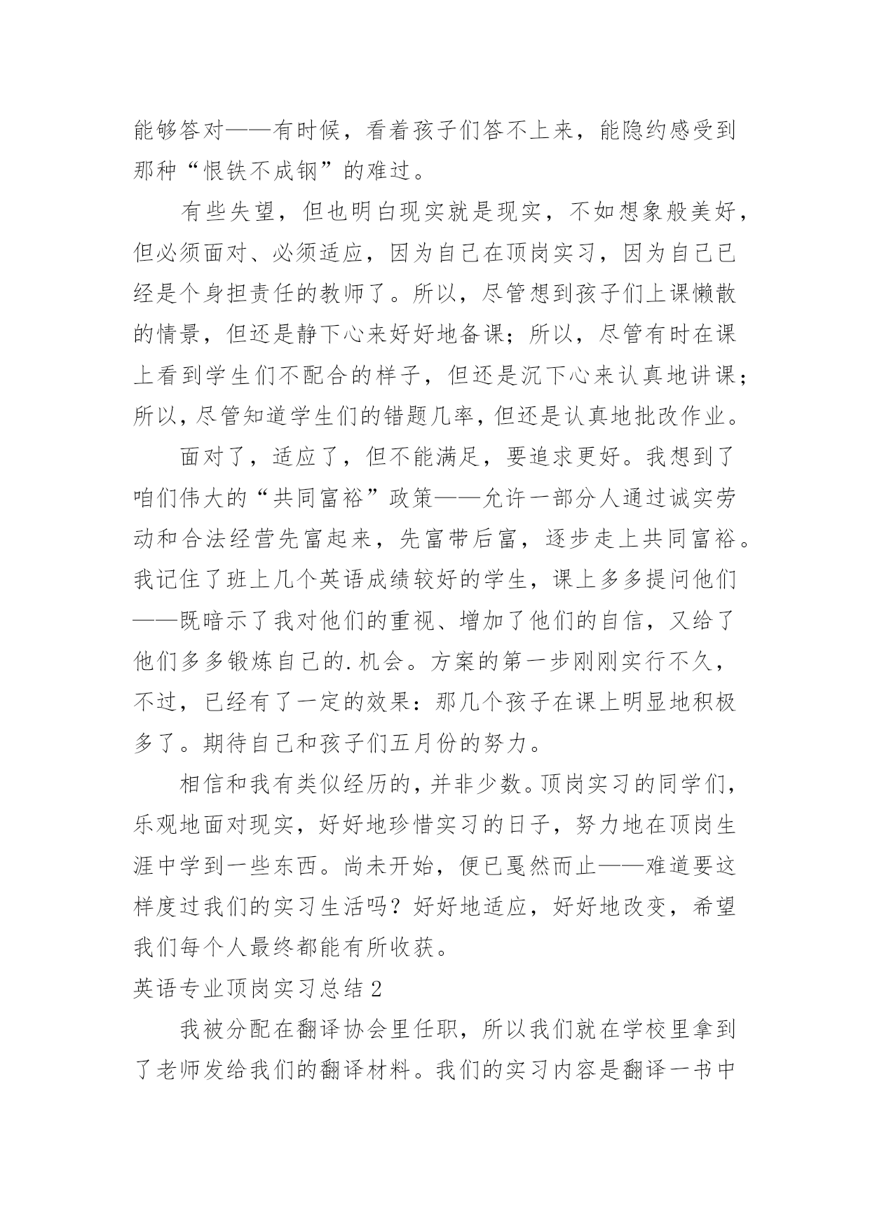 英语专业顶岗实习总结 英语专业顶岗实习总结5篇总结就是把一个时间段取得的成绩、存在的问题及得到的经验和教训进行一次全面系统的总结的书面材料,它能够使头脑更加清醒,目标更加明确,我想我们需要写一份总结了吧。那么总结应该包括什么内容呢?下面是小编整理的英语专业顶岗实习总结,希望能够帮助到大家。英语专业顶岗实习总结1想象中的日子,并不容易实现。当老师是自己一直以来的理想。小时候想当老师,是因为觉得老师很神气;长大了仍然想当老师,是因为很喜欢孩子们。终于盼来了顶岗实习,但一切并不那么顺利。来到实验学校后,因为小学部急缺教师,我们就暂时被安置在小学。直到3月底,我才开始接触初中英语。愚人节那天,我给初中的孩子们上了第一节英语课,开始了我期盼已久的初中英语教学生涯。顶岗实习前,曾经满怀着马上就可以当老师的兴奋,想象着自己当老师的情景,一幕幕师生互动、其乐融融的景象就浮现在眼前——虚幻但又真实。但是,当了几天初中教师后,我有些消极——学生们的英语底子太差了!英语试卷120分,8班的孩子们最高分86;课上提问,只有七八个人能够答对——有时候,看着孩子们答不上来,能隐约感受到那种“恨铁不成钢”的难过。有些失望,但也明白现实就是现实,不如想象般美好,但必须面对、必须适应,因为自己在顶岗实习,因为自己已经是个身担责任的教师了。所以,尽管想到孩子们上课懒散的情景,但还是静下心来好好地备课;所以,尽管有时在课上看到学生们不配合的样子,但还是沉下心来认真地讲课;所以,尽管知道学生们的错题几率,但还是认真地批改作业。面对了,适应了,但不能满足,要追求更好。我想到了咱们伟大的“共同富裕”政策——允许一部分人通过诚实劳动和合法经营先富起来,先富带后富,逐步走上共同富裕。我记住了班上几个英语成绩较好的学生,课上多多提问他们——既暗示了我对他们的重视、增加了他们的自信,又给了他们多多锻炼自己的.机会。方案的第一步刚刚实行不久,不过,已经有了一定的效果:那几个孩子在课上明显地积极多了。期待自己和孩子们五月份的努力。相信和我有类似经历的,并非少数。顶岗实习的同学们,乐观地面对现实,好好地珍惜实习的日子,努力地在顶岗生涯中学到一些东西。尚未开始,便已戛然而止——难道要这样度过我们的实习生活吗?好好地适应,好好地改变,希望我们每个人最终都能有所收获。英语专业顶岗实习总结2我被分配在翻译协会里任职,所以我们就在学校里拿到了老师发给我们的翻译材料。我们的实习内容是翻译一书中的几个章节,而我的任务是翻译此书的第一章的第一篇文章,大约xx字左右的文字。一、实习内容记得那天去领取翻译任务时,指导老师拿出一本厚厚的书对我们说翻译材料就是这本书中的几个章节,每个人要翻译大概十五页。我当时心想这么厚重又是纯英文的原著要是让我们翻译起来肯定很费力。其他几个同学也表现出几分忧虑的形色。老师自然是看出了我们的焦虑,语重心长地对我们说道这本关于文化概念的原著翻译起来是有点费劲,其中不乏晦涩难懂的单词、长句甚至段落。但是大家要记住首先要摆正好心态,不能因为一件事很难就不去做或者马马虎虎地了事,要做就要努力做到,翻译也是一样。其次,这本书的每个章节前会有一篇关于那章的中文概述,可以供大家大概地了解一下要翻译的作品的基本内容。然后的话,就是针对翻译过程中可能遇到的困难大家该如何处理的问题。这个解决方法有很多种,但是老师建议大家可以把自己要翻译的部分拿出来和其他人一起探讨,交流,通过这种讨论的方式,我相信大家从中会学到很多东西。另外,遇上不懂的也可以到老师这里来,老师几乎每天都在办公室里,随时欢迎大家的到来。”老师的这段话可以说给我们每个人都打上了一针镇定剂埃回到寝室后,我迫不及待地浏览了一下我的翻译材料,看到密密麻麻的英文单词,还是有种望而生畏的感觉。在接下来的时间里,我首先是把要翻译的十五页从头到尾一共看了三遍,这才勉强了解了英文原著的大概内容,但总有些似懂非懂模模糊糊的概念萦绕在脑海里。而后,我就从头开始投入了我的翻译工作中。先是把不认识的单词全都挑出来,查清楚他们的含义,然后再根据上下文推断出生词的准确含义,就这样先查单词再推断其在文中准确的含义最后翻译句子,绕来绕去,仅仅翻译第一段就花费了我一个上午的时间,要知道第一段可是只有七八个句子而已。所以不得不感慨自己的速度比蜗牛还慢呀。虽然翻完后,看到自己的成果有种从所未有的成就感和自豪感,但是我也严重地意识到自己的效率实在是太低了。因此我就改变了策略——-先按英文内容把文章分成了几个大的段落,再把一个大段落里的生词全找出来,查清其含义后通通写在一个生词本上,这样既积累了单词,又放方便查找;最后就一次翻译一个大段落。这样显然比之前轻松了好多,效率也提高了。但是还是会有徘徊纠结的.时候。偶尔遇到一个怎么也理不清的长句,思维就僵持在半空中,怎么也跳不出