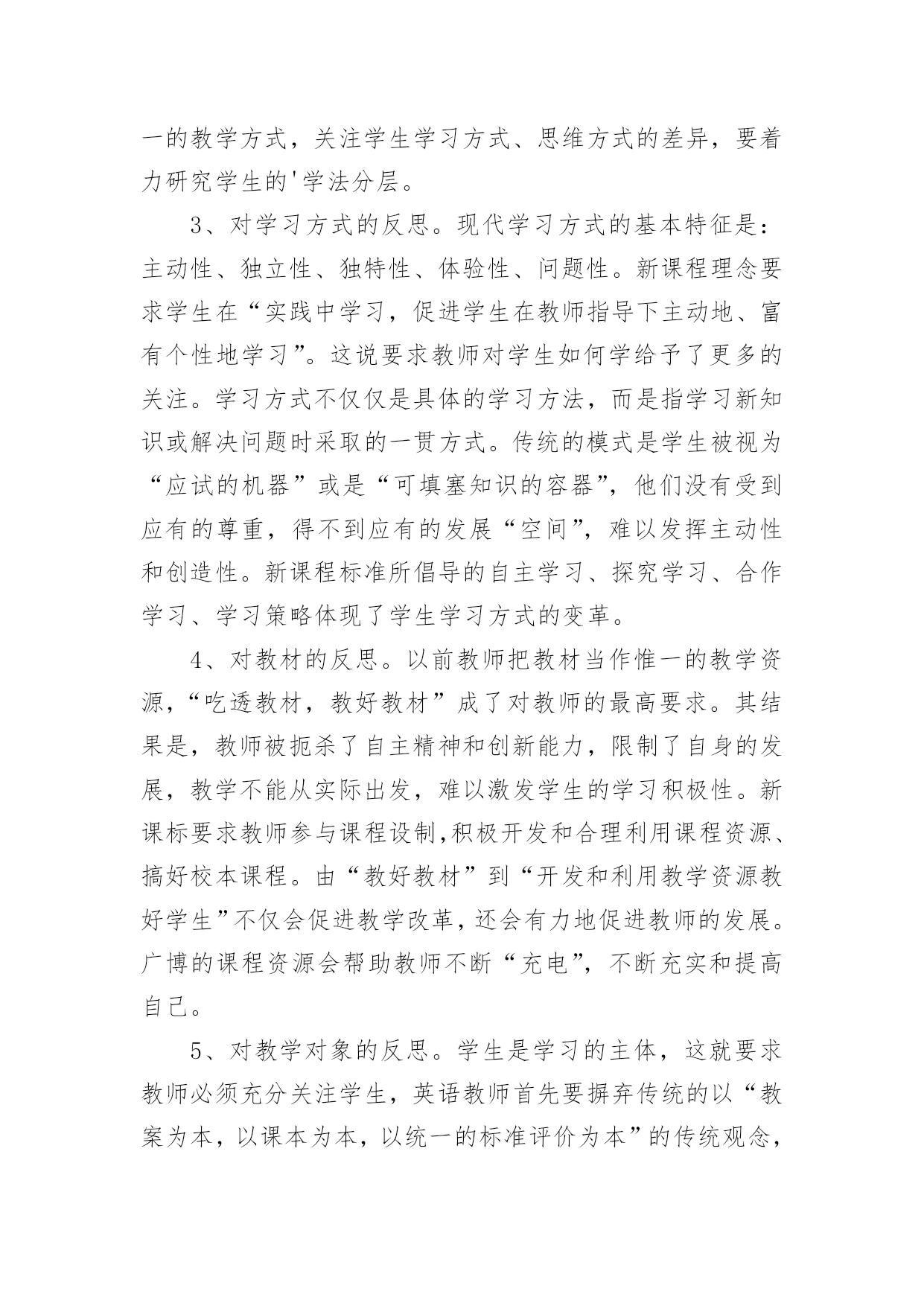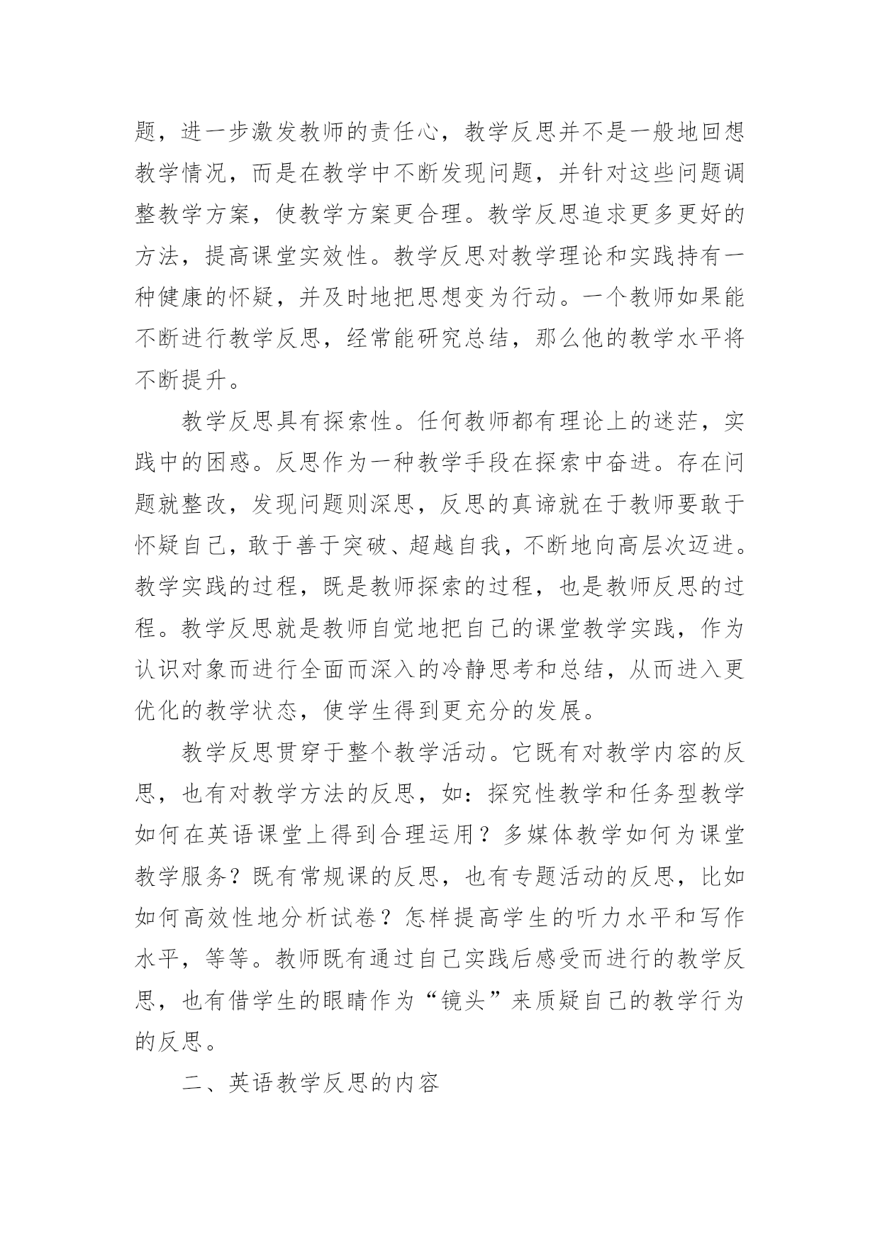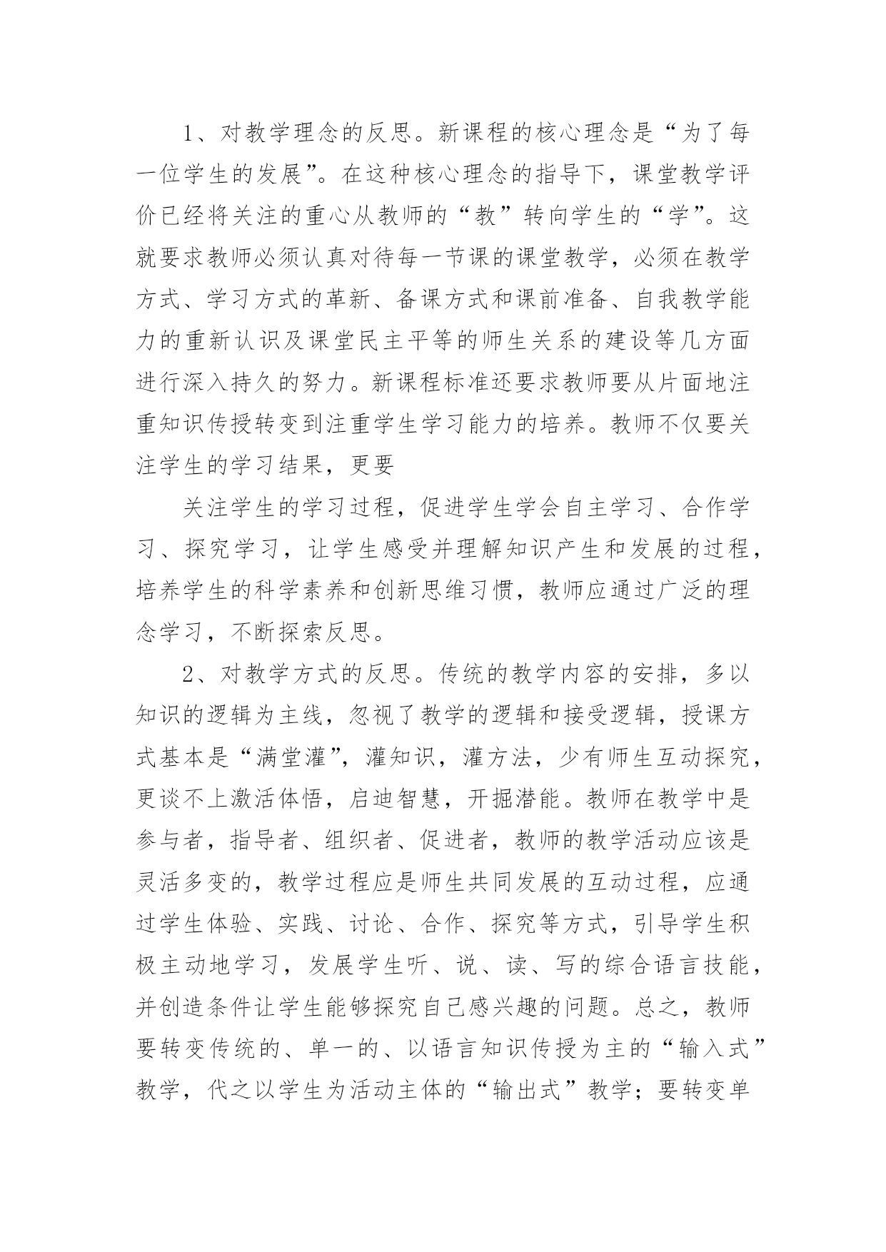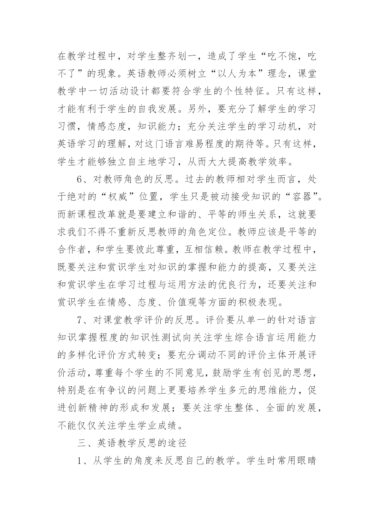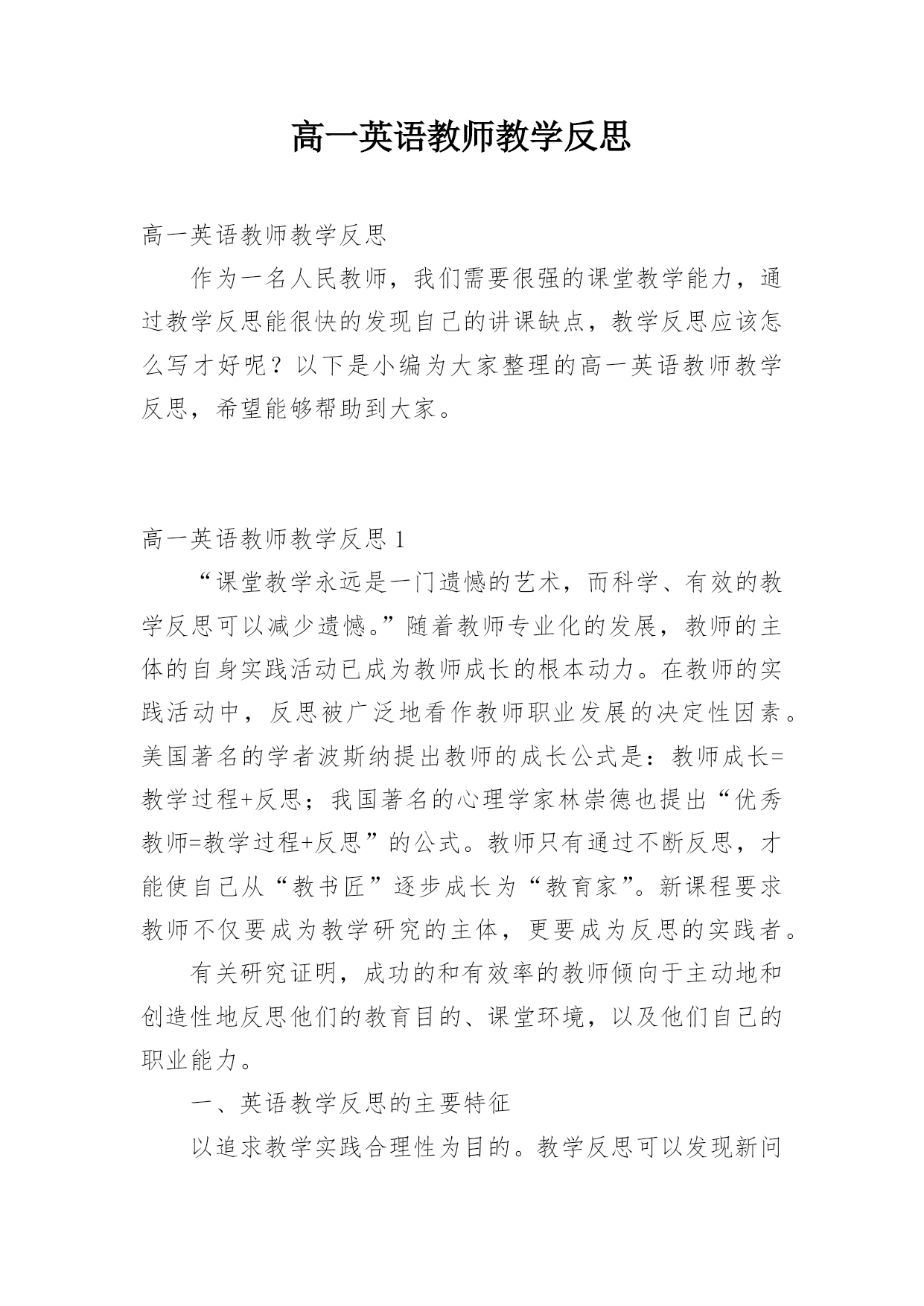 高一英语教师教学反思 高一英语教师教学反思作为一名人民教师,我们需要很强的课堂教学能力,通过教学反思能很快的发现自己的讲课缺点,教学反思应该怎么写才好呢?以下是小编为大家整理的高一英语教师教学反思,希望能够帮助到大家。高一英语教师教学反思1“课堂教学永远是一门遗憾的艺术,而科学、有效的教学反思可以减少遗憾。”随着教师专业化的发展,教师的主体的自身实践活动已成为教师成长的根本动力。在教师的实践活动中,反思被广泛地看作教师职业发展的决定性因素。美国著名的学者波斯纳提出教师的成长公式是:教师成长=教学过程+反思;我国著名的心理学家林崇德也提出“优秀教师=教学过程+反思”的公式。教师只有通过不断反思,才能使自己从“教书匠”逐步成长为“教育家”。新课程要求教师不仅要成为教学研究的主体,更要成为反思的实践者。有关研究证明,成功的和有效率的教师倾向于主动地和创造性地反思他们的教育目的、课堂环境,以及他们自己的职业能力。一、英语教学反思的主要特征以追求教学实践合理性为目的。教学反思可以发现新问题,进一步激发教师的责任心,教学反思并不是一般地回想教学情况,而是在教学中不断发现问题,并针对这些问题调整教学方案,使教学方案更合理。教学反思追求更多更好的方法,提高课堂实效性。教学反思对教学理论和实践持有一种健康的怀疑,并及时地把思想变为行动。一个教师如果能不断进行教学反思,经常能研究总结,那么他的教学水平将不断提升。教学反思具有探索性。任何教师都有理论上的迷茫,实践中的困惑。反思作为一种教学手段在探索中奋进。存在问题就整改,发现问题则深思,反思的真谛就在于教师要敢于怀疑自己,敢于善于突破、超越自我,不断地向高层次迈进。教学实践的过程,既是教师探索的过程,也是教师反思的过程。教学反思就是教师自觉地把自己的课堂教学实践,作为认识对象而进行全面而深入的冷静思考和总结,从而进入更优化的教学状态,使学生得到更充分的发展。教学反思贯穿于整个教学活动。它既有对教学内容的反思,也有对教学方法的反思,如:探究性教学和任务型教学如何在英语课堂上得到合理运用?多媒体教学如何为课堂教学服务?既有常规课的反思,也有专题活动的反思,比如如何高效性地分析试卷?怎样提高学生的听力水平和写作水平,等等。教师既有通过自己实践后感受而进行的教学反思,也有借学生的眼睛作为“镜头”来质疑自己的教学行为的反思。二、英语教学反思的内容1、对教学理念的反思。新课程的核心理念是“为了每一位学生的发展”。在这种核心理念的指导下,课堂教学评价已经将关注的重心从教师的“教”转向学生的“学”。这就要求教师必须认真对待每一节课的课堂教学,必须在教学方式、学习方式的革新、备课方式和课前准备、自我教学能力的重新认识及课堂民主平等的师生关系的建设等几方面进行深入持久的努力。新课程标准还要求教师要从片面地注重知识传授转变到注重学生学习能力的培养。教师不仅要关注学生的学习结果,更要关注学生的学习过程,促进学生学会自主学习、合作学习、探究学习,让学生感受并理解知识产生和发展的过程,培养学生的科学素养和创新思维习惯,教师应通过广泛的理念学习,不断探索反思。2、对教学方式的反思。传统的教学内容的安排,多以知识的逻辑为主线,忽视了教学的逻辑和接受逻辑,授课方式基本是“满堂灌”,灌知识,灌方法,少有师生互动探究,更谈不上激活体悟,启迪智慧,开掘潜能。教师在教学中是参与者,指导者、组织者、促进者,教师的教学活动应该是灵活多变的,教学过程应是师生共同发展的互动过程,应通过学生体验、实践、讨论、合作、探究等方式,引导学生积极主动地学习,发展学生听、说、读、写的综合语言技能,并创造条件让学生能够探究自己感兴趣的问题。总之,教师要转变传统的、单一的、以语言知识传授为主的“输入式”教学,代之以学生为活动主体的“输出式”教学;要转变单一的教学方式,关注学生学习方式、思维方式的差异,要着力研究学生的'学法分层。3、对学习方式的反思。现代学习方式的基本特征是:主动性、独立性、独特性、体验性、问题性。新课程理念要求学生在“实践中学习,促进学生在教师指导下主动地、富有个性地学习”。这说要求教师对学生如何学给予了更多的关注。学习方式不仅仅是具体的学习方法,而是指学习新知识或解决问题时采取的一贯方式。传统的模式是学生被视为“应试的机器”或是“可填塞知识的容器”,他们没有受到应有的尊重,得不到应有的发展“空间”,难以发挥主动性和创造性。新课程标准所倡导的自主学习、探究学习、合作学习、学习策略体现了学生学习方式的变革。4、对教材的反思。以前教师把教材当作惟一的教学资源,“吃透教材,教好教材”成了对教师的最高要求。其结果是,教师被扼杀了自主精神和创新能力,限制了自身的发展,教学不能从实际出发,难以激发学生的学习积极性。新课标要求教师参与课程设制,积极开发和合