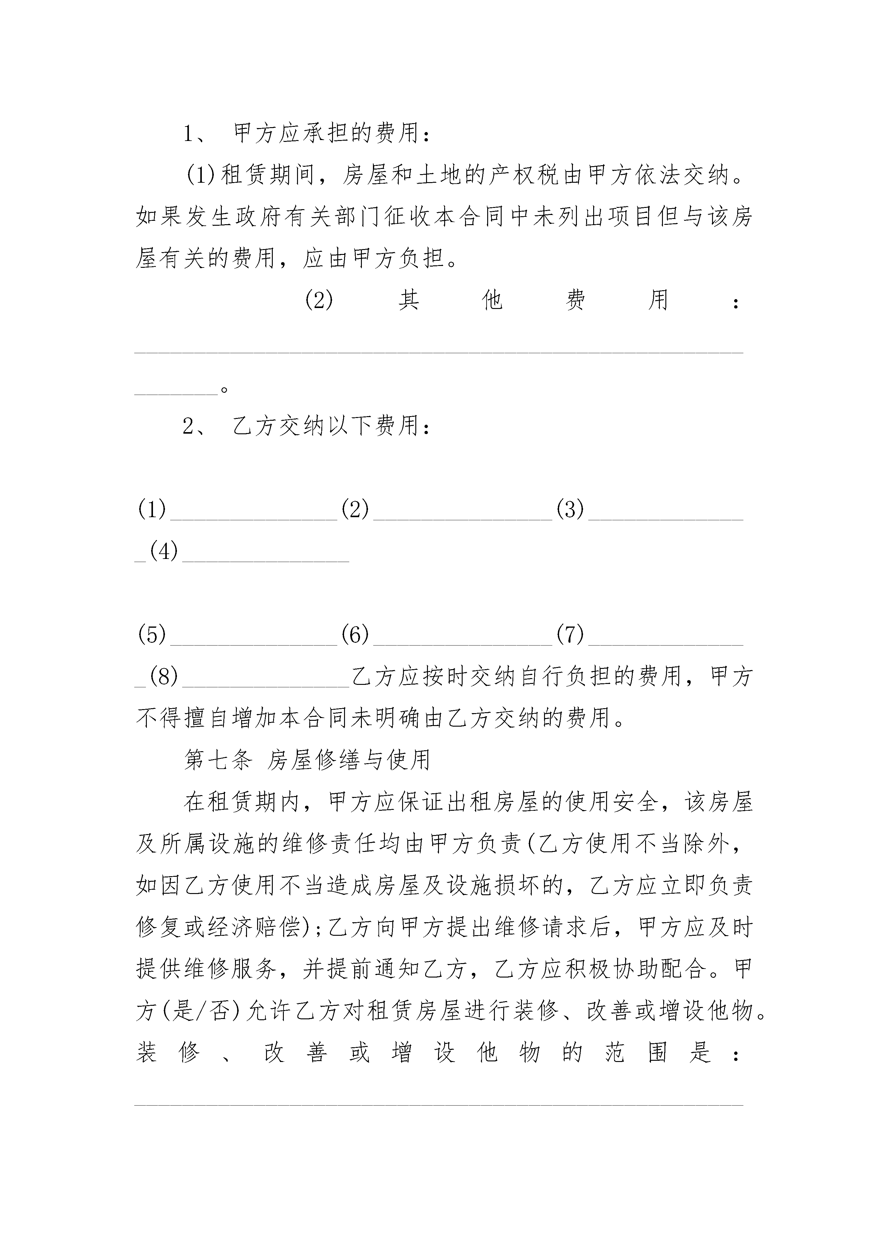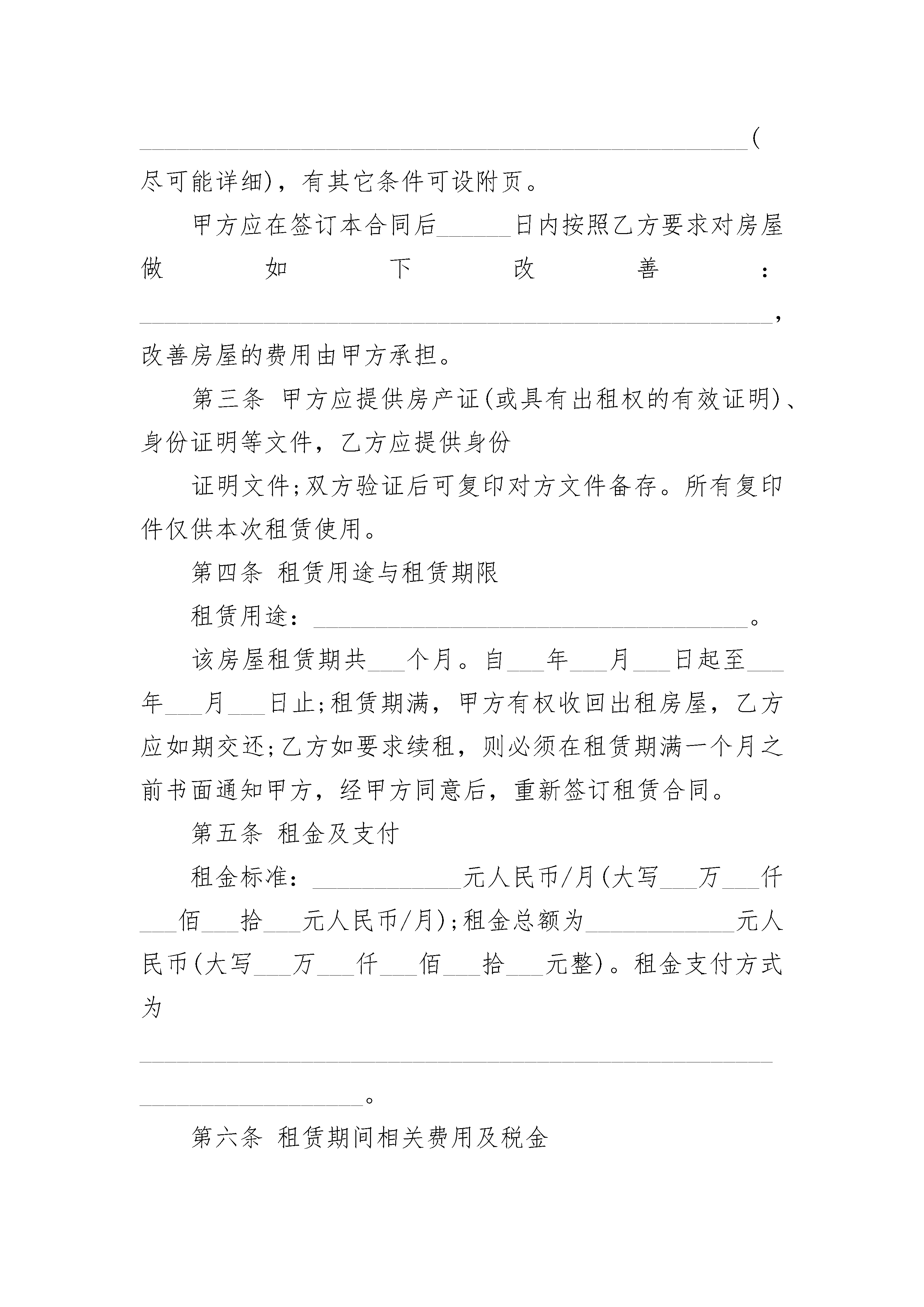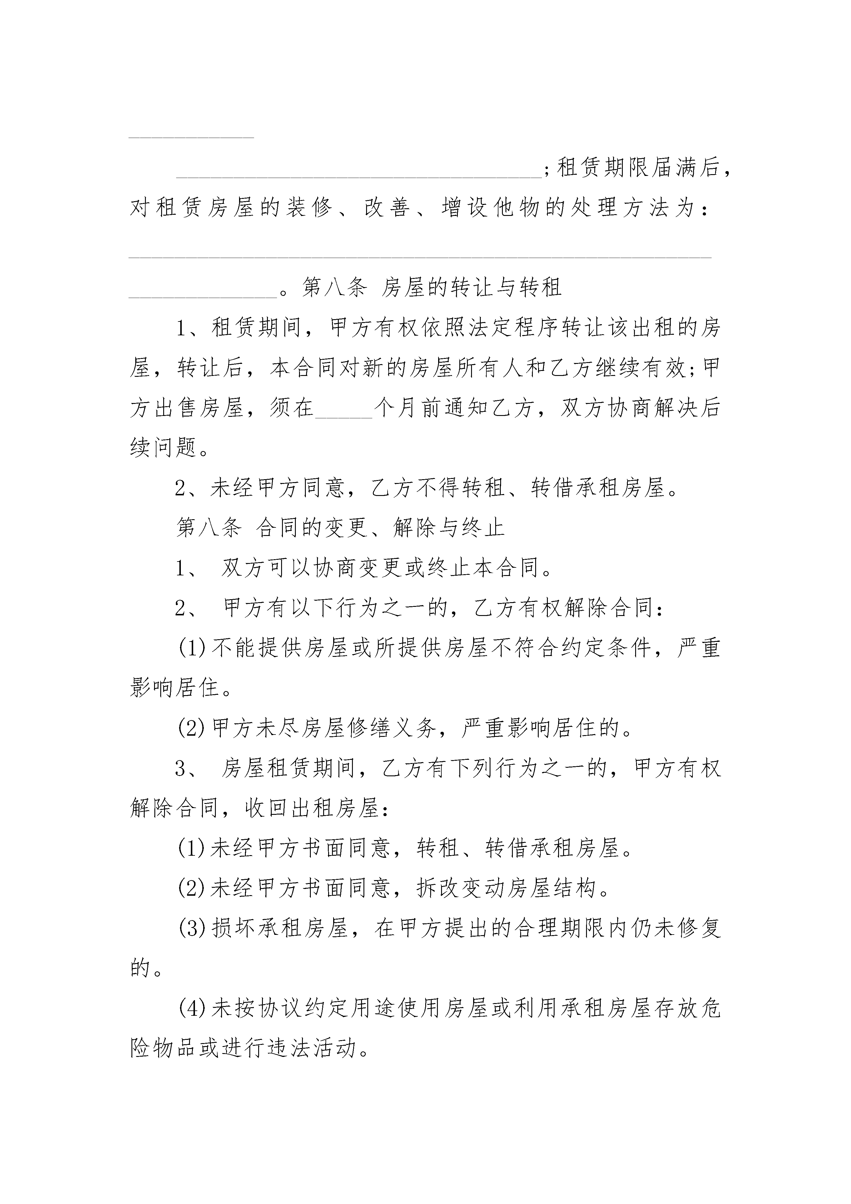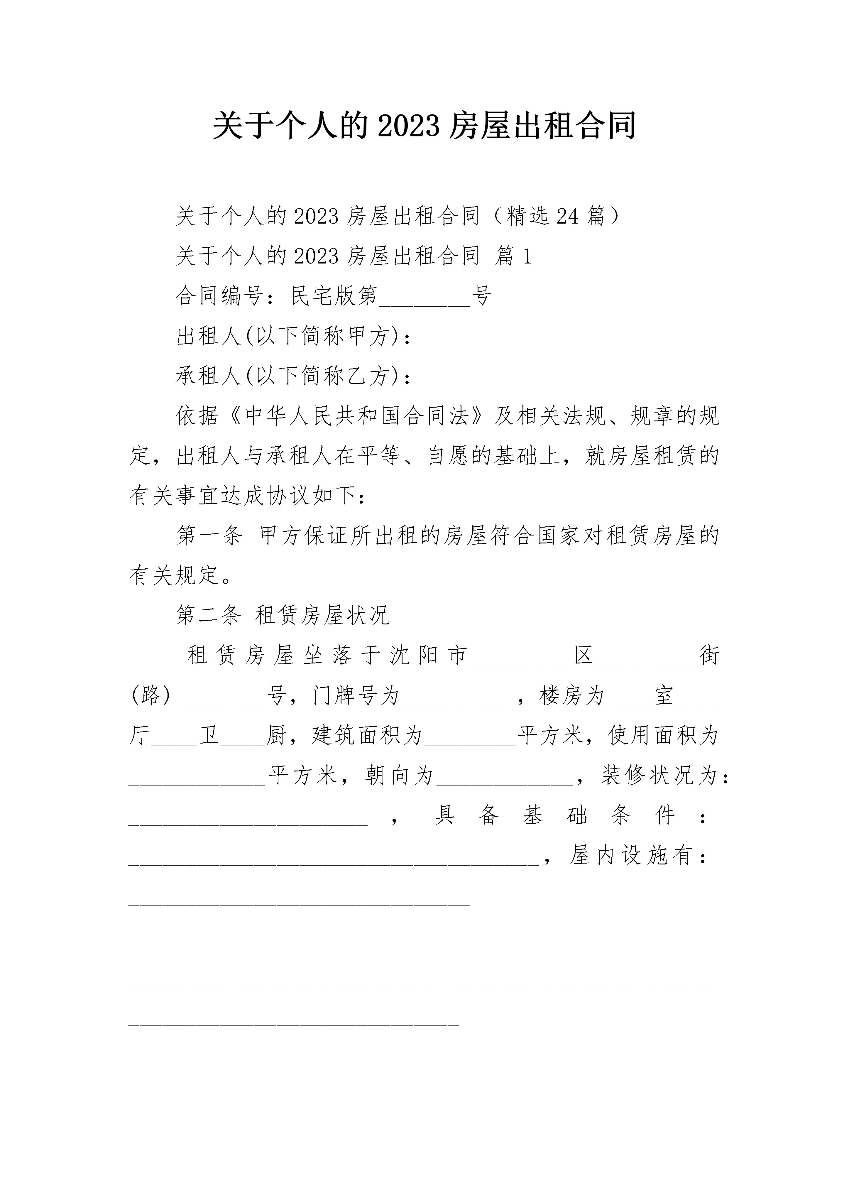 关于个人的2023房屋出租合同关于个人的2023房屋出租合同(精选24篇)关于个人的2023房屋出租合同篇1合同编号:民宅版第________号出租人(以下简称甲方):承租人(以下简称乙方):依据《中华人民共和国合同法》及相关法规、规章的规定,出租人与承租人在平等、自愿的基础上,就房屋租赁的有关事宜达成协议如下:第一条甲方保证所出租的房屋符合国家对租赁房屋的有关规定。第二条租赁房屋状况租赁房屋坐落于沈阳市________区________街(路)________号,门牌号为__________,楼房为____室____厅____卫____厨,建筑面积为________平方米,使用面积为____________平方米,朝向为____________,装修状况为:_____________________,具备基础条件:____________________________________,屋内设施有:_______________________________________________________________________________________________________________________________________________________________(尽可能详细),有其它条件可设附页。甲方应在签订本合同后______日内按照乙方要求对房屋做如下改善:___________________________________________________,改善房屋的费用由甲方承担。第三条甲方应提供房产证(或具有出租权的有效证明)、身份证明等文件,乙方应提供身份证明文件;双方验证后可复印对方文件备存。所有复印件仅供本次租赁使用。第四条租赁用途与租赁期限租赁用途:___________________________________。该房屋租赁期共___个月。自___年___月___日起至___年___月___日止;租赁期满,甲方有权收回出租房屋,乙方应如期交还;乙方如要求续租,则必须在租赁期满一个月之前书面通知甲方,经甲方同意后,重新签订租赁合同。第五条租金及支付租金标准:____________元人民币/月(大写___万___仟___佰___拾___元人民币/月);租金总额为____________元人民币(大写___万___仟___佰___拾___元整)。租金支付方式为_____________________________________________________________________。第六条租赁期间相关费用及税金1、甲方应承担的费用:(1)租赁期间,房屋和土地的产权税由甲方依法交纳。如果发生政府有关部门征收本合同中未列出项目但与该房屋有关的费用,应由甲方负担。(2)其他费用:__________________________________________________________。2、乙方交纳以下费用:(1)______________(2)_______________(3)______________(4)______________(5)______________(6)_______________(7)______________(8)______________乙方应按时交纳自行负担的费用,甲方不得擅自增加本合同未明确由乙方交纳的费用。第七条房屋修缮与使用在租赁期内,甲方应保证出租房屋的使用安全,该房屋及所属设施的维修责任均由甲方负责(乙方使用不当除外,如因乙方使用不当造成房屋及设施损坏的,乙方应立即负责修复或经济赔偿);乙方向甲方提出维修请求后,甲方应及时提供维修服务,并提前通知乙方,乙方应积极协助配合。甲方(是/否)允许乙方对租赁房屋进行装修、改善或增设他物。装修、改善或增设他物的范围是:______________________________________________________________________________________________;租赁期限届满后,对租赁房屋的装修、改善、增设他物的处理方法为:________________________________________________________________。第八条房屋的转让与转租1、租赁期间,甲方有权依照法定程序转让该出租的房屋,转让后,本合同对新的房屋所有人和乙方继续有效;甲方出售房屋,须在_____个月前通知乙方,双方协商解决后续问题。2、未经甲方同意,乙方不得转租、转借承租房屋。第八条合同的变更、解除与终止1、双方可以协商变更或终止本合同。2、甲方有以下行为之一的,乙方有权解除合同:(1)不能提供房屋或