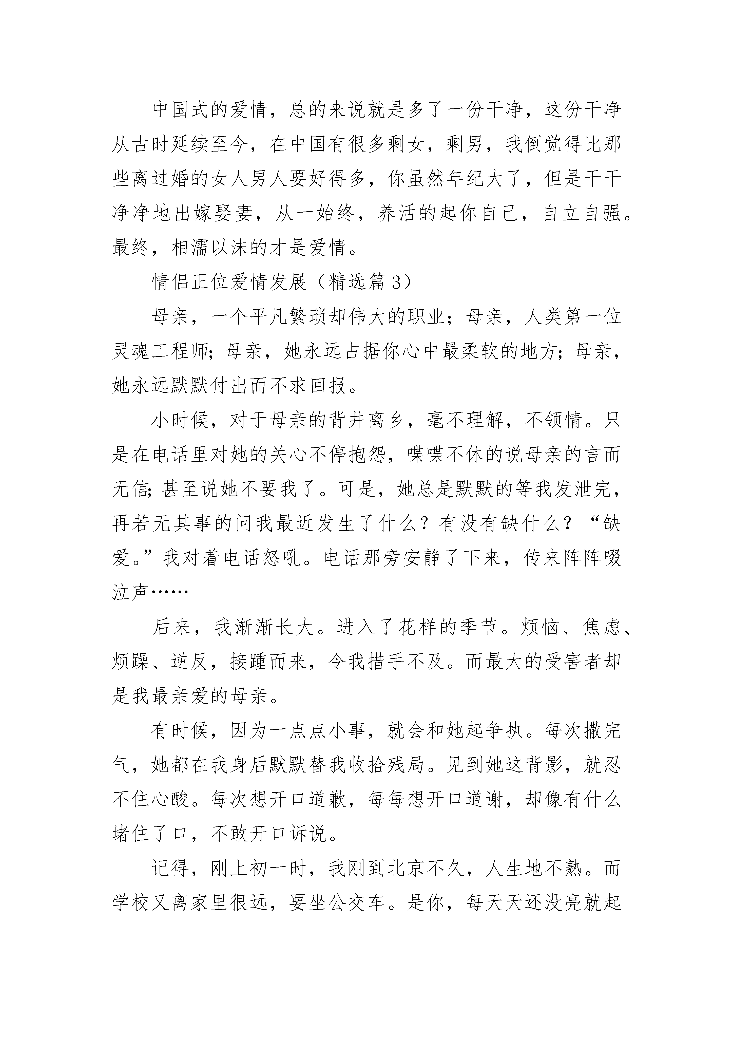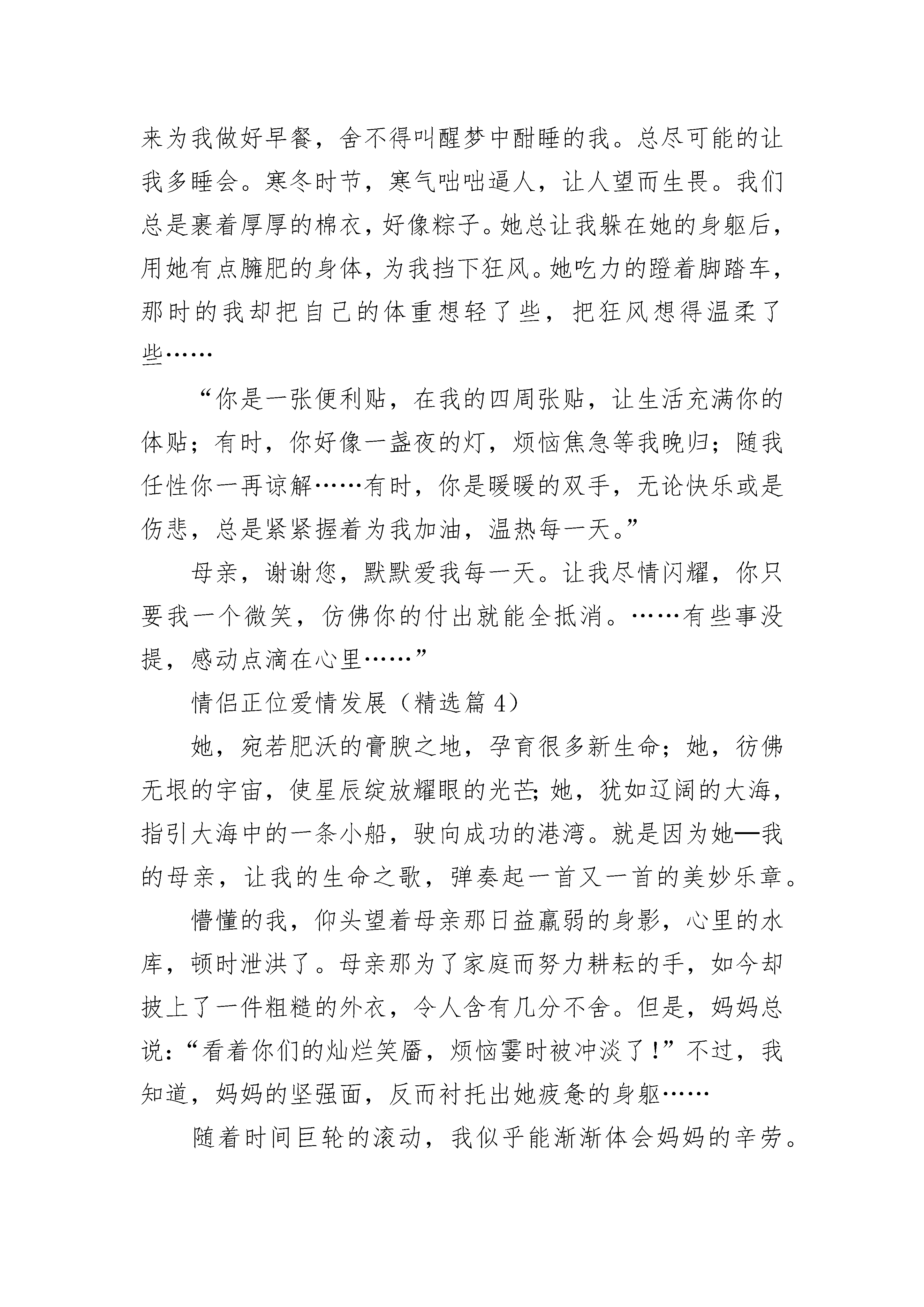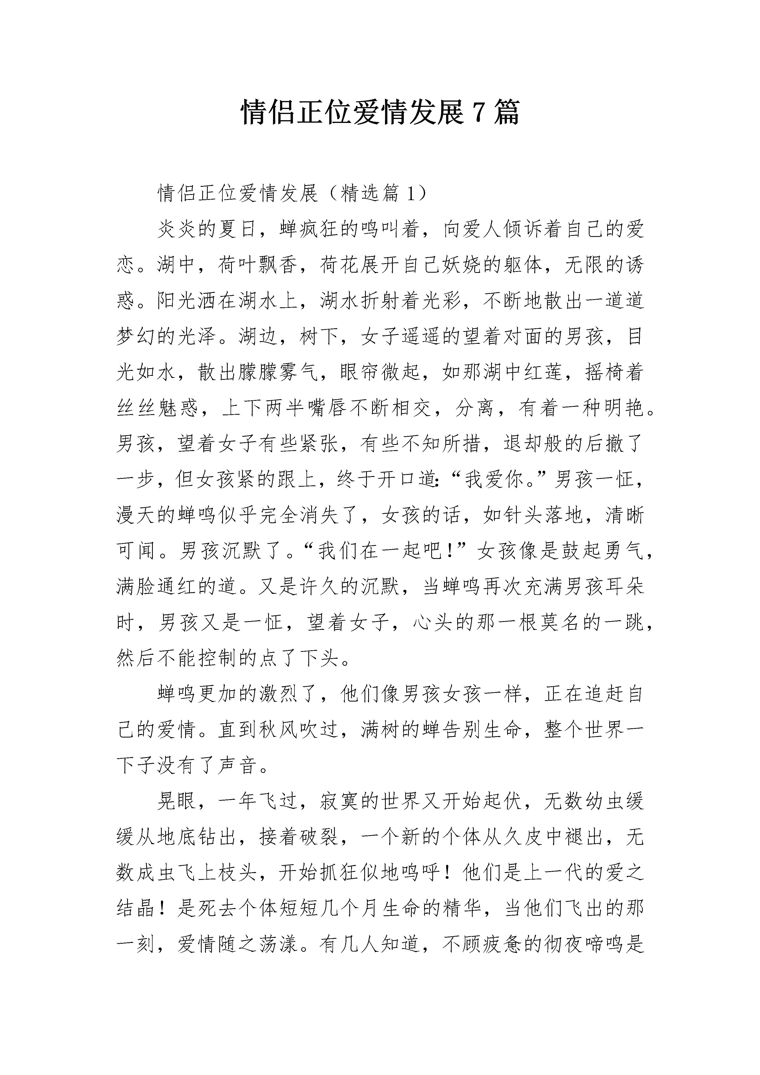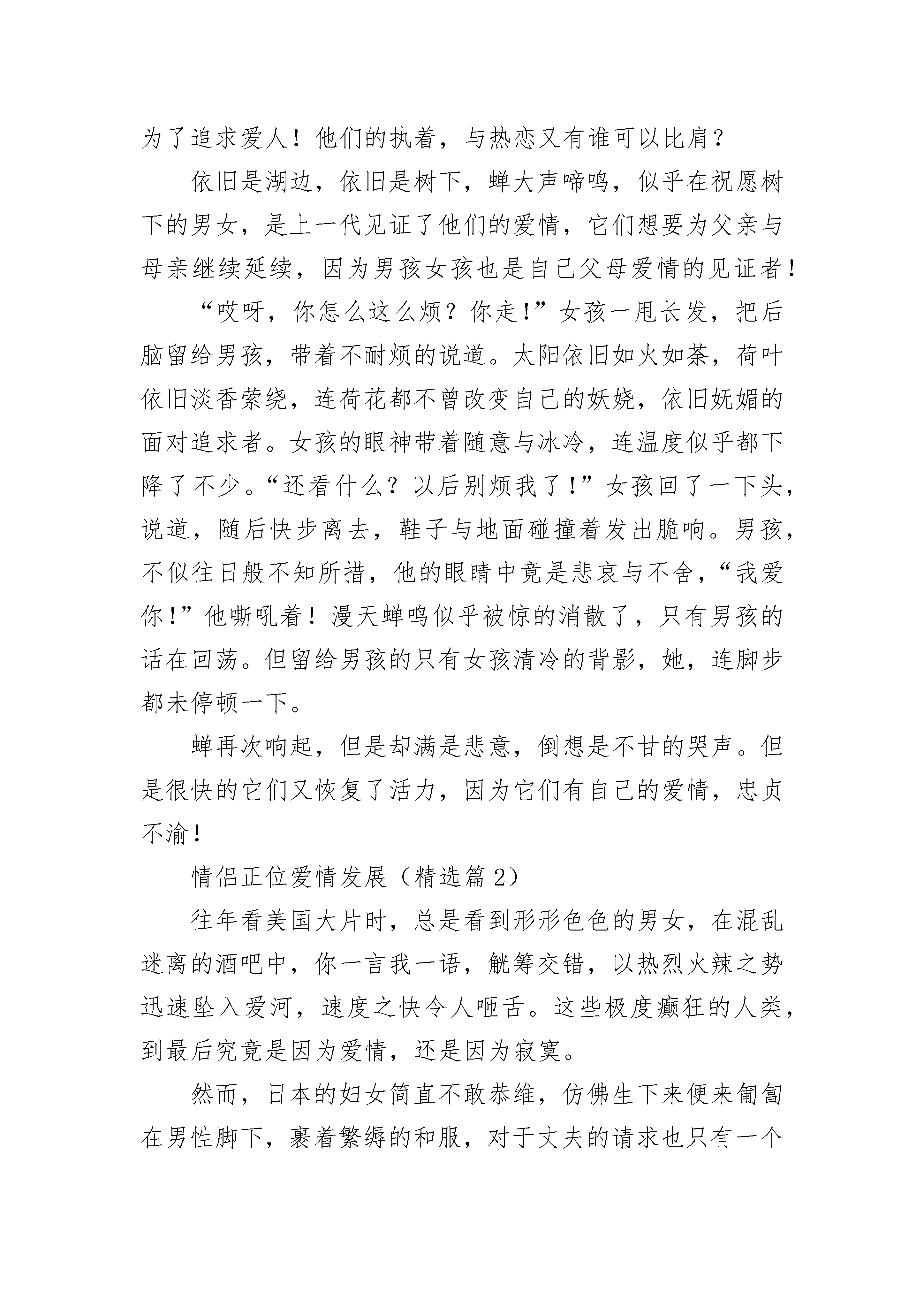 情侣正位爱情发展7篇情侣正位爱情发展(精选篇1)炎炎的夏日,蝉疯狂的鸣叫着,向爱人倾诉着自己的爱恋。湖中,荷叶飘香,荷花展开自己妖娆的躯体,无限的诱惑。阳光洒在湖水上,湖水折射着光彩,不断地散出一道道梦幻的光泽。湖边,树下,女子遥遥的望着对面的男孩,目光如水,散出朦朦雾气,眼帘微起,如那湖中红莲,摇椅着丝丝魅惑,上下两半嘴唇不断相交,分离,有着一种明艳。男孩,望着女子有些紧张,有些不知所措,退却般的后撤了一步,但女孩紧的跟上,终于开口道:“我爱你。”男孩一怔,漫天的蝉鸣似乎完全消失了,女孩的话,如针头落地,清晰可闻。男孩沉默了。“我们在一起吧!”女孩像是鼓起勇气,满脸通红的道。又是许久的沉默,当蝉鸣再次充满男孩耳朵时,男孩又是一怔,望着女子,心头的那一根莫名的一跳,然后不能控制的点了下头。蝉鸣更加的激烈了,他们像男孩女孩一样,正在追赶自己的爱情。直到秋风吹过,满树的蝉告别生命,整个世界一下子没有了声音。晃眼,一年飞过,寂寞的世界又开始起伏,无数幼虫缓缓从地底钻出,接着破裂,一个新的个体从久皮中褪出,无数成虫飞上枝头,开始抓狂似地鸣呼!他们是上一代的爱之结晶!是死去个体短短几个月生命的精华,当他们飞出的那一刻,爱情随之荡漾。有几人知道,不顾疲惫的彻夜啼鸣是为了追求爱人!他们的执着,与热恋又有谁可以比肩?依旧是湖边,依旧是树下,蝉大声啼鸣,似乎在祝愿树下的男女,是上一代见证了他们的爱情,它们想要为父亲与母亲继续延续,因为男孩女孩也是自己父母爱情的见证者!“哎呀,你怎么这么烦?你走!”女孩一甩长发,把后脑留给男孩,带着不耐烦的说道。太阳依旧如火如荼,荷叶依旧淡香萦绕,连荷花都不曾改变自己的妖娆,依旧妩媚的面对追求者。女孩的眼神带着随意与冰冷,连温度似乎都下降了不少。“还看什么?以后别烦我了!”女孩回了一下头,说道,随后快步离去,鞋子与地面碰撞着发出脆响。男孩,不似往日般不知所措,他的眼睛中竟是悲哀与不舍,“我爱你!”他嘶吼着!漫天蝉鸣似乎被惊的消散了,只有男孩的话在回荡。但留给男孩的只有女孩清冷的背影,她,连脚步都未停顿一下。蝉再次响起,但是却满是悲意,倒想是不甘的哭声。但是很快的它们又恢复了活力,因为它们有自己的爱情,忠贞不渝!情侣正位爱情发展(精选篇2)往年看美国大片时,总是看到形形色色的男女,在混乱迷离的酒吧中,你一言我一语,觥筹交错,以热烈火辣之势迅速坠入爱河,速度之快令人咂舌。这些极度癫狂的人类,到最后究竟是因为爱情,还是因为寂寞。然而,日本的妇女简直不敢恭维,仿佛生下来便来匍匐在男性脚下,裹着繁缛的和服,对于丈夫的请求也只有一个“是”字。这种堕落地一塌糊涂的女性制度,才造就了日本看似宁静荣光的景状。相比起日本的彻底偏向和美国的极度放浪,中国似乎掐了一个恰到好处的折中点。中国自古以来男尊女卑的思想虽还未完全脱离人们的思维,但是二十一世纪的女郎哪个又不是巾帼不让须眉呢,那些仍存在的游离封建,总会随着时间的流淌彻底消逝。而剩下的,便是鲜红色的共产党所宣扬的人人生而平等。就像我一直所赞同的诗经,许多人将它评为靡靡之音,可是关雎中,清波隐隐下也曾有一人为自己踌躇难安昼夜不寝,用那样鲜明的手法将它表现出来,对于一个封建王朝来说是一种莫大的勇气。古时候的男女总是遵从父母之命媒妁之言,大多是抵不过的,而剩下的也就是青梅竹马两小无猜了。深刻历史斑驳的古桥,射入泸州的月光,悠悠撒入夜幕的万家灯火,情人幽会渔船,两相无言,赤脸相对,闻着河畔淡淡的青草味儿,荡漾的蜜味儿,思缕万千。然而,二十一世纪光荣降临,清新不见了,剩下的只有深入骨髓的粗犷。不过,这粗犷我是相当爱的,古时候的环境再优雅,感情再青涩,也不如有情人终成眷属来得实在。比如,同一时期诞生了许多网络用语上的女汉子,还管什么三七二十一,有情了就跟老娘回家,无情了就去天涯另找芳草。这种干脆是外国所不存在的,西方国家少了一份纯洁,而某些东方国家却多了一份胶着。中国式的爱情,总的来说就是多了一份干净,这份干净从古时延续至今,在中国有很多剩女,剩男,我倒觉得比那些离过婚的女人男人要好得多,你虽然年纪大了,但是干干净净地出嫁娶妻,从一始终,养活的起你自己,自立自强。最终,相濡以沫的才是爱情。情侣正位爱情发展(精选篇3)母亲,一个平凡繁琐却伟大的职业;母亲,人类第一位灵魂工程师;母亲,她永远占据你心中最柔软的地方;母亲,她永远默默付出而不求回报。小时候,对于母亲的背井离乡,毫不理解,不领情。只是在电话里对她的关心不停抱怨,喋喋不休的说母亲的言而无信;甚至说她不要我了。可是,她总是默默的等我发泄完,再若无其事的问我最近发生了什么?有没有缺什么?“缺爱。”我对着电话怒吼。电话那旁安静了下来,传来阵阵啜泣声……后来,我渐渐长大。进入了花样的季节。烦恼、焦虑、烦躁、逆反,接踵而来,令我措手不及。而最大的