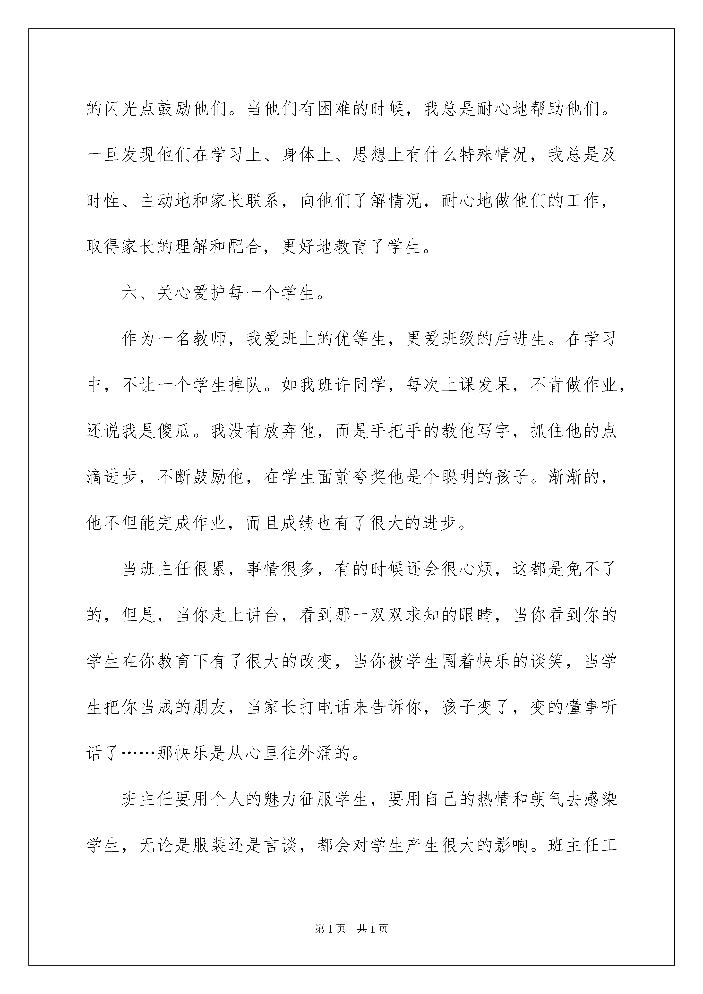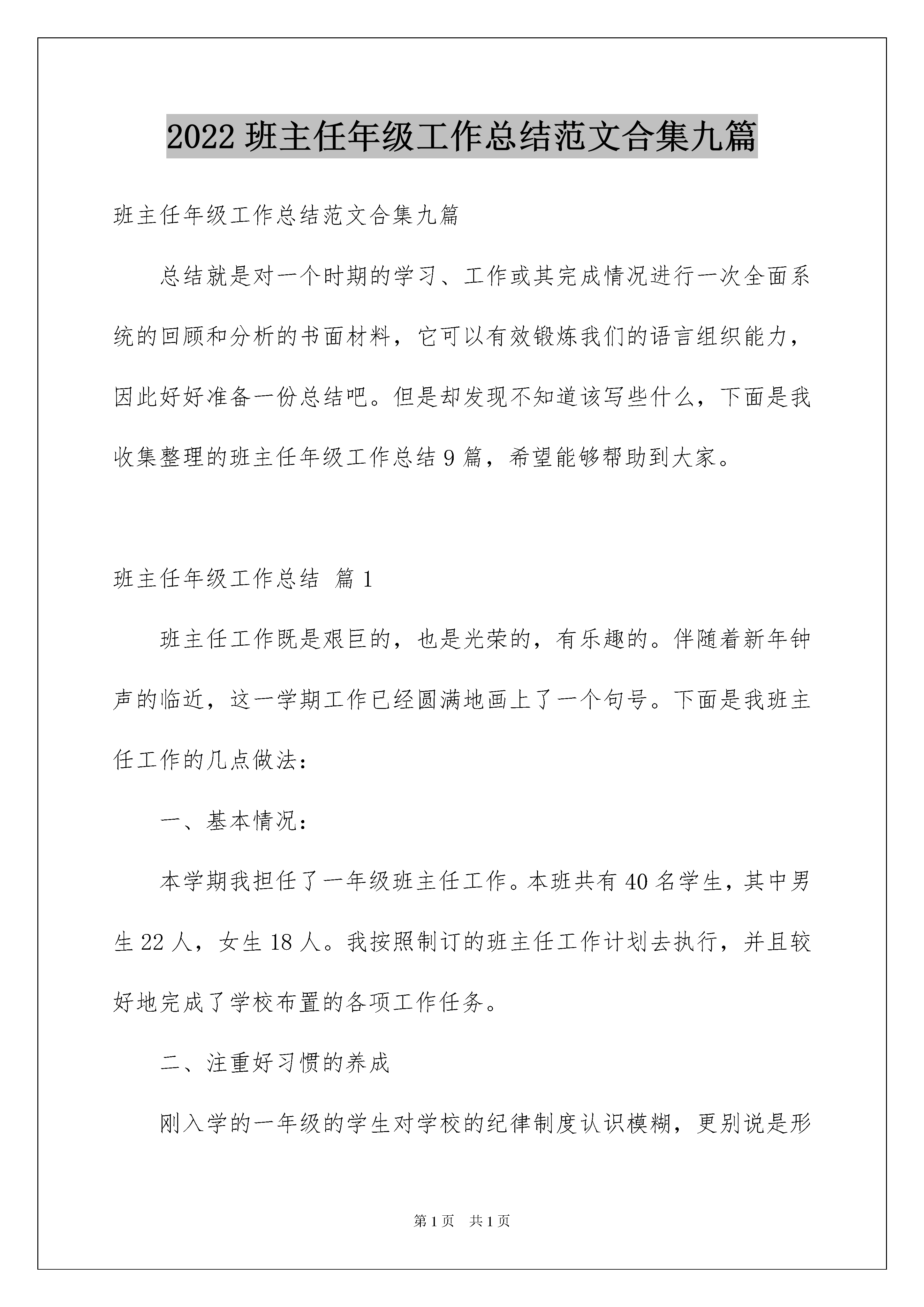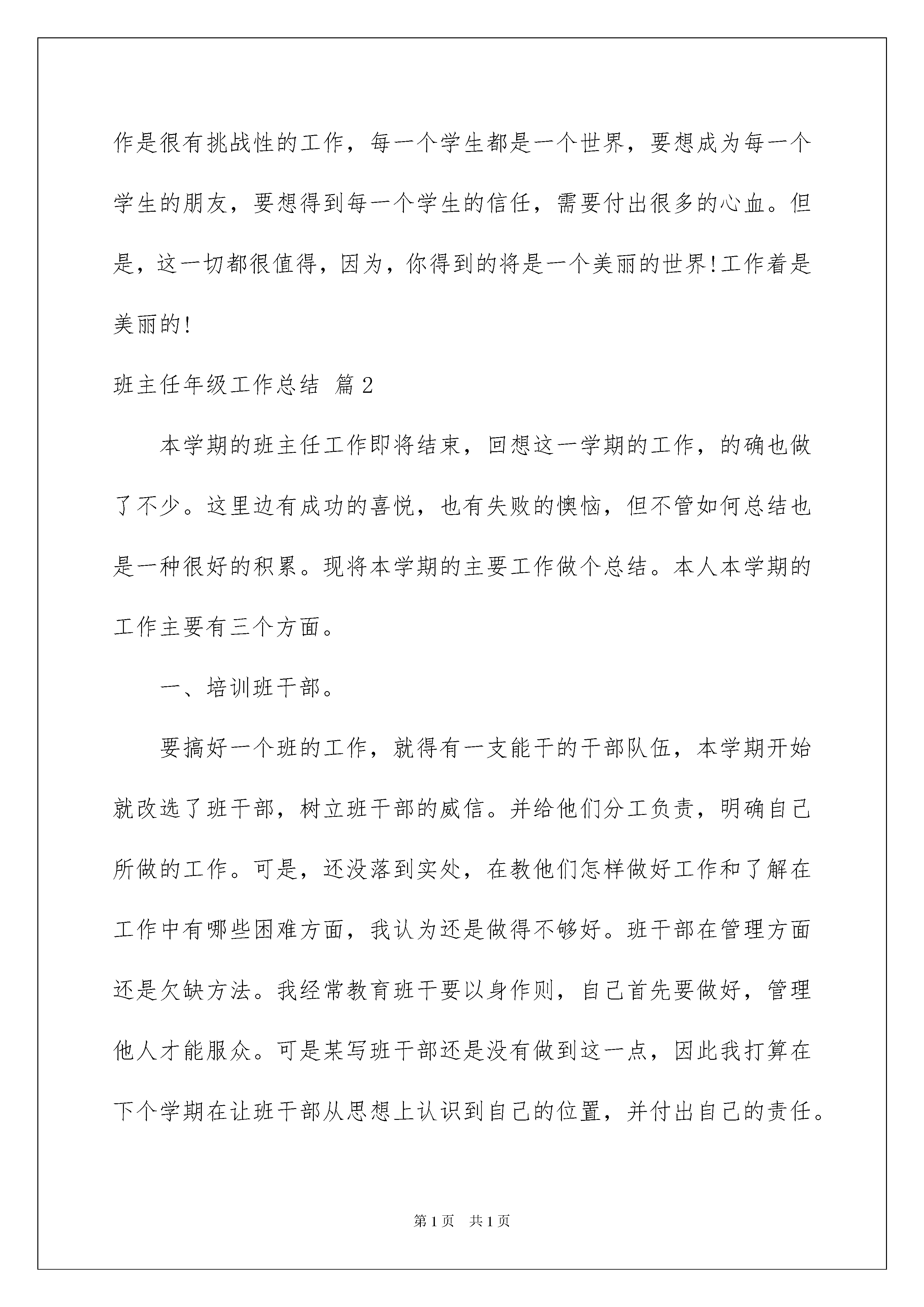 2022班主任年级工作总结范文合集九篇班主任年级工作总结范文合集九篇总结就是对一个时期的学习、工作或其完成情况进行一次全面系统的回顾和分析的书面材料,它可以有效锻炼我们的语言组织能力,因此好好准备一份总结吧。但是却发现不知道该写些什么,下面是我收集整理的班主任年级工作总结9篇,希望能够帮助到大家。班主任年级工作总结篇1班主任工作既是艰巨的,也是光荣的,有乐趣的。伴随着新年钟声的临近,这一学期工作已经圆满地画上了一个句号。下面是我班主任工作的几点做法:一、基本情况:本学期我担任了一年级班主任工作。本班共有40名学生,其中男生22人,女生18人。我按照制订的班主任工作计划去执行,并且较好地完成了学校布置的各项工作任务。二、注重好习惯的养成刚入学的一年级的学生对学校的纪律制度认识模糊,更别说是形成习惯了,比如说,上学迟到者多,不知做课前准备的多,上课铃响后依然在外晃荡的多,集会升旗组织纪律等等,一句话,问题多多。而且一年级的学生忘性大,叮嘱二次、三次,四次、五次,依然如故,这就要求一年级老师有不厌其烦的、足够的耐心,以致形成习惯为止。而好习惯的养成也正是我校本学期的教育主题之一,我就有更多的时间和机会把它从八个方面做细做实,即“我的按时上学好习惯、我的文明礼貌好习惯、我的认真学习好习惯、我的安全卫生好习惯、我的健康锻炼好习惯、我的热爱劳动好习惯、我的团结同学好习惯、我的不乱花钱好习惯”等。好的习惯,受益终生,所以对好习惯的培养格外重视,利用班队会集中学习,课前等适当的机会分散学习,遇到问题及时解决,不给他们形成麻痹的思想。我班同学在班干部和班主任的带领下,班级秩序良好,尤其在劳动、做好事等方面表现积极,集会、集队等能做到安静、整齐。三、注重班干部的培养班干部是班主任的左右手,对整个班级的精神面貌起着决定性的作用,因此应该正确选拔,精心培养。作为班级干部,应具有较强的号召力和自我管理的能力,树立了班干部在同学中的威信,时时指点他们的工作方法,对他们更要从纪律、学习,经典诵读等到各方面严格要求,真正起到表率作用。有了这支得力的干部队伍,班主任的工作简单而轻松。四、注重主题班会和队会的开展我班的班会和队会每次都是在有计划和充分准备的前提下进行的,以保证其实效性,一年级的学生表达能力不够强,所以我们选取的主题多是发生在学生身边的事,并且能结合当前时事。讨论时先让表达好些的同学发言,再带动其他同学,脚踏实际,循序渐进,一个学期下来,每个同学都有一定的进步和发展。本学期我们开展的班队会的主题有《小学生日常行为规范》、《小学生守则》、《小学生礼仪规范》、《文明礼貌》、《安全教育》等等。通过这些主题活动的开展,使他们在学习、纪律、文明礼貌、感恩、爱心等各方面得到锻炼,有助于学生的全面发展。五、加强与家长联系。平时,我能关心爱护班里的每一个学生。对一些表现不太好的同学,更是倾注了更多的爱和心血。我经常和留守学生谈心,抓住他们的闪光点鼓励他们。当他们有困难的时候,我总是耐心地帮助他们。一旦发现他们在学习上、身体上、思想上有什么特殊情况,我总是及时性、主动地和家长联系,向他们了解情况,耐心地做他们的工作,取得家长的理解和配合,更好地教育了学生。六、关心爱护每一个学生。作为一名教师,我爱班上的优等生,更爱班级的后进生。在学习中,不让一个学生掉队。如我班许同学,每次上课发呆,不肯做作业,还说我是傻瓜。我没有放弃他,而是手把手的教他写字,抓住他的点滴进步,不断鼓励他,在学生面前夸奖他是个聪明的孩子。渐渐的,他不但能完成作业,而且成绩也有了很大的进步。当班主任很累,事情很多,有的时候还会很心烦,这都是免不了的,但是,当你走上讲台,看到那一双双求知的眼睛,当你看到你的学生在你教育下有了很大的改变,当你被学生围着快乐的谈笑,当学生把你当成的朋友,当家长打电话来告诉你,孩子变了,变的懂事听话了……那快乐是从心里往外涌的。班主任要用个人的魅力征服学生,要用自己的热情和朝气去感染学生,无论是服装还是言谈,都会对学生产生很大的影响。班主任工作是很有挑战性的工作,每一个学生都是一个世界,要想成为每一个学生的朋友,要想得到每一个学生的信任,需要付出很多的心血。但是,这一切都很值得,因为,你得到的将是一个美丽的世界!工作着是美丽的!班主任年级工作总结篇2本学期的班主任工作即将结束,回想这一学期的工作,的确也做了不少。这里边有成功的喜悦,也有失败的懊恼,但不管如何总结也是一种很好的积累。现将本学期的主要工作做个总结。本人本学期的工作主要有三个方面。一、培训班干部。要搞好一个班的工作,就得有一支能干的干部队伍,本学期开始就改选了