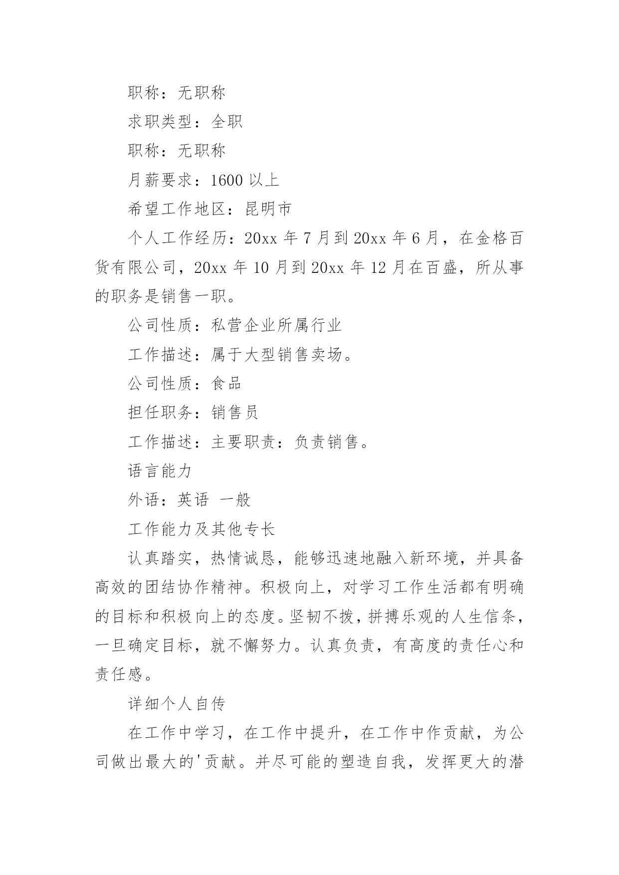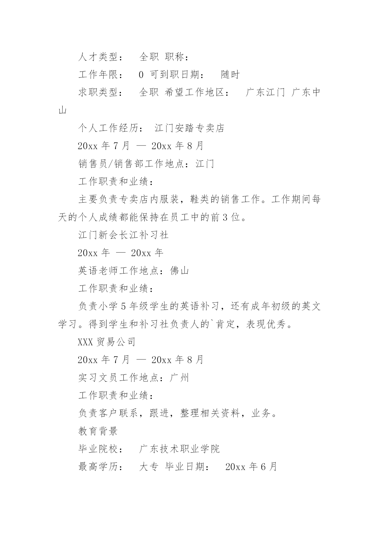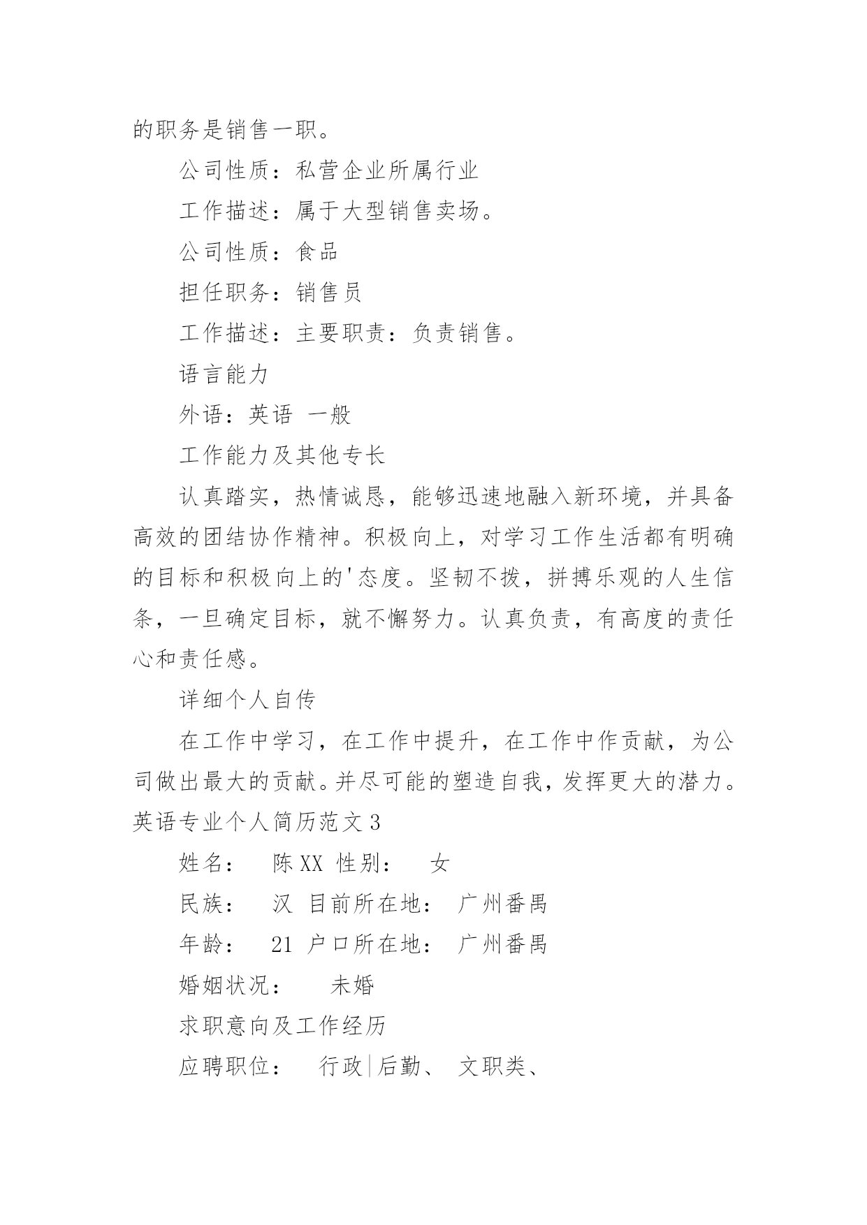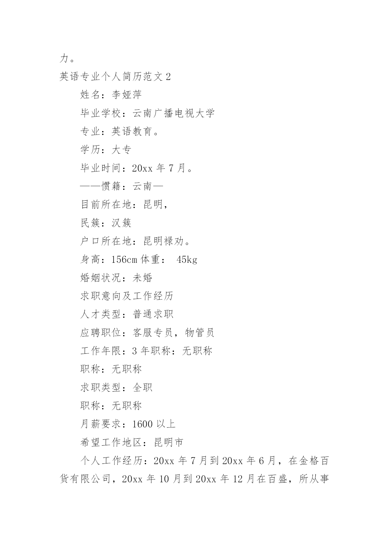 英语专业个人简历 英语专业个人简历范文时间过得太快,让人猝不及防,我们又将面临求职找工作的挑战,这时候需要开始写简历了哦。但是怎么写才更能吸引眼球呢?以下是小编整理的英语专业个人简历范文,欢迎大家分享。英语专业个人简历范文1姓名:李娅萍毕业学校:云南广播电视大学专业:英语教育。学历:大专毕业时间:20xx年7月。——惯籍:云南—目前所在地:昆明,民簇:汉簇户口所在地:昆明禄劝。身高:156cm体重:45kg婚姻状况:未婚求职意向及工作经历人才类型:普通求职应聘职位:客服专员,物管员工作年限:3年职称:无职称职称:无职称求职类型:全职职称:无职称月薪要求:1600以上希望工作地区:昆明市个人工作经历:20xx年7月到20xx年6月,在金格百货有限公司,20xx年10月到20xx年12月在百盛,所从事的职务是销售一职。公司性质:私营企业所属行业工作描述:属于大型销售卖场。公司性质:食品担任职务:销售员工作描述:主要职责:负责销售。语言能力外语:英语一般工作能力及其他专长认真踏实,热情诚恳,能够迅速地融入新环境,并具备高效的团结协作精神。积极向上,对学习工作生活都有明确的目标和积极向上的态度。坚韧不拨,拼搏乐观的人生信条,一旦确定目标,就不懈努力。认真负责,有高度的责任心和责任感。详细个人自传在工作中学习,在工作中提升,在工作中作贡献,为公司做出最大的'贡献。并尽可能的塑造自我,发挥更大的潜力。英语专业个人简历范文2姓名:李娅萍毕业学校:云南广播电视大学专业:英语教育。学历:大专毕业时间:20xx年7月。——惯籍:云南—目前所在地:昆明,民簇:汉簇户口所在地:昆明禄劝。身高:156cm体重:45kg婚姻状况:未婚求职意向及工作经历人才类型:普通求职应聘职位:客服专员,物管员工作年限:3年职称:无职称职称:无职称求职类型:全职职称:无职称月薪要求:1600以上希望工作地区:昆明市个人工作经历:20xx年7月到20xx年6月,在金格百货有限公司,20xx年10月到20xx年12月在百盛,所从事的职务是销售一职。公司性质:私营企业所属行业工作描述:属于大型销售卖场。公司性质:食品担任职务:销售员工作描述:主要职责:负责销售。语言能力外语:英语一般工作能力及其他专长认真踏实,热情诚恳,能够迅速地融入新环境,并具备高效的团结协作精神。积极向上,对学习工作生活都有明确的目标和积极向上的'态度。坚韧不拨,拼搏乐观的人生信条,一旦确定目标,就不懈努力。认真负责,有高度的责任心和责任感。详细个人自传在工作中学习,在工作中提升,在工作中作贡献,为公司做出最大的贡献。并尽可能的塑造自我,发挥更大的潜力。英语专业个人简历范文3姓名:陈XX性别:女民族:汉目前所在地:广州番禺年龄:21户口所在地:广州番禺婚姻状况:未婚求职意向及工作经历应聘职位:行政|后勤、文职类、人才类型:全职职称:工作年限:0可到职日期:随时求职类型:全职希望工作地区:广东江门广东中山个人工作经历:江门安踏专卖店20xx年7月—20xx年8月销售员/销售部工作地点:江门工作职责和业绩:主要负责专卖店内服装,鞋类的销售工作。工作期间每天的个人成绩都能保持在员工中的前3位。江门新会长江补习社20xx年—20xx年英语老师工作地点:佛山工作职责和业绩:负责小学5年级学生的英语补习,还有成年初级的英文学习。得到学生和补习社负责人的`肯定,表现优秀。XXX贸易公司20xx年7月—20xx年8月实习文员工作地点:广州工作职责和业绩:负责客户联系,跟进,整理相关资料,业务。教育背景毕业院校:广东技术职业学院最高学历:大专毕业日期:20xx年6月所学专业一:外语所学专业二:计算机受教育培训经历:20xx年9月至20xx年6月广东技术职业学院商务英语CET—6,全国计算机二级,商业协会高级物流管理员证书语言能力外语:英语外语水平:英语六级国语水平:精通粤语水平:精通工作能力及其他专长具有进取精神和较强的动手能力。良好协调沟通能力,适应力强,反应快,爱创新。有较强的组织能力,活动策划能力。有较强的团队精神,良好的人际关系。处事认真负责,细心,勇于承担,对工作有毅力,勇于迎接新挑战。由于我是应届毕业生,工作经验相对缺乏,但我不怕辛苦,下决心找到合适的工作,好好地锻炼自己,希望能给我这样的一个锻炼机会,同时让我为在职的单位努力作出贡献。自我评价一路工作学习走来,练就了我勤奋上进责任心强的工作态度,并乐于与人沟通,愿意接受有一定压力的工作。英语专业个人简历范文4姓名:李娅萍毕业学校:云南广播电视大学专业:英语教育。学历:大专毕业时间:20xx年7月。——惯籍:云南—目前所在地:昆明,民簇:汉簇户口所在地:昆明禄劝。身高:156cm体重:45kg婚姻状况:未婚求职意向及工作经历人才类型:普通求职应聘职位:客服专员