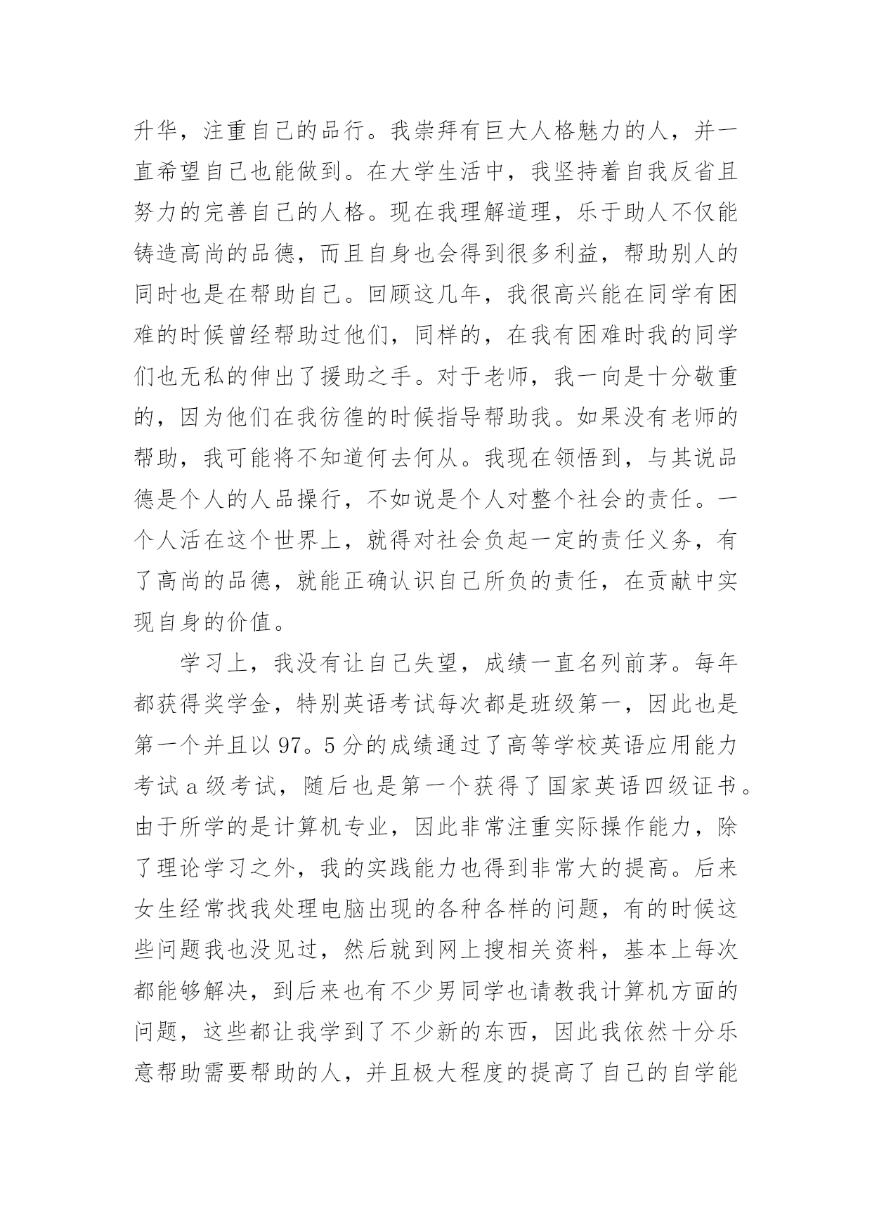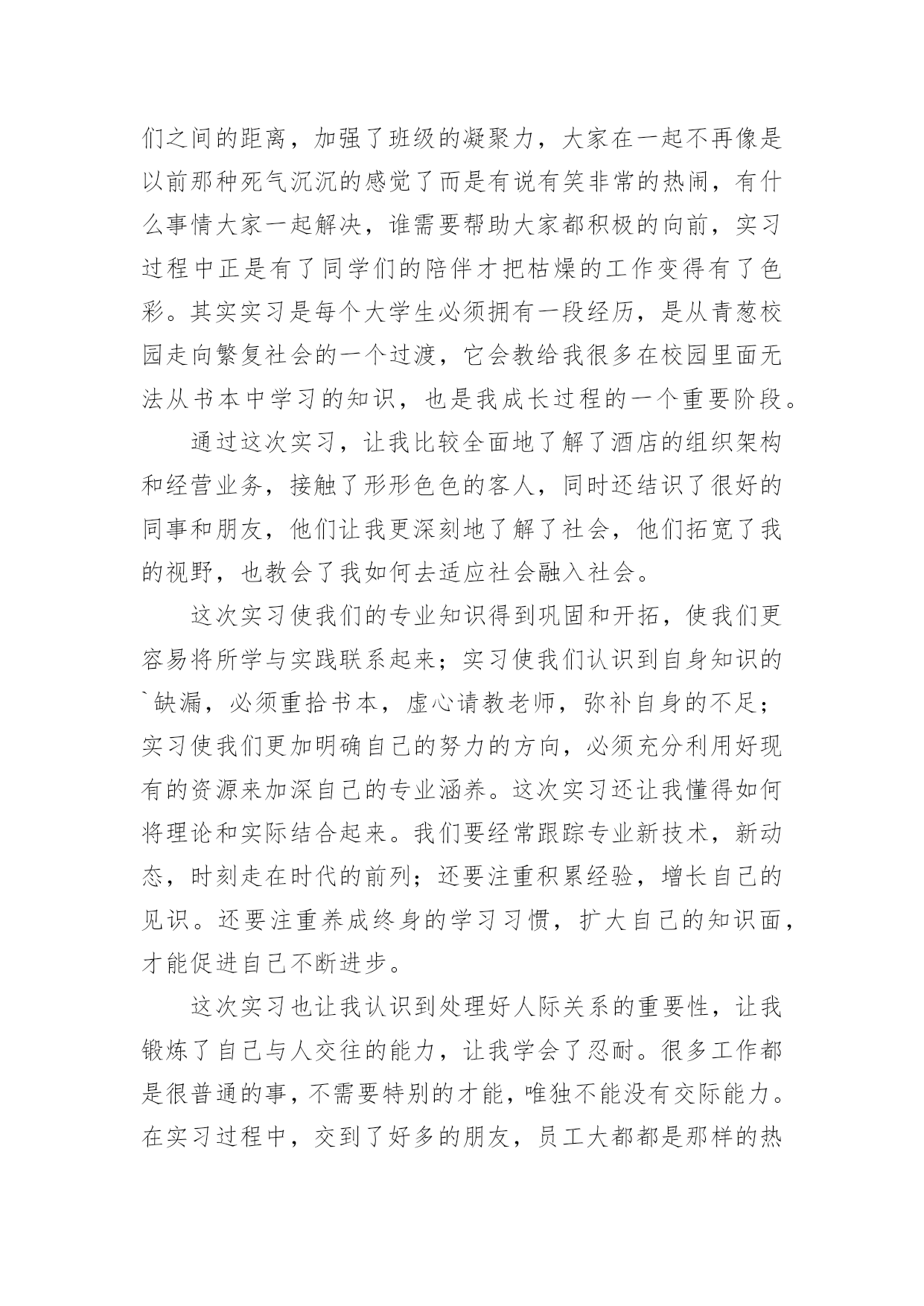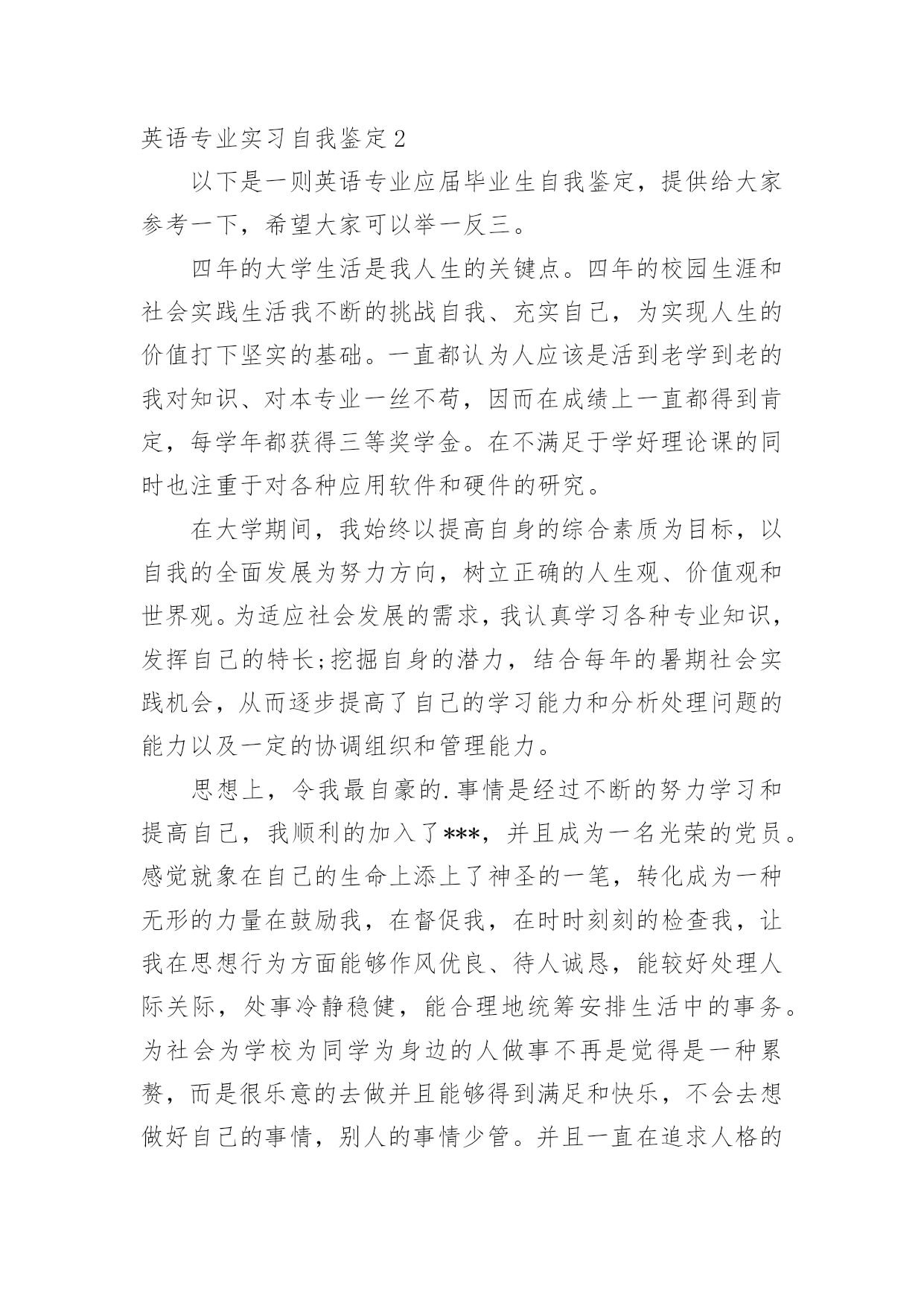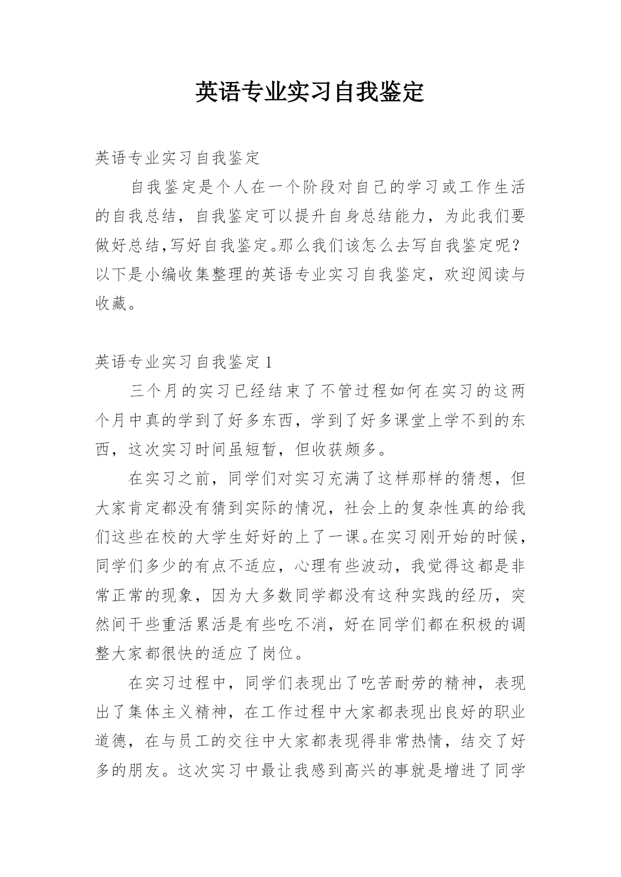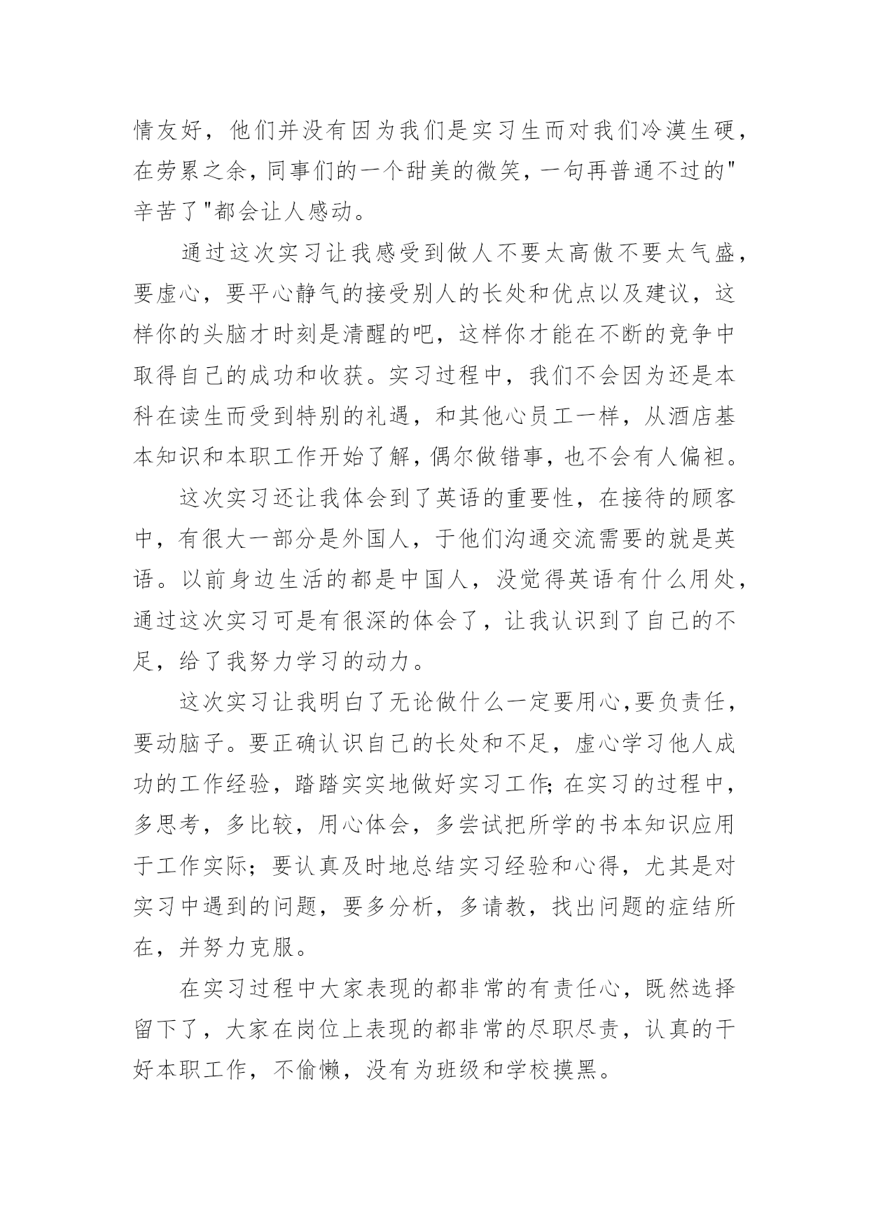 英语专业实习自我鉴定 英语专业实习自我鉴定自我鉴定是个人在一个阶段对自己的学习或工作生活的自我总结,自我鉴定可以提升自身总结能力,为此我们要做好总结,写好自我鉴定。那么我们该怎么去写自我鉴定呢?以下是小编收集整理的英语专业实习自我鉴定,欢迎阅读与收藏。英语专业实习自我鉴定1三个月的实习已经结束了不管过程如何在实习的这两个月中真的学到了好多东西,学到了好多课堂上学不到的东西,这次实习时间虽短暂,但收获颇多。在实习之前,同学们对实习充满了这样那样的猜想,但大家肯定都没有猜到实际的情况,社会上的复杂性真的给我们这些在校的大学生好好的上了一课。在实习刚开始的时候,同学们多少的有点不适应,心理有些波动,我觉得这都是非常正常的现象,因为大多数同学都没有这种实践的经历,突然间干些重活累活是有些吃不消,好在同学们都在积极的调整大家都很快的适应了岗位。在实习过程中,同学们表现出了吃苦耐劳的精神,表现出了集体主义精神,在工作过程中大家都表现出良好的职业道德,在与员工的交往中大家都表现得非常热情,结交了好多的朋友。这次实习中最让我感到高兴的事就是增进了同学们之间的距离,加强了班级的凝聚力,大家在一起不再像是以前那种死气沉沉的感觉了而是有说有笑非常的热闹,有什么事情大家一起解决,谁需要帮助大家都积极的向前,实习过程中正是有了同学们的陪伴才把枯燥的工作变得有了色彩。其实实习是每个大学生必须拥有一段经历,是从青葱校园走向繁复社会的一个过渡,它会教给我很多在校园里面无法从书本中学习的知识,也是我成长过程的一个重要阶段。通过这次实习,让我比较全面地了解了酒店的组织架构和经营业务,接触了形形色色的客人,同时还结识了很好的同事和朋友,他们让我更深刻地了解了社会,他们拓宽了我的视野,也教会了我如何去适应社会融入社会。这次实习使我们的专业知识得到巩固和开拓,使我们更容易将所学与实践联系起来;实习使我们认识到自身知识的`缺漏,必须重拾书本,虚心请教老师,弥补自身的不足;实习使我们更加明确自己的努力的方向,必须充分利用好现有的资源来加深自己的专业涵养。这次实习还让我懂得如何将理论和实际结合起来。我们要经常跟踪专业新技术,新动态,时刻走在时代的前列;还要注重积累经验,增长自己的见识。还要注重养成终身的学习习惯,扩大自己的知识面,才能促进自己不断进步。这次实习也让我认识到处理好人际关系的重要性,让我锻炼了自己与人交往的能力,让我学会了忍耐。很多工作都是很普通的事,不需要特别的才能,唯独不能没有交际能力。在实习过程中,交到了好多的朋友,员工大都都是那样的热情友好,他们并没有因为我们是实习生而对我们冷漠生硬,在劳累之余,同事们的一个甜美的微笑,一句再普通不过的"辛苦了"都会让人感动。通过这次实习让我感受到做人不要太高傲不要太气盛,要虚心,要平心静气的接受别人的长处和优点以及建议,这样你的头脑才时刻是清醒的吧,这样你才能在不断的竞争中取得自己的成功和收获。实习过程中,我们不会因为还是本科在读生而受到特别的礼遇,和其他心员工一样,从酒店基本知识和本职工作开始了解,偶尔做错事,也不会有人偏袒。这次实习还让我体会到了英语的重要性,在接待的顾客中,有很大一部分是外国人,于他们沟通交流需要的就是英语。以前身边生活的都是中国人,没觉得英语有什么用处,通过这次实习可是有很深的体会了,让我认识到了自己的不足,给了我努力学习的动力。这次实习让我明白了无论做什么一定要用心,要负责任,要动脑子。要正确认识自己的长处和不足,虚心学习他人成功的工作经验,踏踏实实地做好实习工作;在实习的过程中,多思考,多比较,用心体会,多尝试把所学的书本知识应用于工作实际;要认真及时地总结实习经验和心得,尤其是对实习中遇到的问题,要多分析,多请教,找出问题的症结所在,并努力克服。在实习过程中大家表现的都非常的有责任心,既然选择留下了,大家在岗位上表现的都非常的尽职尽责,认真的干好本职工作,不偷懒,没有为班级和学校摸黑。英语专业实习自我鉴定2以下是一则英语专业应届毕业生自我鉴定,提供给大家参考一下,希望大家可以举一反三。四年的大学生活是我人生的关键点。四年的校园生涯和社会实践生活我不断的挑战自我、充实自己,为实现人生的价值打下坚实的基础。一直都认为人应该是活到老学到老的我对知识、对本专业一丝不苟,因而在成绩上一直都得到肯定,每学年都获得三等奖学金。在不满足于学好理论课的同时也注重于对各种应用软件和硬件的研究。在大学期间,我始终以提高自身的综合素质为目标,以自我的全面发展为努力方向,树立正确的人生观、价值观和世界观。为适应社会发展的需求,我认真学习各种专业知识,发挥自己的特长;挖掘自身的潜力,结合每年的暑期社会实践机会,从而逐步提高了自己的学习能力和分析处理问题的能力以及一定的协调组织和管理能力。思想上,令我最自豪的.事情是