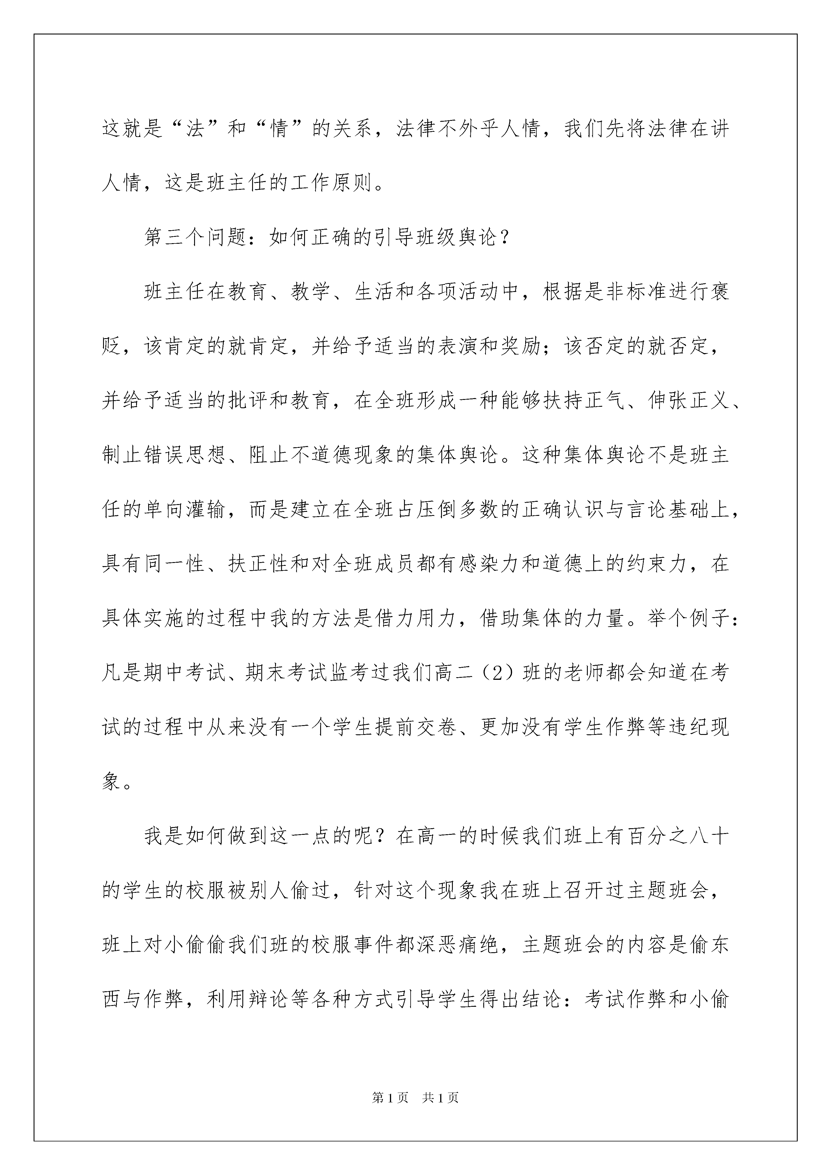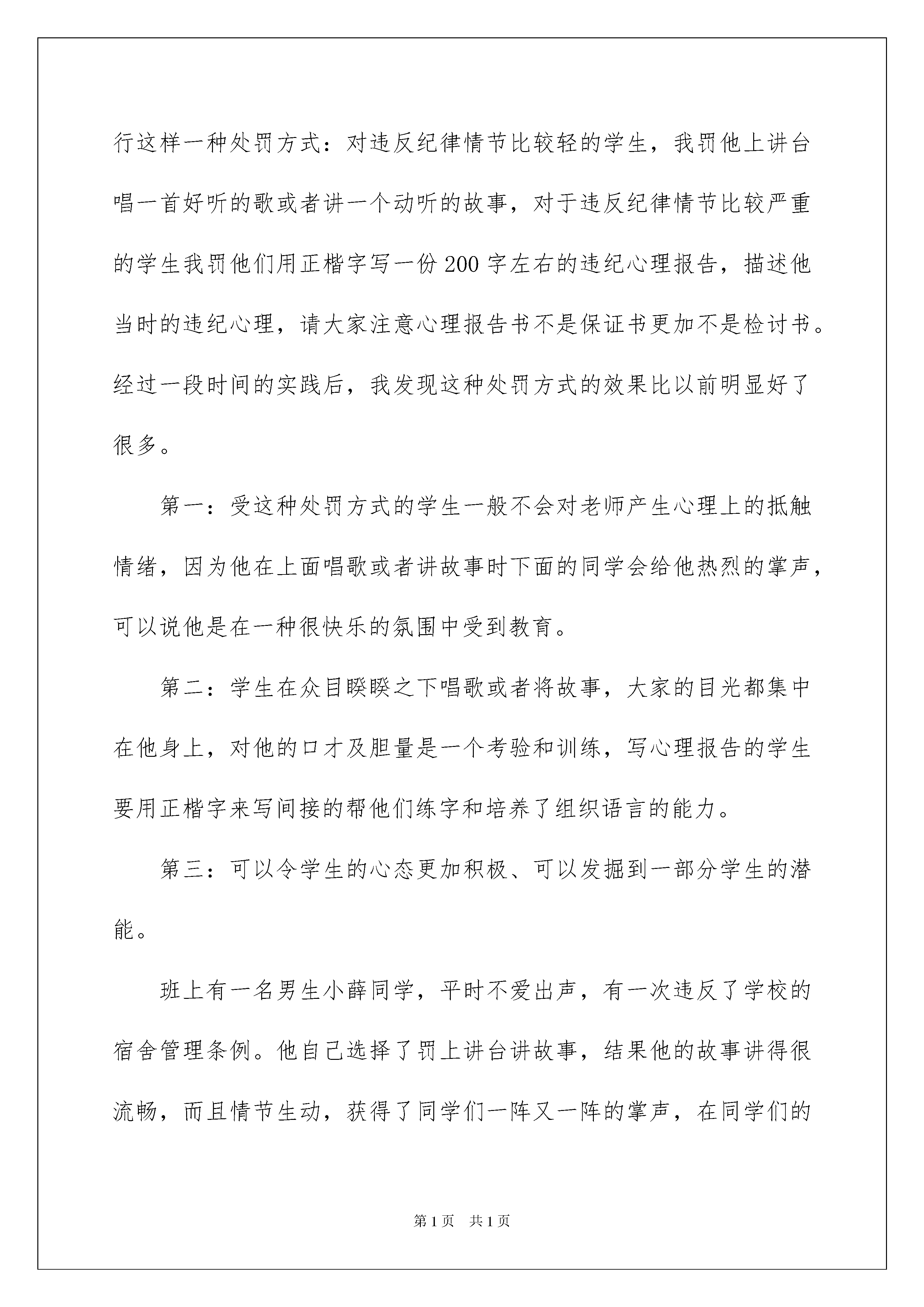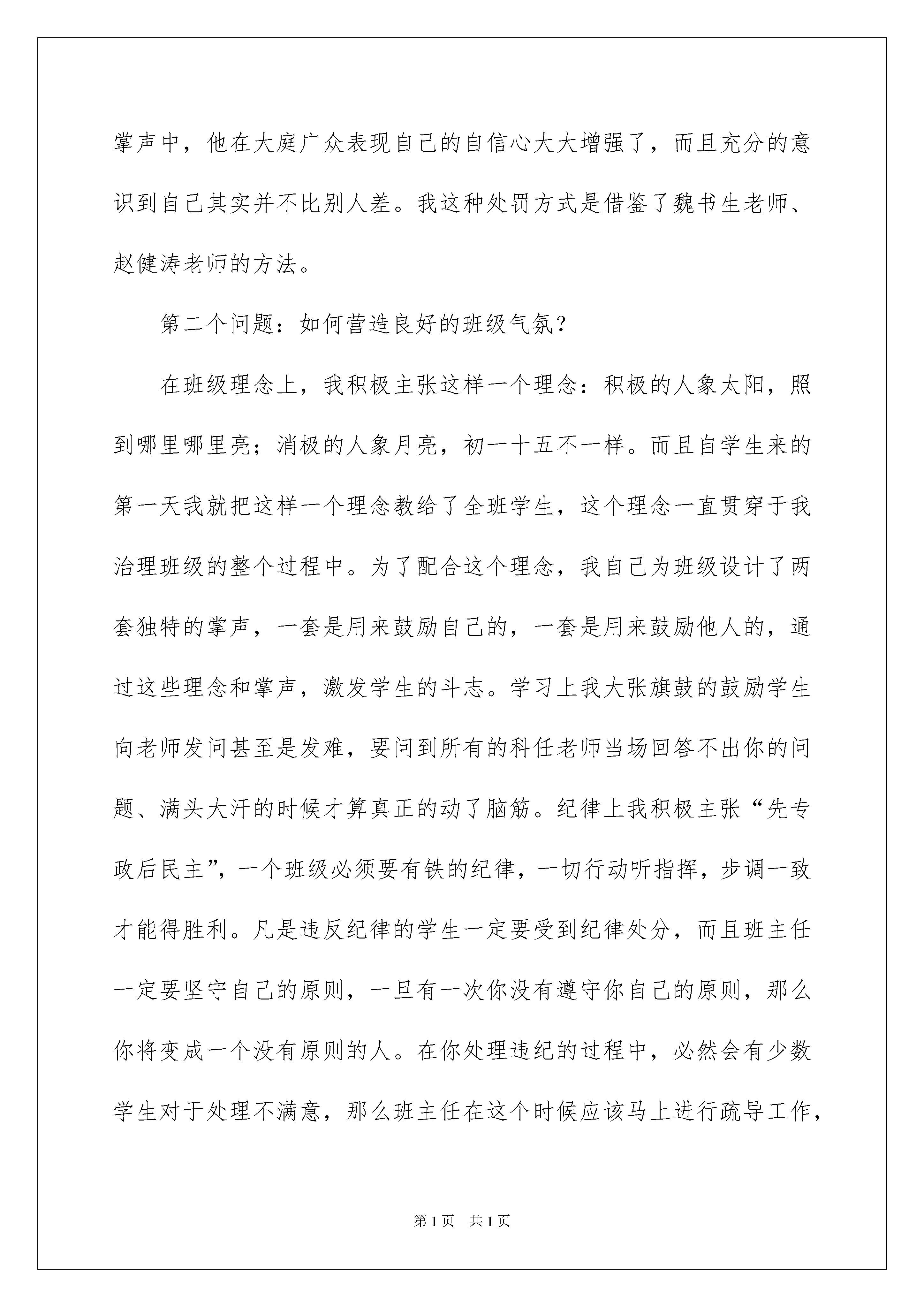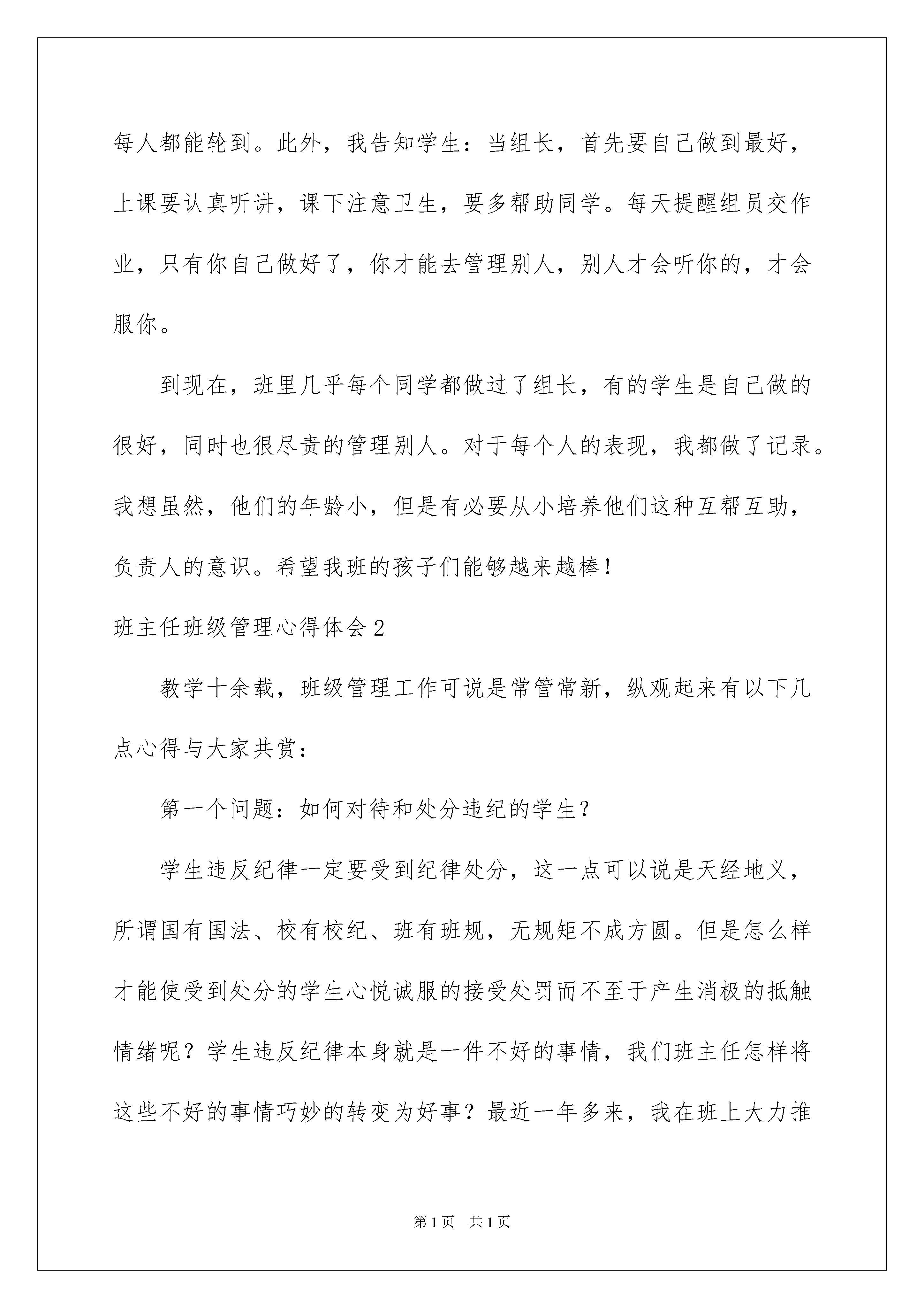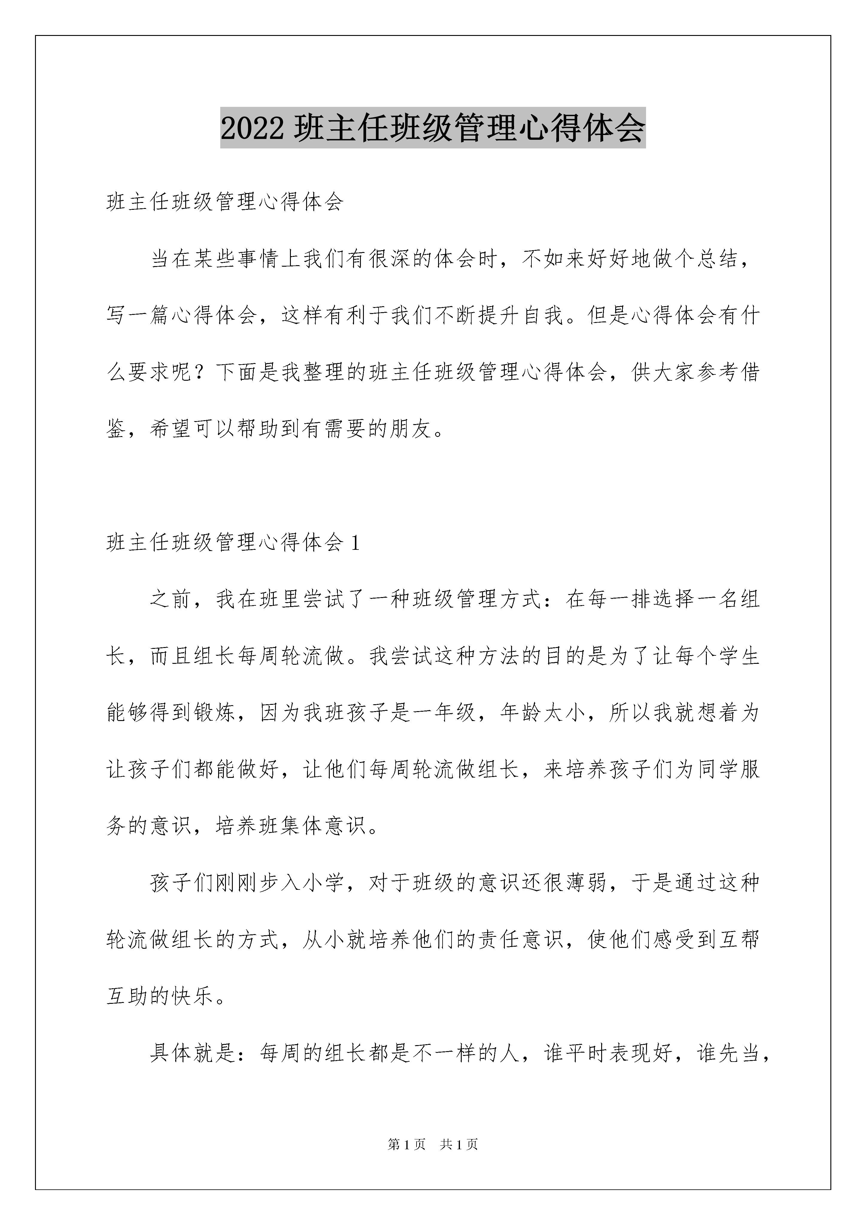 2022班主任班级管理心得体会班主任班级管理心得体会当在某些事情上我们有很深的体会时,不如来好好地做个总结,写一篇心得体会,这样有利于我们不断提升自我。但是心得体会有什么要求呢?下面是我整理的班主任班级管理心得体会,供大家参考借鉴,希望可以帮助到有需要的朋友。班主任班级管理心得体会1之前,我在班里尝试了一种班级管理方式:在每一排选择一名组长,而且组长每周轮流做。我尝试这种方法的目的是为了让每个学生能够得到锻炼,因为我班孩子是一年级,年龄太小,所以我就想着为让孩子们都能做好,让他们每周轮流做组长,来培养孩子们为同学服务的意识,培养班集体意识。孩子们刚刚步入小学,对于班级的意识还很薄弱,于是通过这种轮流做组长的方式,从小就培养他们的责任意识,使他们感受到互帮互助的快乐。具体就是:每周的组长都是不一样的人,谁平时表现好,谁先当,每人都能轮到。此外,我告知学生:当组长,首先要自己做到最好,上课要认真听讲,课下注意卫生,要多帮助同学。每天提醒组员交作业,只有你自己做好了,你才能去管理别人,别人才会听你的,才会服你。到现在,班里几乎每个同学都做过了组长,有的学生是自己做的很好,同时也很尽责的管理别人。对于每个人的表现,我都做了记录。我想虽然,他们的年龄小,但是有必要从小培养他们这种互帮互助,负责人的意识。希望我班的孩子们能够越来越棒!班主任班级管理心得体会2教学十余载,班级管理工作可说是常管常新,纵观起来有以下几点心得与大家共赏:第一个问题:如何对待和处分违纪的学生?学生违反纪律一定要受到纪律处分,这一点可以说是天经地义,所谓国有国法、校有校纪、班有班规,无规矩不成方圆。但是怎么样才能使受到处分的学生心悦诚服的接受处罚而不至于产生消极的抵触情绪呢?学生违反纪律本身就是一件不好的事情,我们班主任怎样将这些不好的事情巧妙的转变为好事?最近一年多来,我在班上大力推行这样一种处罚方式:对违反纪律情节比较轻的学生,我罚他上讲台唱一首好听的歌或者讲一个动听的故事,对于违反纪律情节比较严重的学生我罚他们用正楷字写一份200字左右的违纪心理报告,描述他当时的违纪心理,请大家注意心理报告书不是保证书更加不是检讨书。经过一段时间的实践后,我发现这种处罚方式的效果比以前明显好了很多。第一:受这种处罚方式的学生一般不会对老师产生心理上的抵触情绪,因为他在上面唱歌或者讲故事时下面的同学会给他热烈的掌声,可以说他是在一种很快乐的氛围中受到教育。第二:学生在众目睽睽之下唱歌或者将故事,大家的目光都集中在他身上,对他的口才及胆量是一个考验和训练,写心理报告的学生要用正楷字来写间接的帮他们练字和培养了组织语言的能力。第三:可以令学生的心态更加积极、可以发掘到一部分学生的潜能。班上有一名男生小薛同学,平时不爱出声,有一次违反了学校的宿舍管理条例。他自己选择了罚上讲台讲故事,结果他的故事讲得很流畅,而且情节生动,获得了同学们一阵又一阵的掌声,在同学们的掌声中,他在大庭广众表现自己的自信心大大增强了,而且充分的意识到自己其实并不比别人差。我这种处罚方式是借鉴了魏书生老师、赵健涛老师的方法。第二个问题:如何营造良好的班级气氛?在班级理念上,我积极主张这样一个理念:积极的人象太阳,照到哪里哪里亮;消极的人象月亮,初一十五不一样。而且自学生来的第一天我就把这样一个理念教给了全班学生,这个理念一直贯穿于我治理班级的整个过程中。为了配合这个理念,我自己为班级设计了两套独特的掌声,一套是用来鼓励自己的,一套是用来鼓励他人的,通过这些理念和掌声,激发学生的斗志。学习上我大张旗鼓的鼓励学生向老师发问甚至是发难,要问到所有的科任老师当场回答不出你的问题、满头大汗的时候才算真正的动了脑筋。纪律上我积极主张“先专政后民主”,一个班级必须要有铁的纪律,一切行动听指挥,步调一致才能得胜利。凡是违反纪律的学生一定要受到纪律处分,而且班主任一定要坚守自己的原则,一旦有一次你没有遵守你自己的原则,那么你将变成一个没有原则的人。在你处理违纪的过程中,必然会有少数学生对于处理不满意,那么班主任在这个时候应该马上进行疏导工作,这就是“法”和“情”的关系,法律不外乎人情,我们先将法律在讲人情,这是班主任的工作原则。第三个问题:如何正确的引导班级舆论?班主任在教育、教学、生活和各项活动中,根据是非标准进行褒贬,该肯定的就肯定,并给予适当的表演和奖励;该否定的就否定,并给予适当的批评和教育,在全班形成一种能够扶持正气、伸张正义、制止错误思想、阻止不道德现象的集体舆论。这种集体舆论不是班主任的单向灌输,而是建立在全班占压倒多数的正确认识与言论基础上,具有同一性、扶正性