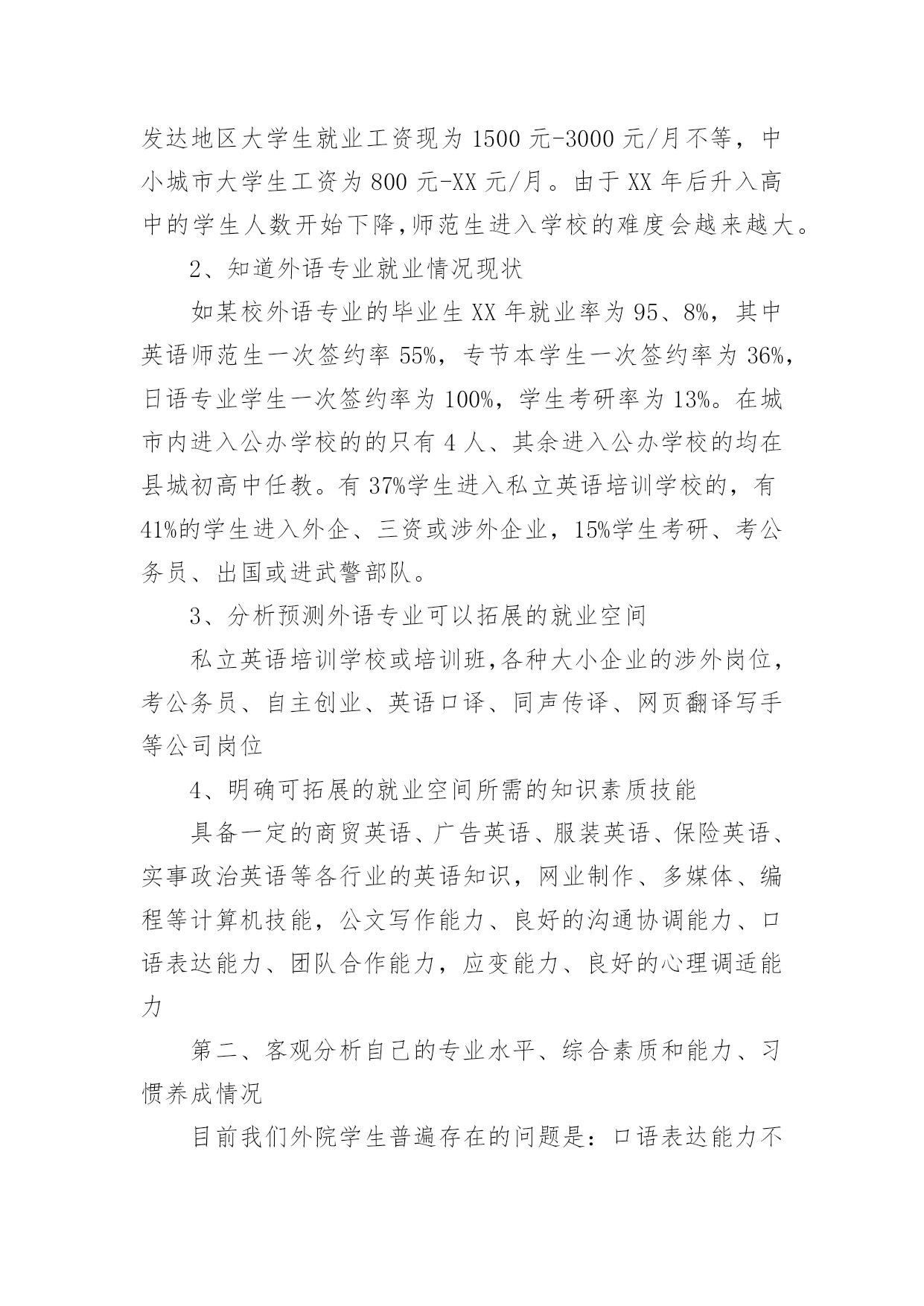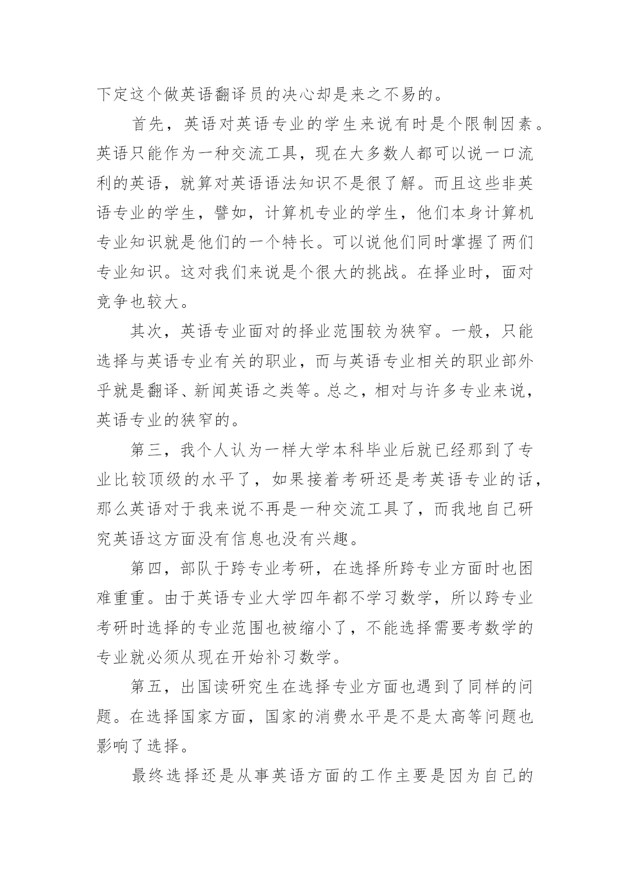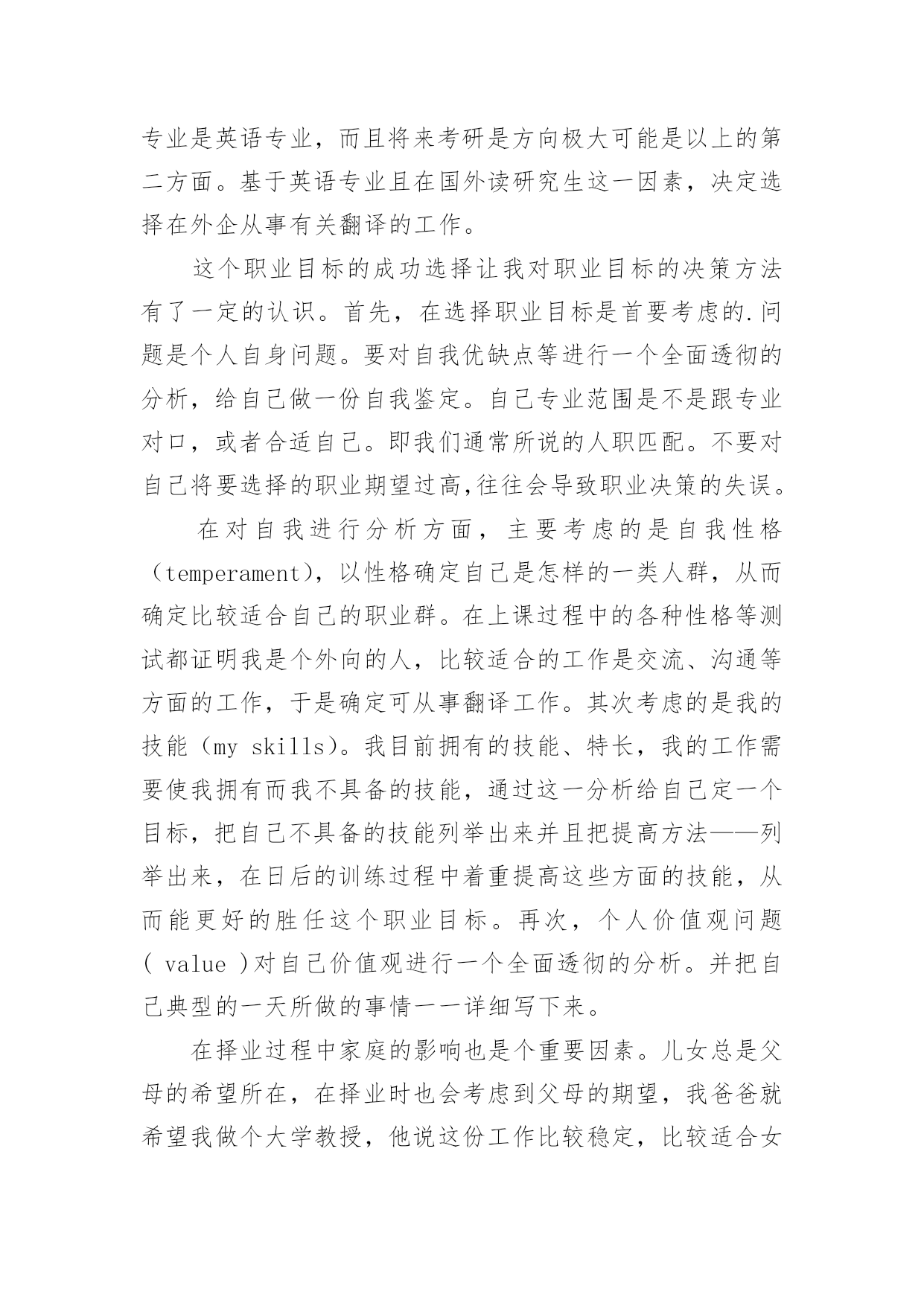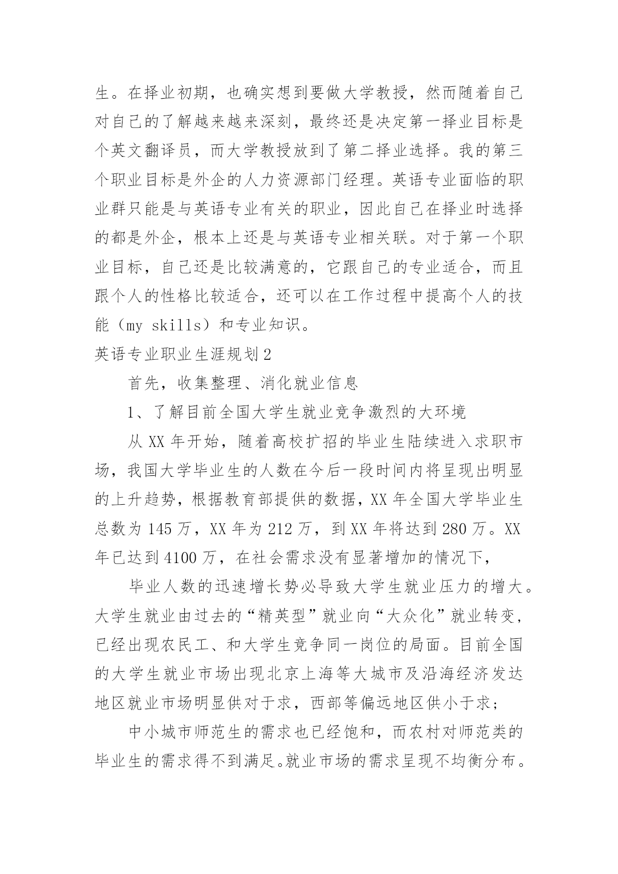 英语专业职业生涯规划 英语专业职业生涯规划每一天的时间都非常珍贵,如何才能提升自己,职业发展顺利呢?不如为自己的职业生涯做个规划吧。职业规划的开头要怎么写?想必这让大家都很苦恼吧,下面是小编精心整理的英语专业职业生涯规划,希望对大家有所帮助。英语专业职业生涯规划1大学本科三年级开始着手准备考研的事情,考研的方面有两方面的选择:第一方面是考英语专业或者跨专业考研。这一选择可以考中国传媒大学的新闻英语专业,从事新闻英语方面的工作;或者是考北京外国语大学、北京语言大学等语言类的学校,继续深造我的英语。至于跨专业考研,我咨询过我们的商务英语老师,她建议我考人力资源管理方面的研究生,譬如:广东外语外贸大学的人力资源管理专业,或者对外经贸大学等学校。另一方面。考国外大学的研究生,准备在国外读研究生。这对于一个英语专业的学生来说是很现实的。在国外可以了解更多国内所不能缺乏的资源、信息等。对说英语国家可以有个更好的了解,从而更能胜任自己的工作。也可能在国外发展。初步定为国外留学的目标是欧洲或者澳大利亚。我的职业目标是在外资企业中做一个英语翻译员。最终下定这个做英语翻译员的决心却是来之不易的。首先,英语对英语专业的学生来说有时是个限制因素。英语只能作为一种交流工具,现在大多数人都可以说一口流利的英语,就算对英语语法知识不是很了解。而且这些非英语专业的学生,譬如,计算机专业的学生,他们本身计算机专业知识就是他们的一个特长。可以说他们同时掌握了两们专业知识。这对我们来说是个很大的挑战。在择业时,面对竞争也较大。其次,英语专业面对的择业范围较为狭窄。一般,只能选择与英语专业有关的职业,而与英语专业相关的职业部外乎就是翻译、新闻英语之类等。总之,相对与许多专业来说,英语专业的狭窄的。第三,我个人认为一样大学本科毕业后就已经那到了专业比较顶级的水平了,如果接着考研还是考英语专业的话,那么英语对于我来说不再是一种交流工具了,而我地自己研究英语这方面没有信息也没有兴趣。第四,部队于跨专业考研,在选择所跨专业方面时也困难重重。由于英语专业大学四年都不学习数学,所以跨专业考研时选择的专业范围也被缩小了,不能选择需要考数学的专业就必须从现在开始补习数学。第五,出国读研究生在选择专业方面也遇到了同样的问题。在选择国家方面,国家的消费水平是不是太高等问题也影响了选择。最终选择还是从事英语方面的工作主要是因为自己的专业是英语专业,而且将来考研是方向极大可能是以上的第二方面。基于英语专业且在国外读研究生这一因素,决定选择在外企从事有关翻译的工作。这个职业目标的成功选择让我对职业目标的决策方法有了一定的认识。首先,在选择职业目标是首要考虑的.问题是个人自身问题。要对自我优缺点等进行一个全面透彻的分析,给自己做一份自我鉴定。自己专业范围是不是跟专业对口,或者合适自己。即我们通常所说的人职匹配。不要对自己将要选择的职业期望过高,往往会导致职业决策的失误。在对自我进行分析方面,主要考虑的是自我性格(temperament),以性格确定自己是怎样的一类人群,从而确定比较适合自己的职业群。在上课过程中的各种性格等测试都证明我是个外向的人,比较适合的工作是交流、沟通等方面的工作,于是确定可从事翻译工作。其次考虑的是我的技能(myskills)。我目前拥有的技能、特长,我的工作需要使我拥有而我不具备的技能,通过这一分析给自己定一个目标,把自己不具备的技能列举出来并且把提高方法——列举出来,在日后的训练过程中着重提高这些方面的技能,从而能更好的胜任这个职业目标。再次,个人价值观问题(value)对自己价值观进行一个全面透彻的分析。并把自己典型的一天所做的事情一一详细写下来。在择业过程中家庭的影响也是个重要因素。儿女总是父母的希望所在,在择业时也会考虑到父母的期望,我爸爸就希望我做个大学教授,他说这份工作比较稳定,比较适合女生。在择业初期,也确实想到要做大学教授,然而随着自己对自己的了解越来越来深刻,最终还是决定第一择业目标是个英文翻译员,而大学教授放到了第二择业选择。我的第三个职业目标是外企的人力资源部门经理。英语专业面临的职业群只能是与英语专业有关的职业,因此自己在择业时选择的都是外企,根本上还是与英语专业相关联。对于第一个职业目标,自己还是比较满意的,它跟自己的专业适合,而且跟个人的性格比较适合,还可以在工作过程中提高个人的技能(myskills)和专业知识。英语专业职业生涯规划2首先,收集整理、消化就业信息1、了解目前全国大学生就业竞争激烈的大环境从XX年开始,随着高校扩招的毕业生陆续进入求职市场,我国大学毕业生的人数在今后一段时间内将呈现出明显的上升趋势,根据教育部提供的数据,XX年全国大学毕业生总数为145万,XX年为212万,到XX年将达到280万。XX年已达到4100万,在