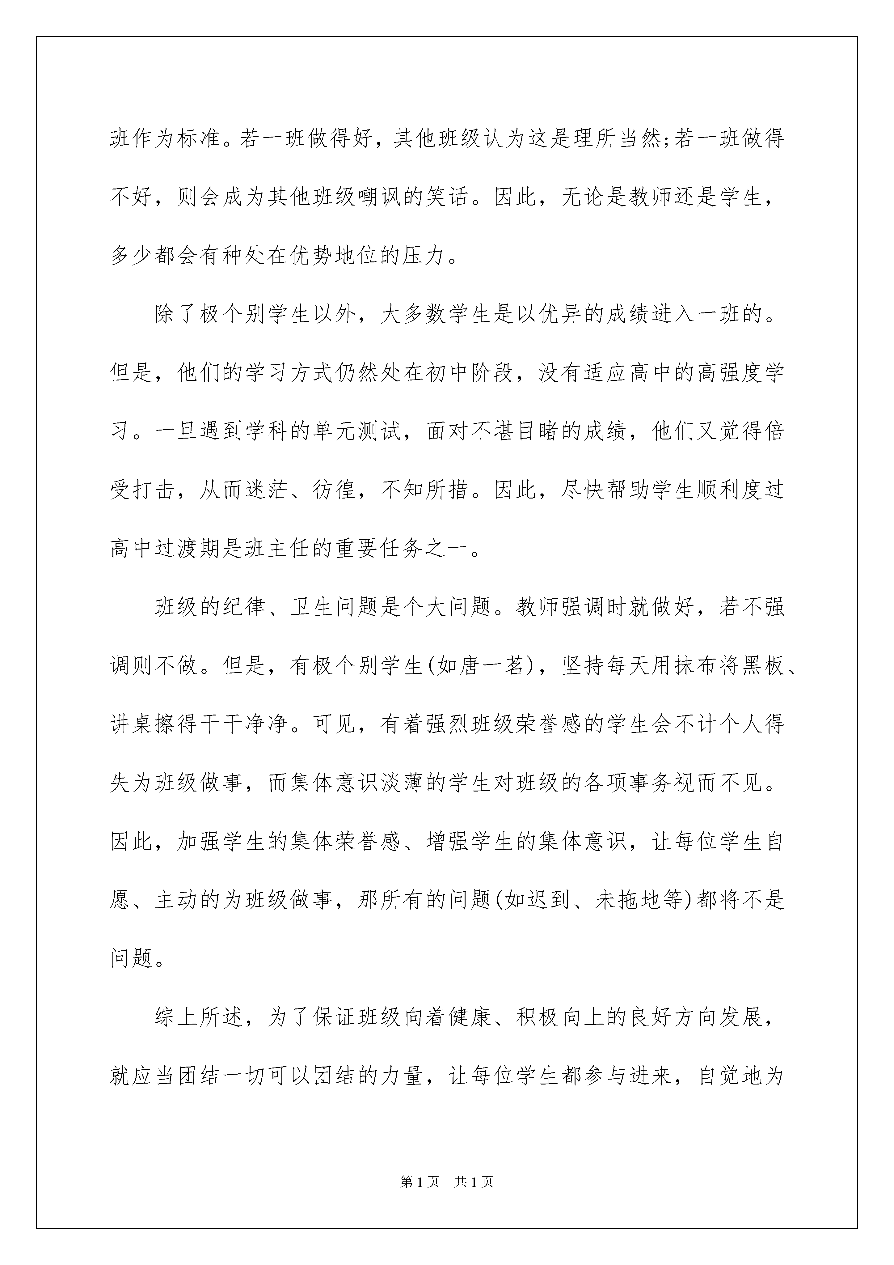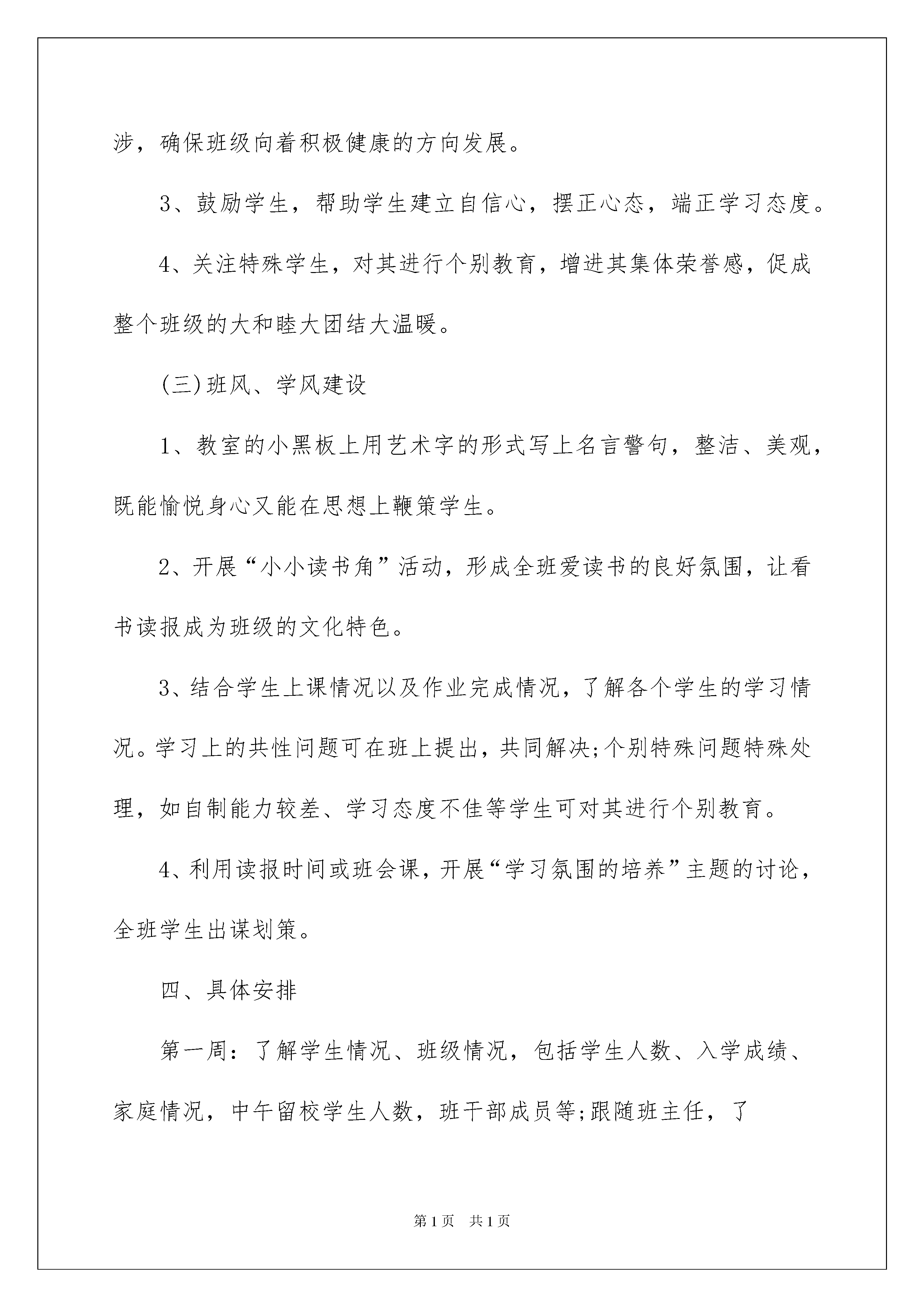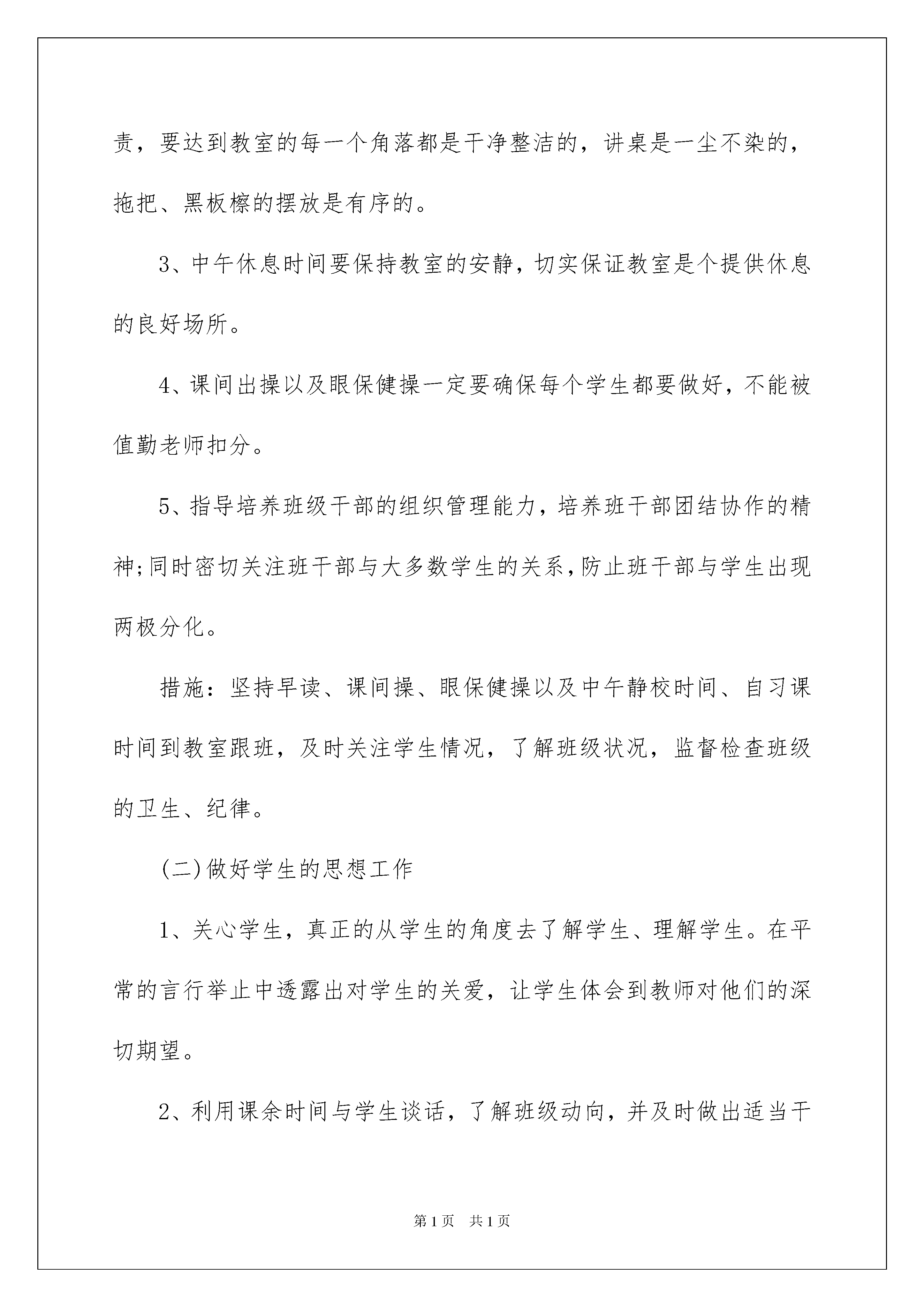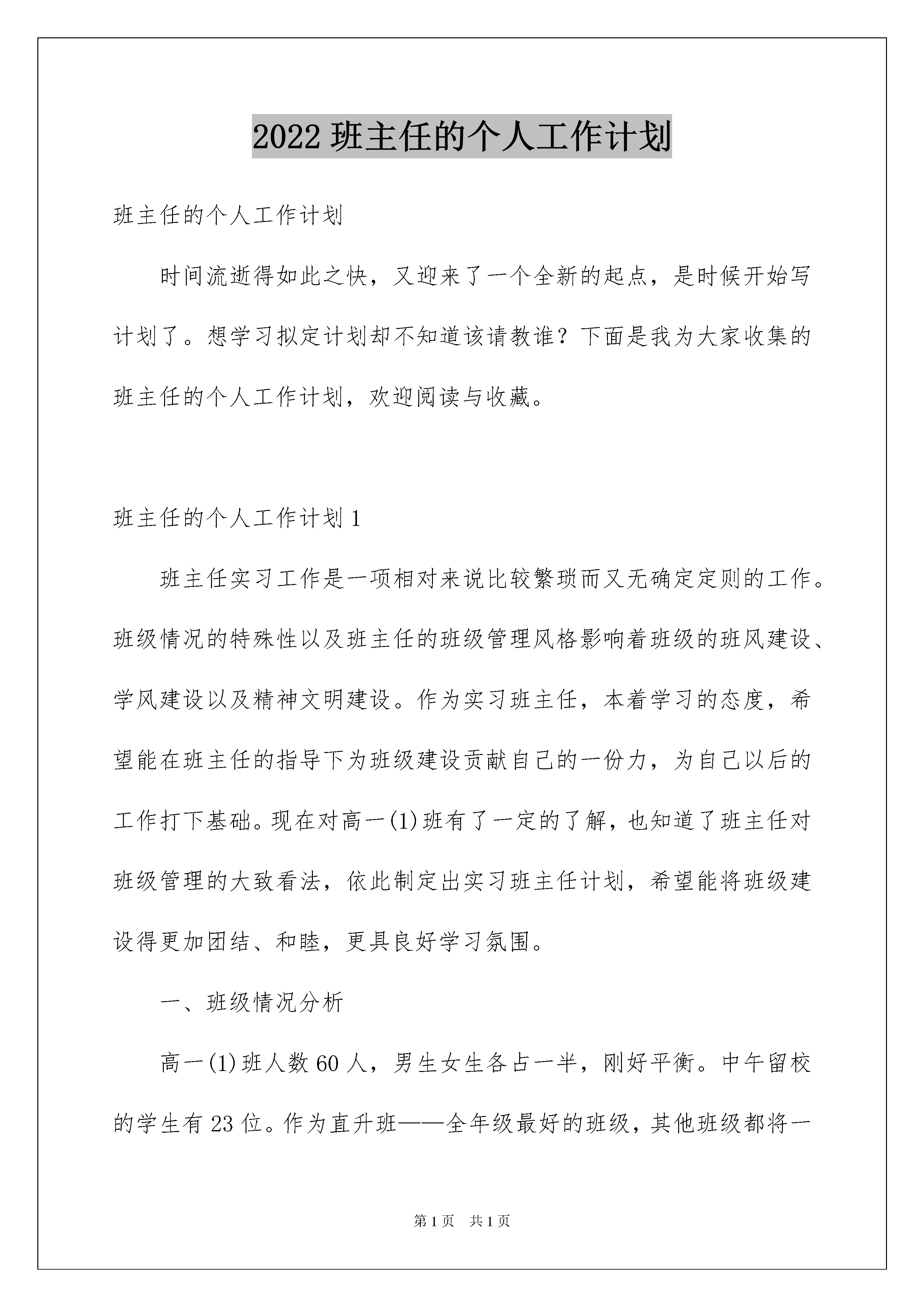 2022班主任的个人工作计划班主任的个人工作计划时间流逝得如此之快,又迎来了一个全新的起点,是时候开始写计划了。想学习拟定计划却不知道该请教谁?下面是我为大家收集的班主任的个人工作计划,欢迎阅读与收藏。班主任的个人工作计划1班主任实习工作是一项相对来说比较繁琐而又无确定定则的工作。班级情况的特殊性以及班主任的班级管理风格影响着班级的班风建设、学风建设以及精神文明建设。作为实习班主任,本着学习的态度,希望能在班主任的指导下为班级建设贡献自己的一份力,为自己以后的工作打下基础。现在对高一(1)班有了一定的了解,也知道了班主任对班级管理的大致看法,依此制定出实习班主任计划,希望能将班级建设得更加团结、和睦,更具良好学习氛围。一、班级情况分析高一(1)班人数60人,男生女生各占一半,刚好平衡。中午留校的学生有23位。作为直升班——全年级最好的班级,其他班级都将一班作为标准。若一班做得好,其他班级认为这是理所当然;若一班做得不好,则会成为其他班级嘲讽的笑话。因此,无论是教师还是学生,多少都会有种处在优势地位的压力。除了极个别学生以外,大多数学生是以优异的成绩进入一班的。但是,他们的学习方式仍然处在初中阶段,没有适应高中的高强度学习。一旦遇到学科的单元测试,面对不堪目睹的成绩,他们又觉得倍受打击,从而迷茫、彷徨,不知所措。因此,尽快帮助学生顺利度过高中过渡期是班主任的重要任务之一。班级的纪律、卫生问题是个大问题。教师强调时就做好,若不强调则不做。但是,有极个别学生(如唐一茗),坚持每天用抹布将黑板、讲桌擦得干干净净。可见,有着强烈班级荣誉感的学生会不计个人得失为班级做事,而集体意识淡薄的学生对班级的各项事务视而不见。因此,加强学生的集体荣誉感、增强学生的集体意识,让每位学生自愿、主动的为班级做事,那所有的问题(如迟到、未拖地等)都将不是问题。综上所述,为了保证班级向着健康、积极向上的良好方向发展,就应当团结一切可以团结的力量,让每位学生都参与进来,自觉地为班集体做事。让这种自觉成为习惯,渐渐的,一个班的班风建设、学风建设以及精神文明建设就都水到渠成了。二、班级建设目标1、引导学生做好思想工作,面对高中的学习和生活,要有正确的自我定位、良好的心理素质以及良好的行为习惯;重视学习方法,强调学习效率,注重细节,让一班的优秀成为一种习惯。2、帮助学生树立集体荣誉感,增强学生集体意识;让自觉的为班级做事成为一种习惯。3、指导学生养成良好的人文素养,促进班级良好班风、学风的形成。总体上,要达到人人为班级,人人爱班级,班级是我家的良好氛围。三、班级建设措施及具体步骤(一)常规要求及措施1、争取全班学生能够提前5分钟进教室,杜绝迟到现象;同时,早上收作业的时间为7点25至7点30,充分利用早读时间进行早读。2、切实落实卫生值日制,每天的卫生状况由当天值日学生全权负责,要达到教室的每一个角落都是干净整洁的,讲桌是一尘不染的,拖把、黑板檫的摆放是有序的。3、中午休息时间要保持教室的安静,切实保证教室是个提供休息的良好场所。4、课间出操以及眼保健操一定要确保每个学生都要做好,不能被值勤老师扣分。5、指导培养班级干部的组织管理能力,培养班干部团结协作的精神;同时密切关注班干部与大多数学生的关系,防止班干部与学生出现两极分化。措施:坚持早读、课间操、眼保健操以及中午静校时间、自习课时间到教室跟班,及时关注学生情况,了解班级状况,监督检查班级的卫生、纪律。(二)做好学生的思想工作1、关心学生,真正的从学生的角度去了解学生、理解学生。在平常的言行举止中透露出对学生的关爱,让学生体会到教师对他们的深切期望。2、利用课余时间与学生谈话,了解班级动向,并及时做出适当干涉,确保班级向着积极健康的方向发展。3、鼓励学生,帮助学生建立自信心,摆正心态,端正学习态度。4、关注特殊学生,对其进行个别教育,增进其集体荣誉感,促成整个班级的大和睦大团结大温暖。(三)班风、学风建设1、教室的小黑板上用艺术字的形式写上名言警句,整洁、美观,既能愉悦身心又能在思想上鞭策学生。2、开展“小小读书角”活动,形成全班爱读书的良好氛围,让看书读报成为班级的文化特色。3、结合学生上课情况以及作业完成情况,了解各个学生的学习情况。学习上的共性问题可在班上提出,共同解决;个别特殊问题特殊处理,如自制能力较差、学习态度不佳等学生可对其进行个别教育。4、利用读报时间或班会课,开展“学习氛围的培养”主题的讨论,全班学生出谋划策。四、具体安排第一周:了解学生情况、班级情况,包括学生人数、入学成绩、家庭情况,中午留校学生人数,班干部成员等;跟随班主任,了班主任的