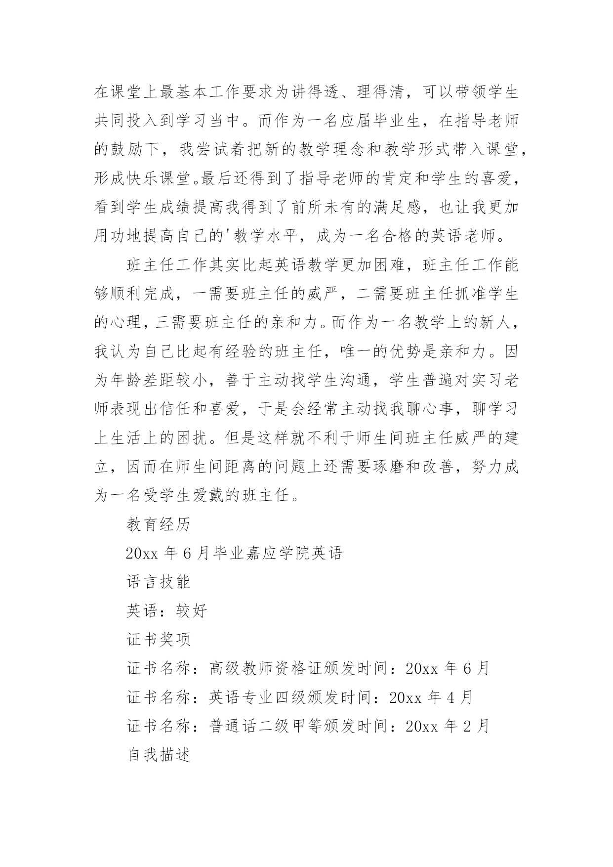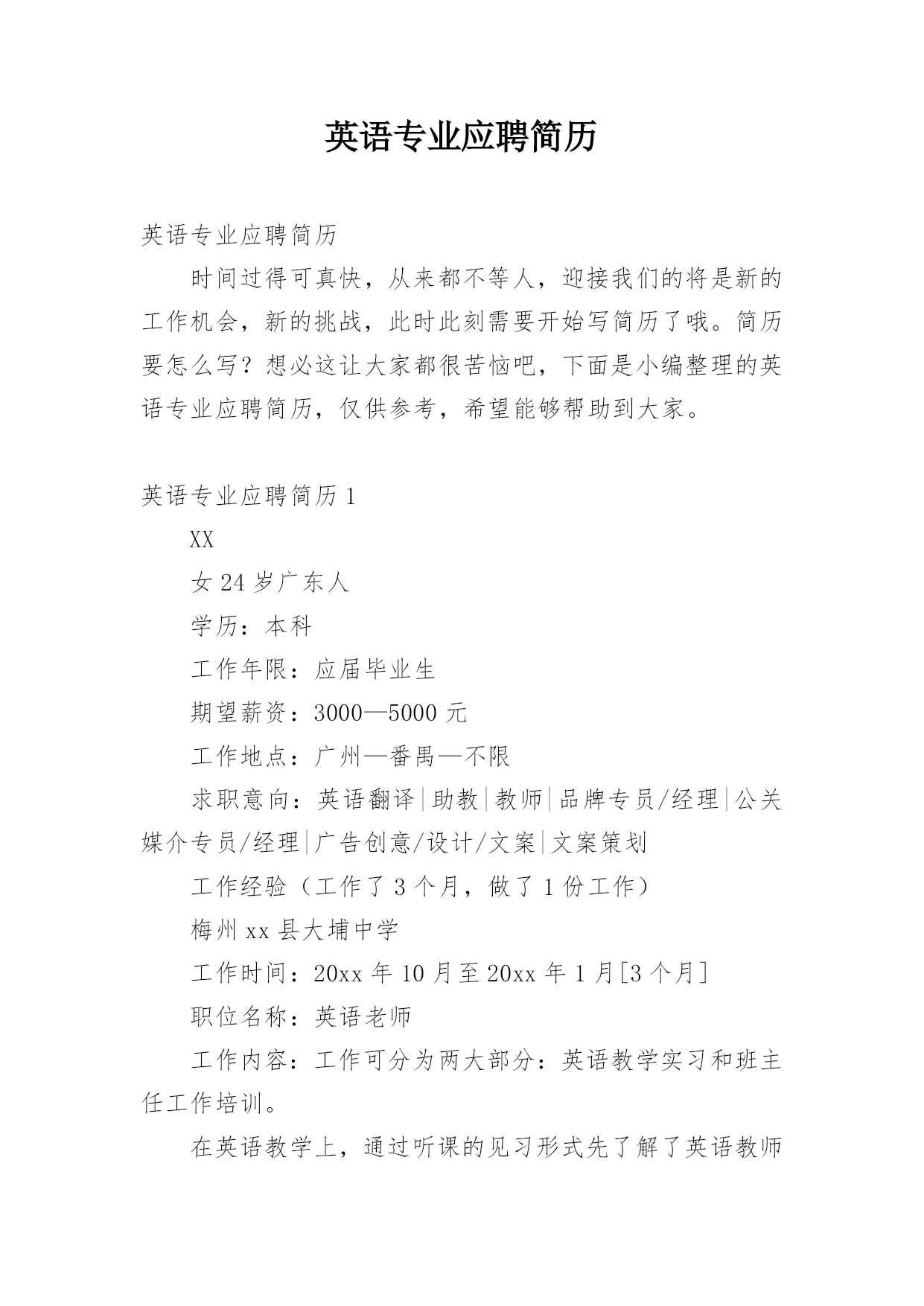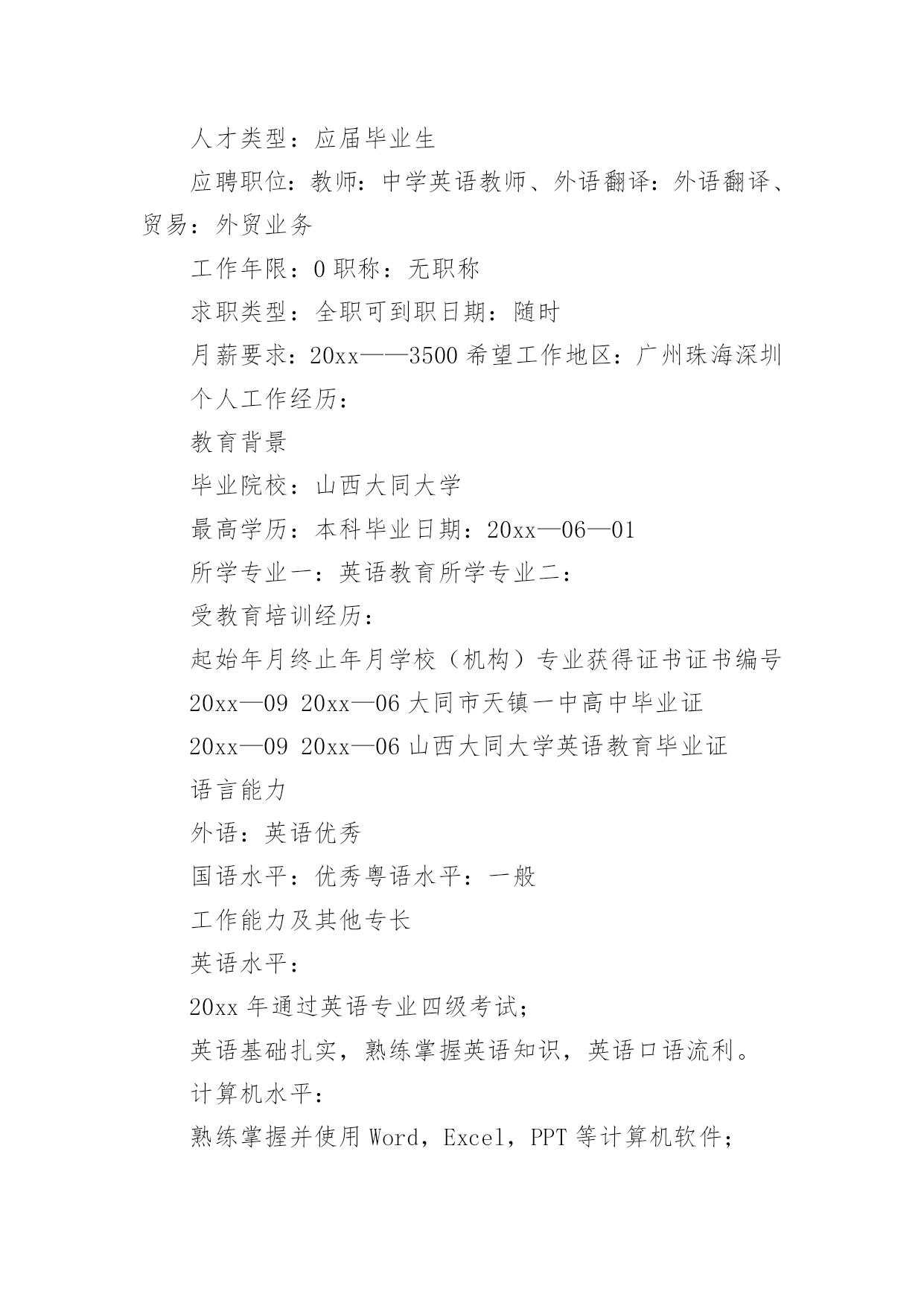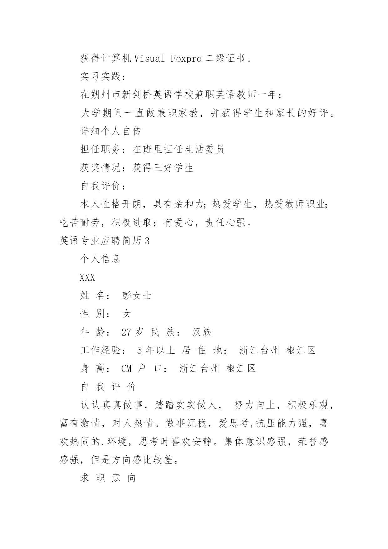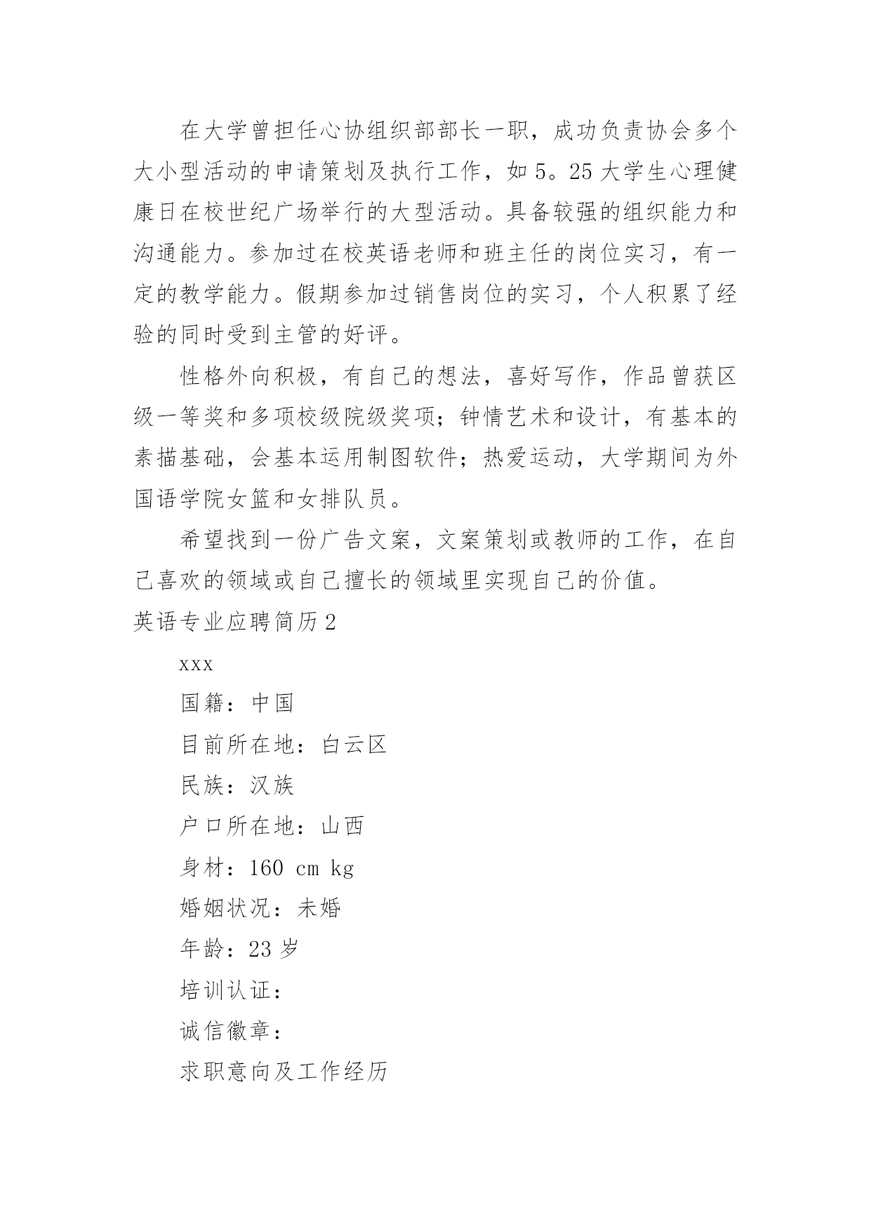 英语专业应聘简历 英语专业应聘简历时间过得可真快,从来都不等人,迎接我们的将是新的工作机会,新的挑战,此时此刻需要开始写简历了哦。简历要怎么写?想必这让大家都很苦恼吧,下面是小编整理的英语专业应聘简历,仅供参考,希望能够帮助到大家。英语专业应聘简历1XX女24岁广东人学历:本科工作年限:应届毕业生期望薪资:3000—5000元工作地点:广州—番禺—不限求职意向:英语翻译|助教|教师|品牌专员/经理|公关媒介专员/经理|广告创意/设计/文案|文案策划工作经验(工作了3个月,做了1份工作)梅州xx县大埔中学工作时间:20xx年10月至20xx年1月[3个月]职位名称:英语老师工作内容:工作可分为两大部分:英语教学实习和班主任工作培训。在英语教学上,通过听课的见习形式先了解了英语教师在课堂上最基本工作要求为讲得透、理得清,可以带领学生共同投入到学习当中。而作为一名应届毕业生,在指导老师的鼓励下,我尝试着把新的教学理念和教学形式带入课堂,形成快乐课堂。最后还得到了指导老师的肯定和学生的喜爱,看到学生成绩提高我得到了前所未有的满足感,也让我更加用功地提高自己的'教学水平,成为一名合格的英语老师。班主任工作其实比起英语教学更加困难,班主任工作能够顺利完成,一需要班主任的威严,二需要班主任抓准学生的心理,三需要班主任的亲和力。而作为一名教学上的新人,我认为自己比起有经验的班主任,唯一的优势是亲和力。因为年龄差距较小,善于主动找学生沟通,学生普遍对实习老师表现出信任和喜爱,于是会经常主动找我聊心事,聊学习上生活上的困扰。但是这样就不利于师生间班主任威严的建立,因而在师生间距离的问题上还需要琢磨和改善,努力成为一名受学生爱戴的班主任。教育经历20xx年6月毕业嘉应学院英语语言技能英语:较好证书奖项证书名称:高级教师资格证颁发时间:20xx年6月证书名称:英语专业四级颁发时间:20xx年4月证书名称:普通话二级甲等颁发时间:20xx年2月自我描述在大学曾担任心协组织部部长一职,成功负责协会多个大小型活动的申请策划及执行工作,如5。25大学生心理健康日在校世纪广场举行的大型活动。具备较强的组织能力和沟通能力。参加过在校英语老师和班主任的岗位实习,有一定的教学能力。假期参加过销售岗位的实习,个人积累了经验的同时受到主管的好评。性格外向积极,有自己的想法,喜好写作,作品曾获区级一等奖和多项校级院级奖项;钟情艺术和设计,有基本的素描基础,会基本运用制图软件;热爱运动,大学期间为外国语学院女篮和女排队员。希望找到一份广告文案,文案策划或教师的工作,在自己喜欢的领域或自己擅长的领域里实现自己的价值。英语专业应聘简历2xxx国籍:中国目前所在地:白云区民族:汉族户口所在地:山西身材:160cmkg婚姻状况:未婚年龄:23岁培训认证:诚信徽章:求职意向及工作经历人才类型:应届毕业生应聘职位:教师:中学英语教师、外语翻译:外语翻译、贸易:外贸业务工作年限:0职称:无职称求职类型:全职可到职日期:随时月薪要求:20xx——3500希望工作地区:广州珠海深圳个人工作经历:教育背景毕业院校:山西大同大学最高学历:本科毕业日期:20xx—06—01所学专业一:英语教育所学专业二:受教育培训经历:起始年月终止年月学校(机构)专业获得证书证书编号20xx—0920xx—06大同市天镇一中高中毕业证20xx—0920xx—06山西大同大学英语教育毕业证语言能力外语:英语优秀国语水平:优秀粤语水平:一般工作能力及其他专长英语水平:20xx年通过英语专业四级考试;英语基础扎实,熟练掌握英语知识,英语口语流利。计算机水平:熟练掌握并使用Word,Excel,PPT等计算机软件;获得计算机VisualFoxpro二级证书。实习实践:在朔州市新剑桥英语学校兼职英语教师一年;大学期间一直做兼职家教,并获得学生和家长的好评。详细个人自传担任职务:在班里担任生活委员获奖情况:获得三好学生自我评价:本人性格开朗,具有亲和力;热爱学生,热爱教师职业;吃苦耐劳,积极进取;有爱心,责任心强。英语专业应聘简历3个人信息XXX姓名:彭女士性别:女年龄:27岁民族:汉族工作经验:5年以上居住地:浙江台州椒江区身高:CM户口:浙江台州椒江区自我评价认认真真做事,踏踏实实做人,努力向上,积极乐观,富有激情,对人热情。做事沉稳,爱思考,抗压能力强,喜欢热闹的.环境,思考时喜欢安静。集体意识感强,荣誉感感强,但是方向感比较差。求职意向希望岗位:贸易/内贸/外贸类-国际业务贸易/内贸/外贸类-外贸经理/主管贸易/内贸/外贸类-其它相关职位寻求职位:外贸单证,英语翻译,人事,外贸,单证希望工作地点:浙江台州椒江区期望工资:5000/月到岗时间:随时到岗其它待遇要求:五险工作目标/发展方向外贸,管理工作经历▌20xx-