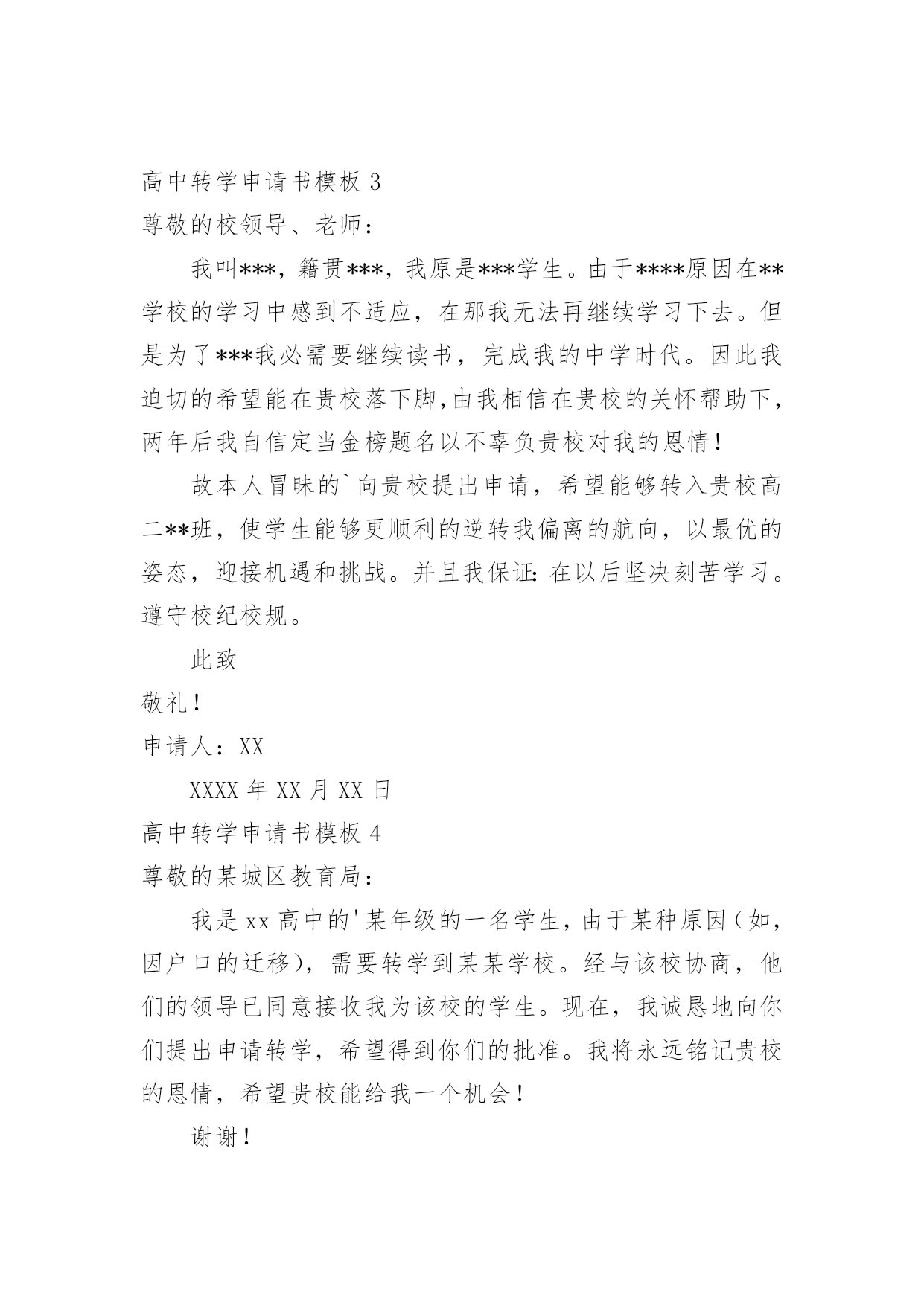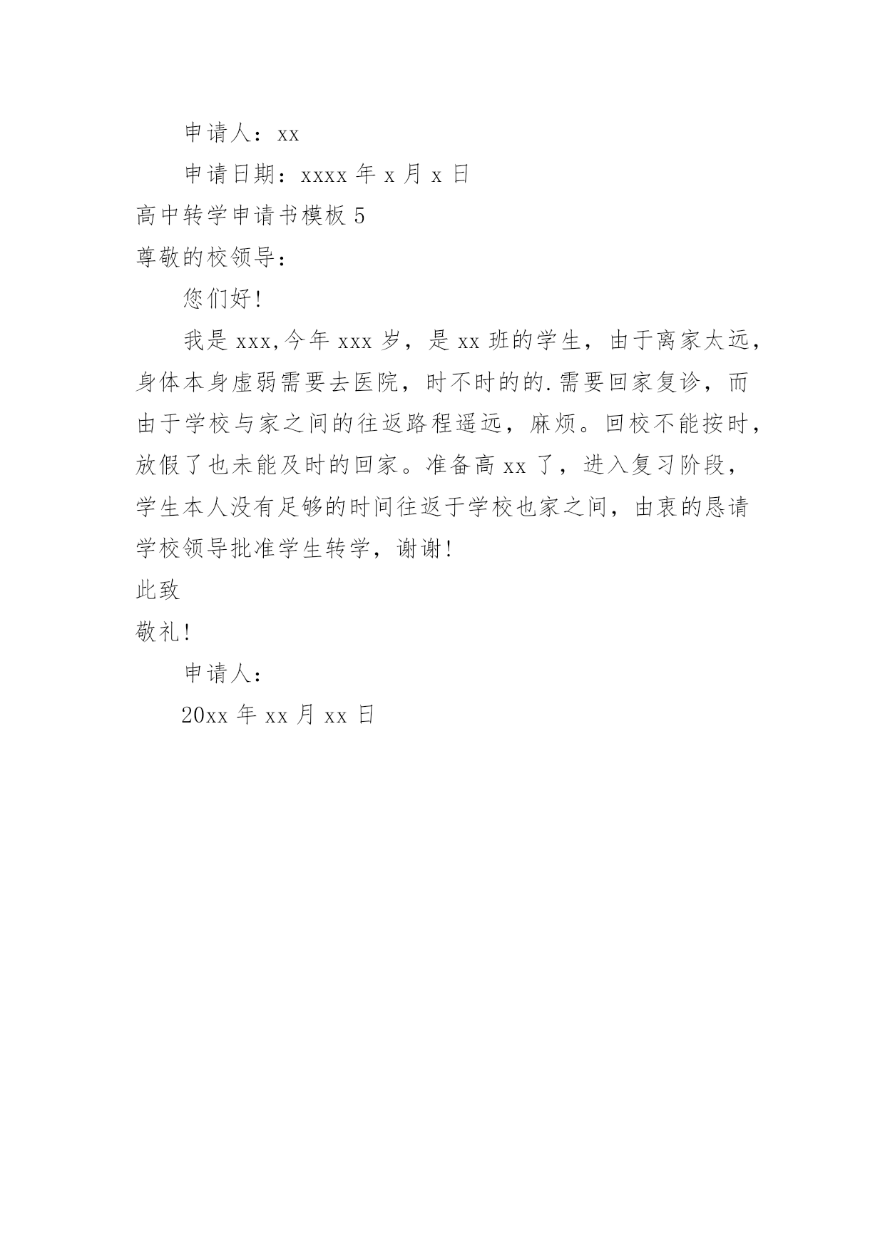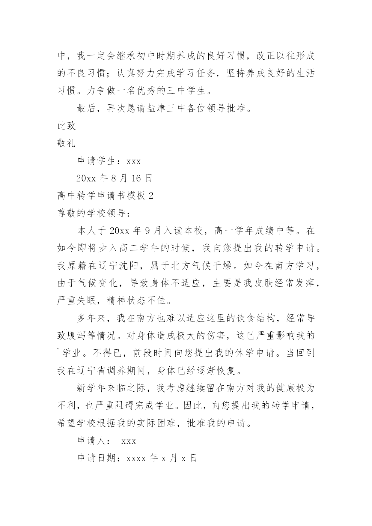 高中转学申请书 高中转学申请书模板在法律不断完善的社会中,我们每个人都可能要用到申请书,写申请书的时候要注意内容的完整。那么写申请书真的很难吗?下面是小编为大家收集的高中转学申请书模板,仅供参考,大家一起来看看吧。高中转学申请书模板1尊敬的xxx各位领导:您们好!我叫xx,是xx中学20xx级应届毕业生;我今年中考成绩502。9分,已达到贵校录取分数线。我一直仰慕贵校优美的办学环境,雄厚的师资力量;我希望能进入贵校学习,完成我的高中学业,进而实现自己的人生理想。在此我怀着十分激动的心情,郑重地申请在贵校就读高中。请求盐津三中各位领导批准。我的目标是考上理想的`大学;我相信有三中各位老师的辛勤教诲,有三中各位领导的竭诚管理;我有信心实现自己的愿望。在初中三年的学习生活中,我严格遵守校校纪校规,坚持认真完成学习任务,积极和同学老师搞好关系,养成了良好的学习生活习惯;学习中,我勤学好问;在生活中,我积极向上;在快乐中学习,在学习中找到快乐,是我的学习生活原则。在将来的盐津三中学习中我会坚持奋发***强,多问多思;生活中我会坚持***自强,多学多想。在将来的盐津三中学习生活中,我一定会继承初中时期养成的良好习惯,改正以往形成的不良习惯;认真努力完成学习任务,坚持养成良好的生活习惯。力争做一名优秀的三中学生。最后,再次恳请盐津三中各位领导批准。此致敬礼申请学生:xxx20xx年8月16日高中转学申请书模板2尊敬的学校领导:本人于20xx年9月入读本校,高一学年成绩中等。在如今即将步入高二学年的时候,我向您提出我的转学申请。我原籍在辽宁沈阳,属于北方气候干燥。如今在南方学习,由于气候变化,导致身体不适应,主要是我皮肤经常发痒,严重失眠,精神状态不佳。多年来,我在南方也难以适应这里的饮食结构,经常导致腹泻等情况。对身体造成极大的伤害,这已严重影响我的`学业。不得已,前段时间向您提出我的休学申请。当回到我在辽宁省调养期间,身体已经逐渐恢复。新学年来临之际,我考虑继续留在南方对我的健康极为不利,也严重阻碍完成学业。因此,向您提出我的转学申请,希望学校根据我的实际困难,批准我的申请。申请人:xxx申请日期:xxxx年x月x日高中转学申请书模板3尊敬的校领导、老师:我叫***,籍贯***,我原是***学生。由于****原因在**学校的学习中感到不适应,在那我无法再继续学习下去。但是为了***我必需要继续读书,完成我的中学时代。因此我迫切的希望能在贵校落下脚,由我相信在贵校的关怀帮助下,两年后我自信定当金榜题名以不辜负贵校对我的恩情!故本人冒昧的`向贵校提出申请,希望能够转入贵校高二**班,使学生能够更顺利的逆转我偏离的航向,以最优的姿态,迎接机遇和挑战。并且我保证:在以后坚决刻苦学习。遵守校纪校规。此致敬礼!申请人:XXXXXX年XX月XX日高中转学申请书模板4尊敬的某城区教育局:我是xx高中的'某年级的一名学生,由于某种原因(如,因户口的迁移),需要转学到某某学校。经与该校协商,他们的领导已同意接收我为该校的学生。现在,我诚恳地向你们提出申请转学,希望得到你们的批准。我将永远铭记贵校的恩情,希望贵校能给我一个机会!谢谢!申请人:xx申请日期:xxxx年x月x日高中转学申请书模板5尊敬的校领导:您们好!我是xxx,今年xxx岁,是xx班的学生,由于离家太远,身体本身虚弱需要去医院,时不时的的.需要回家复诊,而由于学校与家之间的往返路程遥远,麻烦。回校不能按时,放假了也未能及时的回家。准备高xx了,进入复习阶段,学生本人没有足够的时间往返于学校也家之间,由衷的恳请学校领导批准学生转学,谢谢!此致敬礼!申请人:20xx年xx月xx日