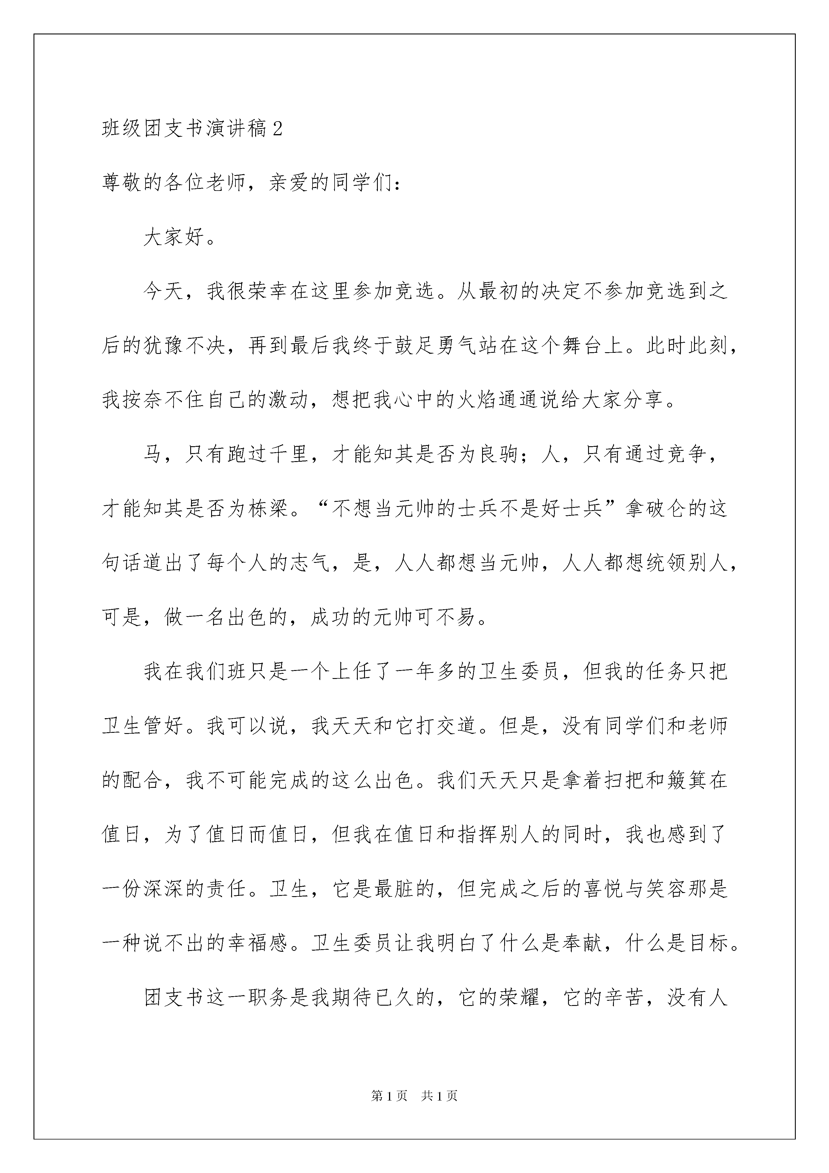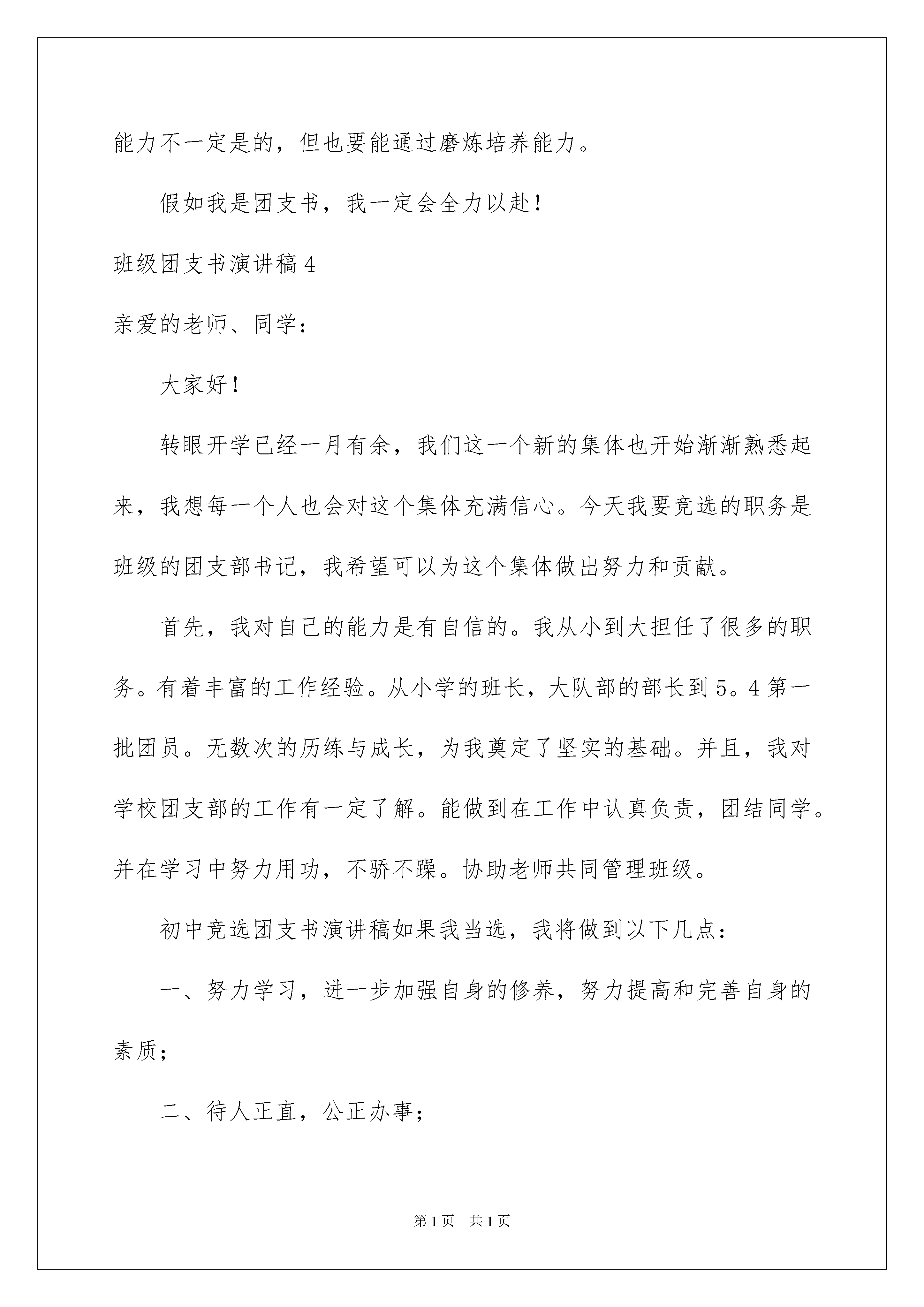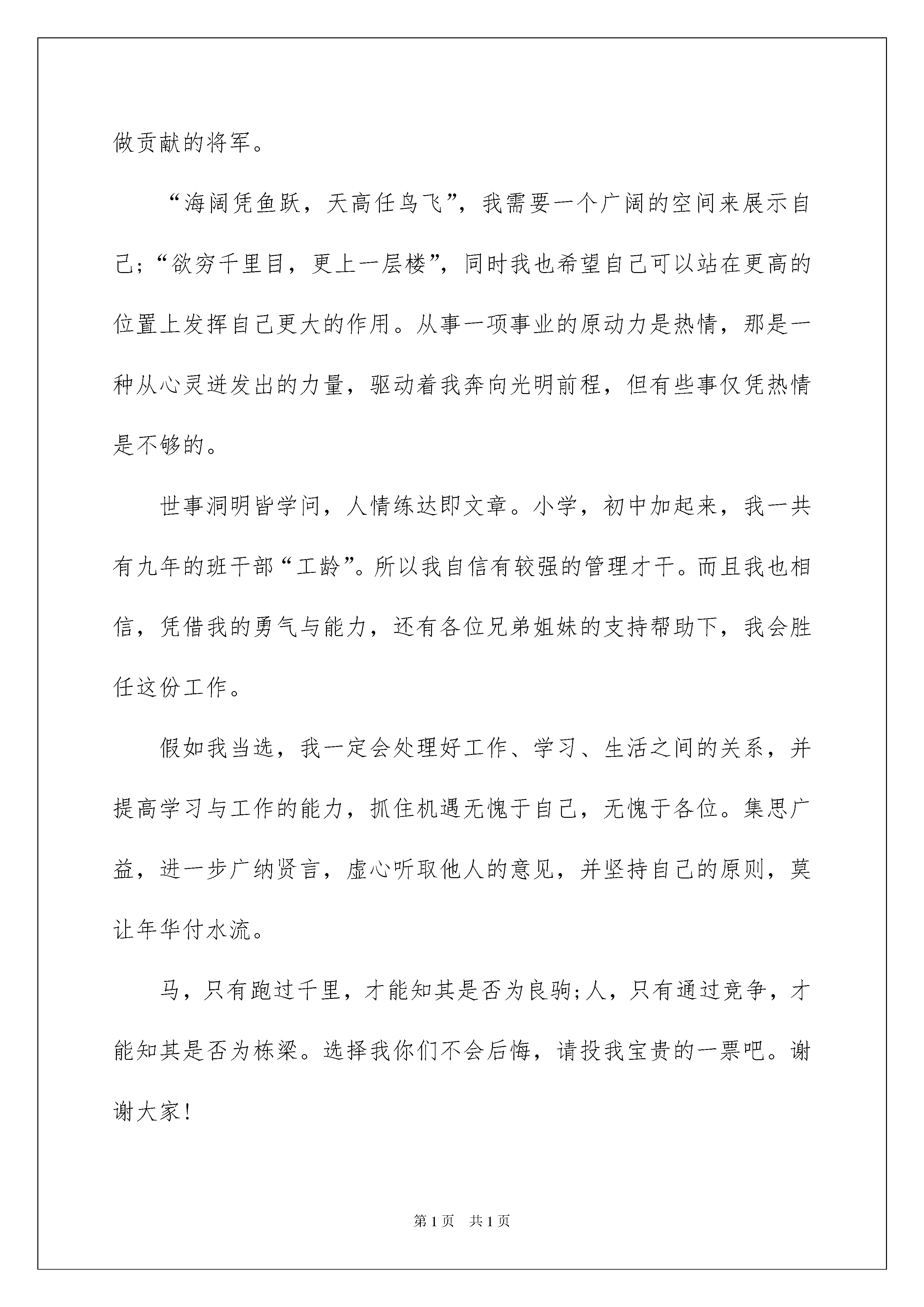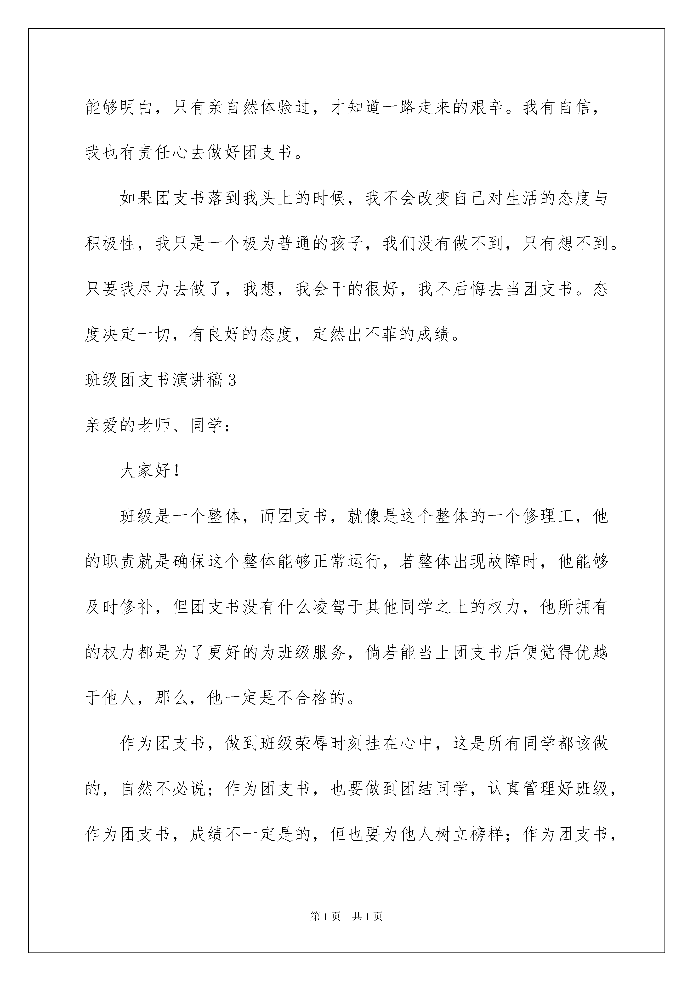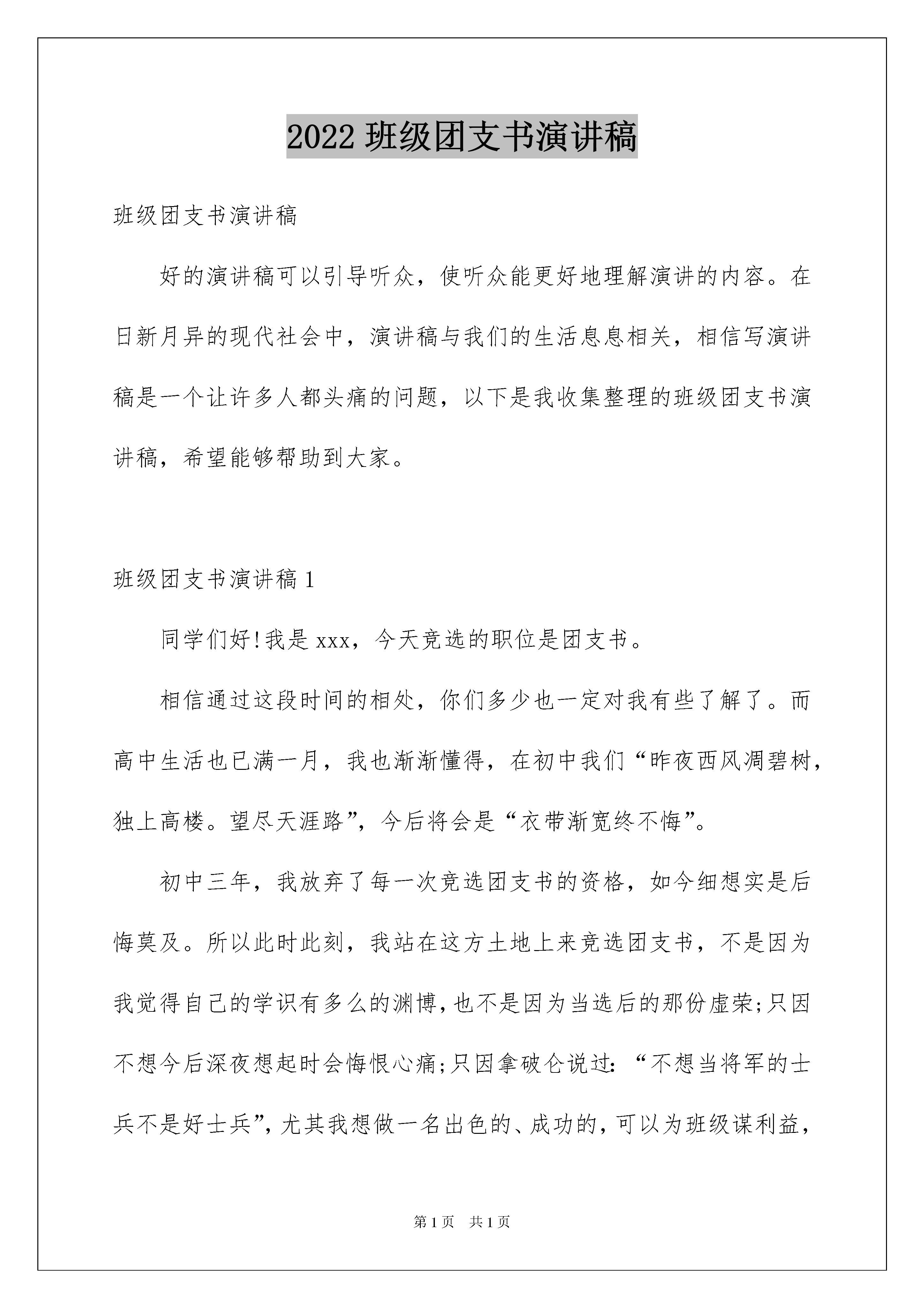 2022班级团支书演讲稿班级团支书演讲稿好的演讲稿可以引导听众,使听众能更好地理解演讲的内容。在日新月异的现代社会中,演讲稿与我们的生活息息相关,相信写演讲稿是一个让许多人都头痛的问题,以下是我收集整理的班级团支书演讲稿,希望能够帮助到大家。班级团支书演讲稿1同学们好!我是xxx,今天竞选的职位是团支书。相信通过这段时间的相处,你们多少也一定对我有些了解了。而高中生活也已满一月,我也渐渐懂得,在初中我们“昨夜西风凋碧树,独上高楼。望尽天涯路”,今后将会是“衣带渐宽终不悔”。初中三年,我放弃了每一次竞选团支书的资格,如今细想实是后悔莫及。所以此时此刻,我站在这方土地上来竞选团支书,不是因为我觉得自己的学识有多么的渊博,也不是因为当选后的那份虚荣;只因不想今后深夜想起时会悔恨心痛;只因拿破仑说过:“不想当将军的士兵不是好士兵”,尤其我想做一名出色的、成功的,可以为班级谋利益,做贡献的将军。“海阔凭鱼跃,天高任鸟飞”,我需要一个广阔的空间来展示自己;“欲穷千里目,更上一层楼”,同时我也希望自己可以站在更高的位置上发挥自己更大的作用。从事一项事业的原动力是热情,那是一种从心灵迸发出的力量,驱动着我奔向光明前程,但有些事仅凭热情是不够的。世事洞明皆学问,人情练达即文章。小学,初中加起来,我一共有九年的班干部“工龄”。所以我自信有较强的管理才干。而且我也相信,凭借我的勇气与能力,还有各位兄弟姐妹的支持帮助下,我会胜任这份工作。假如我当选,我一定会处理好工作、学习、生活之间的关系,并提高学习与工作的能力,抓住机遇无愧于自己,无愧于各位。集思广益,进一步广纳贤言,虚心听取他人的意见,并坚持自己的原则,莫让年华付水流。马,只有跑过千里,才能知其是否为良驹;人,只有通过竞争,才能知其是否为栋梁。选择我你们不会后悔,请投我宝贵的一票吧。谢谢大家!班级团支书演讲稿2尊敬的各位老师,亲爱的同学们:大家好。今天,我很荣幸在这里参加竞选。从最初的决定不参加竞选到之后的犹豫不决,再到最后我终于鼓足勇气站在这个舞台上。此时此刻,我按奈不住自己的激动,想把我心中的火焰通通说给大家分享。马,只有跑过千里,才能知其是否为良驹;人,只有通过竞争,才能知其是否为栋梁。“不想当元帅的士兵不是好士兵”拿破仑的这句话道出了每个人的志气,是,人人都想当元帅,人人都想统领别人,可是,做一名出色的,成功的元帅可不易。我在我们班只是一个上任了一年多的卫生委员,但我的任务只把卫生管好。我可以说,我天天和它打交道。但是,没有同学们和老师的配合,我不可能完成的这么出色。我们天天只是拿着扫把和簸箕在值日,为了值日而值日,但我在值日和指挥别人的同时,我也感到了一份深深的责任。卫生,它是最脏的,但完成之后的喜悦与笑容那是一种说不出的幸福感。卫生委员让我明白了什么是奉献,什么是目标。团支书这一职务是我期待已久的,它的荣耀,它的辛苦,没有人能够明白,只有亲自然体验过,才知道一路走来的艰辛。我有自信,我也有责任心去做好团支书。如果团支书落到我头上的时候,我不会改变自己对生活的态度与积极性,我只是一个极为普通的孩子,我们没有做不到,只有想不到。只要我尽力去做了,我想,我会干的很好,我不后悔去当团支书。态度决定一切,有良好的态度,定然出不菲的成绩。班级团支书演讲稿3亲爱的老师、同学:大家好!班级是一个整体,而团支书,就像是这个整体的一个修理工,他的职责就是确保这个整体能够正常运行,若整体出现故障时,他能够及时修补,但团支书没有什么凌驾于其他同学之上的权力,他所拥有的权力都是为了更好的为班级服务,倘若能当上团支书后便觉得优越于他人,那么,他一定是不合格的。作为团支书,做到班级荣辱时刻挂在心中,这是所有同学都该做的,自然不必说;作为团支书,也要做到团结同学,认真管理好班级,作为团支书,成绩不一定是的,但也要为他人树立榜样;作为团支书,能力不一定是的,但也要能通过磨炼培养能力。假如我是团支书,我一定会全力以赴!班级团支书演讲稿4亲爱的老师、同学:大家好!转眼开学已经一月有余,我们这一个新的集体也开始渐渐熟悉起来,我想每一个人也会对这个集体充满信心。今天我要竞选的职务是班级的团支部书记,我希望可以为这个集体做出努力和贡献。首先,我对自己的能力是有自信的。我从小到大担任了很多的职务。有着丰富的工作经验。从小学的班长,大队部的部长到5。4第一批团员。无数次的历练与成长,为我奠定了坚实的基础。并且,我对学校团支部的工作有一定了解。能做到在工作中认真负责,团结同学。并在学习中努力用功,不骄不躁。协助老师共同管理班级。初中竞选团支书演讲稿如果我当选,我将做到以下几点: