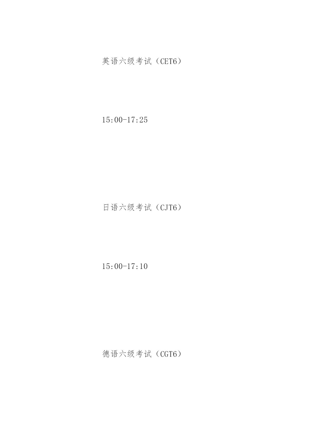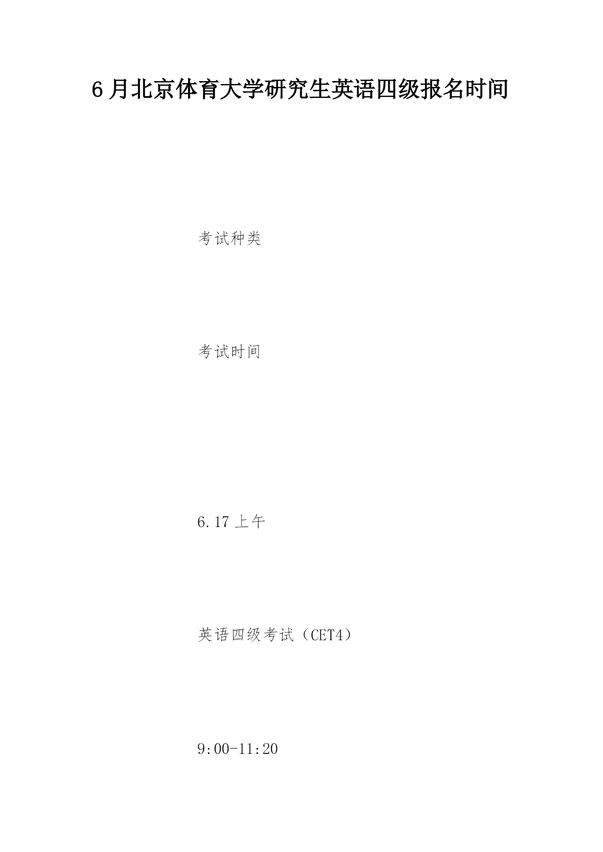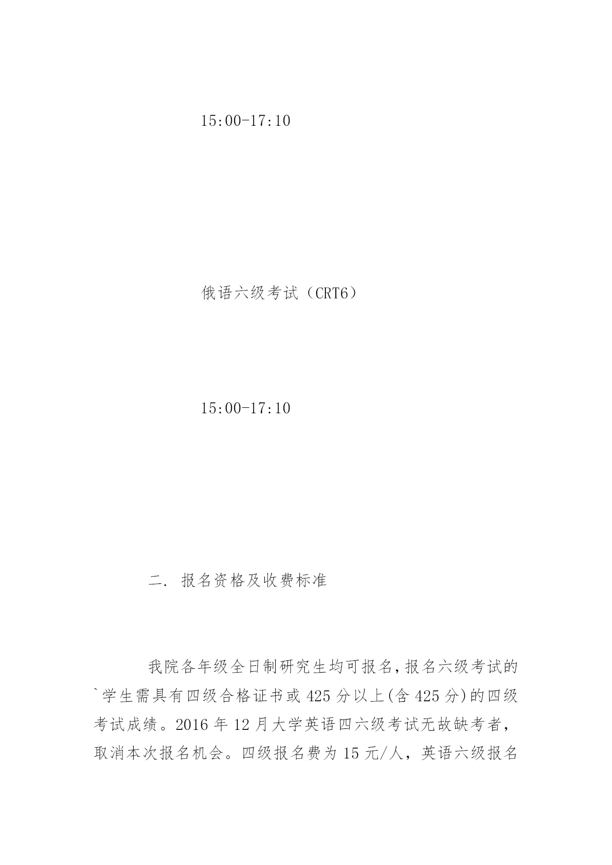6月北京体育大学研究生英语四级报名时间 考试种类 考试时间 6.17上午 英语四级考试(CET4) 9:00-11:20 日语四级考试(CJT4) 9:00-11:10 德语四级考试(CGT4) 9:00-11:10 俄语四级考试(CRT4) 9:00-11:10 法语四级考试(CFT4) 9:00-11:10 6.17下午 英语六级考试(CET6) 15:00-17:25 日语六级考试(CJT6) 15:00-17:10 德语六级考试(CGT6) 15:00-17:10 俄语六级考试(CRT6) 15:00-17:10 二.报名资格及收费标准 我院各年级全日制研究生均可报名,报名六级考试的`学生需具有四级合格证书或425分以上(含425分)的四级考试成绩。2016年12月大学英语四六级考试无故缺考者,取消本次报名机会。四级报名费为15元/人,英语六级报名费为17元/人。 三.报名流程 1.各年级研究生于3月19日(周日)24:00前登陆研究生管理系统报名。 2.3月22日(周三)各院系到研究生院(南办公楼236)领取校对册,并要求报名同学校对报考信息、照片,并签名确认,3月27日(周一)一并交回研究生院并领取缴费单; 3.3月29日(周三)8:00—16:00(11:45-14:00不收费)各院系负责人携带缴费单(一式两份)前往财务处(南办公楼143室)缴费,缴费后将缴费名单(加盖财务处章)送达研究生院(南办公楼236)。 四.特别注意事项: 1、学生应严肃报名态度,需根据以上安排的报名时间履行报名手续,逾期一律不予补报。本次考试若无故缺考,将取消下一次报名机会。 2、网上报名时间内,学生可自由选择或删除报名,截止时间后报名名单即已确认。确认报名的学生必须严格按照要求缴纳报名费用以及签署诚信承诺书,如果学生点击报名却不缴纳费用和签署承诺书的,将取消其本次及以后所有四六级考试报名资格。 3.学生参加考试时仍需携带本人身份证、学生证、准考证(参加六级考试还需四级证或大于425分成绩单),缺一证将不予参加考试。特别提示:六级考试成绩单携带无效。 4.考试中需要用2B铅笔涂卡,请考生个人提前准备好。 5.按市教委要求,严禁在校学生跨校参加考试,凡在校外参加考试取得的成绩,我校将不予承认。