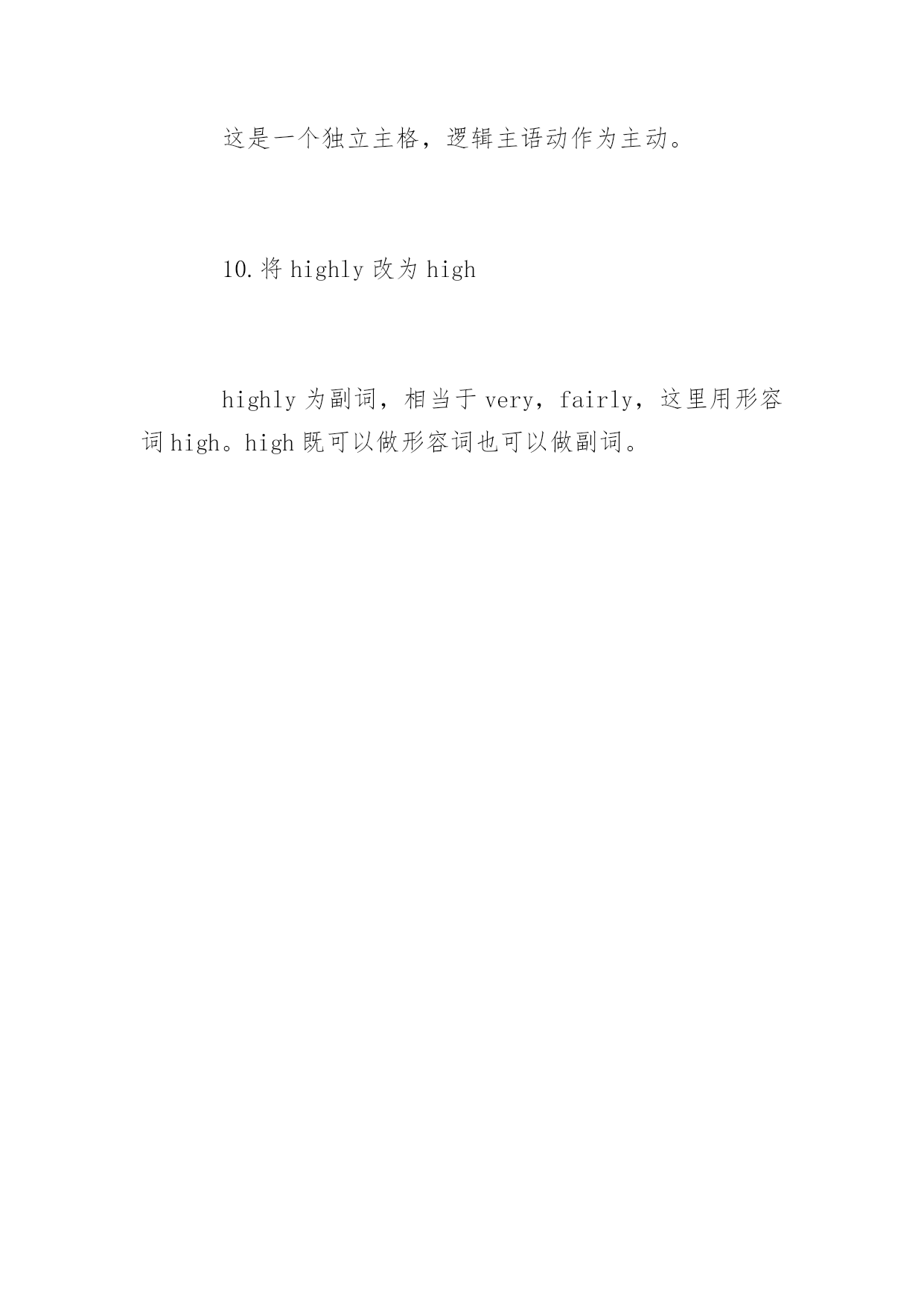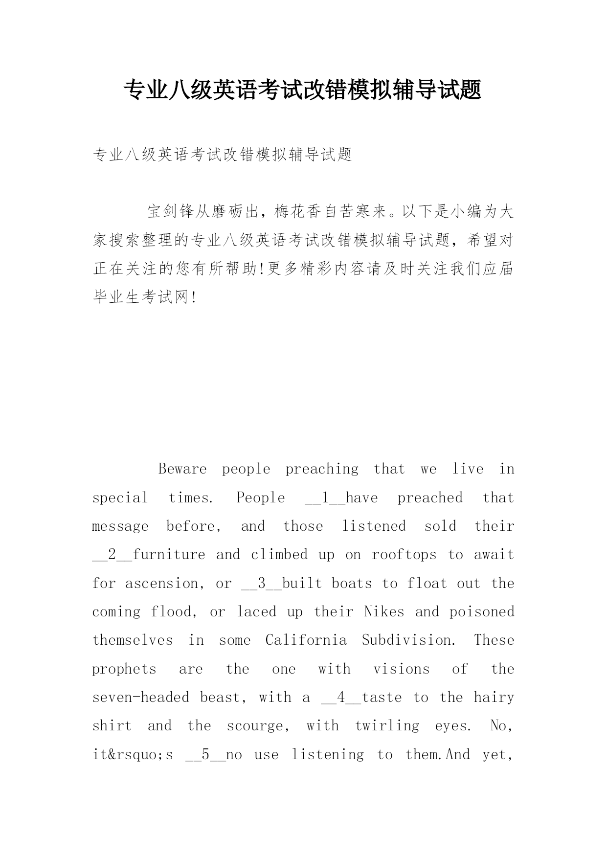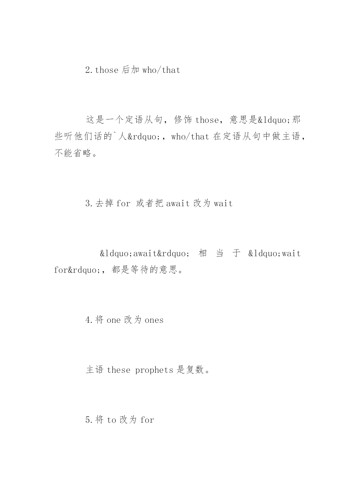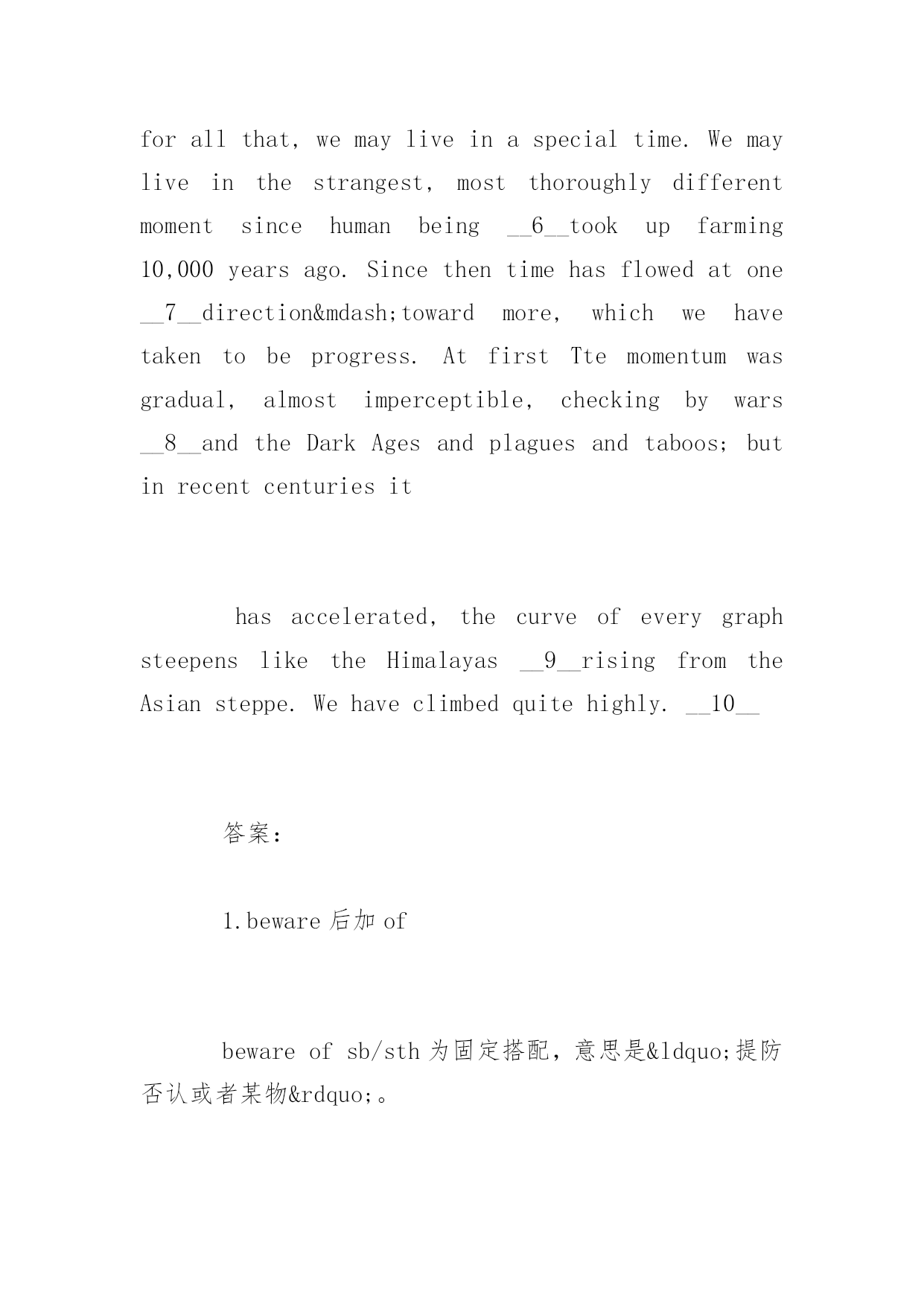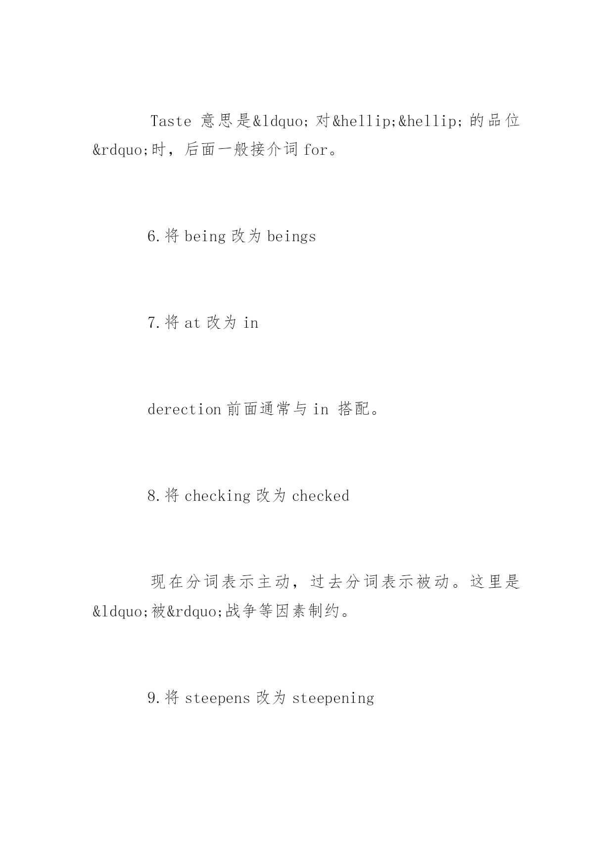 专业八级英语考试改错模拟辅导试题 专业八级英语考试改错模拟辅导试题 宝剑锋从磨砺出,梅花香自苦寒来。以下是小编为大家搜索整理的专业八级英语考试改错模拟辅导试题,希望对正在关注的您有所帮助!更多精彩内容请及时关注我们应届毕业生考试网! Bewarepeoplepreachingthatweliveinspecialtimes.People__1__havepreachedthatmessagebefore,andthoselistenedsoldtheir__2__furnitureandclimbeduponrooftopstoawaitforascension,or__3__builtboatstofloatoutthecomingflood,orlaceduptheirNikesandpoisonedthemselvesinsomeCaliforniaSubdivision.Theseprophetsaretheonewithvisionsoftheseven-headedbeast,witha__4__tastetothehairyshirtandthescourge,withtwirlingeyes.No,it’s__5__nouselisteningtothem.Andyet,forallthat,wemayliveinaspecialtime.Wemayliveinthestrangest,mostthoroughlydifferentmomentsincehumanbeing__6__tookupfarming10,000yearsago.Sincethentimehasflowedatone__7__direction—towardmore,whichwehavetakentobeprogress.AtfirstTtemomentumwasgradual,almostimperceptible,checkingbywars__8__andtheDarkAgesandplaguesandtaboos;butinrecentcenturiesit hasaccelerated,thecurveofeverygraphsteepensliketheHimalayas__9__risingfromtheAsiansteppe.Wehaveclimbedquitehighly.__10__ 答案: 1.beware后加of bewareofsb/sth为固定搭配,意思是“提防否认或者某物”。 2.those后加who/that 这是一个定语从句,修饰those,意思是“那些听他们话的`人”,who/that在定语从句中做主语,不能省略。 3.去掉for或者把await改为wait “await”相当于“waitfor”,都是等待的意思。 4.将one改为ones 主语theseprophets是复数。 5.将to改为for Taste意思是“对……的品位”时,后面一般接介词for。 6.将being改为beings 7.将at改为in derection前面通常与in搭配。 8.将checking改为checked 现在分词表示主动,过去分词表示被动。这里是“被”战争等因素制约。 9.将steepens改为steepening 这是一个独立主格,逻辑主语动作为主动。 10.将highly改为high highly为副词,相当于very,fairly,这里用形容词high。high既可以做形容词也可以做副词。
