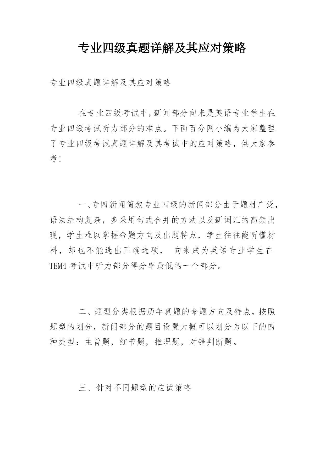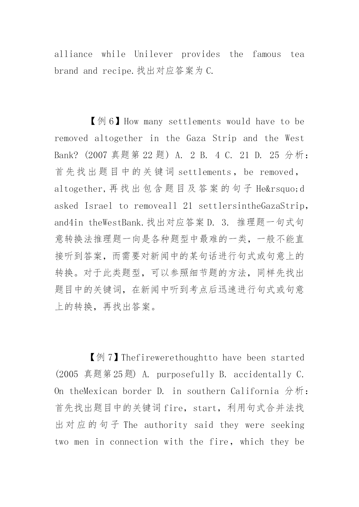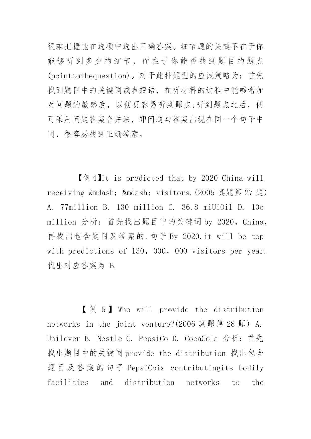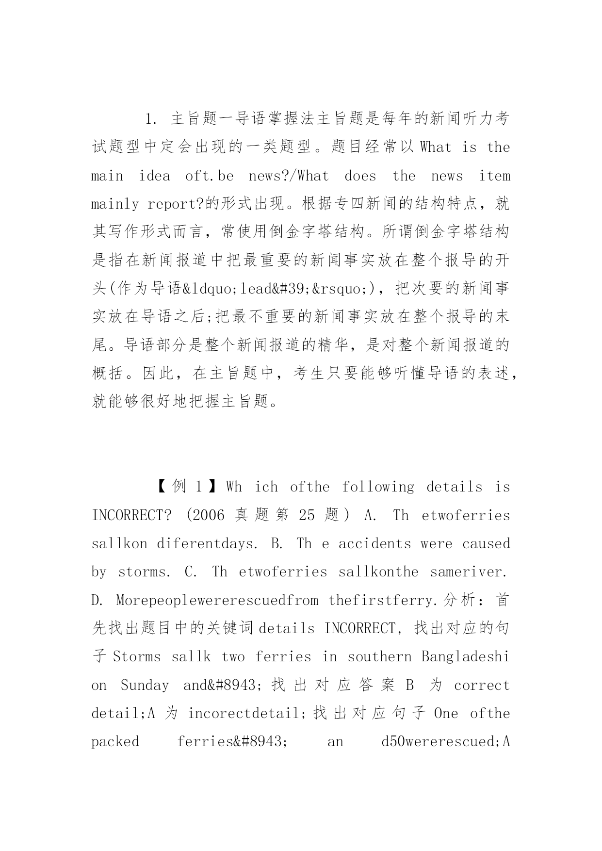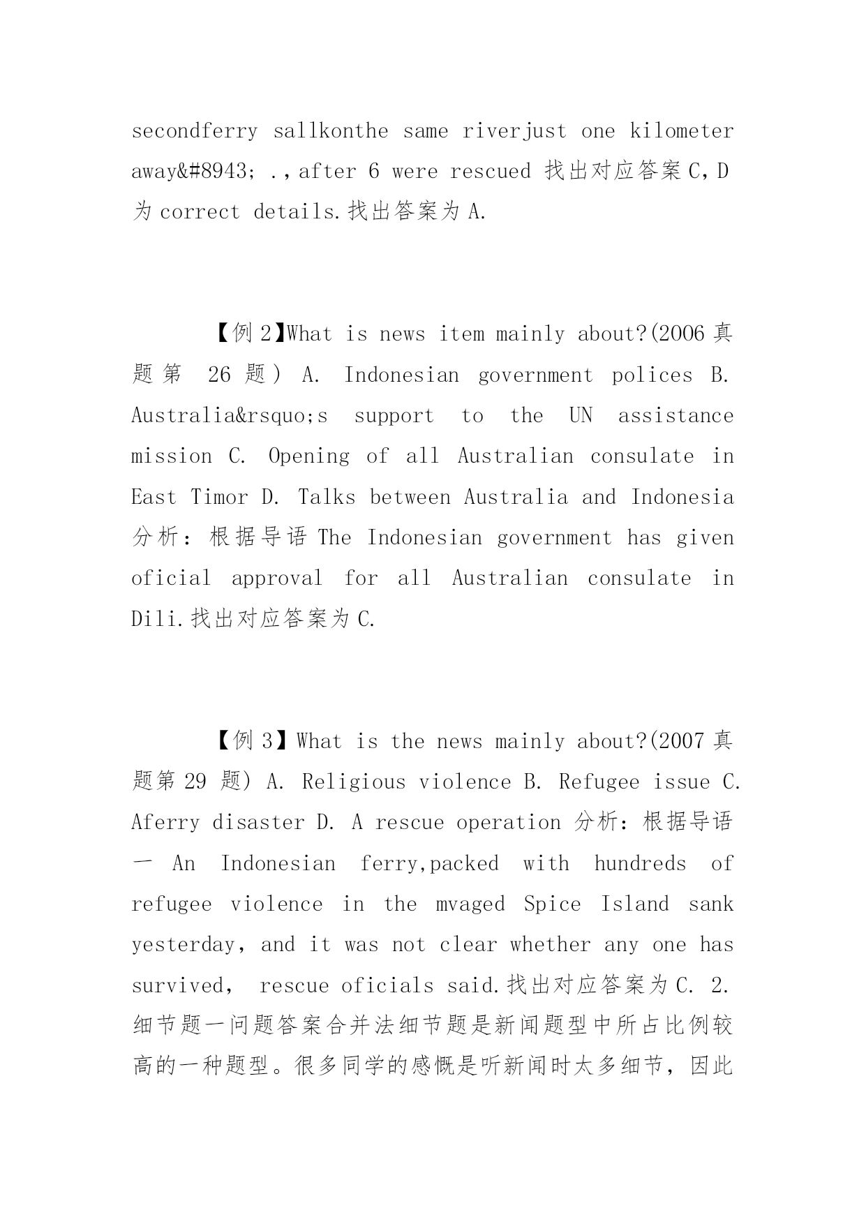 专业四级真题详解及其应对策略 专业四级真题详解及其应对策略 在专业四级考试中,新闻部分向来是英语专业学生在专业四级考试听力部分的难点。下面百分网小编为大家整理了专业四级考试真题详解及其考试中的应对策略,供大家参考! 一、专四新闻简叙专业四级的新闻部分由于题材广泛,语法结构复杂,多采用句式合并的方法以及新词汇的高频出现,学生难以掌握命题方向及出题特点,学生往往能听懂材料,却也不能选出正确选项,向来成为英语专业学生在TEM4考试中听力部分得分率最低的一个部分。 二、题型分类根据历年真题的命题方向及特点,按照题型的划分,新闻部分的题目设置大概可以划分为以下的四种类型:主旨题,细节题,推理题,对错判断题。 三、针对不同题型的应试策略 1.主旨题一导语掌握法主旨题是每年的新闻听力考试题型中定会出现的一类题型。题目经常以Whatisthemainideaoft.benews?/Whatdoesthenewsitemmainlyreport?的形式出现。根据专四新闻的结构特点,就其写作形式而言,常使用倒金字塔结构。所谓倒金字塔结构是指在新闻报道中把最重要的新闻事实放在整个报导的开头(作为导语“lead'’),把次要的新闻事实放在导语之后;把最不重要的新闻事实放在整个报导的末尾。导语部分是整个新闻报道的精华,是对整个新闻报道的概括。因此,在主旨题中,考生只要能够听懂导语的表述,就能够很好地把握主旨题。 【例1】WhichofthefollowingdetailsisINCORRECT?(2006真题第25题)A.Thetwoferriessallkondiferentdays.B.Theaccidentswerecausedbystorms.C.Thetwoferriessallkonthesameriver.D.Morepeoplewererescuedfromthefirstferry.分析:首先找出题目中的关键词detailsINCORRECT,找出对应的句子StormssallktwoferriesinsouthernBangladeshionSundayand⋯找出对应答案B为correctdetail;A为incorectdetail;找出对应句子Oneofthepackedferries⋯and50wererescued;Asecondferrysallkonthesameriverjustonekilometeraway⋯.,after6wererescued找出对应答案C,D为correctdetails.找出答案为A. 【例2】Whatisnewsitemmainlyabout?(2OO6真题第26题)A.IndonesiangovernmentpolicesB.Australia’ssupporttotheUNassistancemissionC.OpeningofallAustralianconsulateinEastTimorD.TalksbetweenAustraliaandIndonesia分析:根据导语TheIndonesiangovernmenthasgivenoficialapprovalforallAustralianconsulateinDili.找出对应答案为C. 【例3】Whatisthenewsmainlyabout?(2007真题第29题)A.ReligiousviolenceB.RefugeeissueC.AferrydisasterD.Arescueoperation分析:根据导语一AnIndonesianferry,packedwithhundredsofrefugeeviolenceinthemvagedSpiceIslandsankyesterday,anditwasnotclearwhetheranyonehassurvived,rescueoficialssaid.找出对应答案为C.2.细节题一问题答案合并法细节题是新闻题型中所占比例较高的一种题型。很多同学的感慨是听新闻时太多细节,因此很难把握能在选项中选出正确答案。细节题的关键不在于你能够听到多少的细节,而在于你能否找到题目的题点(pointtothequestion)。对于此种题型的应试策略为:首先找到题目中的关键词或者短语,在听材料的过程中能够增加对问题的敏感度,以便更容易听到题点;听到题点之后,便可采用问题答案合并法,即问题与答案出现在同一个句子中间,很容易找到正确答案。 【例4】Itispredictedthatby2020Chinawillreceiving——visitors.(2005真题第27题)A.77mi