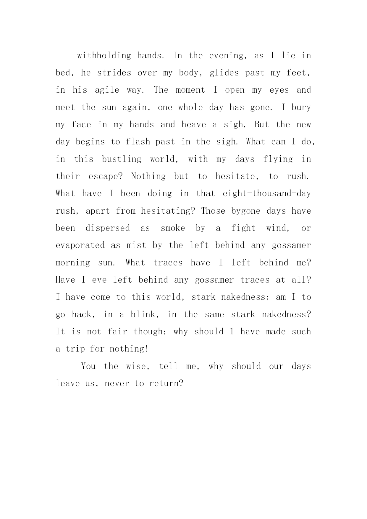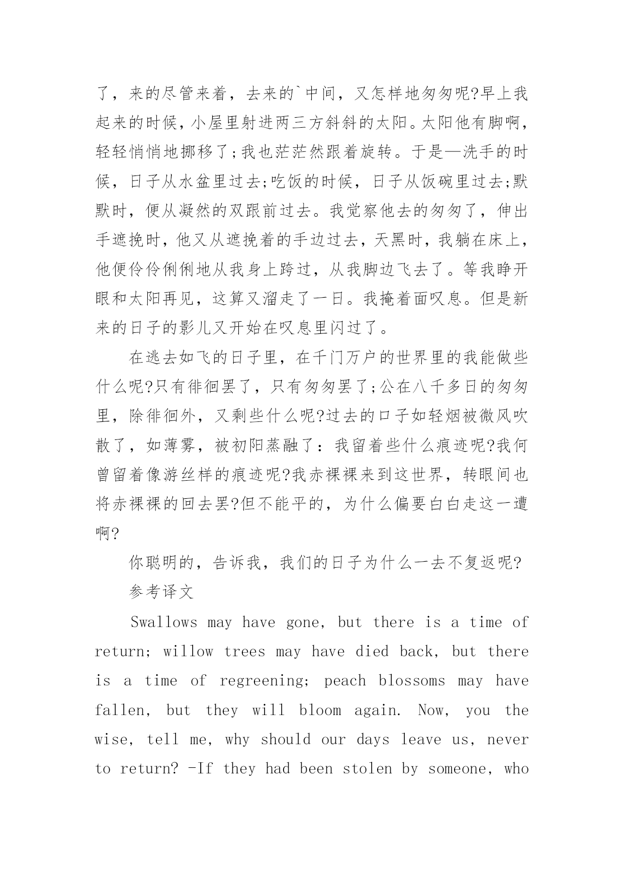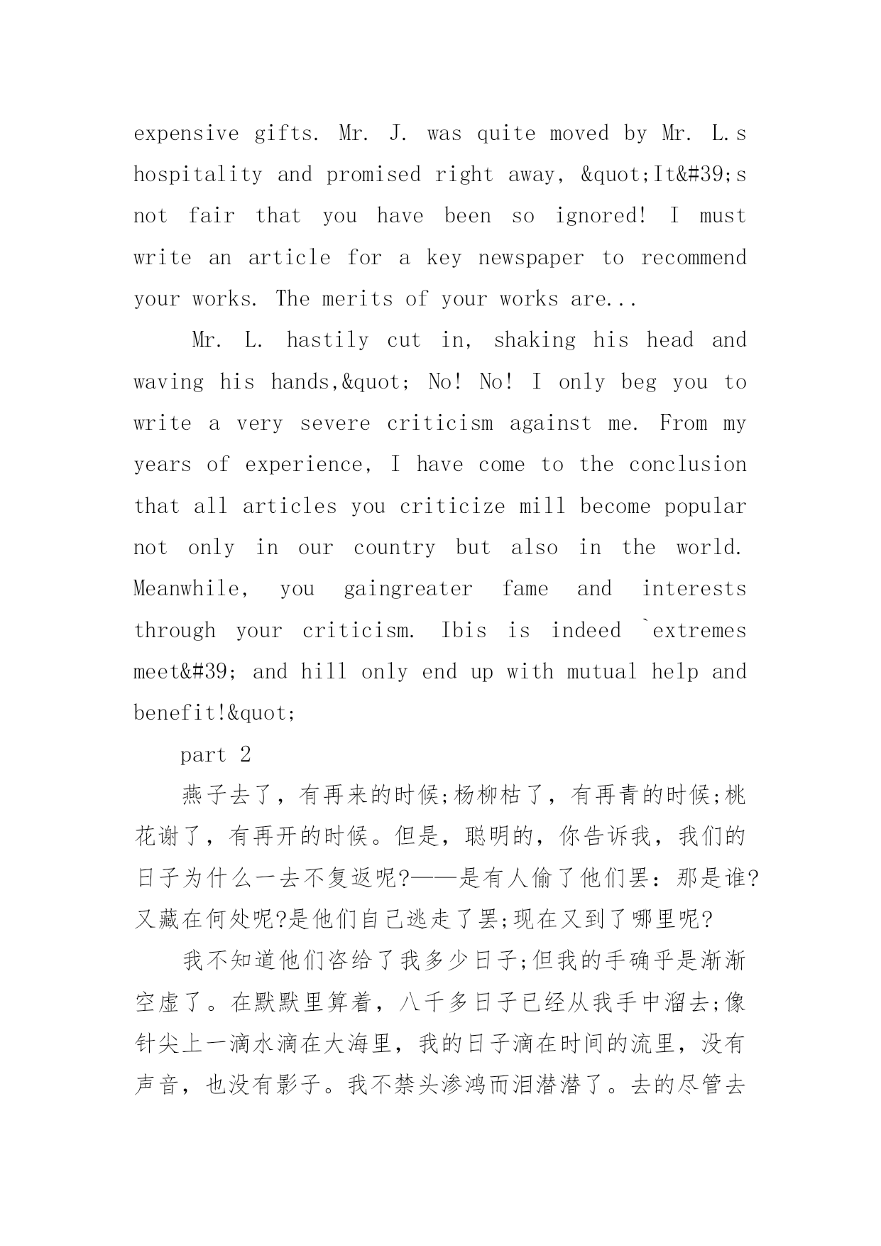 专业英语八级考试翻译复习题 专业英语八级考试翻译复习题Acleanhandwantsnowashing.以下是小编为大家搜索整理的专业英语八级考试翻译复习题,希望能给大家带来帮助!更多精彩内容请及时关注我们应届毕业生考试网!part1L君跻身文坛,盖有年矣,但总是红不起来,颇感寂寞。于是,他找到了各种关系,以盛宴重礼把著名的评论家J君招待了一次。J君有感于其情之盛,慨然允诺说:“现在他们对你太冷落了,就是不公平!我一定要写一篇推荐你的作品的文章,登到大报上,你的作品的优点是……”L君不等I君说完,慌忙摆手摇头,他说:“千万不必!千万不必!我只乞求您写一篇义正词严的文章把我批一个狗血淋头!积数十年之经验,我深知凡被您批了的,都可以风行全国,名震环球!而您也可以获得另一方面的美誉和利益,那才叫相反相成,相得益彰。参考译文Mr.L.hadbeenamemberoftheliterarycirclesforyearswithoutattractinganypublicattention.Hefeltratherdeserted,andsohemanagedthroughvariouspersonalconnectionstoinviteMr.J.,afamousliterarycritic,toanelaboratedinnerbesidespresentinghimwithexpensivegifts.Mr.J.wasquitemovedbyMr.L.shospitalityandpromisedrightaway,"It'snotfairthatyouhavebeensoignored!Imustwriteanarticleforakeynewspapertorecommendyourworks.Themeritsofyourworksare...Mr.L.hastilycutin,shakinghisheadandwavinghishands,"No!No!Ionlybegyoutowriteaveryseverecriticismagainstme.Frommyyearsofexperience,Ihavecometotheconclusionthatallarticlesyoucriticizemillbecomepopularnotonlyinourcountrybutalsointheworld.Meanwhile,yougaingreaterfameandintereststhroughyourcriticism.Ibisisindeed`extremesmeet'andhillonlyendupwithmutualhelpandbenefit!"part2燕子去了,有再来的时候;杨柳枯了,有再青的时候;桃花谢了,有再开的时候。但是,聪明的,你告诉我,我们的日子为什么一去不复返呢?——是有人偷了他们罢:那是谁?又藏在何处呢?是他们自己逃走了罢;现在又到了哪里呢?我不知道他们咨给了我多少日子;但我的手确乎是渐渐空虚了。在默默里算着,八千多日子已经从我手中溜去;像针尖上一滴水滴在大海里,我的日子滴在时间的流里,没有声音,也没有影子。我不禁头渗鸿而泪潜潜了。去的尽管去了,来的尽管来着,去来的`中间,又怎样地匆匆呢?早上我起来的时候,小屋里射进两三方斜斜的太阳。太阳他有脚啊,轻轻悄悄地挪移了;我也茫茫然跟着旋转。于是—洗手的时候,日子从水盆里过去;吃饭的时候,日子从饭碗里过去;默默时,便从凝然的双跟前过去。我觉察他去的匆匆了,伸出手遮挽时,他又从遮挽着的手边过去,天黑时,我躺在床上,他便伶伶俐俐地从我身上跨过,从我脚边飞去了。等我睁开眼和太阳再见,这算又溜走了一日。我掩着面叹息。但是新来的日子的影儿又开始在叹息里闪过了。在逃去如飞的日子里,在千门万户的世界里的我能做些什么呢?只有徘徊罢了,只有匆匆罢了;公在八千多日的匆匆里,除徘徊外,又剩些什么呢?过去的口子如轻烟被微风吹散了,如薄雾,被初阳蒸融了:我留着些什么痕迹呢?我何曾留着像游丝样的痕迹呢?我赤裸裸来到这世界,转眼间也将赤裸裸的回去罢?但不能平的,为什么偏要白白走这一遭啊?你聪明的,告诉我,我们的日子为什么一去不复返呢?参考译文Swallowsmayhavegone,butthereisatimeofreturn;willowtreesmayhavediedback,butthereisatimeofregreening;peachblossomsmayhavefallen,buttheywillbloomagain.Now,youthewise,tellme,whyshouldourdaysleaveus,nevertor