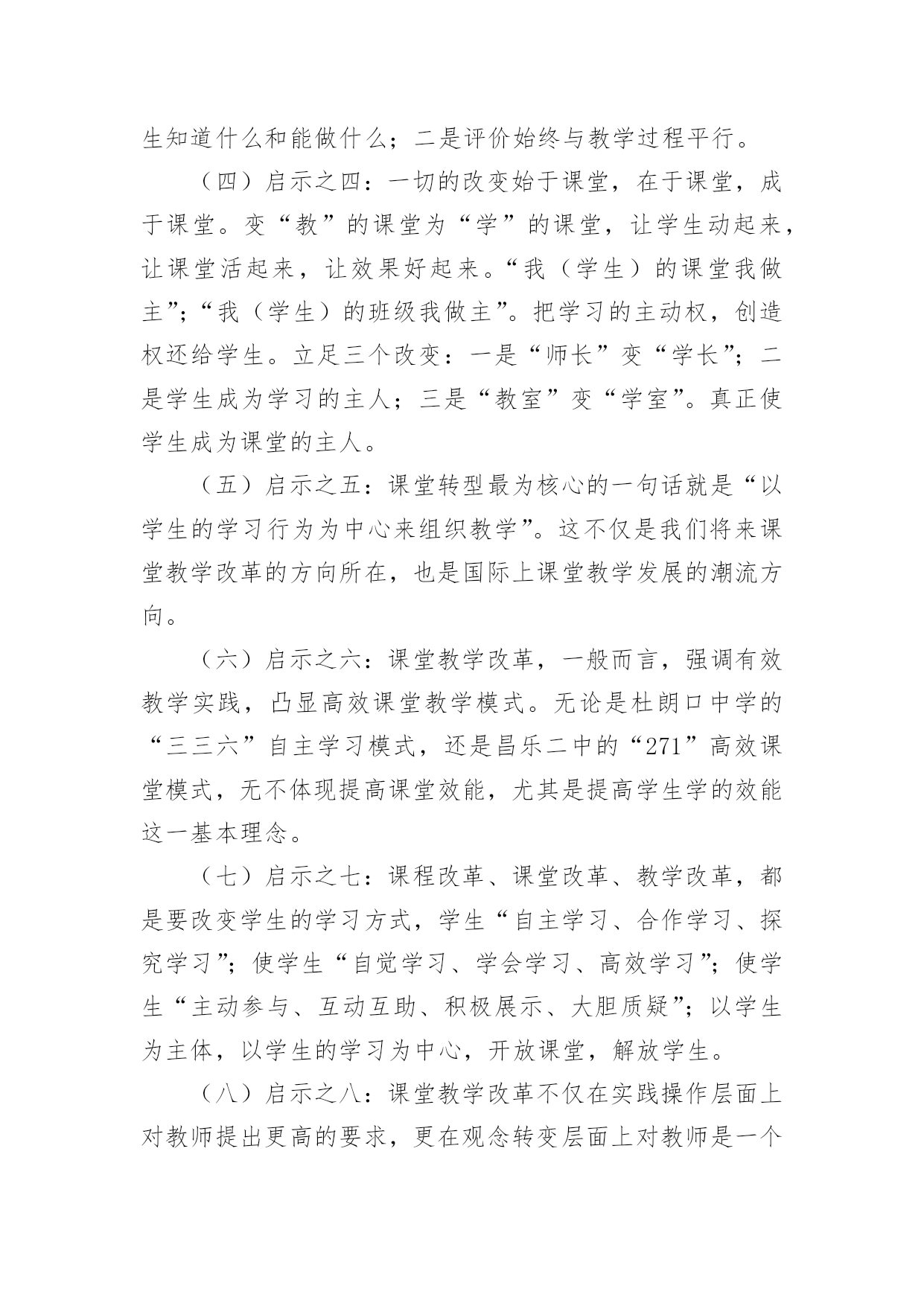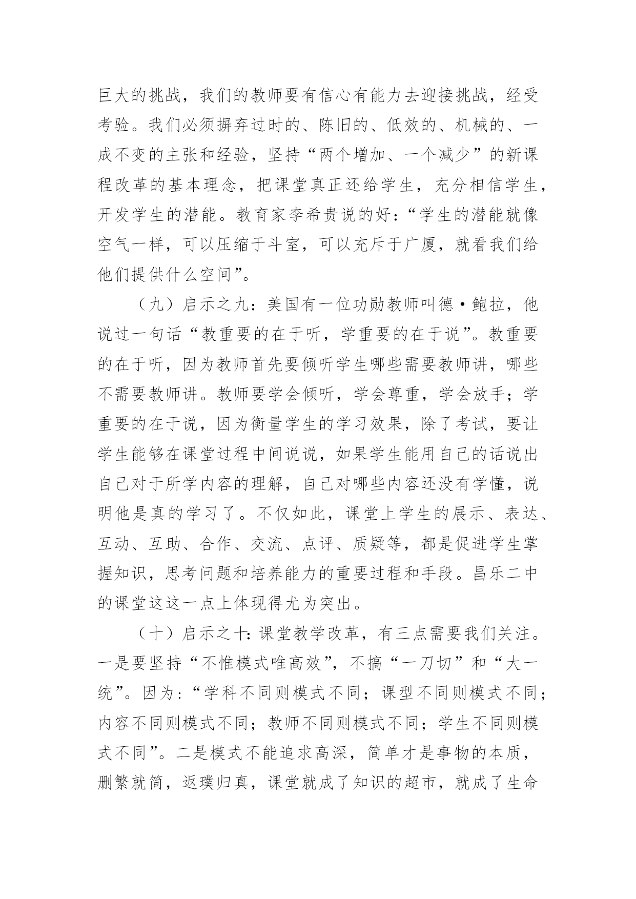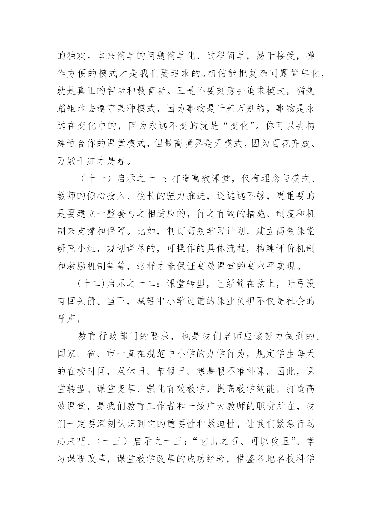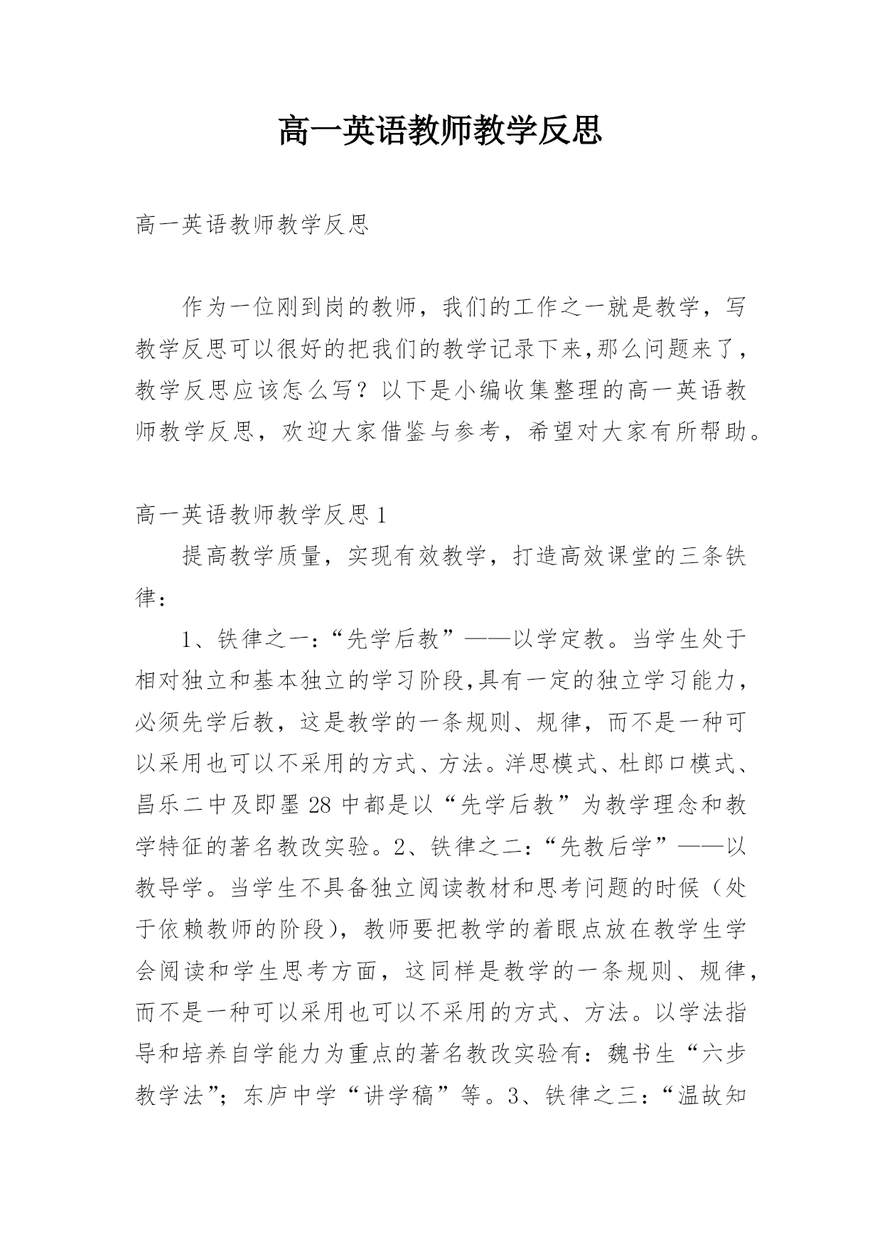 高一英语教师教学反思 高一英语教师教学反思作为一位刚到岗的教师,我们的工作之一就是教学,写教学反思可以很好的把我们的教学记录下来,那么问题来了,教学反思应该怎么写?以下是小编收集整理的高一英语教师教学反思,欢迎大家借鉴与参考,希望对大家有所帮助。高一英语教师教学反思1提高教学质量,实现有效教学,打造高效课堂的三条铁律:1、铁律之一:“先学后教”——以学定教。当学生处于相对独立和基本独立的学习阶段,具有一定的独立学习能力,必须先学后教,这是教学的一条规则、规律,而不是一种可以采用也可以不采用的方式、方法。洋思模式、杜郎口模式、昌乐二中及即墨28中都是以“先学后教”为教学理念和教学特征的著名教改实验。2、铁律之二:“先教后学”——以教导学。当学生不具备独立阅读教材和思考问题的时候(处于依赖教师的阶段),教师要把教学的着眼点放在教学生学会阅读和学生思考方面,这同样是教学的一条规则、规律,而不是一种可以采用也可以不采用的方式、方法。以学法指导和培养自学能力为重点的著名教改实验有:魏书生“六步教学法”;东庐中学“讲学稿”等。3、铁律之三:“温故知新”——学会了才有兴趣。一切教学都必须从学生实际出发(根据学生的原有知识状况进行教学),这也是教学的一条规则、规律,而不是教学的一种方式、方法。“根据学生的原有知识状况进行学习”,这是教育心理学对教学理论和教学实践最伟大的贡献。它是对建构主义学习观的通俗易懂的诠释,因为,惟有如此,才能实现学生的有意义学习。温故知新的本质是化难为易,由于变容易了,学生就能学会,而学会了,学生便容易激发学习的兴趣和信心,这样学习就能进入良性循环的机制;学会——兴趣——愿学——学会……。相反,如果学生读不懂,学不会,就会越来越没有兴趣,这样学习就进入了恶性循环:学不会——没兴趣——不愿学——学不会……。美国布卢姆的“掌握学习”和上海闸北第八中学的成功教育(学)是这条铁律在教学实践中的创举。高效课堂教学模式启示:(一)启示之一:未来的课堂教学,无论是在教育观念上,还是教学结构上,都将朝着以学生的学习为中心这一核心内容发生转型,也就是“以学定教”。(二)启示之二:回顾以往的课堂教学改革,改来改去,说到底都离不开下面两条。要么是鼓励学生自觉学习,要么是探索班级体制下不同类型学生如何区别对待。凡是在这两点上取得一些经验的'课堂改革,往往都是比较成功的。(三)启示之三:现在课堂教学改革的方向。一是课堂教学开始于学生的独立学习和预学准备,开始于老师了解学生知道什么和能做什么;二是评价始终与教学过程平行。(四)启示之四:一切的改变始于课堂,在于课堂,成于课堂。变“教”的课堂为“学”的课堂,让学生动起来,让课堂活起来,让效果好起来。“我(学生)的课堂我做主”;“我(学生)的班级我做主”。把学习的主动权,创造权还给学生。立足三个改变:一是“师长”变“学长”;二是学生成为学习的主人;三是“教室”变“学室”。真正使学生成为课堂的主人。(五)启示之五:课堂转型最为核心的一句话就是“以学生的学习行为为中心来组织教学”。这不仅是我们将来课堂教学改革的方向所在,也是国际上课堂教学发展的潮流方向。(六)启示之六:课堂教学改革,一般而言,强调有效教学实践,凸显高效课堂教学模式。无论是杜朗口中学的“三三六”自主学习模式,还是昌乐二中的“271”高效课堂模式,无不体现提高课堂效能,尤其是提高学生学的效能这一基本理念。(七)启示之七:课程改革、课堂改革、教学改革,都是要改变学生的学习方式,学生“自主学习、合作学习、探究学习”;使学生“自觉学习、学会学习、高效学习”;使学生“主动参与、互动互助、积极展示、大胆质疑”;以学生为主体,以学生的学习为中心,开放课堂,解放学生。(八)启示之八:课堂教学改革不仅在实践操作层面上对教师提出更高的要求,更在观念转变层面上对教师是一个巨大的挑战,我们的教师要有信心有能力去迎接挑战,经受考验。我们必须摒弃过时的、陈旧的、低效的、机械的、一成不变的主张和经验,坚持“两个增加、一个减少”的新课程改革的基本理念,把课堂真正还给学生,充分相信学生,开发学生的潜能。教育家李希贵说的好:“学生的潜能就像空气一样,可以压缩于斗室,可以充斥于广厦,就看我们给他们提供什么空间”。(九)启示之九:美国有一位功勋教师叫德·鲍拉,他说过一句话“教重要的在于听,学重要的在于说”。教重要的在于听,因为教师首先要倾听学生哪些需要教师讲,哪些不需要教师讲。教师要学会倾听,学会尊重,学会放手;学重要的在于说,因为衡量学生的学习效果,除了考试,要让学生能够在课堂过程中间说说,如果学生能用自己的话说出自己对于所学内容的理解,自己对哪些内容还没有学懂,说明他是真的学习了。不仅如此,课堂上学生的展示、表达、互动、互助、合作、交流、点评、质疑等,都是促进学生掌握知识,