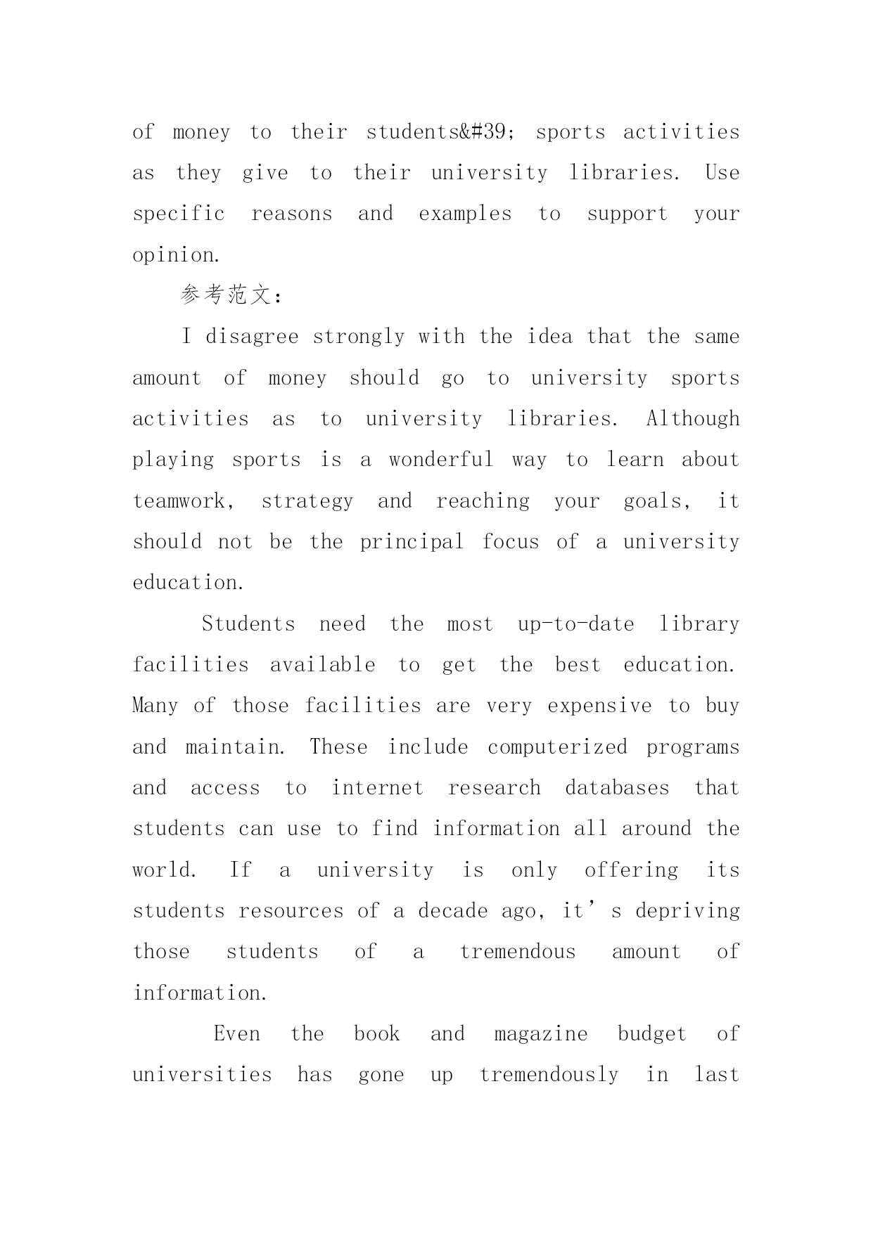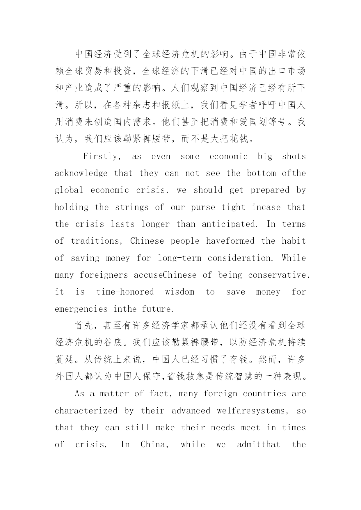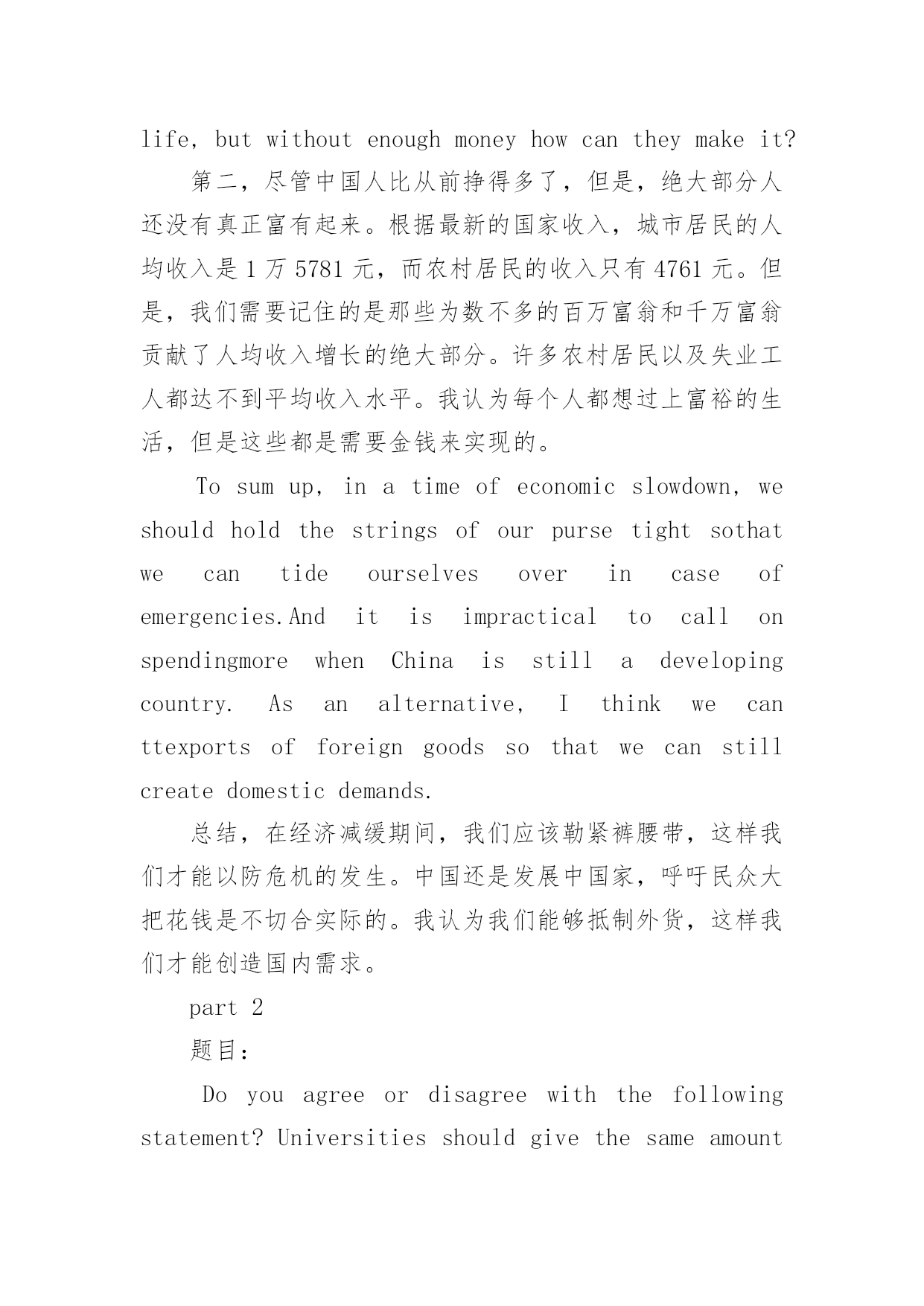 专业英语八级考试作文备考练习 专业英语八级考试作文备考范文练习Heisnotfittocommandothersthatcannotcommandhimself.以下是小编为大家搜索整理的专业英语八级考试作文备考范文练习,希望能给大家带来帮助!更多精彩内容请及时关注我们应届毕业生考试网!part1专八题目:TightPurseStringsorSpendMore?专八范文:China’seconomyisnotimmunetotheinfluenceoftheglobaleconomiccrisis.AsChina’seconomyisheavilydependentonglobaltradeandinvestmentflows,theglobaleconomicslowdownhasalreadyhadanegativeimpactonChina’sexportsectorandindustries.Therearesomeobservationsthatoureconomyisalreadyslowingdown.Inresponse,manyscholarscallonChinesepeopletospendmoremoneytocreatedomesticdemandsinvariousmagazinesandnewspapers.Theyevenequalconsumptionwithbeingpatriotic.Inmypointofview,weshouldholdthestringsofpursetight,insteadofspendingmore.中国经济受到了全球经济危机的影响。由于中国非常依赖全球贸易和投资,全球经济的下滑已经对中国的出口市场和产业造成了严重的影响。人们观察到中国经济已经有所下滑。所以,在各种杂志和报纸上,我们看见学者呼吁中国人用消费来创造国内需求。他们甚至把消费和爱国划等号。我认为,我们应该勒紧裤腰带,而不是大把花钱。Firstly,asevensomeeconomicbigshotsacknowledgethattheycannotseethebottomoftheglobaleconomiccrisis,weshouldgetpreparedbyholdingthestringsofourpursetightincasethatthecrisislastslongerthananticipated.Intermsoftraditions,Chinesepeoplehaveformedthehabitofsavingmoneyforlong-termconsideration.WhilemanyforeignersaccuseChineseofbeingconservative,itistime-honoredwisdomtosavemoneyforemergenciesinthefuture.首先,甚至有许多经济学家都承认他们还没有看到全球经济危机的谷底。我们应该勒紧裤腰带,以防经济危机持续蔓延。从传统上来说,中国人已经习惯了存钱。然而,许多外国人都认为中国人保守,省钱救急是传统智慧的一种表现。Asamatteroffact,manyforeigncountriesarecharacterizedbytheiradvancedwelfaresystems,sothattheycanstillmaketheirneedsmeetintimesofcrisis.InChina,whileweadmitthatthegovernmenthasmadeprogressintheestablishmentofsocialsecuritysystems,therearestillmanymembersofoursocietythatarenotincludedinsocialsecuritysystems.Therefore,itisimpracticaltocallonthoseexcludedmembersofthesocialsecuritysystemstospendmoremoney.事实上,国外许多国家都有着先进的'福利系统,所以,遇到危机时,国家依然能够满足民众的需求。在中国,国家在制定社会保障制度方面取得了巨大的成功,但是,许多民众还没有列入到社会保障制度之中。所以,让这些民众花钱是不现实的。Secondly,thoughChinesepeopleearnmoremoneythanbeforeintheaggregate,themajorityofusstilldonotamassenoughwealthtoliveaguaranteedlife.Accordingtothe