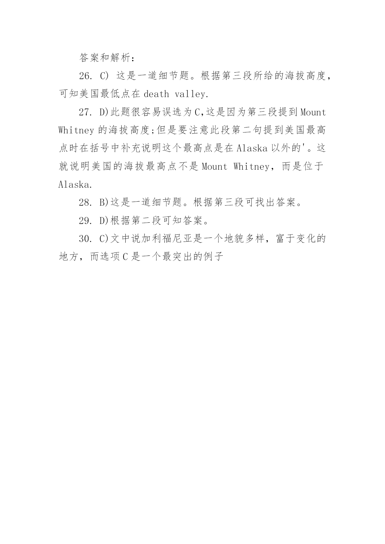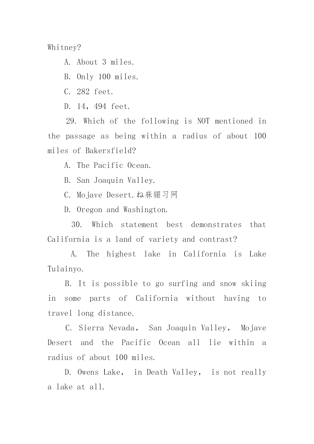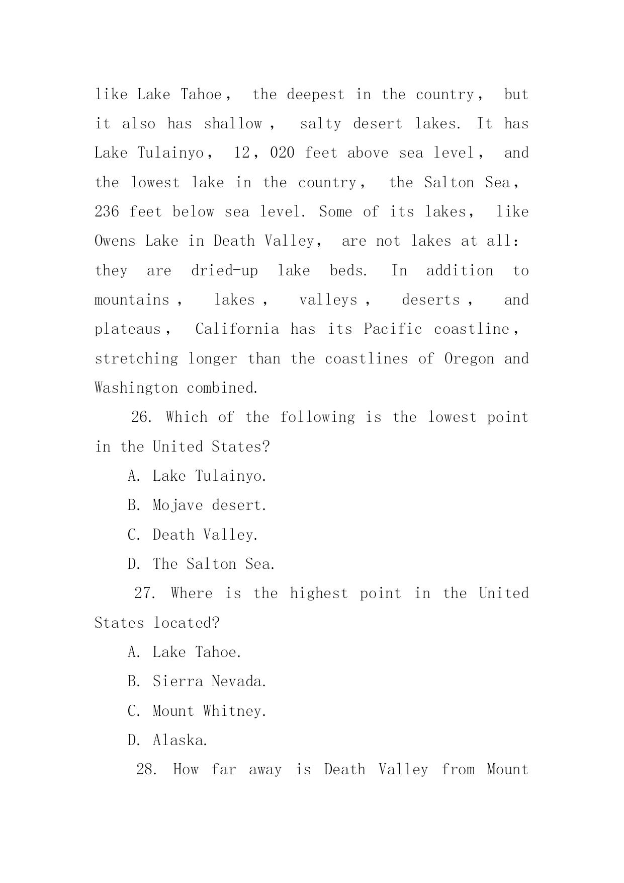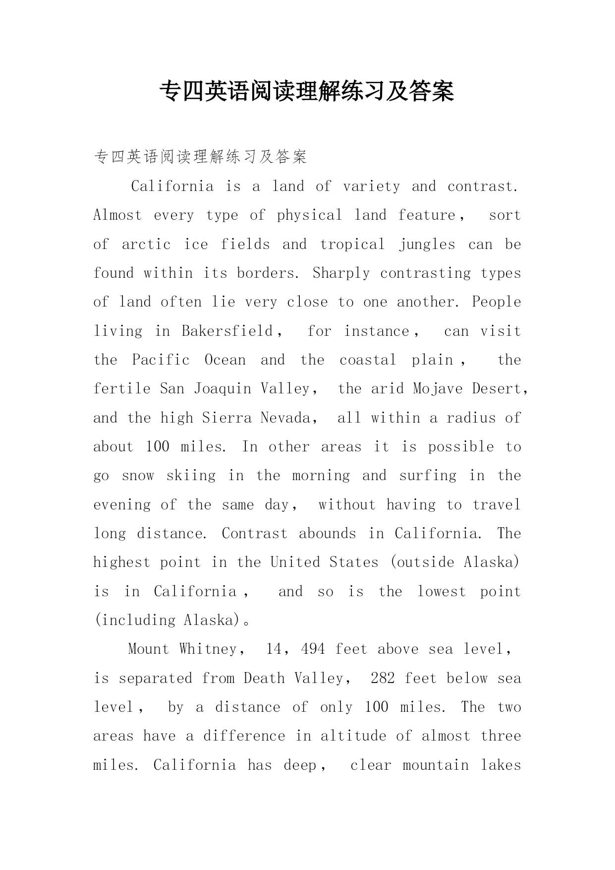 专四英语阅读理解练习及答案 专四英语阅读理解练习及答案Californiaisalandofvarietyandcontrast.Almosteverytypeofphysicallandfeature,sortofarcticicefieldsandtropicaljunglescanbefoundwithinitsborders.Sharplycontrastingtypesoflandoftenlieveryclosetooneanother.PeoplelivinginBakersfield,forinstance,canvisitthePacificOceanandthecoastalplain,thefertileSanJoaquinValley,thearidMojaveDesert,andthehighSierraNevada,allwithinaradiusofabout100miles.Inotherareasitispossibletogosnowskiinginthemorningandsurfingintheeveningofthesameday,withouthavingtotravellongdistance.ContrastaboundsinCalifornia.ThehighestpointintheUnitedStates(outsideAlaska)isinCalifornia,andsoisthelowestpoint(includingAlaska)。MountWhitney,14,494feetabovesealevel,isseparatedfromDeathValley,282feetbelowsealevel,byadistanceofonly100miles.Thetwoareashaveadifferenceinaltitudeofalmostthreemiles.Californiahasdeep,clearmountainlakeslikeLakeTahoe,thedeepestinthecountry,butitalsohasshallow,saltydesertlakes.IthasLakeTulainyo,12,020feetabovesealevel,andthelowestlakeinthecountry,theSaltonSea,236feetbelowsealevel.Someofitslakes,likeOwensLakeinDeathValley,arenotlakesatall:theyaredried-uplakebeds.Inadditiontomountains,lakes,valleys,deserts,andplateaus,CaliforniahasitsPacificcoastline,stretchinglongerthanthecoastlinesofOregonandWashingtoncombined.26.WhichofthefollowingisthelowestpointintheUnitedStates?A.LakeTulainyo.B.Mojavedesert.C.DeathValley.D.TheSaltonSea.27.WhereisthehighestpointintheUnitedStateslocated?A.LakeTahoe.B.SierraNevada.C.MountWhitney.D.Alaska.28.HowfarawayisDeathValleyfromMountWhitney?A.About3miles.B.Only100miles.C.282feet.D.14,494feet.29.WhichofthefollowingisNOTmentionedinthepassageasbeingwithinaradiusofabout100milesofBakersfield?A.ThePacificOcean.B.SanJoaquinValley.C.MojaveDesert.ね庥镅习网D.OregonandWashington.30.WhichstatementbestdemonstratesthatCaliforniaisalandofvarietyandcontrast?A.ThehighestlakeinCaliforniaisLakeTulainyo.B.ItispossibletogosurfingandsnowskiinginsomepartsofCaliforniawithouthavingtotravellongdistance.C.SierraNevada,SanJoaquinV