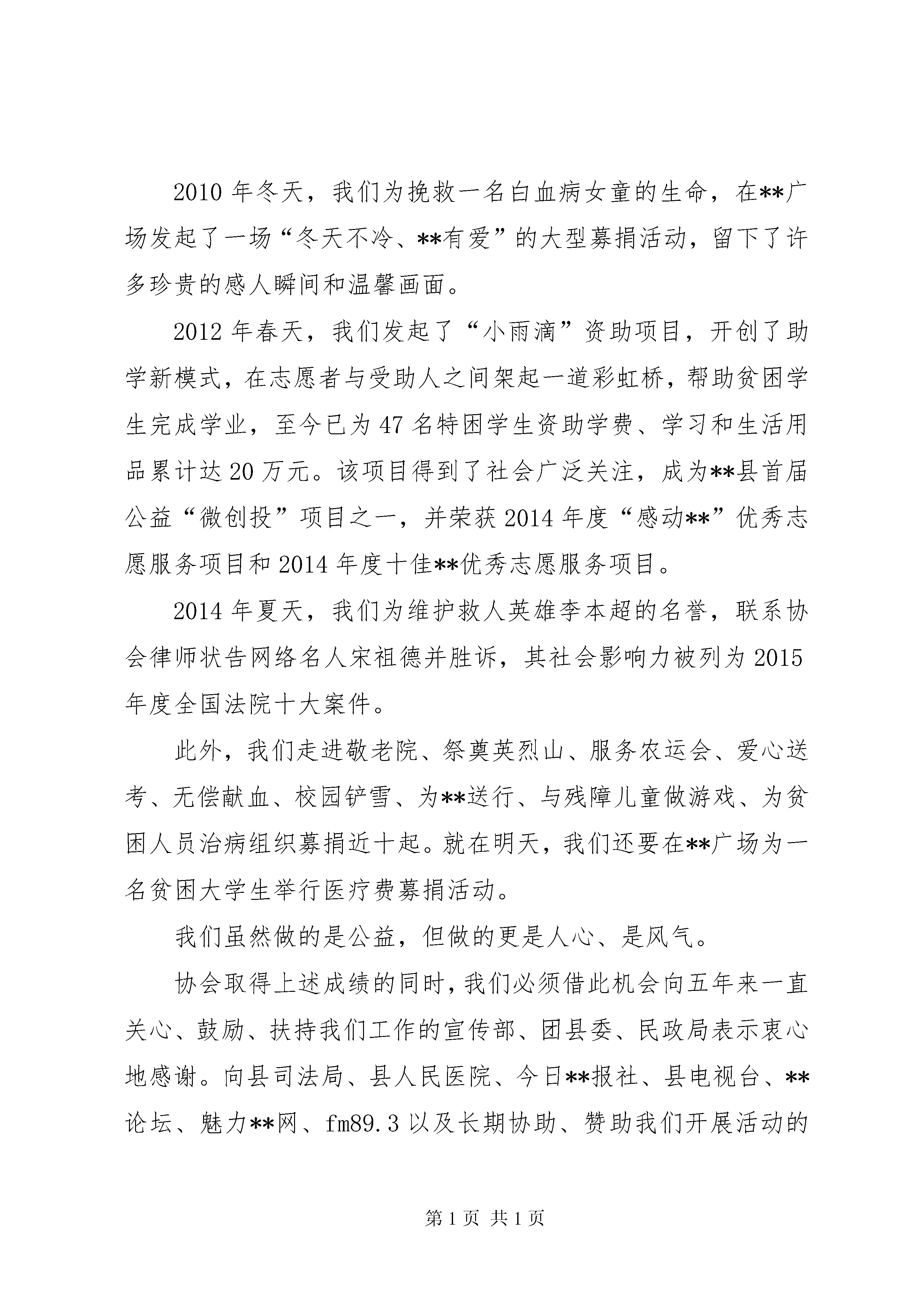 县优秀公益组织表彰大会发言大家好。我代表协会向各位领导和兄弟单位汇报协会工作。**县竹乡志愿者协会是在团县委的指导下,由热爱**公益事业的社会各界人士自愿组成的民间志愿组织,成立于2010年11月22日,现有注册会员374人,下设助学、环保、敬老、法援等七个分会,自2011开始,已连续五年均被评为“XX市青年志愿者行动先进集体”。我们协会的特色可以用两个关键词来概括。一、包容协会从成立之初的3个发起人发展到今天近400人的规模,与我们的发展理念息息相关,我们认为,凡是自愿奉献爱心、自愿参加公益活动的,不分男女老幼、不分职业贫富、不分县内县外,都可以加入我们创建的公益服务平台,在存在金钱至上、利益至上的不良社会风气之下,我们的会员以自身的公益行动影响身边的人,让爱心得以发扬、让美德得以光大,越来越多的打工者、教师、护士、个体老板、公务员受到感染,选择我们,加入我们,如此成就了我们协会今天的规模。二、积极作为民间志愿者团体,如何开展公益活动。我们认为,凡是法律不禁止的,都可以开展,协会的生命在于活动,活动的开展在于积极。2010年冬天,我们为挽救一名白血病女童的生命,在**广场发起了一场“冬天不冷、**有爱”的大型募捐活动,留下了许多珍贵的感人瞬间和温馨画面。2012年春天,我们发起了“小雨滴”资助项目,开创了助学新模式,在志愿者与受助人之间架起一道彩虹桥,帮助贫困学生完成学业,至今已为47名特困学生资助学费、学习和生活用品累计达20万元。该项目得到了社会广泛关注,成为**县首届公益“微创投”项目之一,并荣获2014年度“感动**”优秀志愿服务项目和2014年度十佳**优秀志愿服务项目。2014年夏天,我们为维护救人英雄李本超的名誉,联系协会律师状告网络名人宋祖德并胜诉,其社会影响力被列为2015年度全国法院十大案件。此外,我们走进敬老院、祭奠英烈山、服务农运会、爱心送考、无偿献血、校园铲雪、为**送行、与残障儿童做游戏、为贫困人员治病组织募捐近十起。就在明天,我们还要在**广场为一名贫困大学生举行医疗费募捐活动。我们虽然做的是公益,但做的更是人心、是风气。协会取得上述成绩的同时,我们必须借此机会向五年来一直关心、鼓励、扶持我们工作的宣传部、团县委、民政局表示衷心地感谢。向县司法局、县人民医院、今日**报社、县电视台、**论坛、魅力**网、fm89.3以及长期协助、赞助我们开展活动的所有爱心企业表示衷心地感谢。我们将以这次获得的荣誉作为新的起点,努力把**竹乡志愿者协会打造成一支规范、务实、进取的爱心团队。谢谢大家。