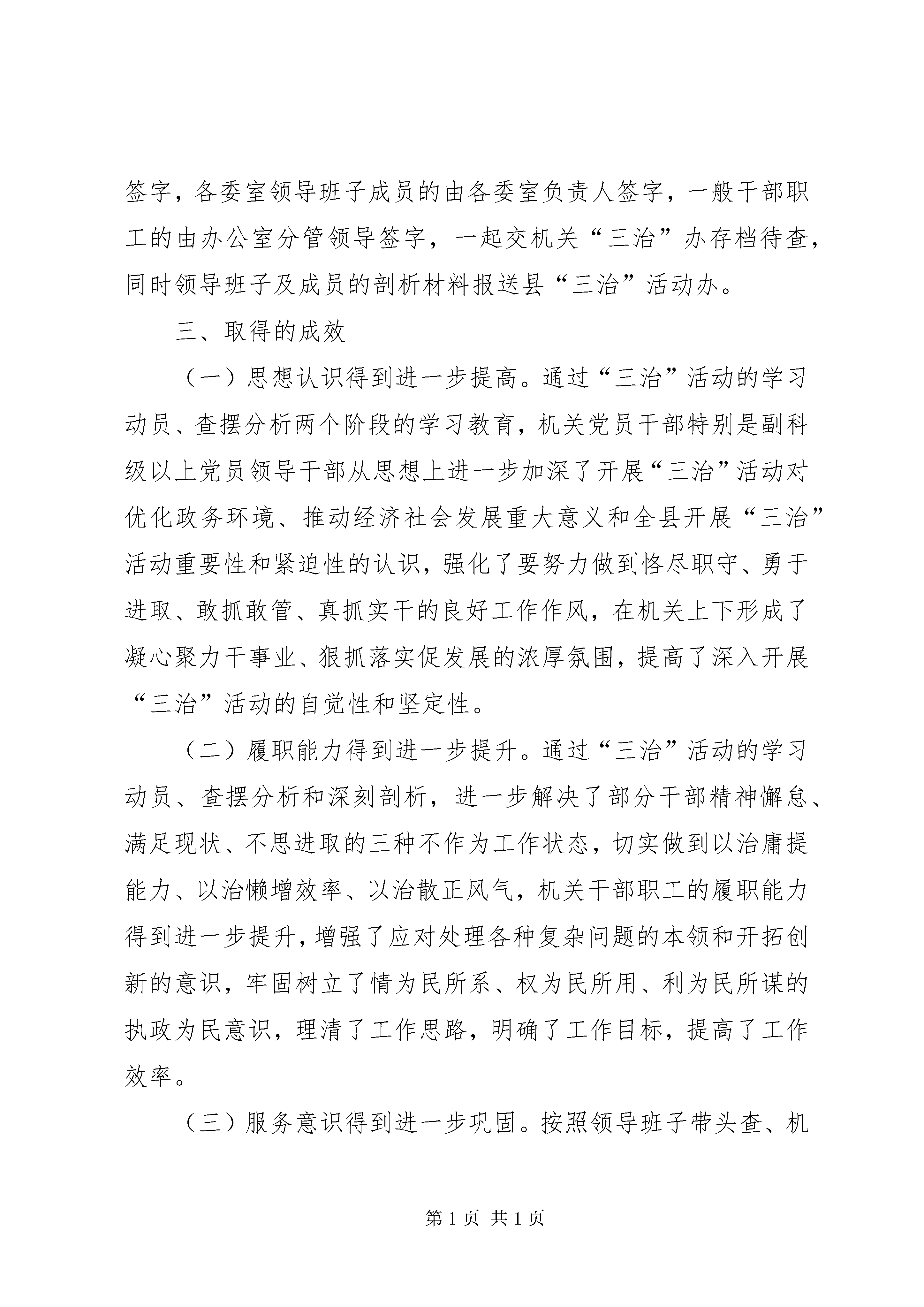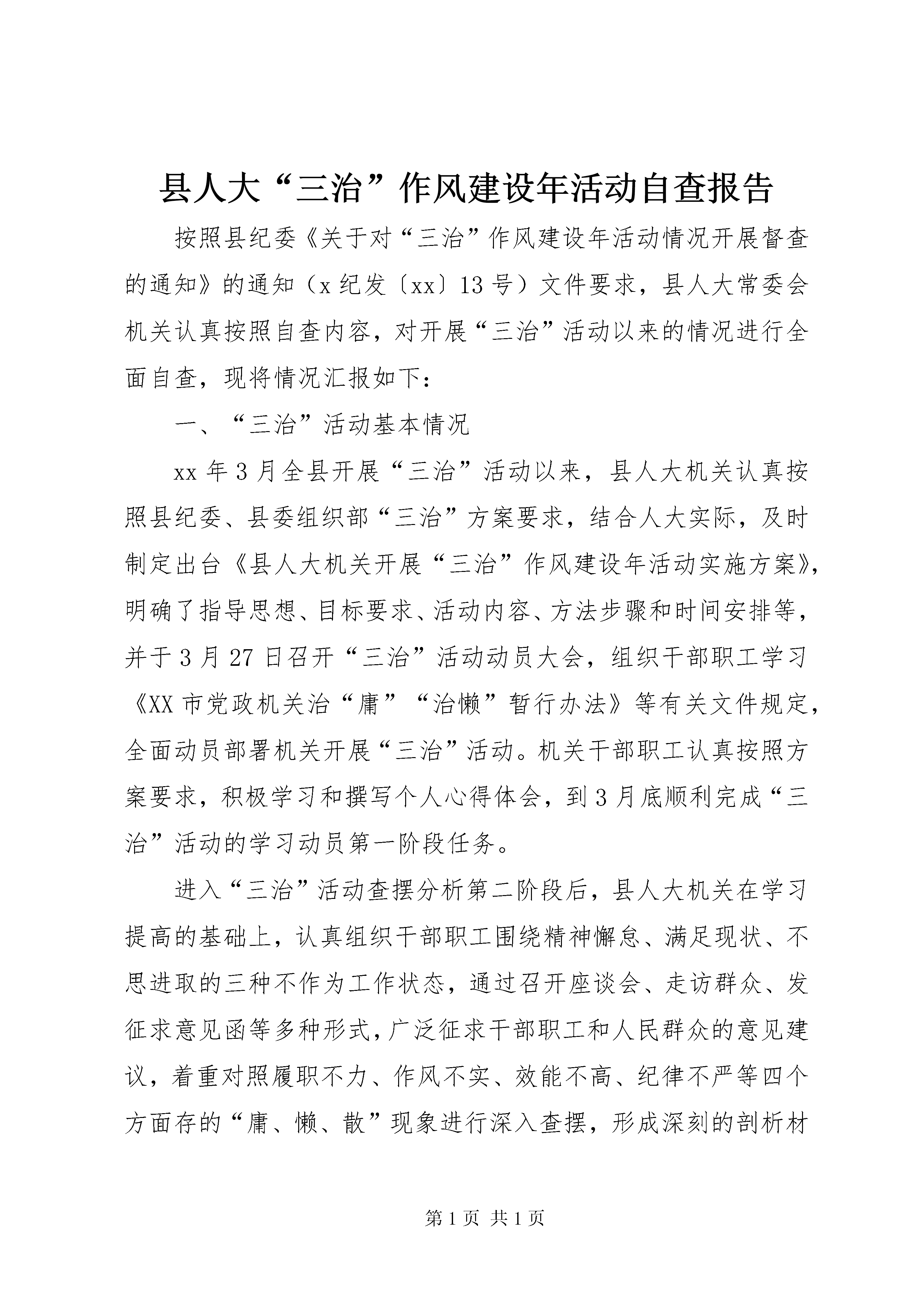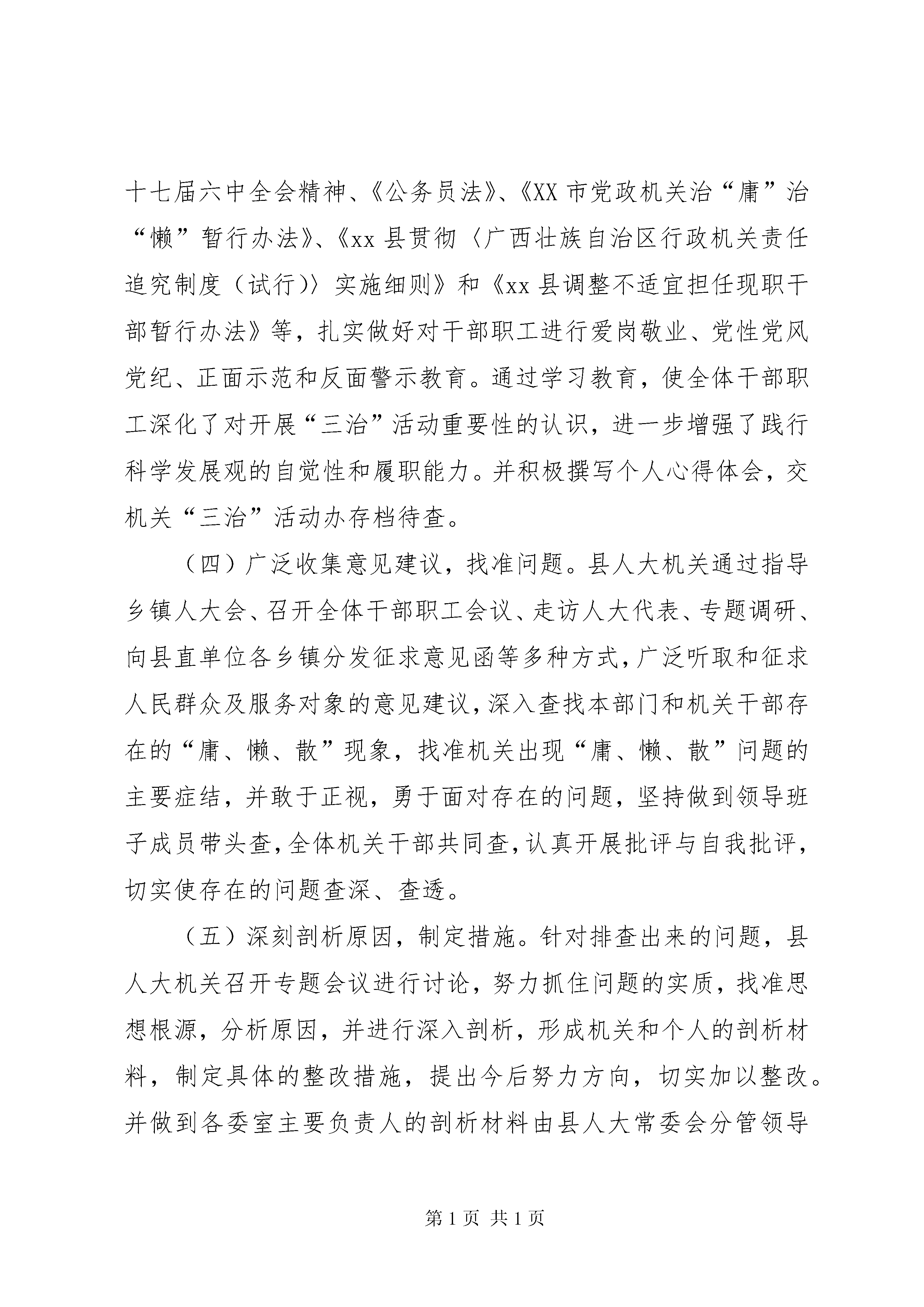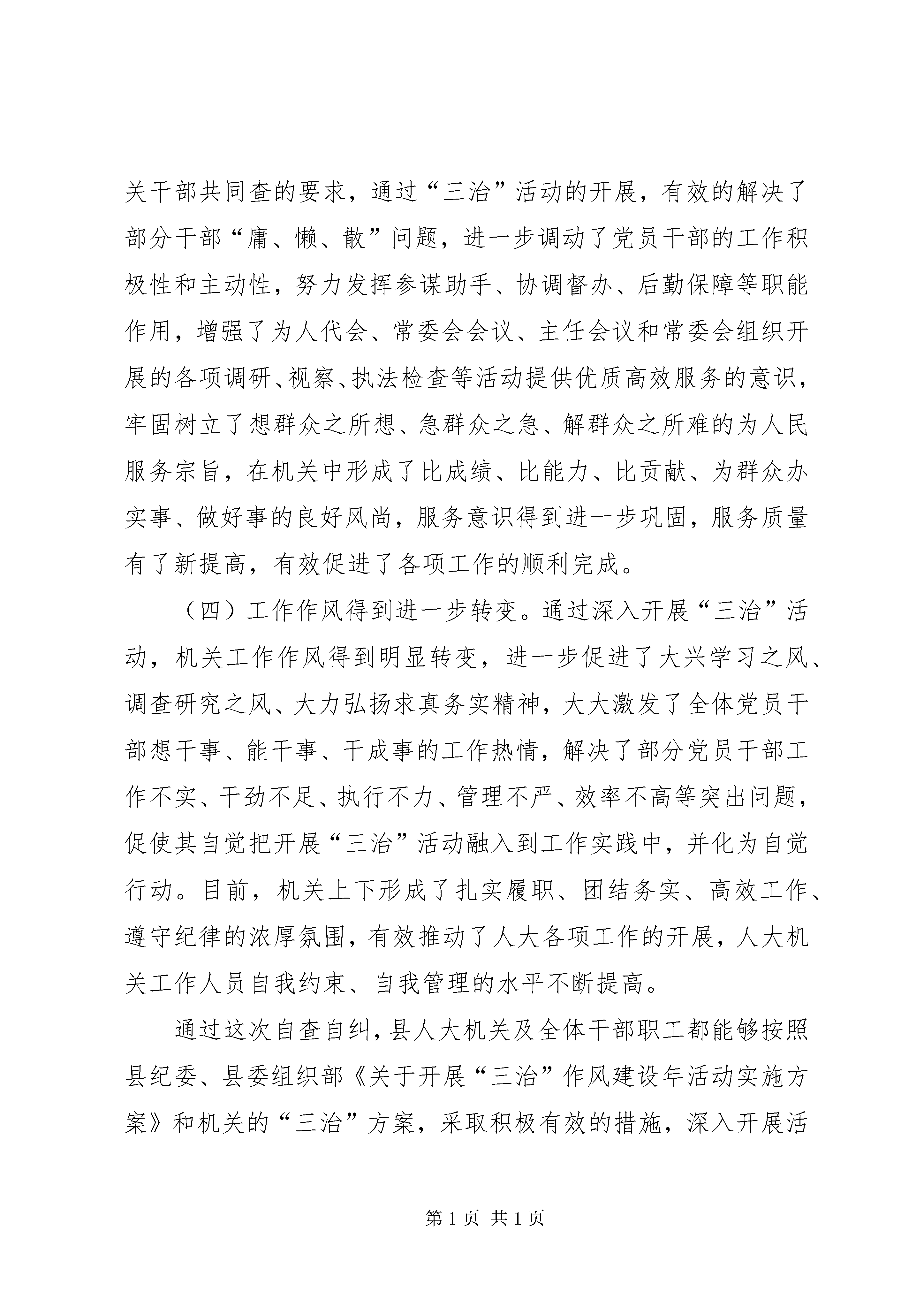 县人大“三治”作风建设年活动自查报告按照县纪委《关于对“三治”作风建设年活动情况开展督查的通知》的通知(x纪发〔xx〕13号)文件要求,县人大常委会机关认真按照自查内容,对开展“三治”活动以来的情况进行全面自查,现将情况汇报如下:一、“三治”活动基本情况xx年3月全县开展“三治”活动以来,县人大机关认真按照县纪委、县委组织部“三治”方案要求,结合人大实际,及时制定出台《县人大机关开展“三治”作风建设年活动实施方案》,明确了指导思想、目标要求、活动内容、方法步骤和时间安排等,并于3月27日召开“三治”活动动员大会,组织干部职工学习《XX市党政机关治“庸”“治懒”暂行办法》等有关文件规定,全面动员部署机关开展“三治”活动。机关干部职工认真按照方案要求,积极学习和撰写个人心得体会,到3月底顺利完成“三治”活动的学习动员第一阶段任务。进入“三治”活动查摆分析第二阶段后,县人大机关在学习提高的基础上,认真组织干部职工围绕精神懈怠、满足现状、不思进取的三种不作为工作状态,通过召开座谈会、走访群众、发征求意见函等多种形式,广泛征求干部职工和人民群众的意见建议,着重对照履职不力、作风不实、效能不高、纪律不严等四个方面存的“庸、懒、散”现象进行深入查摆,形成深刻的剖析材料,并报送机关“三治”办存档待查,属领导班子成员的还报送县“三治”活动办。二、主要措施(一)制定活动方案,整体谋划。县人大机关根据县委有关文件和全县“三治”活动实施方案,结合工作实际,制定了县人大机关开展“三治”活动的实施方案,明确了“三治”活动的指导思想、目标要求、活动内容、方法步骤等,整体谋划机关开展“三治”活动安排,为县人大机关顺利开展“三治”活动打下坚实的基础。(二)召开动员大会,全面部署。3月27日,县人大机关召开开展“三治”活动动员大会,传达全县“三治”活动文件及会议精神,宣读县人大机关开展“三治”活动的实施方案,明确“三治”活动要求,全面部署本单位“三治”活动开展。并要求机关全体干部职工要高度重视,切实把思想和行动统一到县委对形势的科学判断上来,统一到县委的重大决策部署上来,严肃认真的开展“三治”活动,高标准地完成任务,进一步增强做好人大工作的责任感和使命感。(三)组织专题学习,提高认识。在县人大机关动员大会上,组织干部职工集中学习《XX市党政机关治“庸”治“懒”暂行办法》,会后各委室迅速行动,采取集中学习、个人自学、研讨交流等多种形式组织本委室干部职工进行学习。认真学习了党的十七届六中全会精神、《公务员法》、《XX市党政机关治“庸”治“懒”暂行办法》、《xx县贯彻〈广西壮族自治区行政机关责任追究制度(试行)〉实施细则》和《xx县调整不适宜担任现职干部暂行办法》等,扎实做好对干部职工进行爱岗敬业、党性党风党纪、正面示范和反面警示教育。通过学习教育,使全体干部职工深化了对开展“三治”活动重要性的认识,进一步增强了践行科学发展观的自觉性和履职能力。并积极撰写个人心得体会,交机关“三治”活动办存档待查。(四)广泛收集意见建议,找准问题。县人大机关通过指导乡镇人大会、召开全体干部职工会议、走访人大代表、专题调研、向县直单位各乡镇分发征求意见函等多种方式,广泛听取和征求人民群众及服务对象的意见建议,深入查找本部门和机关干部存在的“庸、懒、散”现象,找准机关出现“庸、懒、散”问题的主要症结,并敢于正视,勇于面对存在的问题,坚持做到领导班子成员带头查,全体机关干部共同查,认真开展批评与自我批评,切实使存在的问题查深、查透。(五)深刻剖析原因,制定措施。针对排查出来的问题,县人大机关召开专题会议进行讨论,努力抓住问题的实质,找准思想根源,分析原因,并进行深入剖析,形成机关和个人的剖析材料,制定具体的整改措施,提出今后努力方向,切实加以整改。并做到各委室主要负责人的剖析材料由县人大常委会分管领导签字,各委室领导班子成员的由各委室负责人签字,一般干部职工的由办公室分管领导签字,一起交机关“三治”办存档待查,同时领导班子及成员的剖析材料报送县“三治”活动办。三、取得的成效(一)思想认识得到进一步提高。通过“三治”活动的学习动员、查摆分析两个阶段的学习教育,机关党员干部特别是副科级以上党员领导干部从思想上进一步加深了开展“三治”活动对优化政务环境、推动经济社会发展重大意义和全县开展“三治”活动重要性和紧迫性的认识,强化了要努力做到恪尽职守、勇于进取、敢抓敢管、真抓实干的良好工作作风,在机关上下形成了凝心聚力干事业、狠抓落实促发展的浓厚氛围,提高了深入开展“三治”活动的自觉性和坚定性。(二)履职能力得到进一步提升。通过“三治”活动的学习动员、查摆分析和深刻剖析,进一步解决了部分干部精神懈怠、满足现状、不思进取的三种不作为工作状态,切实做到以治庸提能力、以治懒增效率、