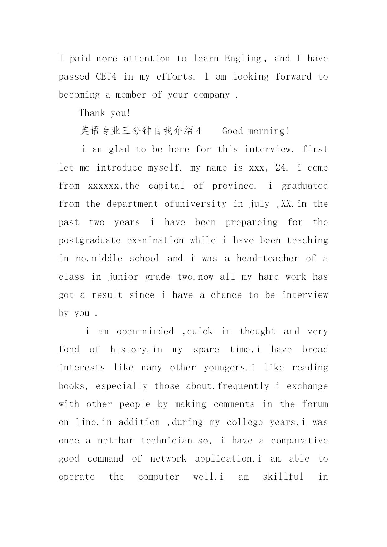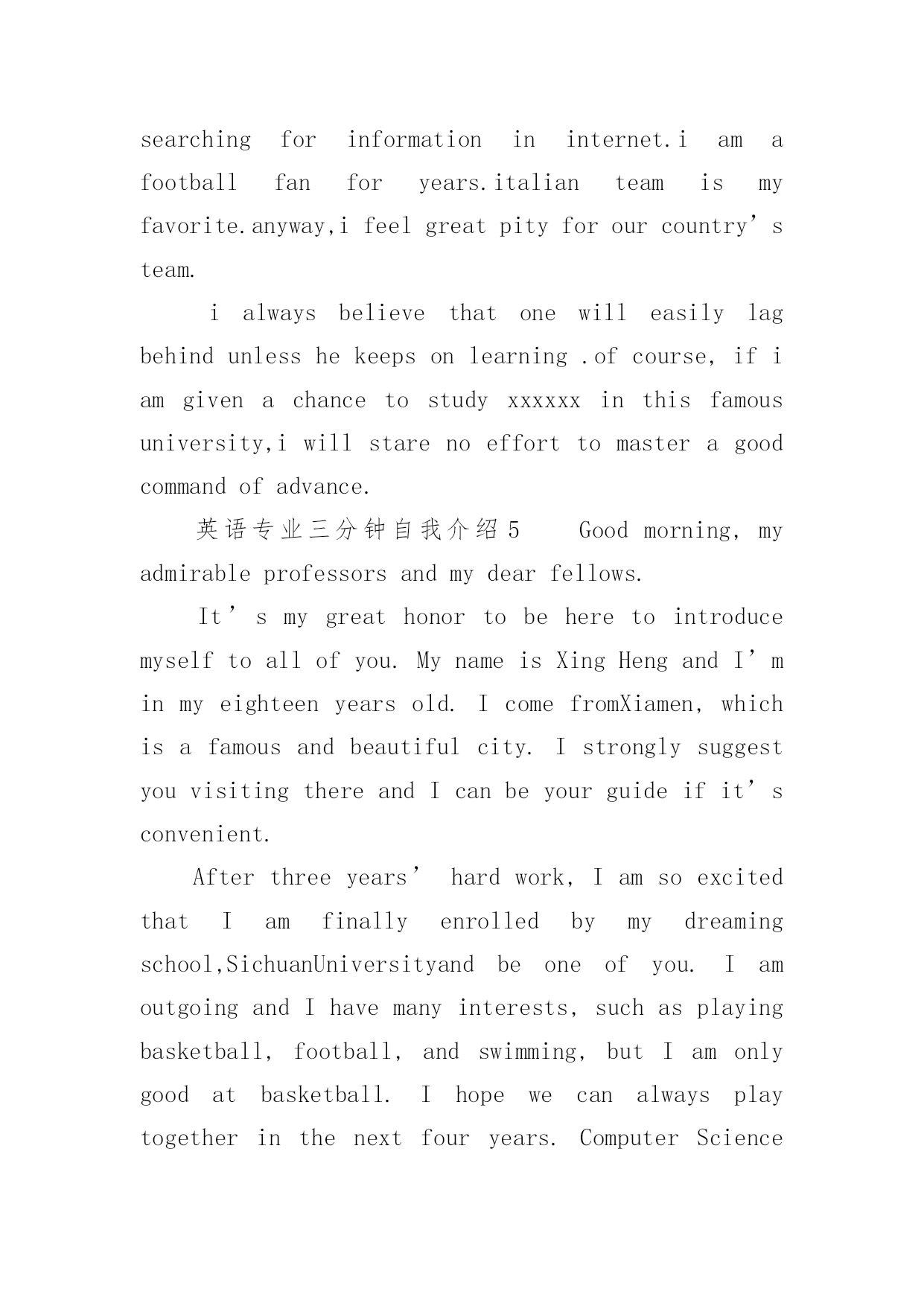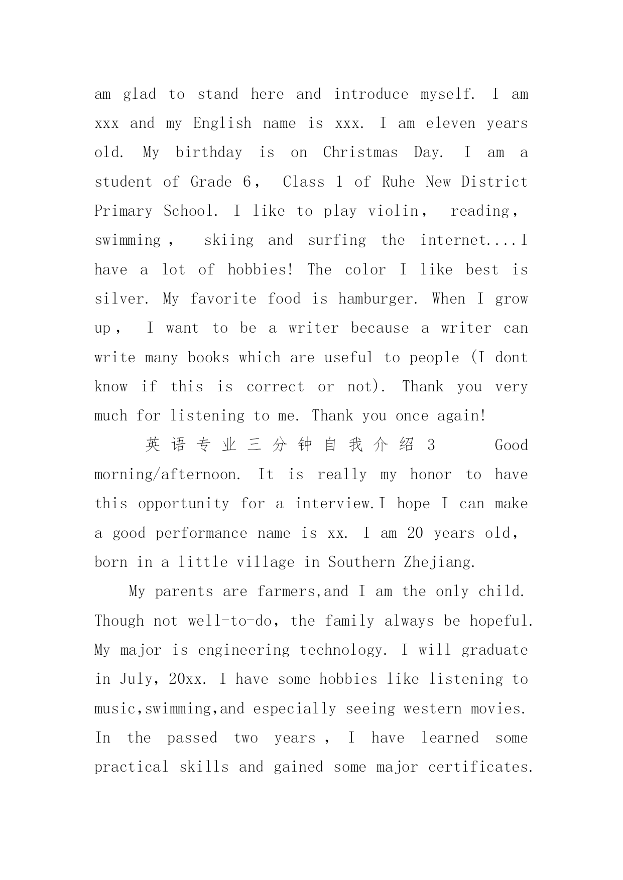 英语专业三分钟自我介绍 英语专业三分钟自我介绍(通用5篇)当进入一个新环境,常常要进行自我介绍,自我介绍是我们重新认识自己的开始。但是自我介绍有什么要求呢?下面是小编为大家整理的英语专业三分钟自我介绍(通用5篇),仅供参考,欢迎大家阅读。英语专业三分钟自我介绍1goodmorningafternoon.itisreallymyhonortohavethisopportunityforainterview.ihopeicanmakeagoodperformancetoday.mynameisxx.iam20yearsold,borninalittlevillageinsouthernzhejiang.myparentsarefarmers,andiamtheonlychild.thoughnotwell-to-do,thefamilyalwaysbehopeful.mymajorisengineeringtechnology.iwillgraduateinjuly,XX.ihavesomehobbieslikelisteningtomusic,swimming,andeeciallyseeingwesternmovies.inthepassedtwoyears,ihavelearnedsomepracticalskillsandgainedsomemajorcertificates.ipaidmoreattentiontolearnengling,andihavepassedcet4inmyefforts.iamlookingforwardtobecomingamemberofyourcompany.thankyou!英语专业三分钟自我介绍2Hello,everybody!Iamgladtostandhereandintroducemyself.IamxxxandmyEnglishnameisxxx.Iamelevenyearsold.MybirthdayisonChristmasDay.IamastudentofGrade6,Class1ofRuheNewDistrictPrimarySchool.Iliketoplayviolin,reading,swimming,skiingandsurfingtheinternet....Ihavealotofhobbies!ThecolorIlikebestissilver.Myfavoritefoodishamburger.WhenIgrowup,Iwanttobeawriterbecauseawritercanwritemanybookswhichareusefultopeople(Idontknowifthisiscorrectornot).Thankyouverymuchforlisteningtome.Thankyouonceagain!英语专业三分钟自我介绍3Goodmorning/afternoon.Itisreallymyhonortohavethisopportunityforainterview.IhopeIcanmakeagoodperformancenameisxx.Iam20yearsold,borninalittlevillageinSouthernZhejiang.Myparentsarefarmers,andIamtheonlychild.Thoughnotwell-to-do,thefamilyalwaysbehopeful.Mymajorisengineeringtechnology.IwillgraduateinJuly,20xx.Ihavesomehobbieslikelisteningtomusic,swimming,andespeciallyseeingwesternmovies.Inthepassedtwoyears,Ihavelearnedsomepracticalskillsandgainedsomemajorcertificates.IpaidmoreattentiontolearnEngling,andIhavepassedCET4inmyefforts.Iamlookingforwardtobecomingamemberofyourcompany.Thankyou!英语专业三分钟自我介绍4Goodmorning!iamgladtobehereforthisinterview.firstletmeintroducemyself.mynameisxxx,24.icomefromxxxxxx,thecapitalofprovince.igraduatedfromthedepartmentofuniversityinjuly,XX.in