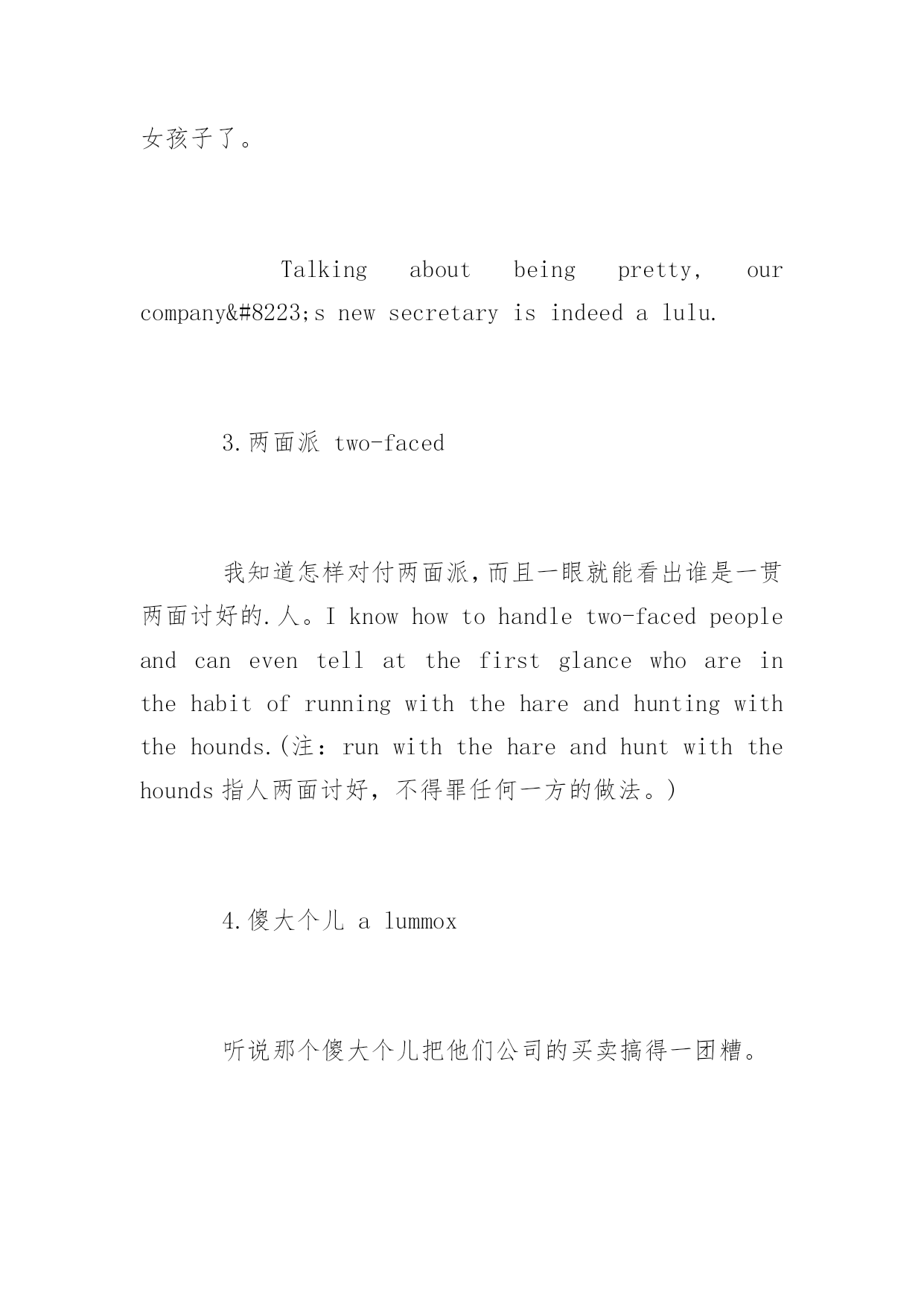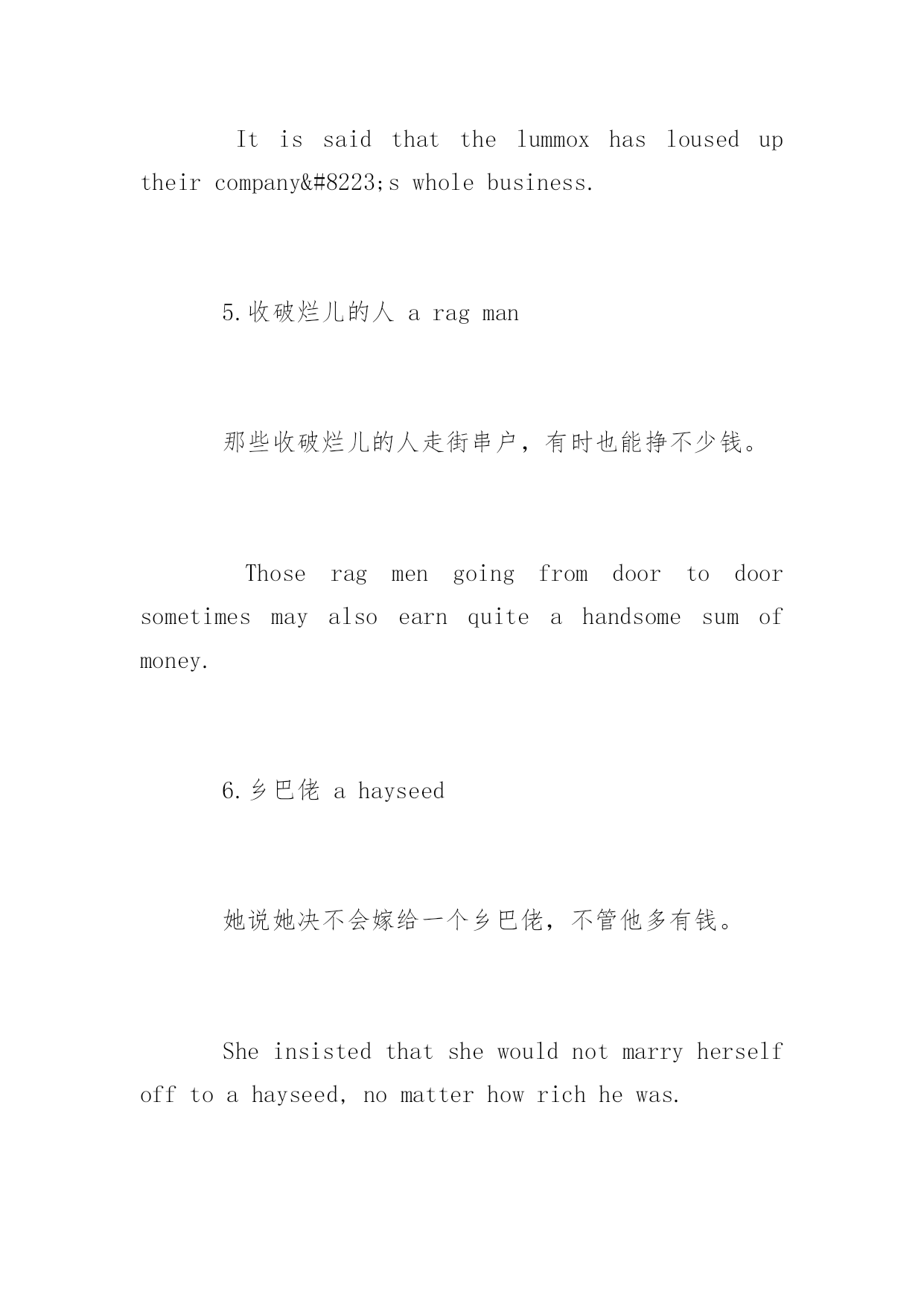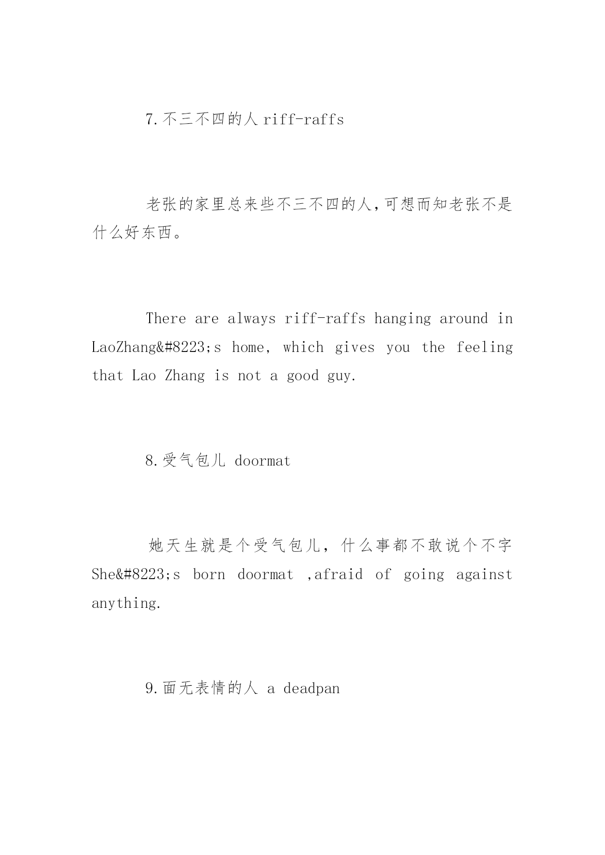 英语专业八级翻译汉译英难点解析 英语专业八级翻译汉译英难点解析 Toweringgeniusdisdainsabeatenpath.Itseeksregionshithertounexplored.以下是小编为大家搜索整理的英语专业八级翻译汉译英难点解析,希望能给大家带来帮助!更多精彩内容请及时关注我们应届毕业生考试网! 1.一根筋儿onetrack-minded.别跟他较劲了。他一根筋,你还不知道? Stopreasoningwithhim.Don‟tyouknowheisonetrack-minded? 2.出众的人alulu 要说漂亮,我们公司新来的秘书可算是个相貌出众的女孩子了。 Talkingaboutbeingpretty,ourcompany‟snewsecretaryisindeedalulu. 3.两面派two-faced 我知道怎样对付两面派,而且一眼就能看出谁是一贯两面讨好的.人。Iknowhowtohandletwo-facedpeopleandcaneventellatthefirstglancewhoareinthehabitofrunningwiththehareandhuntingwiththehounds.(注:runwiththehareandhuntwiththehounds指人两面讨好,不得罪任何一方的做法。) 4.傻大个儿alummox 听说那个傻大个儿把他们公司的买卖搞得一团糟。 Itissaidthatthelummoxhaslouseduptheircompany‟swholebusiness. 5.收破烂儿的人aragman 那些收破烂儿的人走街串户,有时也能挣不少钱。 Thoseragmengoingfromdoortodoorsometimesmayalsoearnquiteahandsomesumofmoney. 6.乡巴佬ahayseed 她说她决不会嫁给一个乡巴佬,不管他多有钱。 Sheinsistedthatshewouldnotmarryherselfofftoahayseed,nomatterhowrichhewas. 7.不三不四的人riff-raffs 老张的家里总来些不三不四的人,可想而知老张不是什么好东西。 Therearealwaysriff-raffshangingaroundinLaoZhang‟shome,whichgivesyouthefeelingthatLaoZhangisnotagoodguy. 8.受气包儿doormat 她天生就是个受气包儿,什么事都不敢说个不字She‟sborndoormat,afraidofgoingagainstanything. 9.面无表情的人adeadpan 和那些面无表情的人在一起工作真让人憋气。Youfeelchokedtoworkwiththosedeadpans. 10.扫帚星ajinx 有人说那个女人是个扫帚星,谁跟她结婚谁倒霉。 She‟ssaidtobeajinx,whowouldbringbadlucktowhoevershemarries.