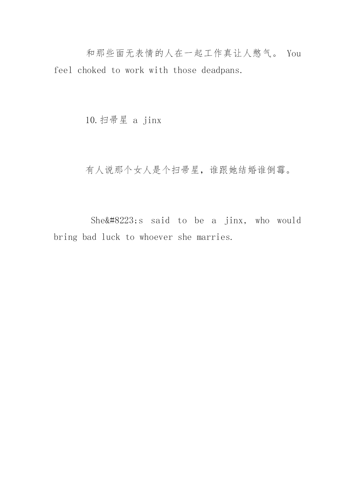 英语专业八级翻译汉译英难点解析 英语专业八级翻译汉译英难点解析 Toweringgeniusdisdainsabeatenpath.Itseeksregionshithertounexplored.以下是小编为大家搜索整理的英语专业八级翻译汉译英难点解析,希望能给大家带来帮助!更多精彩内容请及时关注我们应届毕业生考试网! 1.一根筋儿onetrack-minded.别跟他较劲了。他一根筋,你还不知道? Stopreasoningwithhim.Don‟tyouknowheisonetrack-minded? 2.出众的人alulu 要说漂亮,我们公司新来的秘书可算是个相貌出众的女孩子了。 Talkingaboutbeingpretty,ourcompany‟snewsecretaryisindeedalulu. 3.两面派two-faced 我知道怎样对付两面派,而且一眼就能看出谁是一贯两面讨好的.人。Iknowhowtohandletwo-facedpeopleandcaneventellatthefirstglancewhoareinthehabitofrunningwiththehareandhuntingwiththehounds.(注:runwiththehareandhuntwiththehounds指人两面讨好,不得罪任何一方的做法。) 4.傻大个儿alummox 听说那个傻大个儿把他们公司的买卖搞得一团糟。 Itissaidthatthelummoxhaslouseduptheircompany‟swholebusiness. 5.收破烂儿的人aragman 那些收破烂儿的人走街串户,有时也能挣不少钱。 Thoseragmengoingfromdoortodoorsometimesmayalsoearnquiteahandsomesumofmoney. 6.乡巴佬ahayseed 她说她决不会嫁给一个乡巴佬,不管他多有钱。 Sheinsistedthatshewouldnotmarryherselfofftoahayseed,nomatterhowrichhewas. 7.不三不四的人riff-raffs 老张的家里总来些不三不四的人,可想而知老张不是什么好东西。 Therearealwaysriff-raffshangingaroundinLaoZhang‟shome,whichgivesyouthefeelingthatLaoZhangisnotagoodguy. 8.受气包儿doormat 她天生就是个受气包儿,什么事都不敢说个不字She‟sborndoormat,afraidofgoingagainstanything. 9.面无表情的人adeadpan 和那些面无表情的人在一起工作真让人憋气。Youfeelchokedtoworkwiththosedeadpans. 10.扫帚星ajinx 有人说那个女人是个扫帚星,谁跟她结婚谁倒霉。 She‟ssaidtobeajinx,whowouldbringbadlucktowhoevershemarries.