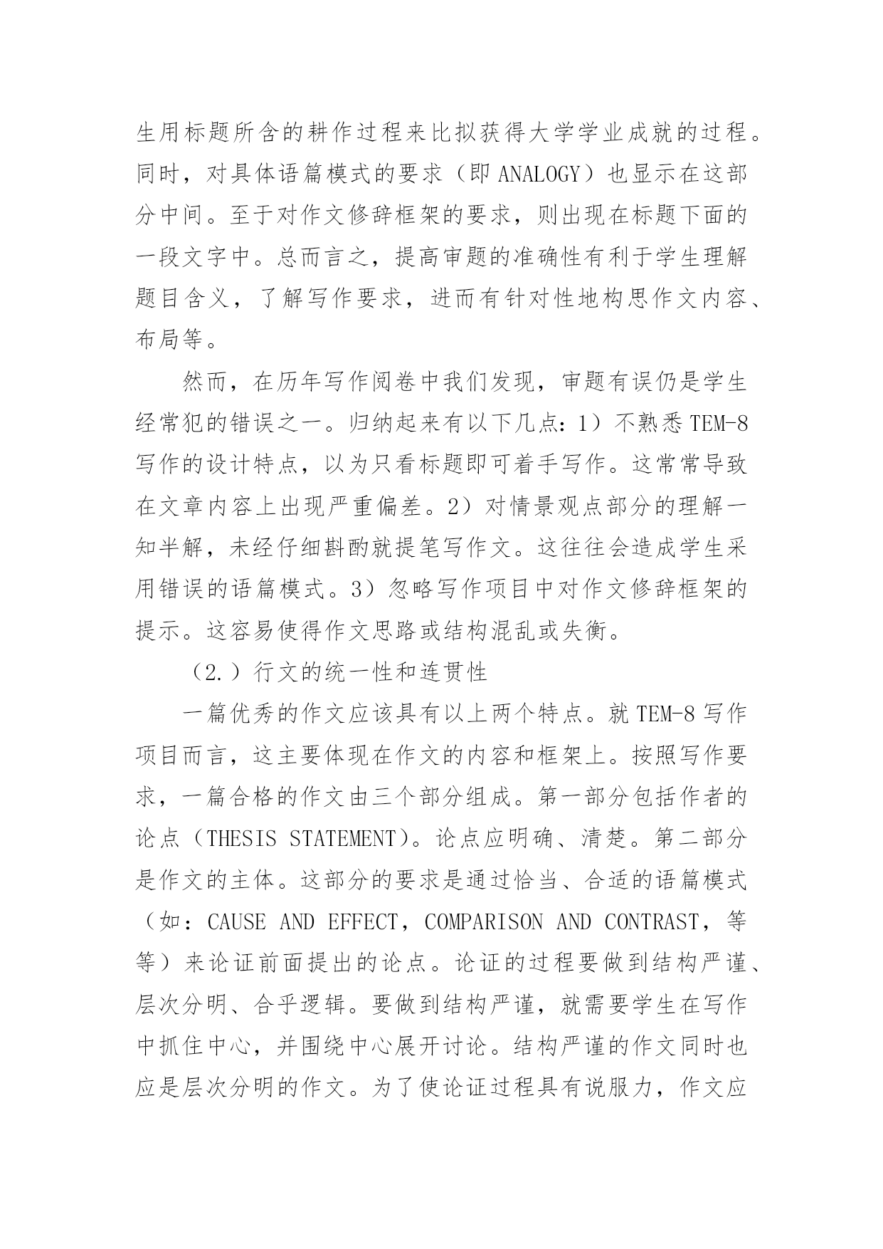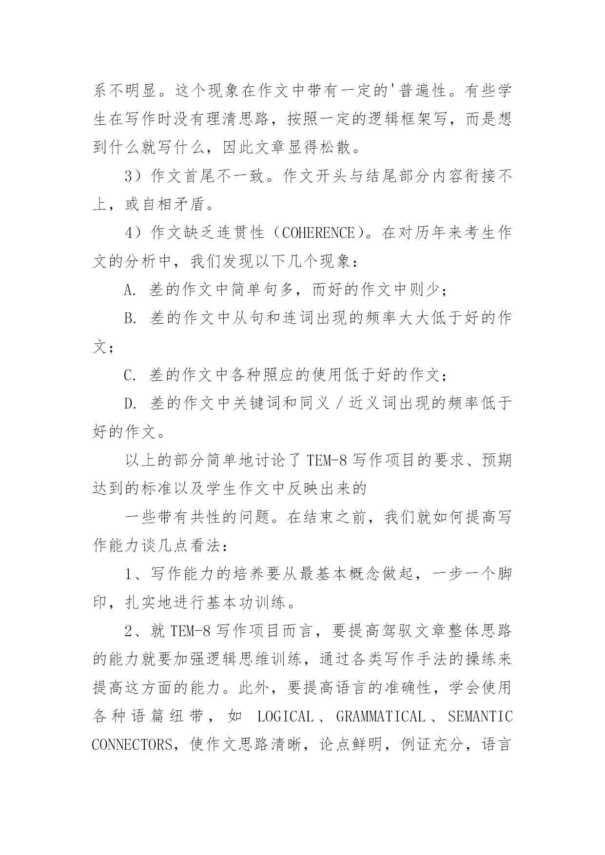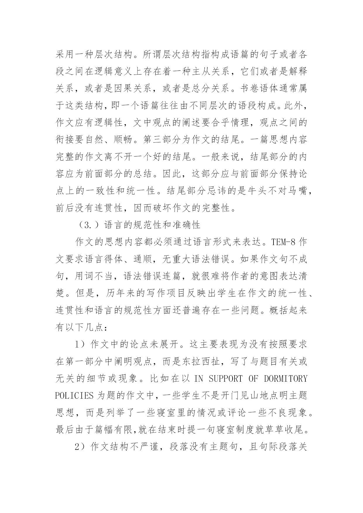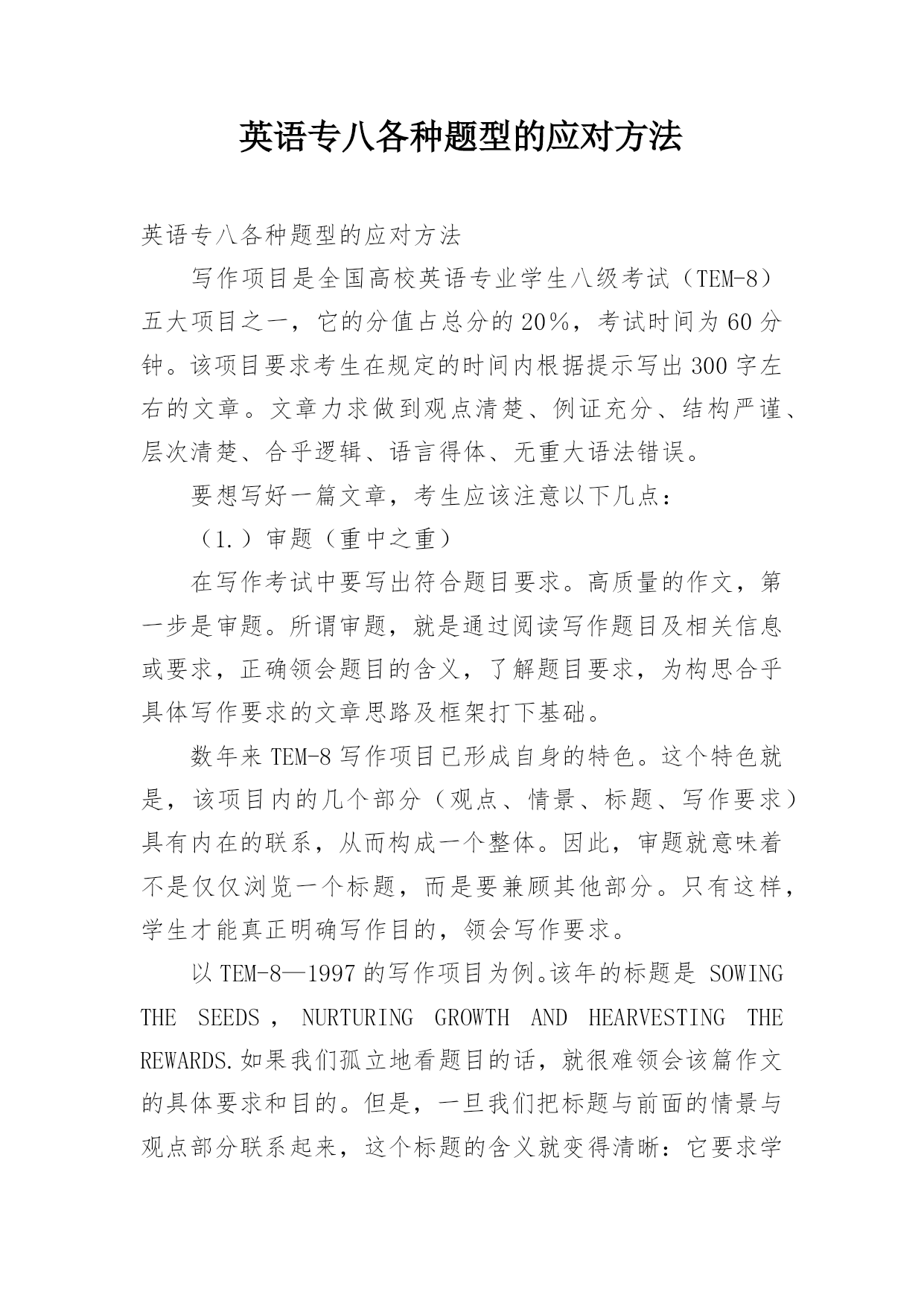 英语专八各种题型的应对方法 英语专八各种题型的应对方法写作项目是全国高校英语专业学生八级考试(TEM-8)五大项目之一,它的分值占总分的20%,考试时间为60分钟。该项目要求考生在规定的时间内根据提示写出300字左右的文章。文章力求做到观点清楚、例证充分、结构严谨、层次清楚、合乎逻辑、语言得体、无重大语法错误。要想写好一篇文章,考生应该注意以下几点:(1.)审题(重中之重)在写作考试中要写出符合题目要求。高质量的作文,第一步是审题。所谓审题,就是通过阅读写作题目及相关信息或要求,正确领会题目的含义,了解题目要求,为构思合乎具体写作要求的文章思路及框架打下基础。数年来TEM-8写作项目已形成自身的特色。这个特色就是,该项目内的几个部分(观点、情景、标题、写作要求)具有内在的联系,从而构成一个整体。因此,审题就意味着不是仅仅浏览一个标题,而是要兼顾其他部分。只有这样,学生才能真正明确写作目的,领会写作要求。以TEM-8—1997的写作项目为例。该年的标题是SOWINGTHESEEDS,NURTURINGGROWTHANDHEARVESTINGTHEREWARDS.如果我们孤立地看题目的话,就很难领会该篇作文的具体要求和目的。但是,一旦我们把标题与前面的情景与观点部分联系起来,这个标题的含义就变得清晰:它要求学生用标题所含的耕作过程来比拟获得大学学业成就的过程。同时,对具体语篇模式的要求(即ANALOGY)也显示在这部分中间。至于对作文修辞框架的要求,则出现在标题下面的一段文字中。总而言之,提高审题的准确性有利于学生理解题目含义,了解写作要求,进而有针对性地构思作文内容、布局等。然而,在历年写作阅卷中我们发现,审题有误仍是学生经常犯的错误之一。归纳起来有以下几点:1)不熟悉TEM-8写作的设计特点,以为只看标题即可着手写作。这常常导致在文章内容上出现严重偏差。2)对情景观点部分的理解一知半解,未经仔细斟酌就提笔写作文。这往往会造成学生采用错误的语篇模式。3)忽略写作项目中对作文修辞框架的提示。这容易使得作文思路或结构混乱或失衡。(2.)行文的统一性和连贯性一篇优秀的作文应该具有以上两个特点。就TEM-8写作项目而言,这主要体现在作文的内容和框架上。按照写作要求,一篇合格的作文由三个部分组成。第一部分包括作者的论点(THESISSTATEMENT)。论点应明确、清楚。第二部分是作文的主体。这部分的要求是通过恰当、合适的语篇模式(如:CAUSEANDEFFECT,COMPARISONANDCONTRAST,等等)来论证前面提出的论点。论证的过程要做到结构严谨、层次分明、合乎逻辑。要做到结构严谨,就需要学生在写作中抓住中心,并围绕中心展开讨论。结构严谨的作文同时也应是层次分明的作文。为了使论证过程具有说服力,作文应采用一种层次结构。所谓层次结构指构成语篇的句子或者各段之间在逻辑意义上存在着一种主从关系,它们或者是解释关系,或者是因果关系,或者是总分关系。书卷语体通常属于这类结构,即一个语篇往往由不同层次的语段构成。此外,作文应有逻辑性,文中观点的阐述要合乎情理,观点之间的衔接要自然、顺畅。第三部分为作文的结尾。一篇思想内容完整的作文离不开一个好的结尾。一般来说,结尾部分的内容应为前面部分的总结。因此,这部分应与前面部分保持论点上的一致性和统一性。结尾部分忌讳的是牛头不对马嘴,前后没有连贯性,因而破坏作文的完整性。(3.)语言的规范性和准确性作文的思想内容都必须通过语言形式来表达。TEM-8作文要求语言得体、通顺,无重大语法错误。如果作文句不成句,用词不当,语法错误连篇,就很难将作者的意图表达清楚。但是,历年来的写作项目反映出学生在作文的统一性、连贯性和语言的规范性方面还普遍存在一些问题。概括起来有以下几点:l)作文中的论点未展开。这主要表现为没有按照要求在第一部分中阐明观点,而是东拉西扯,写了与题目有关或无关的细节或现象。比如在以INSUPPORTOFDORMITORYPOLICIES为题的作文中,一些学生不是开门见山地点明主题思想,而是列举了一些寝室里的情况或评论一些不良现象。最后由于篇幅有限,就在结束时提一句寝室制度就草草收尾。2)作文结构不严谨,段落没有主题句,且句际段落关系不明显。这个现象在作文中带有一定的'普遍性。有些学生在写作时没有理清思路,按照一定的逻辑框架写,而是想到什么就写什么,因此文章显得松散。3)作文首尾不一致。作文开头与结尾部分内容衔接不上,或自相矛盾。4)作文缺乏连贯性(COHERENCE)。在对历年来考生作文的分析中,我们发现以下几个现象:A.差的作文中简单句多,而好的作文中则少;B.差的作文中从句和连词出现的频率大大低于好的作文;C.差的作文中各种照应的使用低于好的作文;D.差的作文中关键词和同义/近义词出