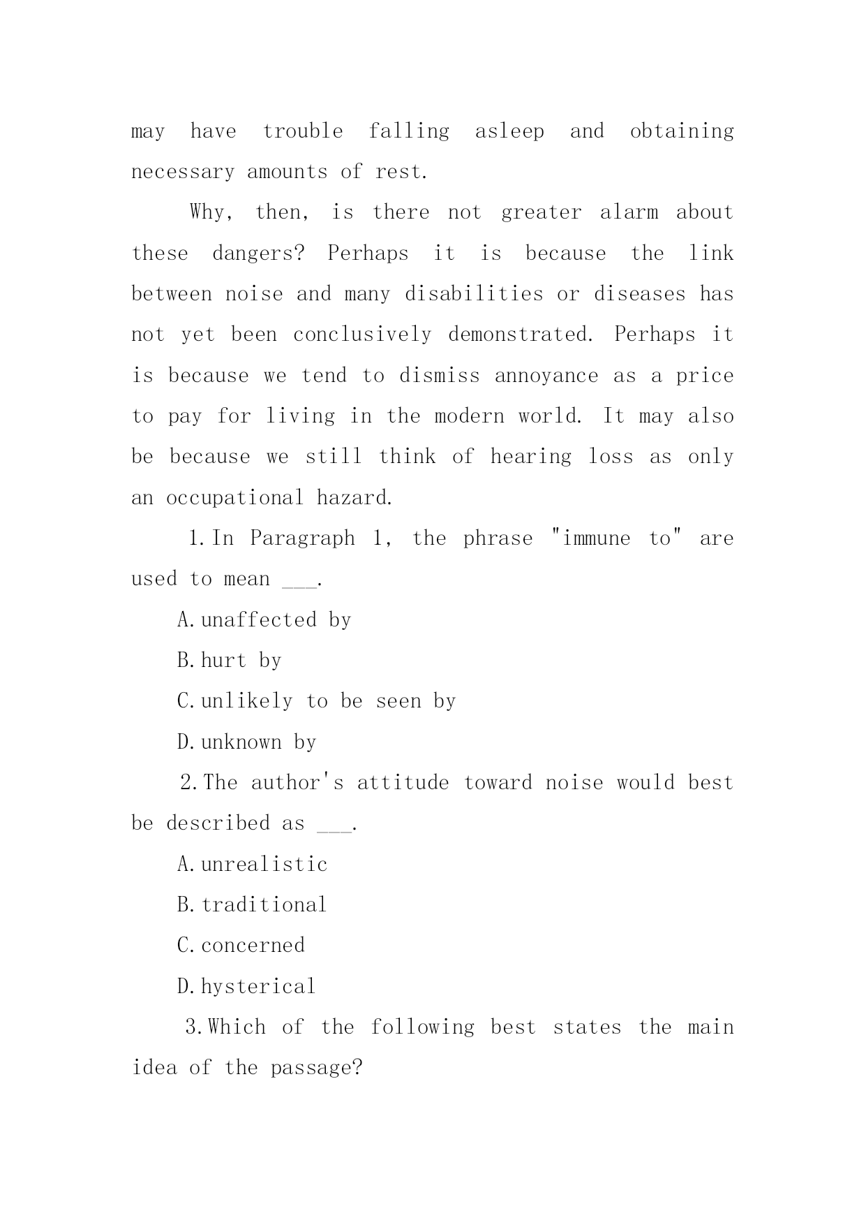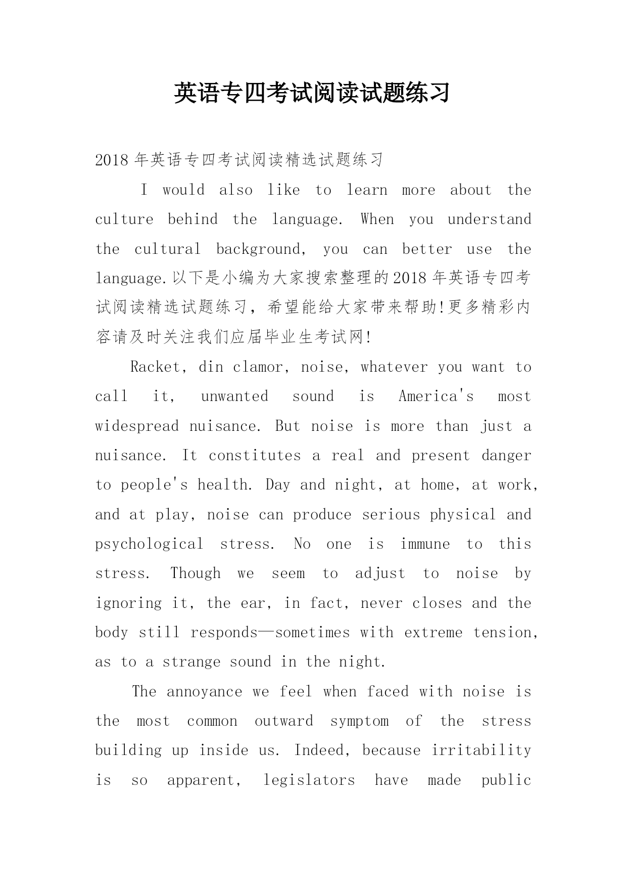 英语专四考试阅读试题练习 2018年英语专四考试阅读精选试题练习Iwouldalsoliketolearnmoreabouttheculturebehindthelanguage.Whenyouunderstandtheculturalbackground,youcanbetterusethelanguage.以下是小编为大家搜索整理的2018年英语专四考试阅读精选试题练习,希望能给大家带来帮助!更多精彩内容请及时关注我们应届毕业生考试网!Racket,dinclamor,noise,whateveryouwanttocallit,unwantedsoundisAmerica'smostwidespreadnuisance.Butnoiseismorethanjustanuisance.Itconstitutesarealandpresentdangertopeople'shealth.Dayandnight,athome,atwork,andatplay,noisecanproduceseriousphysicalandpsychologicalstress.Nooneisimmunetothisstress.Thoughweseemtoadjusttonoisebyignoringit,theear,infact,neverclosesandthebodystillresponds—sometimeswithextremetension,astoastrangesoundinthenight.Theannoyancewefeelwhenfacedwithnoiseisthemostcommonoutwardsymptomofthestressbuildingupinsideus.Indeed,becauseirritabilityissoapparent,legislatorshavemadepublicannoyancethebasisofmanynoiseabatementprograms.Themoresubtleandmoreserioushealthhazardsassociatedwithstresscausedbynoisetraditionallyhavebeengivenmuchlessattention.Nevertheless,whenweareannoyedormadeirritablebynoise,weshouldconsiderthesesymptomsfairwarningthatotherthingmaybehappeningtous,someofwhichmaybedamagingtoourhealth.Ofmanyhealthhazardstonoise,hearinglossisthemostclearlyobservableandmeasurablebyhealthprofessionals.Theotherhazardsarehardertopindown.Formanyofus,theremaybeariskthatexposuretothestressofnoiseincreasessusceptibilitytodiseaseandinfection.Themoresusceptibleamongusmayexperiencenoiseasacomplicatingfactorinheartproblemsandotherdiseases.Noisethatcausesannoyanceandirritabilityinhealthpersonsmayhaveseriousconsequencesforthesealreadyillinmindorbody.Noiseaffectsusthroughoutourlives.Forexample,thereareindicationsofeffectsontheunbornchildwhenmothersareexposedtoindustrialandenvironmentalnoise.Duringinfancyandchildhood,youngstersexposedtohighnoiselevelsmayhavetroublefallingasleepandobtainingnecessaryamountsofrest.Why,then,istherenotgreateralarmaboutthesedangers?Perhapsitisbecausethelinkbetweennoiseandmanydisabilitiesordiseaseshasnotyetbeenconclusivelydemonstrat