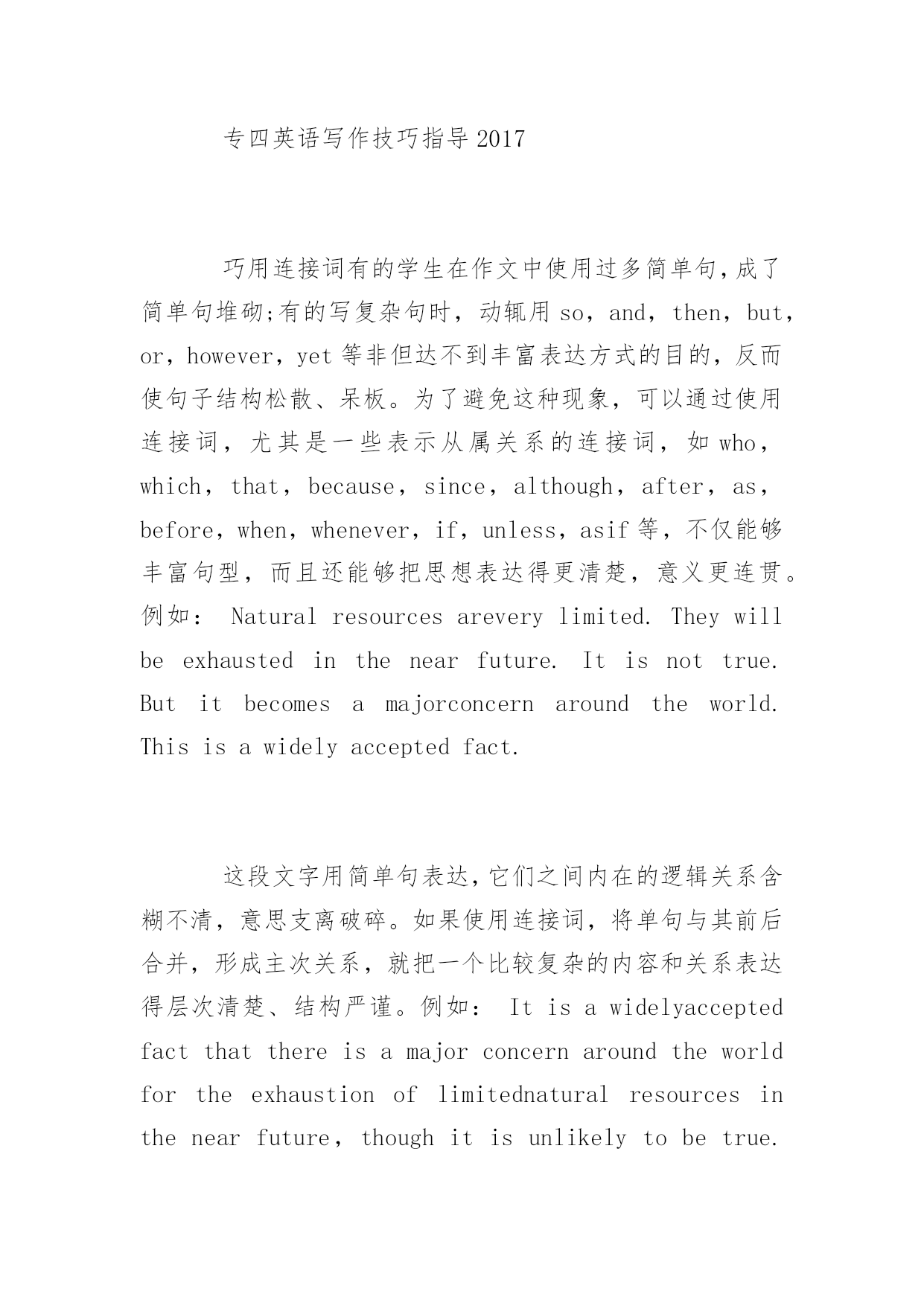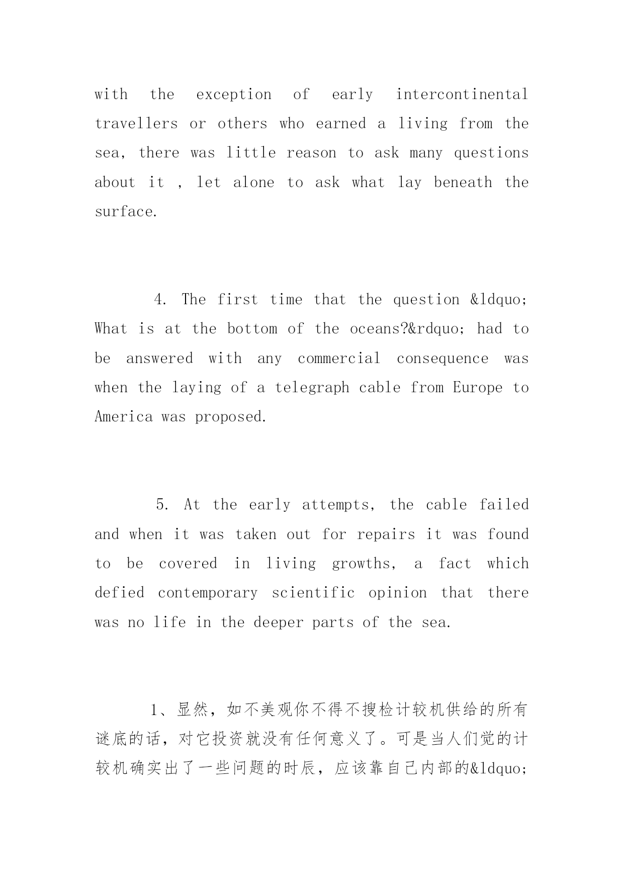 英语专四阅读句式翻译素材 2017年英语专四阅读句式翻译素材必备 随着英语的普及,英语成了大学生走进社会的通行证。为帮助大学生更好地掌握英语知识。下面,小编为大家搜索整理的2017年英语专四阅读句式翻译素材必备,希望能给大家带来帮助!更多精彩内容请及时关注我们应届毕业生考试网! 1.Obviously,therewouldbenopointininvestinginacomputerifyouhadtocheckallitsanswers,butpeopleshouldalsorelyontheirowninternalcomputersandcheckthemachinewhentheyhavethefeelingthatsomethinghasgonewrong. 2.CertainlyNewtonconsideredsometheoreticalaspectsofitinhiswritings,buthewasreluctanttogotoseatofurtherhiswork. 3.Formostpeopletheseawasremote,andwiththeexceptionofearlyintercontinentaltravellersorotherswhoearnedalivingfromthesea,therewaslittlereasontoaskmanyquestionsaboutit,letalonetoaskwhatlaybeneaththesurface. 4.Thefirsttimethatthequestion“Whatisatthebottomoftheoceans?”hadtobeansweredwithanycommercialconsequencewaswhenthelayingofatelegraphcablefromEuropetoAmericawasproposed. 5.Attheearlyattempts,thecablefailedandwhenitwastakenoutforrepairsitwasfoundtobecoveredinlivinggrowths,afactwhichdefiedcontemporaryscientificopinionthattherewasnolifeinthedeeperpartsofthesea. 1、显然,如不美观你不得不搜检计较机供给的所有谜底的话,对它投资就没有任何意义了。可是当人们觉的计较机确实出了一些问题的时辰,应该靠自己内部的“计较机”来搜检机械。 2、当然牛顿在他的作品中写到了一些理论方面的工具,但他不愿进行加倍深刻的研究。 3、除了一些洲际旅行者和以大海为生的人,对于大大都人来说,大海是遥远的.,没有什么需要提出太多问题,更别说思虑大海海底的工具了。 4、寺库设一条从欧洲到美洲的海底电报光缆的时辰,出于商业念头,人们第一次不得不回覆这个问题“海底是什么工具”。 5、在早期的考试考试中,光缆铺设失踪败,不得不掏出来维修。这时人们发现膳缦沔笼盖有生物,这推翻了那时科学界认为深海没有生命的理论。 【相关阅读】 专四英语写作技巧指导2017 巧用连接词有的学生在作文中使用过多简单句,成了简单句堆砌;有的写复杂句时,动辄用so,and,then,but,or,however,yet等非但达不到丰富表达方式的目的,反而使句子结构松散、呆板。为了避免这种现象,可以通过使用连接词,尤其是一些表示从属关系的连接词,如who,which,that,because,since,although,after,as,before,when,whenever,if,unless,asif等,不仅能够丰富句型,而且还能够把思想表达得更清楚,意义更连贯。例如:Naturalresourcesareverylimited.Theywillbeexhaustedinthenearfuture.Itisnottrue.Butitbecomesamajorconcernaroundtheworld.Thisisawidelyacceptedfact. 这段文字用简单句表达,它们之间内在的逻辑关系含糊不清,意思支离破碎。如果使用连接词,将单句与其前后合并,形成主次关系,就把一个比较复杂的内容和关系表达得层次清楚、结构严谨。例如:Itisawidelyacceptedfactthatthereisamajorconcernaroundtheworldfortheexhaustionoflimitednaturalresourcesinthenearfuture,thoughitisunlik