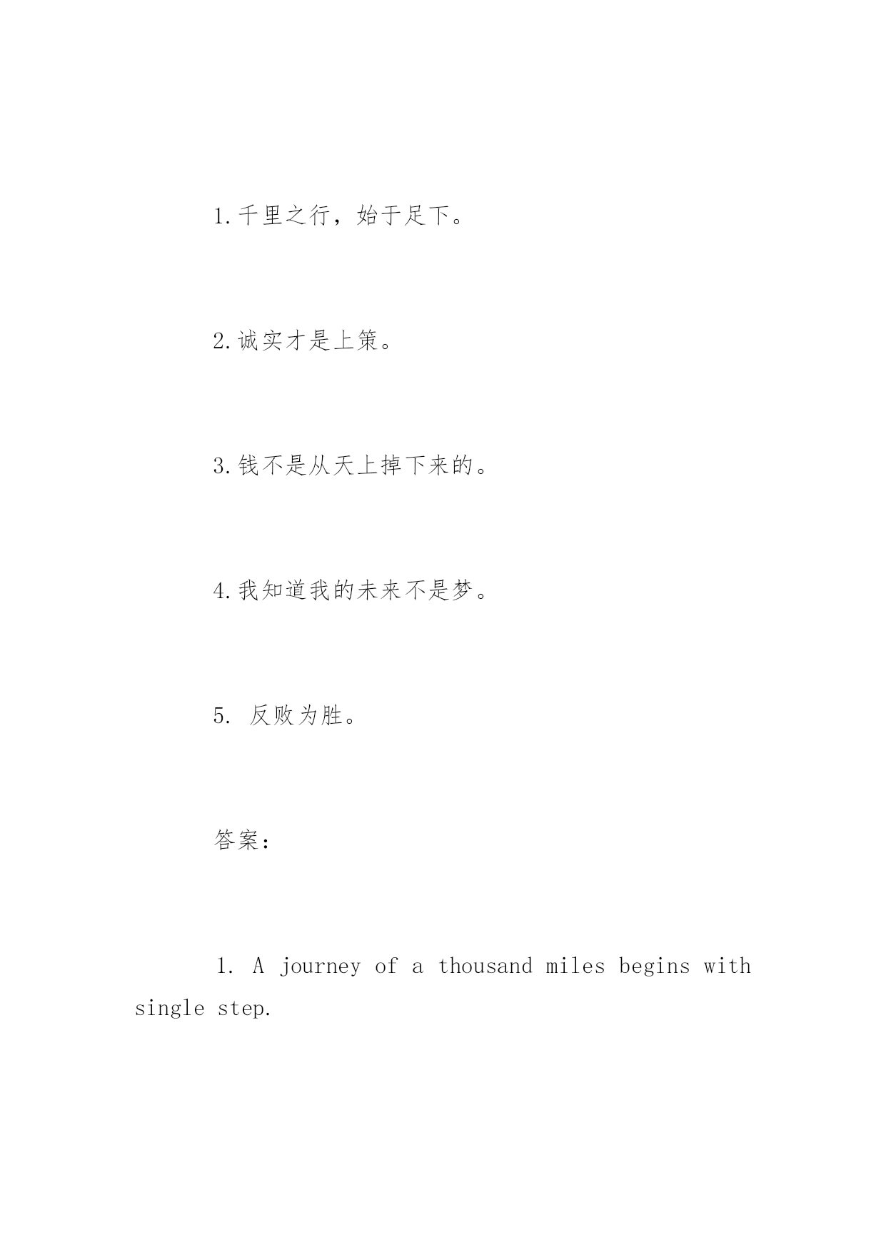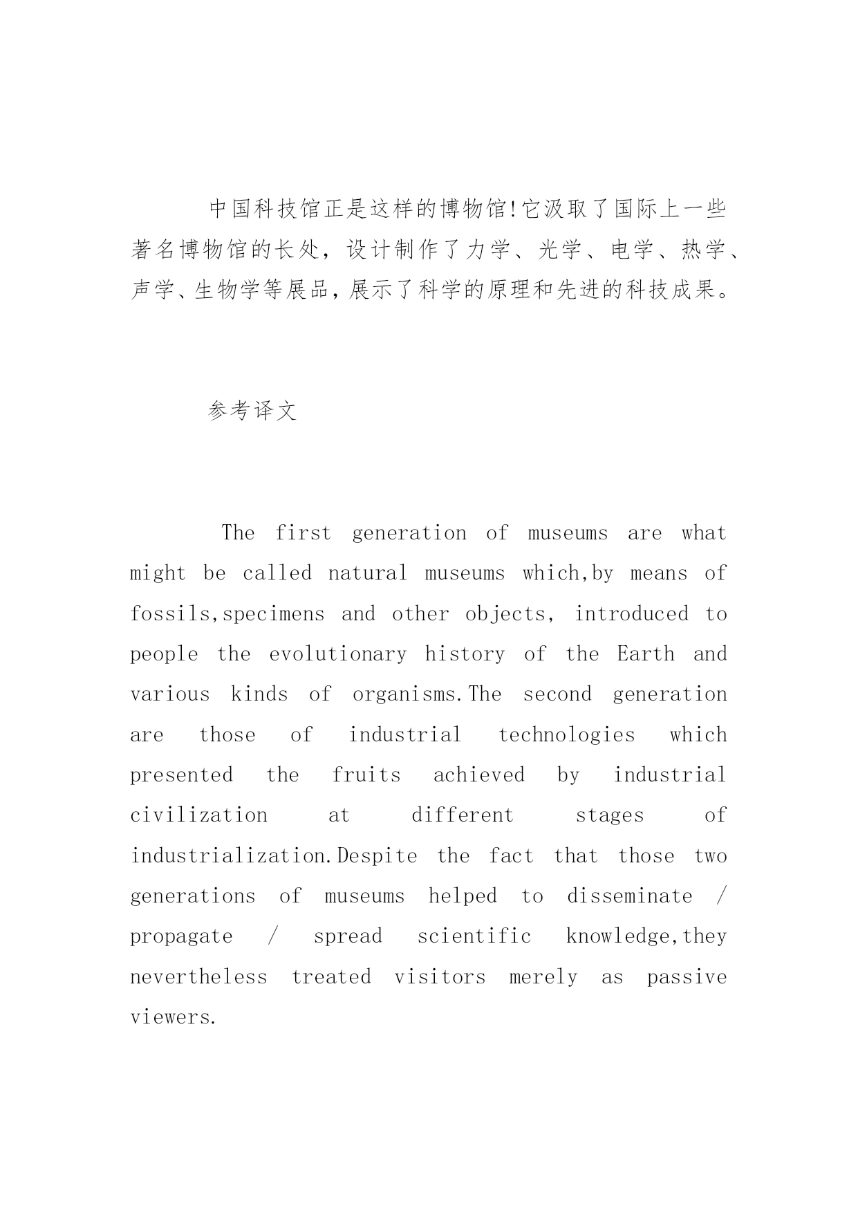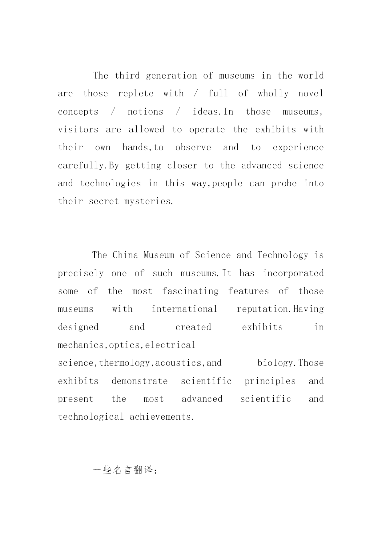 最新专八的翻译练习 最新专八的翻译练习 2018年的专八备考已经开始,现在小编为大家送上一篇专八的翻译练习,希望对大家有所帮助。 中国科技馆的诞生来之不易。与国际著名科技馆和其他博物馆相比,它先天有些不足,后天也常缺乏营养,但是它成长的.步伐却是坚实而有力的。它在国际上已被公认为后起之秀。 世界上第一代博物馆属于自然博物馆,它是通过化石、标本等向人们介绍地球和各种生物的演化历史。第二代属于工业技术博物馆,它所展示的是工业文明带来的各种阶段性结果。这两代博物馆虽然起到了传播科学知识的作用,但是,它们把参观者当成了被动的旁观者。 世界上第三代博物馆是充满全新理念的博物馆。在这里,观众可以自己去动手操作,自己细心体察。这样,他们可以更贴近先进的科学技术,去探索科学技术的奥妙。 中国科技馆正是这样的博物馆!它汲取了国际上一些著名博物馆的长处,设计制作了力学、光学、电学、热学、声学、生物学等展品,展示了科学的原理和先进的科技成果。 参考译文 Thefirstgenerationofmuseumsarewhatmightbecallednaturalmuseumswhich,bymeansoffossils,specimensandotherobjects,introducedtopeopletheevolutionaryhistoryoftheEarthandvariouskindsoforganisms.Thesecondgenerationarethoseofindustrialtechnologieswhichpresentedthefruitsachievedbyindustrialcivilizationatdifferentstagesofindustrialization.Despitethefactthatthosetwogenerationsofmuseumshelpedtodisseminate/propagate/spreadscientificknowledge,theyneverthelesstreatedvisitorsmerelyaspassiveviewers. Thethirdgenerationofmuseumsintheworldarethoserepletewith/fullofwhollynovelconcepts/notions/ideas.Inthosemuseums,visitorsareallowedtooperatetheexhibitswiththeirownhands,toobserveandtoexperiencecarefully.Bygettingclosertotheadvancedscienceandtechnologiesinthisway,peoplecanprobeintotheirsecretmysteries. TheChinaMuseumofScienceandTechnologyispreciselyoneofsuchmuseums.Ithasincorporatedsomeofthemostfascinatingfeaturesofthosemuseumswithinternationalreputation.Havingdesignedandcreatedexhibitsinmechanics,optics,electricalscience,thermology,acoustics,andbiology.Thoseexhibitsdemonstratescientificprinciplesandpresentthemostadvancedscientificandtechnologicalachievements. 一些名言翻译: 1.千里之行,始于足下。 2.诚实才是上策。 3.钱不是从天上掉下来的。 4.我知道我的未来不是梦。 5.反败为胜。 答案: 1.Ajourneyofathousandmilesbeginswithsinglestep. 2.Honestyisthebestpolicy. 3.Moneydoesn'tgrowontrees. 4.Iknowthatmyfutureisnotjustadream. 5.Toconvertdefeatintovictory.