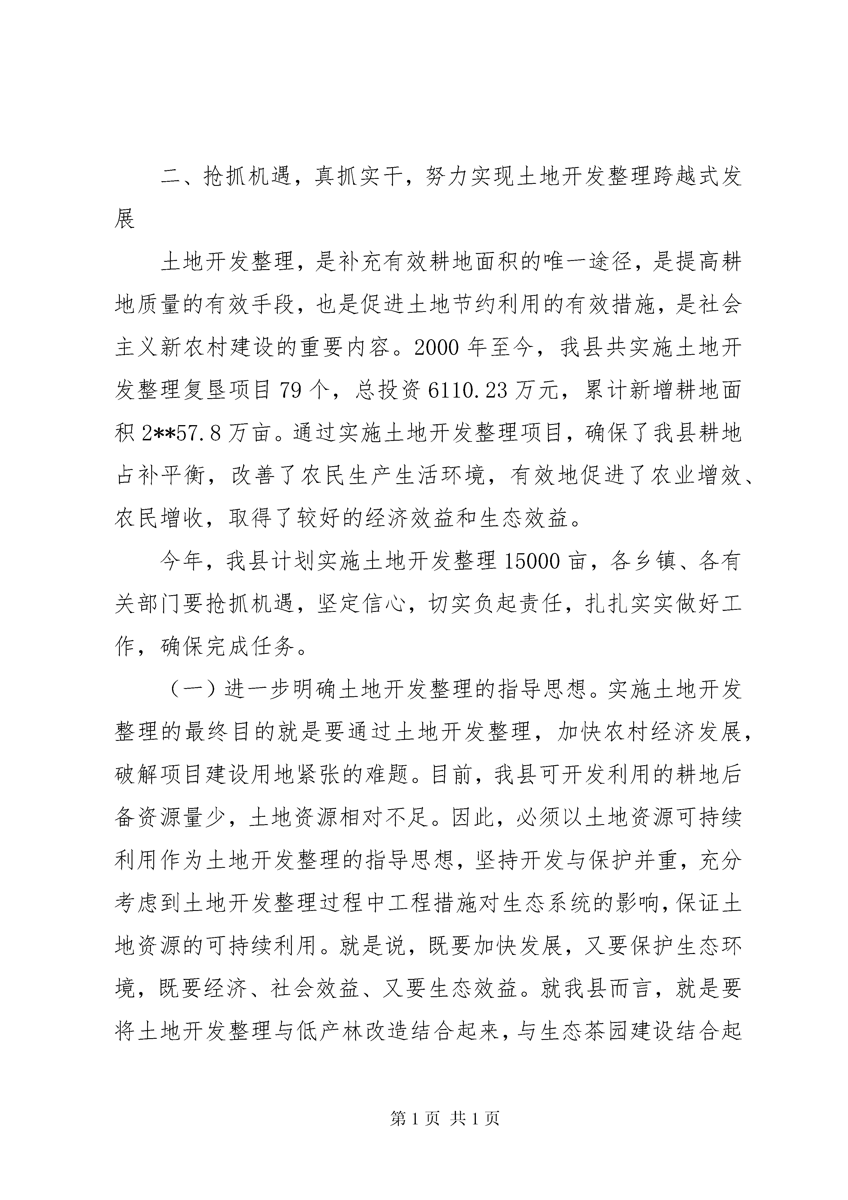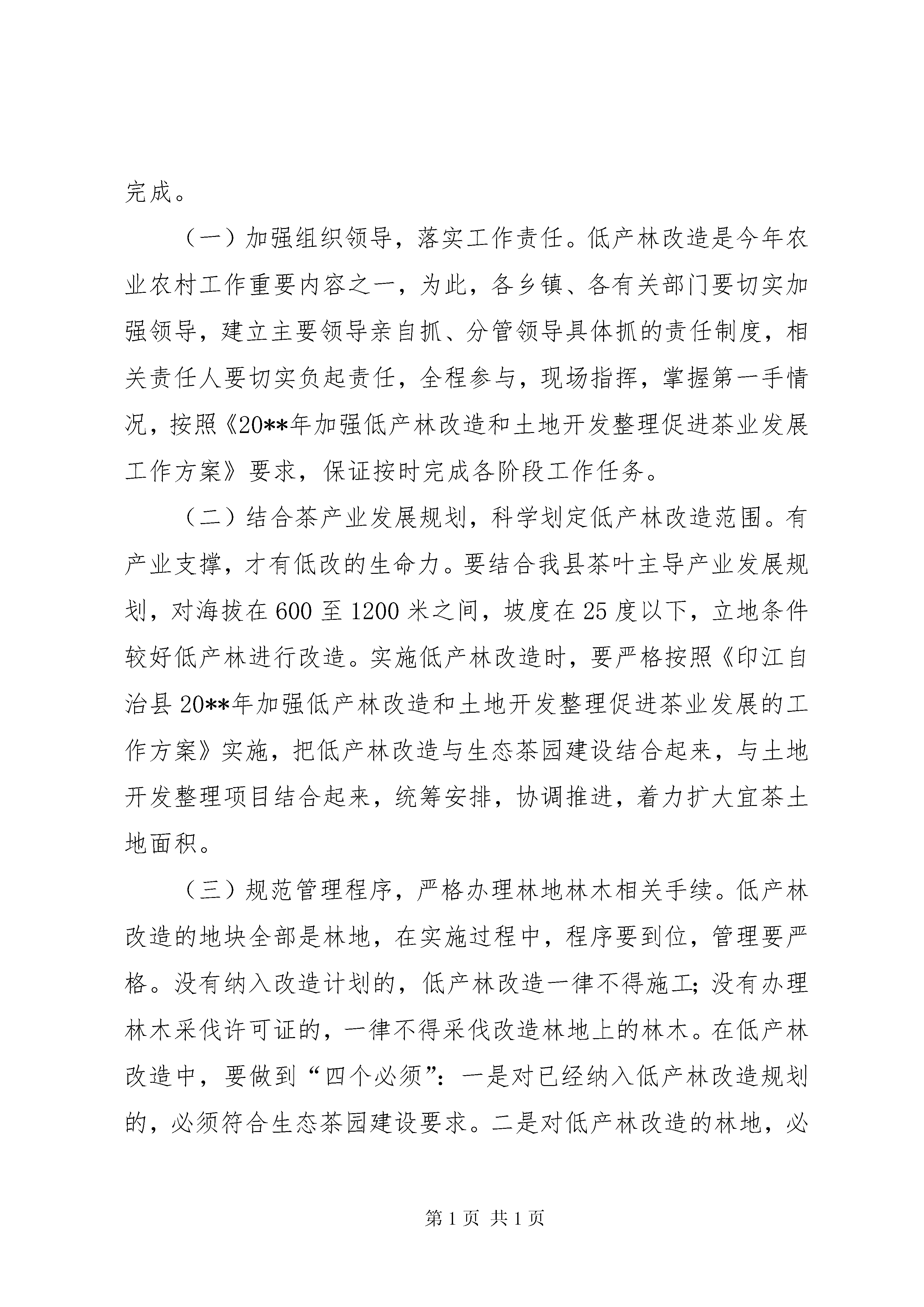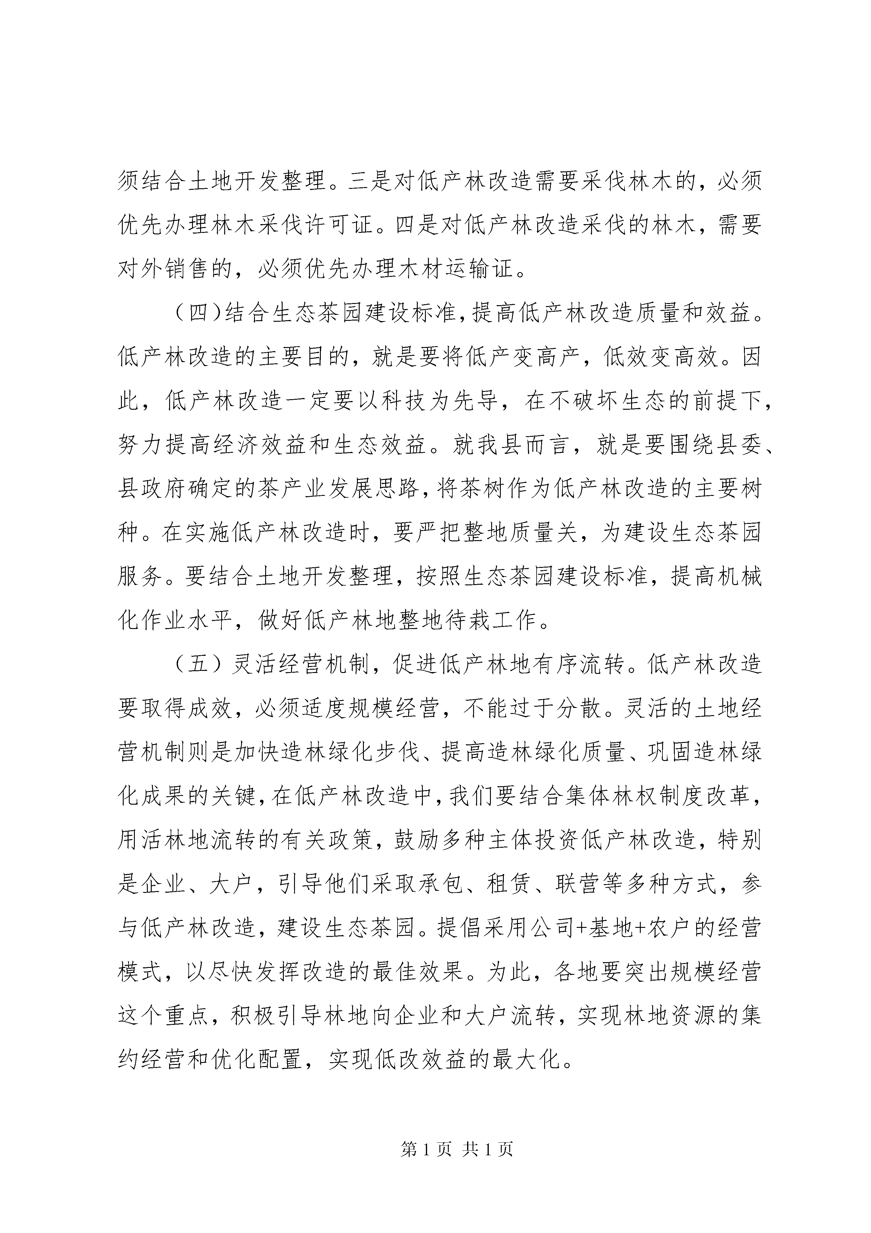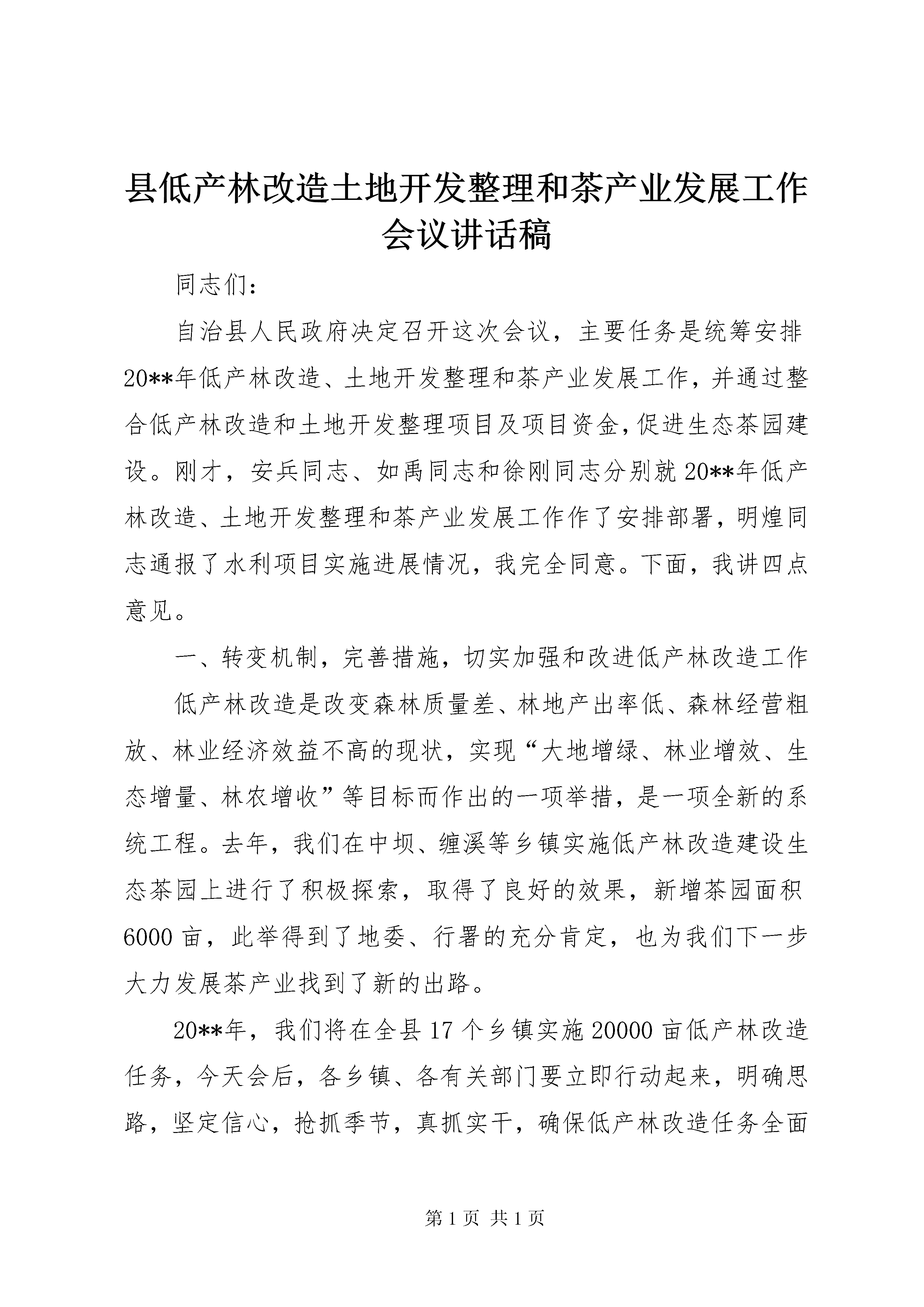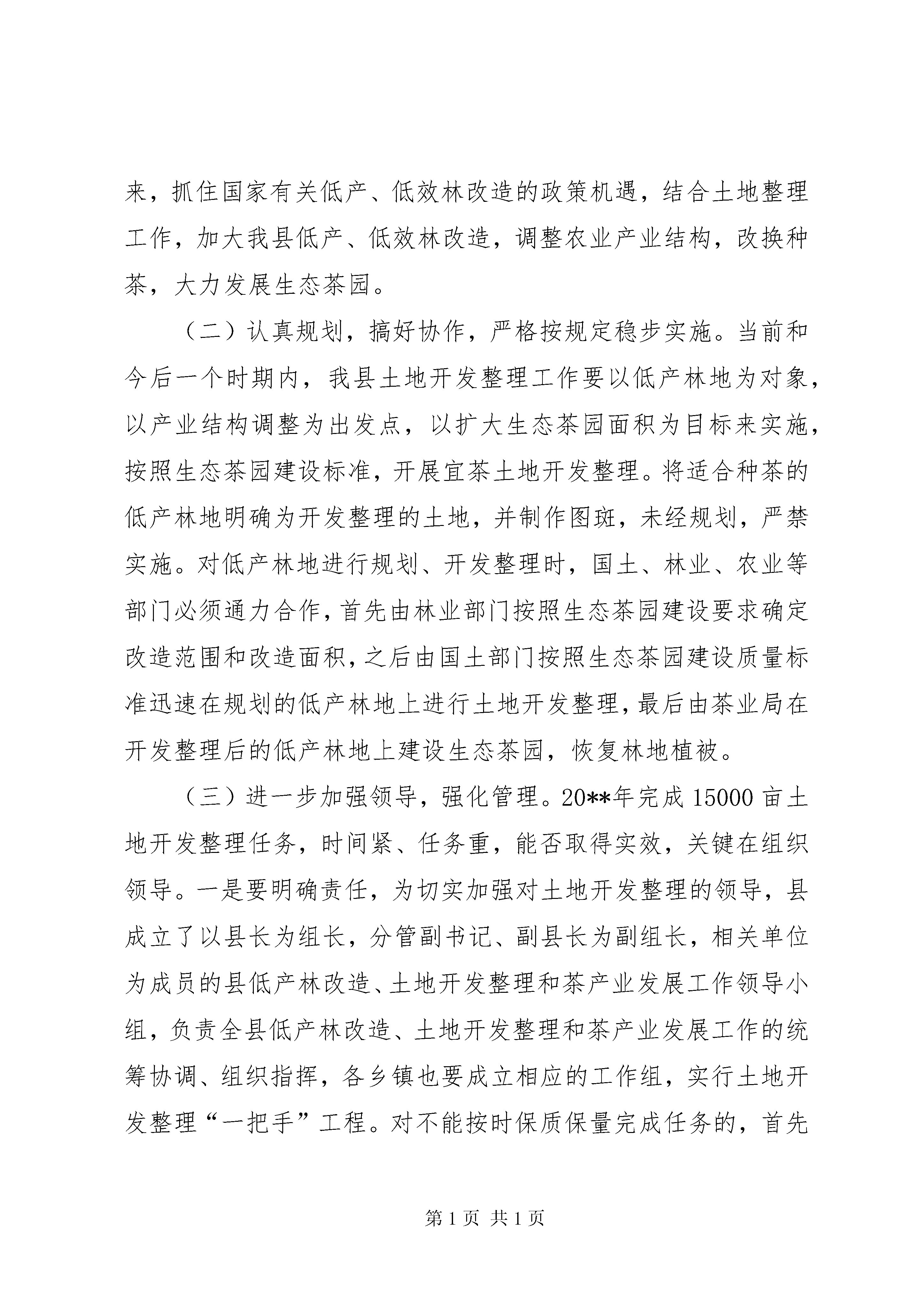 县低产林改造土地开发整理和茶产业发展工作会议讲话稿同志们:自治县人民政府决定召开这次会议,主要任务是统筹安排20**年低产林改造、土地开发整理和茶产业发展工作,并通过整合低产林改造和土地开发整理项目及项目资金,促进生态茶园建设。刚才,安兵同志、如禹同志和徐刚同志分别就20**年低产林改造、土地开发整理和茶产业发展工作作了安排部署,明煌同志通报了水利项目实施进展情况,我完全同意。下面,我讲四点意见。一、转变机制,完善措施,切实加强和改进低产林改造工作低产林改造是改变森林质量差、林地产出率低、森林经营粗放、林业经济效益不高的现状,实现“大地增绿、林业增效、生态增量、林农增收”等目标而作出的一项举措,是一项全新的系统工程。去年,我们在中坝、缠溪等乡镇实施低产林改造建设生态茶园上进行了积极探索,取得了良好的效果,新增茶园面积6000亩,此举得到了地委、行署的充分肯定,也为我们下一步大力发展茶产业找到了新的出路。20**年,我们将在全县17个乡镇实施20000亩低产林改造任务,今天会后,各乡镇、各有关部门要立即行动起来,明确思路,坚定信心,抢抓季节,真抓实干,确保低产林改造任务全面完成。(一)加强组织领导,落实工作责任。低产林改造是今年农业农村工作重要内容之一,为此,各乡镇、各有关部门要切实加强领导,建立主要领导亲自抓、分管领导具体抓的责任制度,相关责任人要切实负起责任,全程参与,现场指挥,掌握第一手情况,按照《20**年加强低产林改造和土地开发整理促进茶业发展工作方案》要求,保证按时完成各阶段工作任务。(二)结合茶产业发展规划,科学划定低产林改造范围。有产业支撑,才有低改的生命力。要结合我县茶叶主导产业发展规划,对海拔在600至1200米之间,坡度在25度以下,立地条件较好低产林进行改造。实施低产林改造时,要严格按照《印江自治县20**年加强低产林改造和土地开发整理促进茶业发展的工作方案》实施,把低产林改造与生态茶园建设结合起来,与土地开发整理项目结合起来,统筹安排,协调推进,着力扩大宜茶土地面积。(三)规范管理程序,严格办理林地林木相关手续。低产林改造的地块全部是林地,在实施过程中,程序要到位,管理要严格。没有纳入改造计划的,低产林改造一律不得施工;没有办理林木采伐许可证的,一律不得采伐改造林地上的林木。在低产林改造中,要做到“四个必须”:一是对已经纳入低产林改造规划的,必须符合生态茶园建设要求。二是对低产林改造的林地,必须结合土地开发整理。三是对低产林改造需要采伐林木的,必须优先办理林木采伐许可证。四是对低产林改造采伐的林木,需要对外销售的,必须优先办理木材运输证。(四)结合生态茶园建设标准,提高低产林改造质量和效益。低产林改造的主要目的,就是要将低产变高产,低效变高效。因此,低产林改造一定要以科技为先导,在不破坏生态的前提下,努力提高经济效益和生态效益。就我县而言,就是要围绕县委、县政府确定的茶产业发展思路,将茶树作为低产林改造的主要树种。在实施低产林改造时,要严把整地质量关,为建设生态茶园服务。要结合土地开发整理,按照生态茶园建设标准,提高机械化作业水平,做好低产林地整地待栽工作。(五)灵活经营机制,促进低产林地有序流转。低产林改造要取得成效,必须适度规模经营,不能过于分散。灵活的土地经营机制则是加快造林绿化步伐、提高造林绿化质量、巩固造林绿化成果的关键,在低产林改造中,我们要结合集体林权制度改革,用活林地流转的有关政策,鼓励多种主体投资低产林改造,特别是企业、大户,引导他们采取承包、租赁、联营等多种方式,参与低产林改造,建设生态茶园。提倡采用公司+基地+农户的经营模式,以尽快发挥改造的最佳效果。为此,各地要突出规模经营这个重点,积极引导林地向企业和大户流转,实现林地资源的集约经营和优化配置,实现低改效益的最大化。二、抢抓机遇,真抓实干,努力实现土地开发整理跨越式发展土地开发整理,是补充有效耕地面积的唯一途径,是提高耕地质量的有效手段,也是促进土地节约利用的有效措施,是社会主义新农村建设的重要内容。2000年至今,我县共实施土地开发整理复垦项目79个,总投资6110.23万元,累计新增耕地面积2**57.8万亩。通过实施土地开发整理项目,确保了我县耕地占补平衡,改善了农民生产生活环境,有效地促进了农业增效、农民增收,取得了较好的经济效益和生态效益。今年,我县计划实施土地开发整理15000亩,各乡镇、各有关部门要抢抓机遇,坚定信心,切实负起责任,扎扎实实做好工作,确保完成任务。(一)进一步明确土地开发整理的指导思想。实施土地开发整理的最终目的就是要通过土地开发整理,加快农村经济发展,破解项目建设用地紧张的难题。目前,我县可开发利用的耕地后备资源量少,土地资源相对不足。因此,必须以土地资源可持续利用作为土