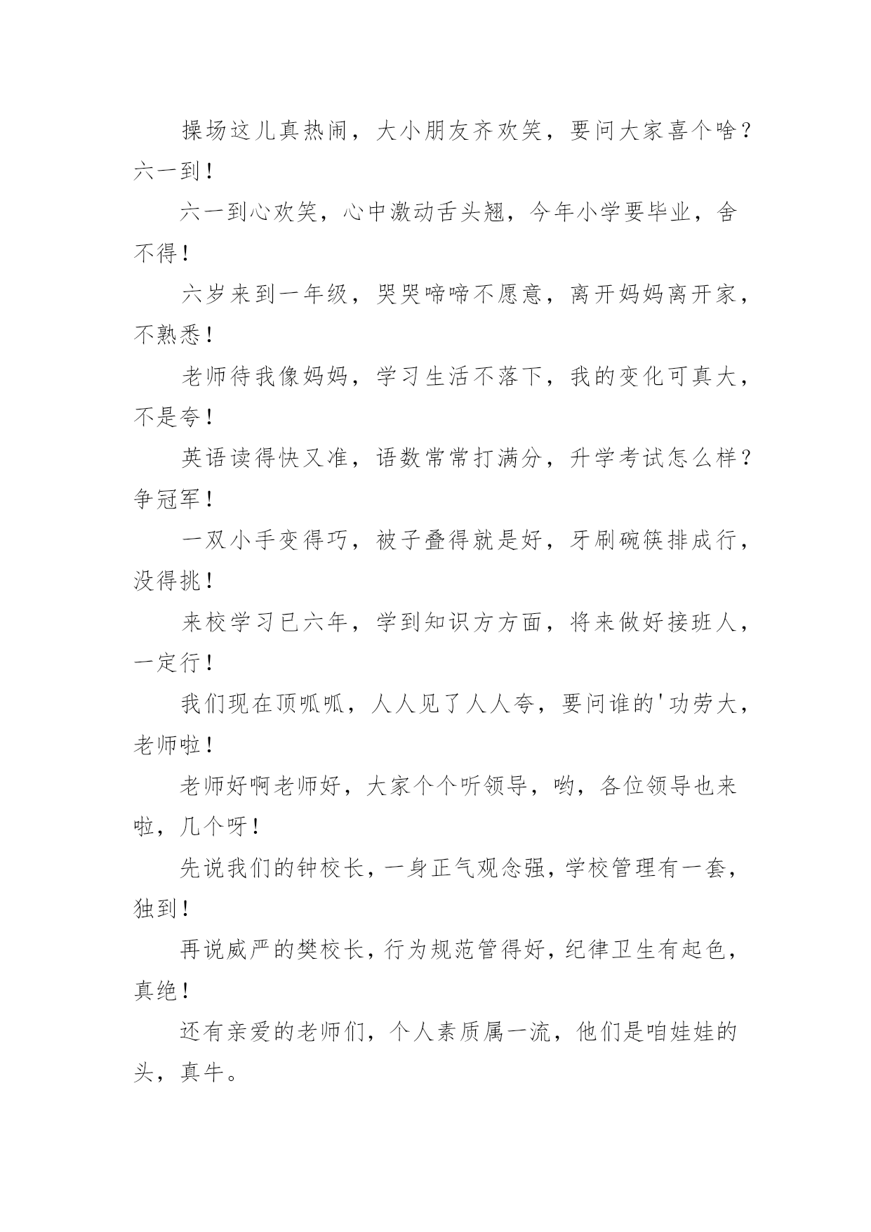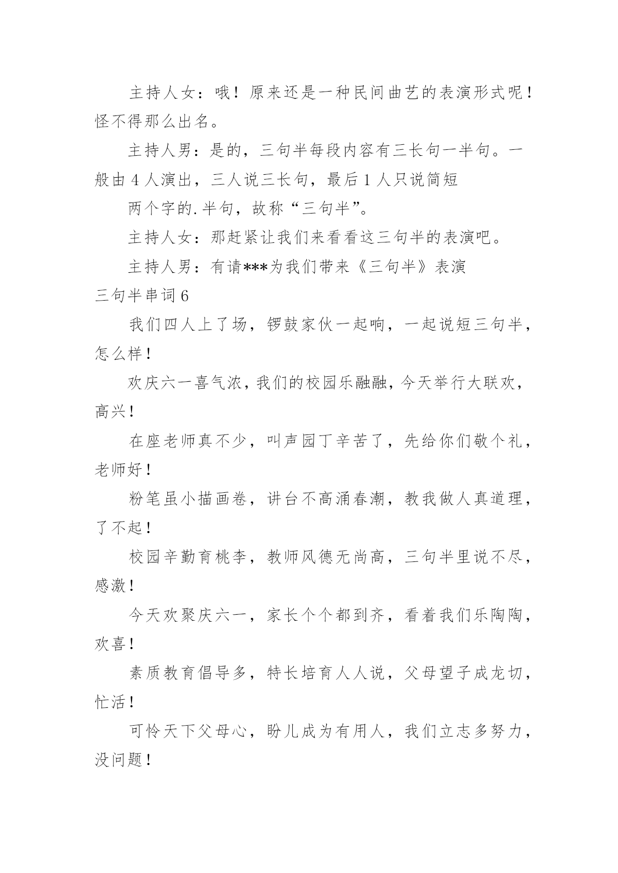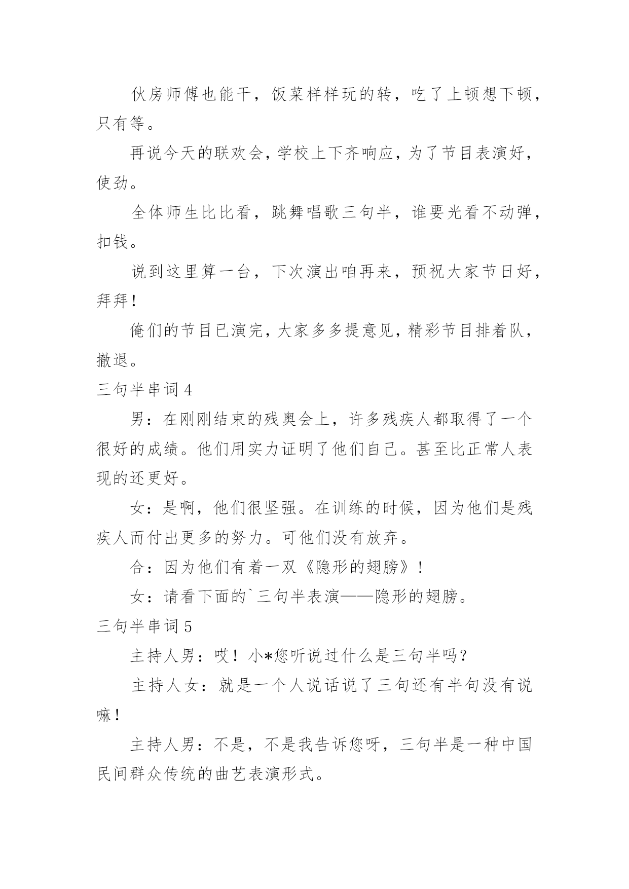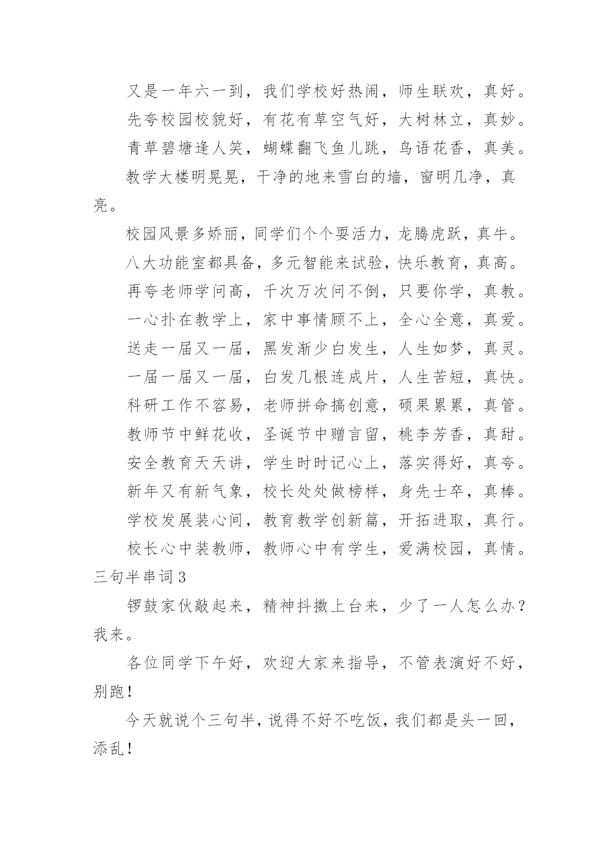 半串词 三句半串词(9篇)在当下的社会中,我们可以使用串词的机会越来越多,串词要求语言优美,它必须追求朗朗上口、铿锵有力,讲究抑扬顿挫,因而,串词语言注意章节美。是不是无从下笔、没有头绪?下面是小编帮大家整理的三句半串词,希望能够帮助到大家。三句半串词1主持人男:哎!小x您听说过什么是三句半吗?主持人女:就是一个人说话说了三句还有半句没有说嘛!主持人男:不是,不是我告诉您呀,三句半是一种中国民间群众传统的曲艺表演形式。主持人女:哦!原来还是一种民间曲艺的表演形式呢!怪不得那么出名。主持人男:是的,三句半每段内容有三长句一半句。一般由4人演出,三人说三长句,最后1人只说简短两个字的'半句,故称“三句半”。主持人女:那赶紧让我们来看看这三句半的表演吧。主持人男:有请xx为我们带来《三句半》表演。三句半串词2又是一年六一到,我们学校好热闹,师生联欢,真好。先夸校园校貌好,有花有草空气好,大树林立,真妙。青草碧塘逢人笑,蝴蝶翻飞鱼儿跳,鸟语花香,真美。教学大楼明晃晃,干净的地来雪白的墙,窗明几净,真亮。校园风景多娇丽,同学们个个耍活力,龙腾虎跃,真牛。八大功能室都具备,多元智能来试验,快乐教育,真高。再夸老师学问高,千次万次问不倒,只要你学,真教。一心扑在教学上,家中事情顾不上,全心全意,真爱。送走一届又一届,黑发渐少白发生,人生如梦,真灵。一届一届又一届,白发几根连成片,人生苦短,真快。科研工作不容易,老师拼命搞创意,硕果累累,真管。教师节中鲜花收,圣诞节中赠言留,桃李芳香,真甜。安全教育天天讲,学生时时记心上,落实得好,真夸。新年又有新气象,校长处处做榜样,身先士卒,真棒。学校发展装心间,教育教学创新篇,开拓进取,真行。校长心中装教师,教师心中有学生,爱满校园,真情。三句半串词3锣鼓家伙敲起来,精神抖擞上台来,少了一人怎么办?我来。各位同学下午好,欢迎大家来指导,不管表演好不好,别跑!今天就说个三句半,说得不好不吃饭,我们都是头一回,添乱!操场这儿真热闹,大小朋友齐欢笑,要问大家喜个啥?六一到!六一到心欢笑,心中激动舌头翘,今年小学要毕业,舍不得!六岁来到一年级,哭哭啼啼不愿意,离开妈妈离开家,不熟悉!老师待我像妈妈,学习生活不落下,我的变化可真大,不是夸!英语读得快又准,语数常常打满分,升学考试怎么样?争冠军!一双小手变得巧,被子叠得就是好,牙刷碗筷排成行,没得挑!来校学习已六年,学到知识方方面,将来做好接班人,一定行!我们现在顶呱呱,人人见了人人夸,要问谁的'功劳大,老师啦!老师好啊老师好,大家个个听领导,哟,各位领导也来啦,几个呀!先说我们的钟校长,一身正气观念强,学校管理有一套,独到!再说威严的樊校长,行为规范管得好,纪律卫生有起色,真绝!还有亲爱的老师们,个人素质属一流,他们是咱娃娃的头,真牛。伙房师傅也能干,饭菜样样玩的转,吃了上顿想下顿,只有等。再说今天的联欢会,学校上下齐响应,为了节目表演好,使劲。全体师生比比看,跳舞唱歌三句半,谁要光看不动弹,扣钱。说到这里算一台,下次演出咱再来,预祝大家节日好,拜拜!俺们的节目已演完,大家多多提意见,精彩节目排着队,撤退。三句半串词4男:在刚刚结束的残奥会上,许多残疾人都取得了一个很好的成绩。他们用实力证明了他们自己。甚至比正常人表现的还更好。女:是啊,他们很坚强。在训练的时候,因为他们是残疾人而付出更多的努力。可他们没有放弃。合:因为他们有着一双《隐形的翅膀》!女:请看下面的`三句半表演——隐形的翅膀。三句半串词5主持人男:哎!小*您听说过什么是三句半吗?主持人女:就是一个人说话说了三句还有半句没有说嘛!主持人男:不是,不是我告诉您呀,三句半是一种中国民间群众传统的曲艺表演形式。主持人女:哦!原来还是一种民间曲艺的表演形式呢!怪不得那么出名。主持人男:是的,三句半每段内容有三长句一半句。一般由4人演出,三人说三长句,最后1人只说简短两个字的.半句,故称“三句半”。主持人女:那赶紧让我们来看看这三句半的表演吧。主持人男:有请***为我们带来《三句半》表演三句半串词6我们四人上了场,锣鼓家伙一起响,一起说短三句半,怎么样!欢庆六一喜气浓,我们的校园乐融融,今天举行大联欢,高兴!在座老师真不少,叫声园丁辛苦了,先给你们敬个礼,老师好!粉笔虽小描画卷,讲台不高涌春潮,教我做人真道理,了不起!校园辛勤育桃李,教师风德无尚高,三句半里说不尽,感激!今天欢聚庆六一,家长个个都到齐,看着我们乐陶陶,欢喜!素质教育倡导多,特长培育人人说,父母望子成龙切,忙活!可怜天下父母心,盼儿成为有用人,我们立志多努力,没问题!六月风光多美好,大好光阴惜年少,放飞理想乘春风,向前冲!现在共勉好同学,勤奋刻苦努力学,祖国发展需人才,我来!说到这里算一台,下次演出咱再来,预祝伙伴们节日好,拜拜!三句半串词7锣