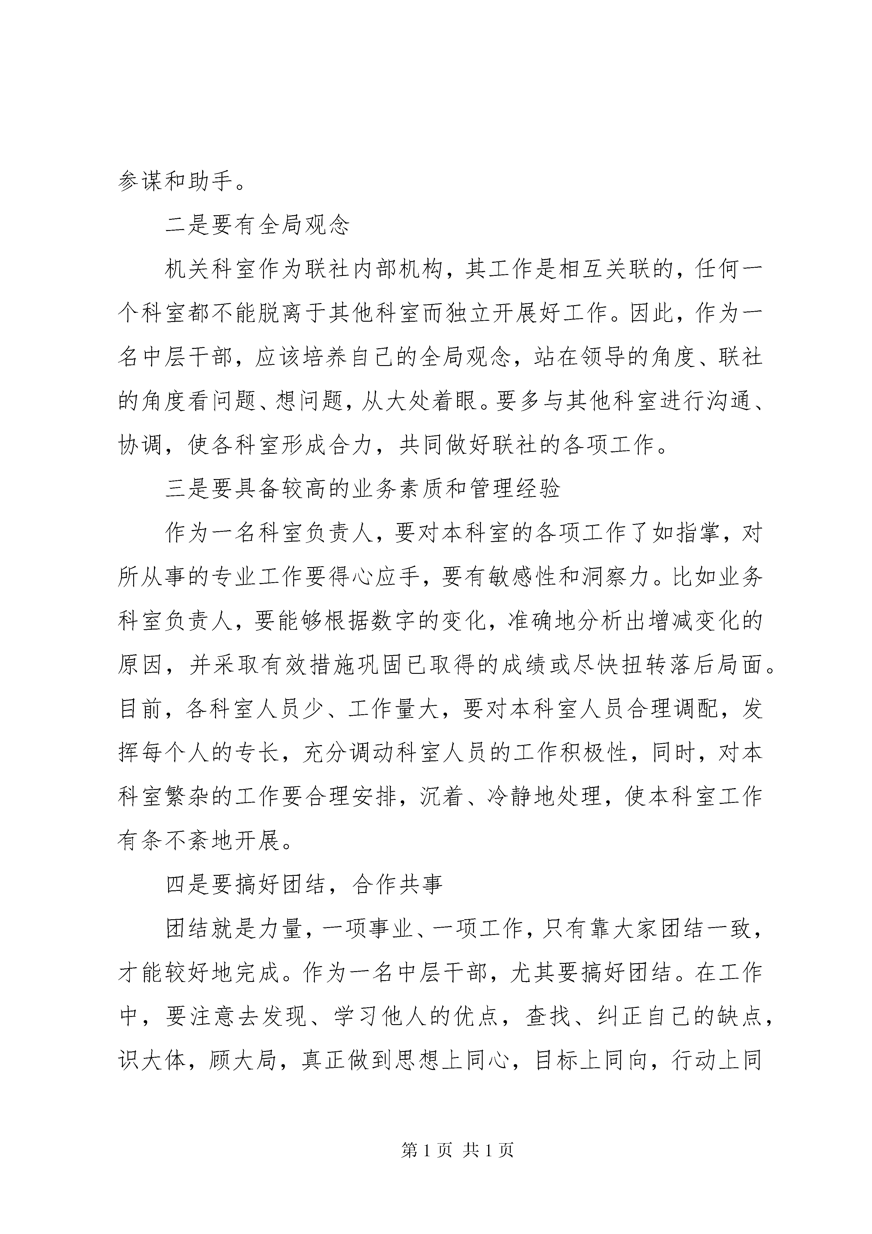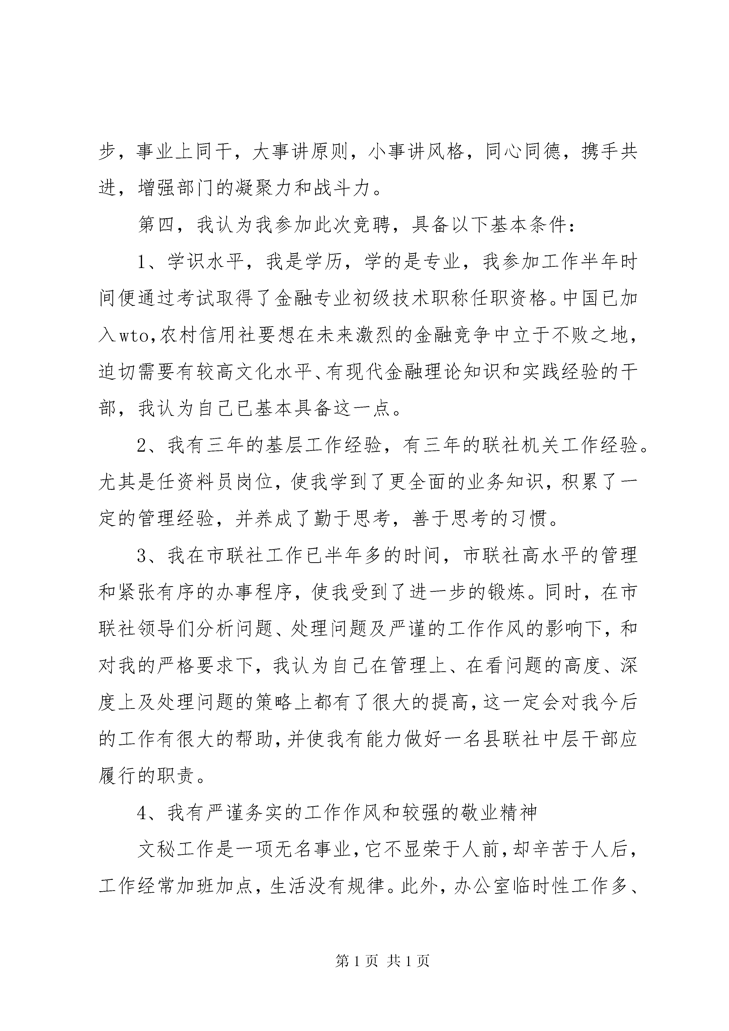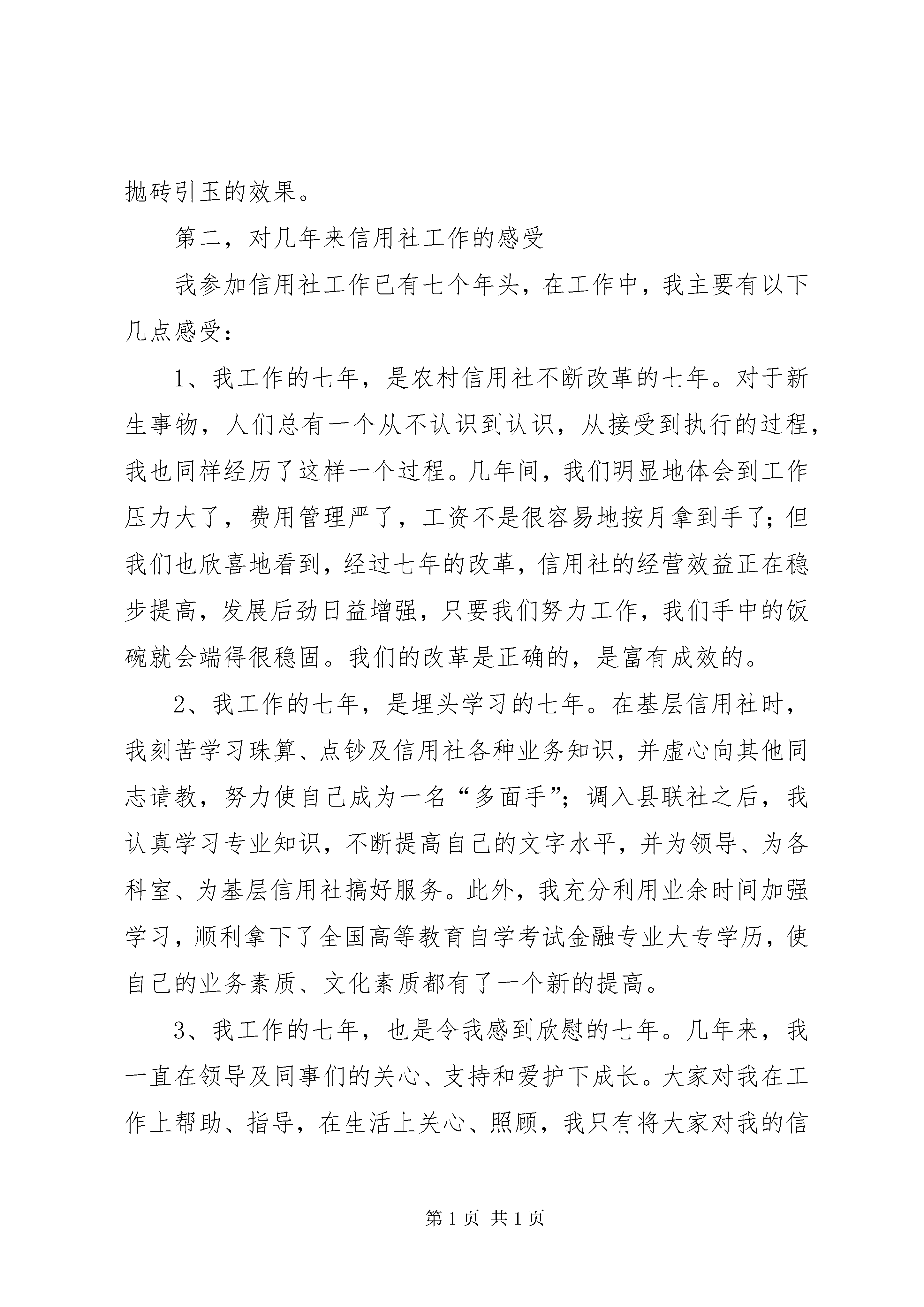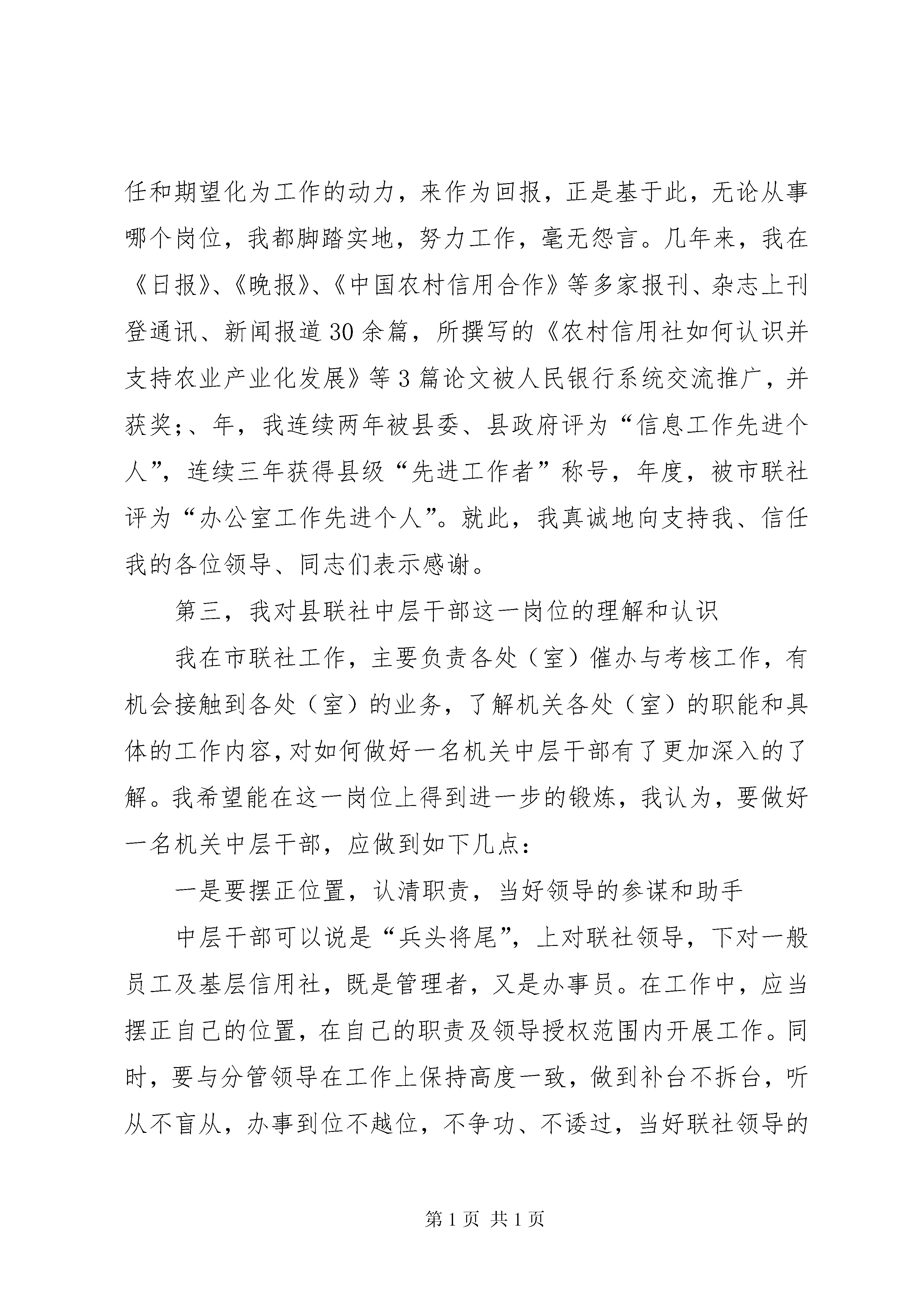 县信用联社干部竞职演讲稿各位领导、评委、同事们:你们好。首先,我感谢各位领导和同事们给我这样一个机会,来竞聘县联社中层干部资格。对于我,大家可能并不陌生。但在这样一个场合,我还是先做一下自我介绍吧。我叫,岁,文化,年参加信用社工作,历任信用社出纳员、信贷员,年月至年月任联社办公室资料员,年月起任市联社办公室资料员至今。(我强调一下:今天没有明确竞聘某一职务,因此,对各岗位的具体工作思路暂不涉及。)下面,我主要谈一谈我这次竞聘的目的、对过来工作的感受以及自己对中层岗位的理解和认识。第一,参加竞聘的目的此次竞聘演讲大会是继2*0年10月“三定两聘”工作之后,我县人事制度改革的进一步深化和又一次具体实践,充分证明我县农村信用社公开、公平、公正的竞争机制和人才选拔机制已经建立并得以顺利推行。我参加此次竞聘,目的有两个:一是想展示一下自己的能力。我到市联社已有半年多的时间,已经适应了市联社的工作环境,我并不是为了和任何人争位子;二是想通过我和在座各位的共同参与,使真正懂经营、善管理、德才兼备的优秀人才脱颖而出,建立起一支年轻化、知识化、专业化的干部队伍,促进我县信用合作事业的快速发展,希望我这样做能起到抛砖引玉的效果。第二,对几年来信用社工作的感受我参加信用社工作已有七个年头,在工作中,我主要有以下几点感受:1、我工作的七年,是农村信用社不断改革的七年。对于新生事物,人们总有一个从不认识到认识,从接受到执行的过程,我也同样经历了这样一个过程。几年间,我们明显地体会到工作压力大了,费用管理严了,工资不是很容易地按月拿到手了;但我们也欣喜地看到,经过七年的改革,信用社的经营效益正在稳步提高,发展后劲日益增强,只要我们努力工作,我们手中的饭碗就会端得很稳固。我们的改革是正确的,是富有成效的。2、我工作的七年,是埋头学习的七年。在基层信用社时,我刻苦学习珠算、点钞及信用社各种业务知识,并虚心向其他同志请教,努力使自己成为一名“多面手”;调入县联社之后,我认真学习专业知识,不断提高自己的文字水平,并为领导、为各科室、为基层信用社搞好服务。此外,我充分利用业余时间加强学习,顺利拿下了全国高等教育自学考试金融专业大专学历,使自己的业务素质、文化素质都有了一个新的提高。3、我工作的七年,也是令我感到欣慰的七年。几年来,我一直在领导及同事们的关心、支持和爱护下成长。大家对我在工作上帮助、指导,在生活上关心、照顾,我只有将大家对我的信任和期望化为工作的动力,来作为回报,正是基于此,无论从事哪个岗位,我都脚踏实地,努力工作,毫无怨言。几年来,我在《日报》、《晚报》、《中国农村信用合作》等多家报刊、杂志上刊登通讯、新闻报道30余篇,所撰写的《农村信用社如何认识并支持农业产业化发展》等3篇论文被人民银行系统交流推广,并获奖;、年,我连续两年被县委、县政府评为“信息工作先进个人”,连续三年获得县级“先进工作者”称号,年度,被市联社评为“办公室工作先进个人”。就此,我真诚地向支持我、信任我的各位领导、同志们表示感谢。第三,我对县联社中层干部这一岗位的理解和认识我在市联社工作,主要负责各处(室)催办与考核工作,有机会接触到各处(室)的业务,了解机关各处(室)的职能和具体的工作内容,对如何做好一名机关中层干部有了更加深入的了解。我希望能在这一岗位上得到进一步的锻炼,我认为,要做好一名机关中层干部,应做到如下几点:一是要摆正位置,认清职责,当好领导的参谋和助手中层干部可以说是“兵头将尾”,上对联社领导,下对一般员工及基层信用社,既是管理者,又是办事员。在工作中,应当摆正自己的位置,在自己的职责及领导授权范围内开展工作。同时,要与分管领导在工作上保持高度一致,做到补台不拆台,听从不盲从,办事到位不越位,不争功、不诿过,当好联社领导的参谋和助手。二是要有全局观念机关科室作为联社内部机构,其工作是相互关联的,任何一个科室都不能脱离于其他科室而独立开展好工作。因此,作为一名中层干部,应该培养自己的全局观念,站在领导的角度、联社的角度看问题、想问题,从大处着眼。要多与其他科室进行沟通、协调,使各科室形成合力,共同做好联社的各项工作。三是要具备较高的业务素质和管理经验作为一名科室负责人,要对本科室的各项工作了如指掌,对所从事的专业工作要得心应手,要有敏感性和洞察力。比如业务科室负责人,要能够根据数字的变化,准确地分析出增减变化的原因,并采取有效措施巩固已取得的成绩或尽快扭转落后局面。目前,各科室人员少、工作量大,要对本科室人员合理调配,发挥每个人的专长,充分调动科室人员的工作积极性,同时,对本科室繁杂的工作要合理安排,沉着、冷静地处理,使本科室工作有条不紊地开展。四是要搞好团结,合作共事团结就是力量,一项事业、一项工作,只有靠大家团结一致,才能较好地完成。作