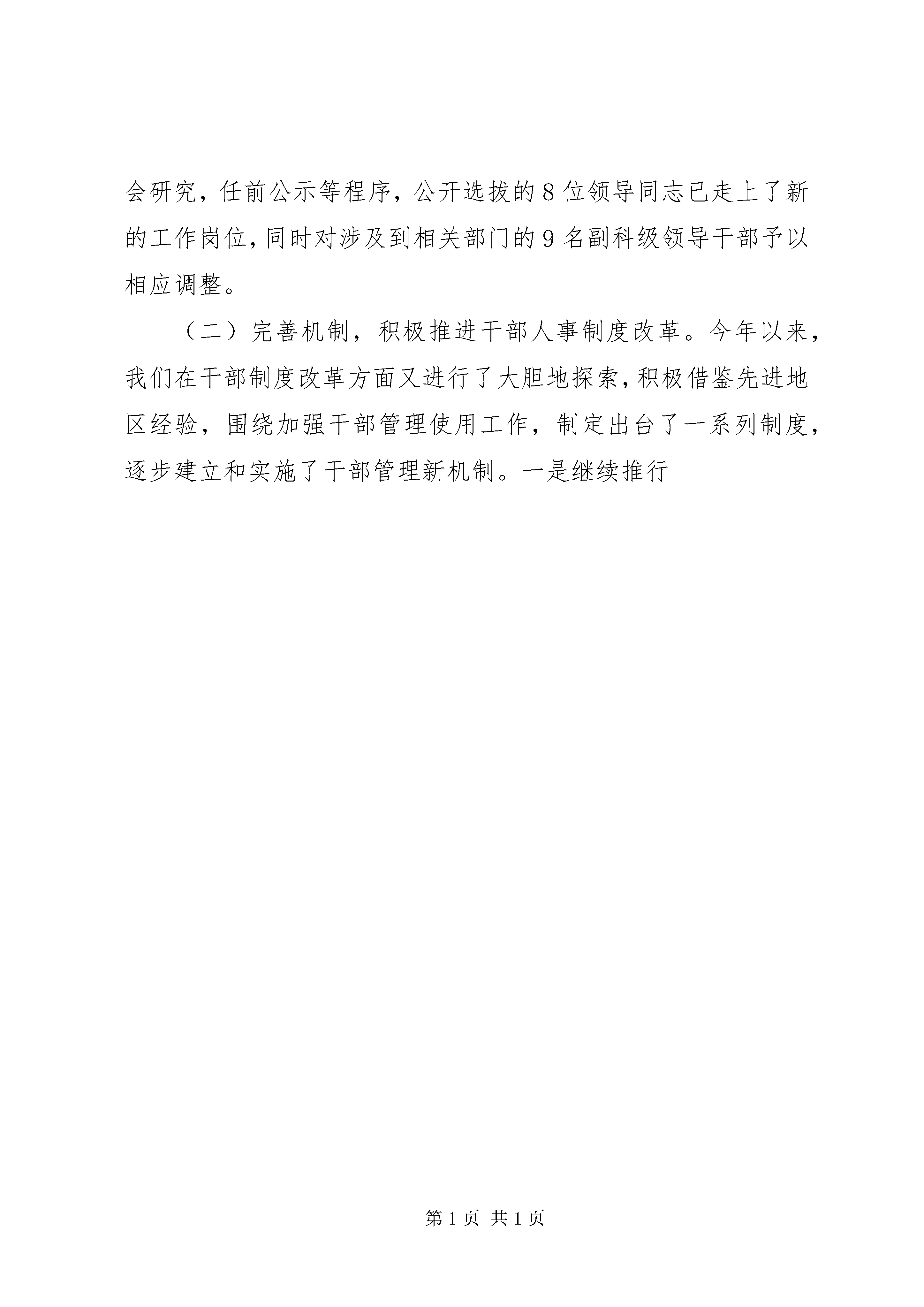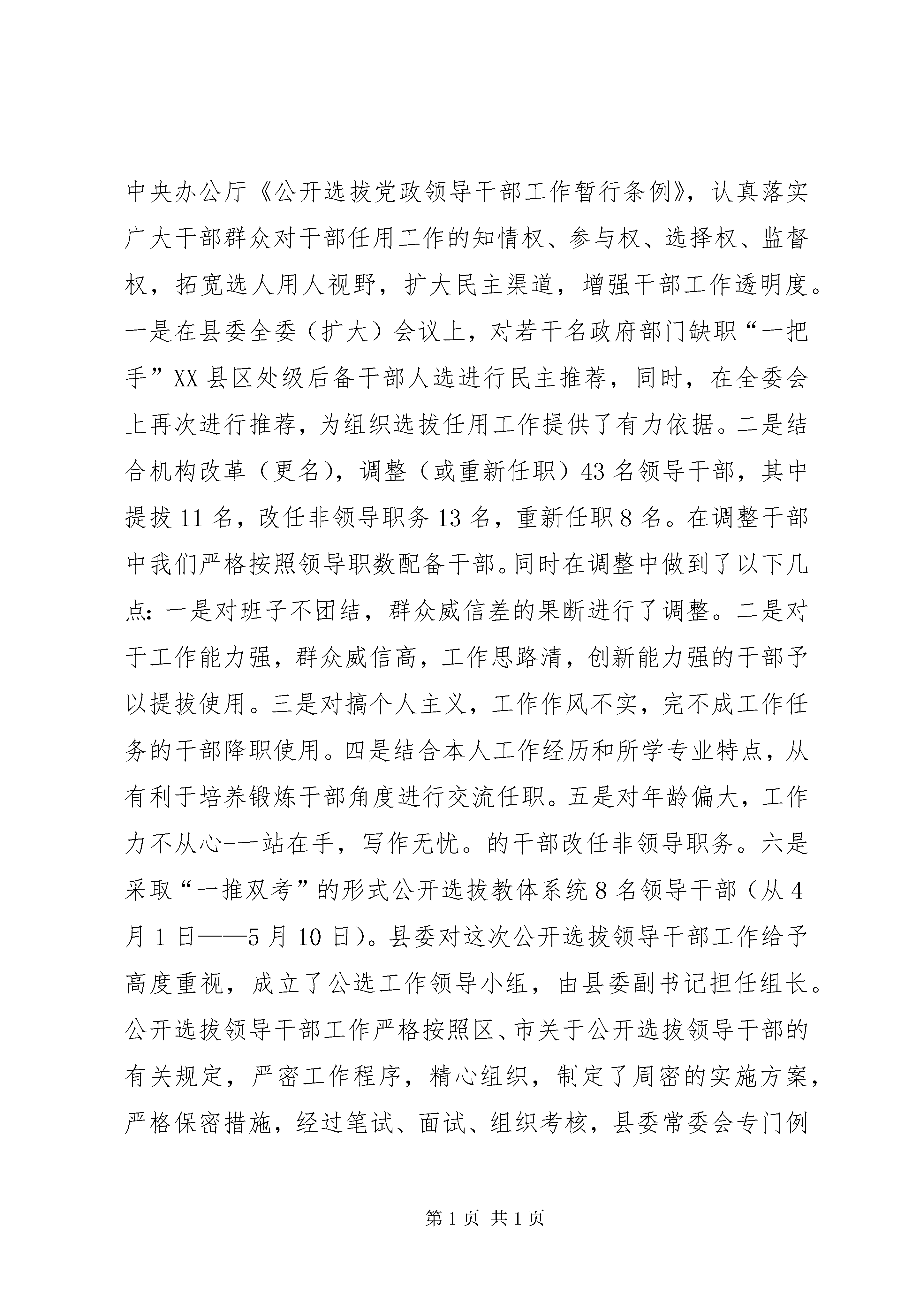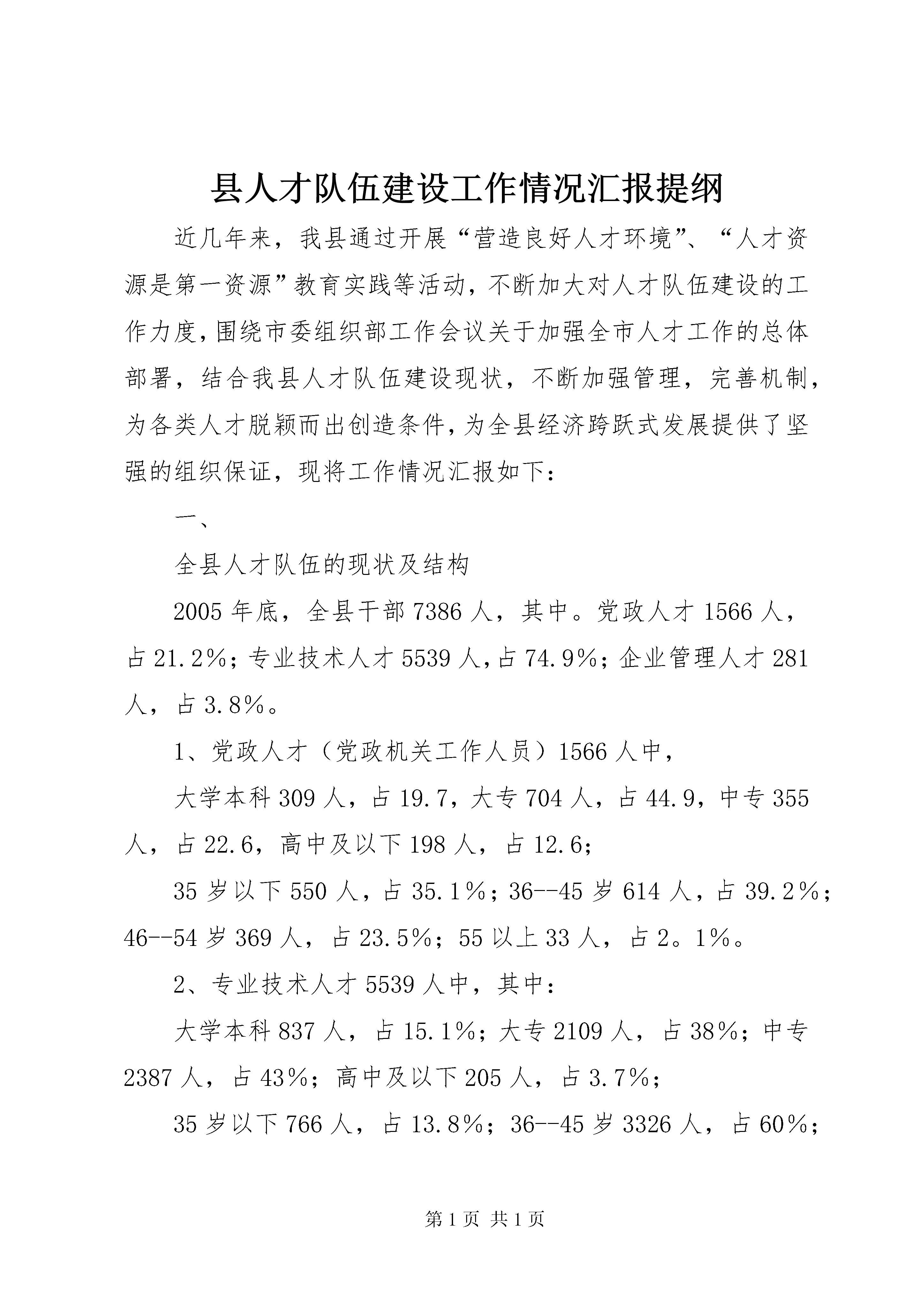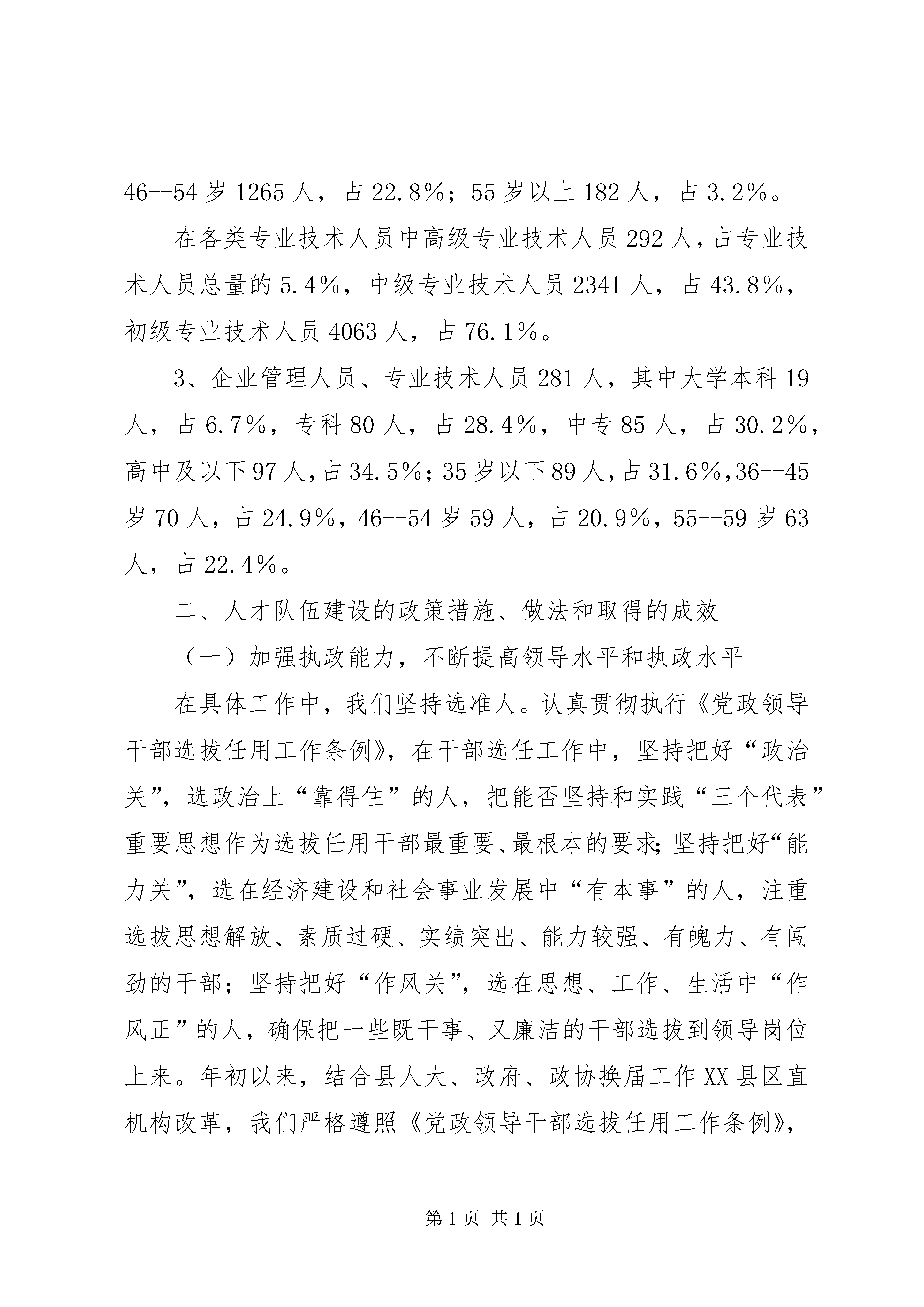 县人才队伍建设工作情况汇报提纲近几年来,我县通过开展“营造良好人才环境”、“人才资源是第一资源”教育实践等活动,不断加大对人才队伍建设的工作力度,围绕市委组织部工作会议关于加强全市人才工作的总体部署,结合我县人才队伍建设现状,不断加强管理,完善机制,为各类人才脱颖而出创造条件,为全县经济跨跃式发展提供了坚强的组织保证,现将工作情况汇报如下:一、全县人才队伍的现状及结构2005年底,全县干部7386人,其中。党政人才1566人,占21.2%;专业技术人才5539人,占74.9%;企业管理人才281人,占3.8%。1、党政人才(党政机关工作人员)1566人中,大学本科309人,占19.7,大专704人,占44.9,中专355人,占22.6,高中及以下198人,占12.6;35岁以下550人,占35.1%;36--45岁614人,占39.2%;46--54岁369人,占23.5%;55以上33人,占2。1%。2、专业技术人才5539人中,其中:大学本科837人,占15.1%;大专2109人,占38%;中专2387人,占43%;高中及以下205人,占3.7%;35岁以下766人,占13.8%;36--45岁3326人,占60%;46--54岁1265人,占22.8%;55岁以上182人,占3.2%。在各类专业技术人员中高级专业技术人员292人,占专业技术人员总量的5.4%,中级专业技术人员2341人,占43.8%,初级专业技术人员4063人,占76.1%。3、企业管理人员、专业技术人员281人,其中大学本科19人,占6.7%,专科80人,占28.4%,中专85人,占30.2%,高中及以下97人,占34.5%;35岁以下89人,占31.6%,36--45岁70人,占24.9%,46--54岁59人,占20.9%,55--59岁63人,占22.4%。二、人才队伍建设的政策措施、做法和取得的成效(一)加强执政能力,不断提高领导水平和执政水平在具体工作中,我们坚持选准人。认真贯彻执行《党政领导干部选拔任用工作条例》,在干部选任工作中,坚持把好“政治关”,选政治上“靠得住”的人,把能否坚持和实践“三个代表”重要思想作为选拔任用干部最重要、最根本的要求;坚持把好“能力关”,选在经济建设和社会事业发展中“有本事”的人,注重选拔思想解放、素质过硬、实绩突出、能力较强、有魄力、有闯劲的干部;坚持把好“作风关”,选在思想、工作、生活中“作风正”的人,确保把一些既干事、又廉洁的干部选拔到领导岗位上来。年初以来,结合县人大、政府、政协换届工作XX县区直机构改革,我们严格遵照《党政领导干部选拔任用工作条例》,中央办公厅《公开选拔党政领导干部工作暂行条例》,认真落实广大干部群众对干部任用工作的知情权、参与权、选择权、监督权,拓宽选人用人视野,扩大民主渠道,增强干部工作透明度。一是在县委全委(扩大)会议上,对若干名政府部门缺职“一把手”XX县区处级后备干部人选进行民主推荐,同时,在全委会上再次进行推荐,为组织选拔任用工作提供了有力依据。二是结合机构改革(更名),调整(或重新任职)43名领导干部,其中提拔11名,改任非领导职务13名,重新任职8名。在调整干部中我们严格按照领导职数配备干部。同时在调整中做到了以下几点:一是对班子不团结,群众威信差的果断进行了调整。二是对于工作能力强,群众威信高,工作思路清,创新能力强的干部予以提拔使用。三是对搞个人主义,工作作风不实,完不成工作任务的干部降职使用。四是结合本人工作经历和所学专业特点,从有利于培养锻炼干部角度进行交流任职。五是对年龄偏大,工作力不从心-一站在手,写作无忧。的干部改任非领导职务。六是采取“一推双考”的形式公开选拔教体系统8名领导干部(从4月1日——5月10日)。县委对这次公开选拔领导干部工作给予高度重视,成立了公选工作领导小组,由县委副书记担任组长。公开选拔领导干部工作严格按照区、市关于公开选拔领导干部的有关规定,严密工作程序,精心组织,制定了周密的实施方案,严格保密措施,经过笔试、面试、组织考核,县委常委会专门例会研究,任前公示等程序,公开选拔的8位领导同志已走上了新的工作岗位,同时对涉及到相关部门的9名副科级领导干部予以相应调整。(二)完善机制,积极推进干部人事制度改革。今年以来,我们在干部制度改革方面又进行了大胆地探索,积极借鉴先进地区经验,围绕加强干部管理使用工作,制定出台了一系列制度,逐步建立和实施了干部管理新机制。一是继续推行