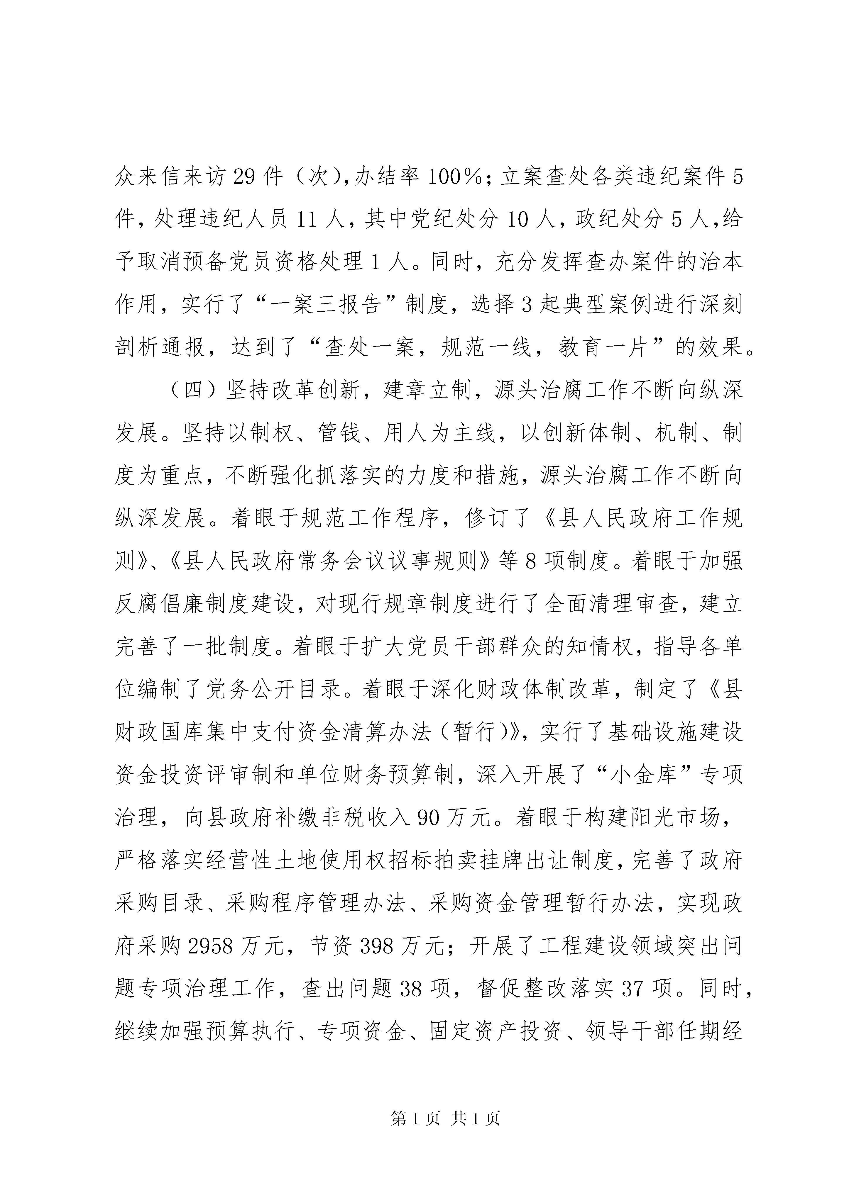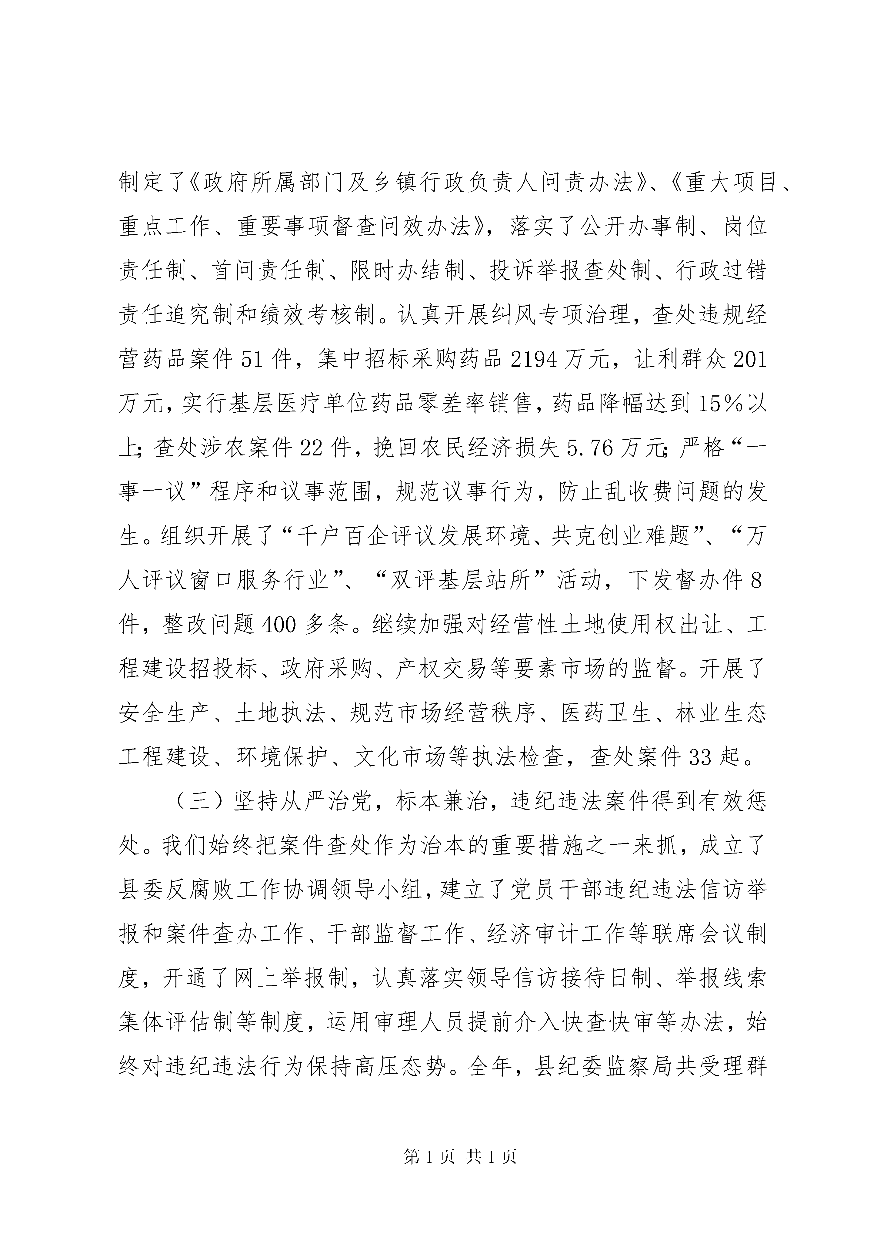 县党风廉政建设和反腐败工作会议领导讲话稿同志们:这次全县党风廉政建设和反腐败工作会议,是在全县上下认真学习贯彻县委十四届十八次全委(扩大)会暨全县经济工作会议时期召开的一次非常重要的会议。会议的主要任务是,传达学习十七届中央纪委六次全会、十一届省纪委六次全会和二届市纪委六次全会精神,认真贯彻落实县委十四届十八次全委(扩大)会暨全县经济工作会议精神,回顾总结2010年全县党风廉政建设和反腐败工作,研究部署2011年主要任务。县委对这次会议非常重视,会前专门听取了汇报,提出了明确要求,县委陈书记还要作重要讲话,我们一定要认真学习领会,坚决贯彻落实。下面,根据中央、省、市纪委全会精神,结合我县实际,我主要讲三个方面的意见:一、2010年党风廉政建设和反腐败工作回顾全县各级组织坚决贯彻中央、省市关于加强反腐倡廉建设的部署要求,紧紧围绕县委、县政府的中心工作,以实现庄浪经济社会跨越式发展为核心,以落实党风廉政建设责任制为抓手,以完善惩防体系建设为主线,全面落实“围绕七个方面,加强七项措施,着力推进党风廉政建设和反腐败工作深入开展”的整体工作思路,突出廉政教育、纠风治乱、监督检查、案件查办、源头治理等工作重点,求真务实,改革创新,各项工作取得了新的成效。(一)坚持强化教育,严格管理,党员干部拒腐防变能力进一步增强。先后两次组织开展了以“整肃风纪、解决问题、维护稳定、促进发展”、“正风肃纪、提高效能、改善服务、优化环境”为主题的干部作风集中整顿活动,查找问题、征求意见建议4088条,经归纳梳理共801条,下发督办件16件、通报件4件,全面整改落实738件,诫勉谈话3人,党内警告1人,党内严重警告及行政撤职1人,取消预备党员资格、组织处理调离原工作岗位1人。围绕学习贯彻《廉政准则》,编印了《党员领导干部作风建设制度摘编》,在全县4424名党员干部中开展了理论知识测试,增强了党员领导干部的廉洁从政意识。扎实推进廉政文化建设,下发了《关于培育党风廉政建设示范点的通知》,确立示范点53个,其中梯田化模xx县纪念馆xx县国税局、县职教中心被市上分别命名为全市廉政教育基地、廉政文化“六进”示范点。认真落实党内监督条例,严格执行领导干部诫勉谈话、函询、质询等制度,对102名新提拔科级干部进行了集体廉政谈话,对4名领导干部进行了诫勉谈话,有效规范了党员干部的行为。(二)坚持执政为民,关注民生,损害群众利益的突出问题得到有效遏制。协调督促、积极会同有关部门对中央、省、市、县确定的各项惠农政策措施落实情况进行监督检查,纠正和查处了一批损害群众利益的突出问题。着力加强党风廉政建设,县上制定了《政府所属部门及乡镇行政负责人问责办法》、《重大项目、重点工作、重要事项督查问效办法》,落实了公开办事制、岗位责任制、首问责任制、限时办结制、投诉举报查处制、行政过错责任追究制和绩效考核制。认真开展纠风专项治理,查处违规经营药品案件51件,集中招标采购药品2194万元,让利群众201万元,实行基层医疗单位药品零差率销售,药品降幅达到15%以上;查处涉农案件22件,挽回农民经济损失5.76万元;严格“一事一议”程序和议事范围,规范议事行为,防止乱收费问题的发生。组织开展了“千户百企评议发展环境、共克创业难题”、“万人评议窗口服务行业”、“双评基层站所”活动,下发督办件8件,整改问题400多条。继续加强对经营性土地使用权出让、工程建设招投标、政府采购、产权交易等要素市场的监督。开展了安全生产、土地执法、规范市场经营秩序、医药卫生、林业生态工程建设、环境保护、文化市场等执法检查,查处案件33起。(三)坚持从严治党,标本兼治,违纪违法案件得到有效惩处。我们始终把案件查处作为治本的重要措施之一来抓,成立了县委反腐败工作协调领导小组,建立了党员干部违纪违法信访举报和案件查办工作、干部监督工作、经济审计工作等联席会议制度,开通了网上举报制,认真落实领导信访接待日制、举报线索集体评估制等制度,运用审理人员提前介入快查快审等办法,始终对违纪违法行为保持高压态势。全年,县纪委监察局共受理群众来信来访29件(次),办结率100%;立案查处各类违纪案件5件,处理违纪人员11人,其中党纪处分10人,政纪处分5人,给予取消预备党员资格处理1人。同时,充分发挥查办案件的治本作用,实行了“一案三报告”制度,选择3起典型案例进行深刻剖析通报,达到了“查处一案,规范一线,教育一片”的效果。(四)坚持改革创新,建章立制,源头治腐工作不断向纵深发展。坚持以制权、管钱、用人为主线,以创新体制、机制、制度为重点,不断强化抓落实的力度和措施,源头治腐工作不断向纵深发展。着眼于规范工作程序,修订了《县人民政府工作规则》、《县人民政府常务会议议事规则》等8项制度。着眼于加强反腐倡廉制度建设,对现行规