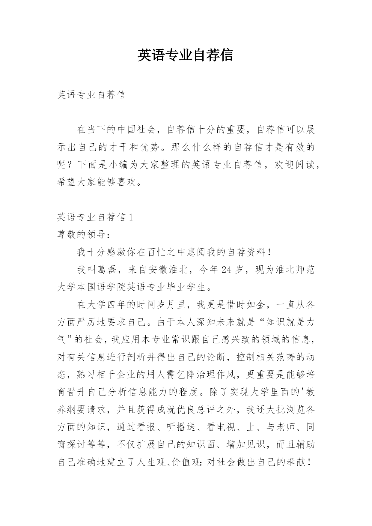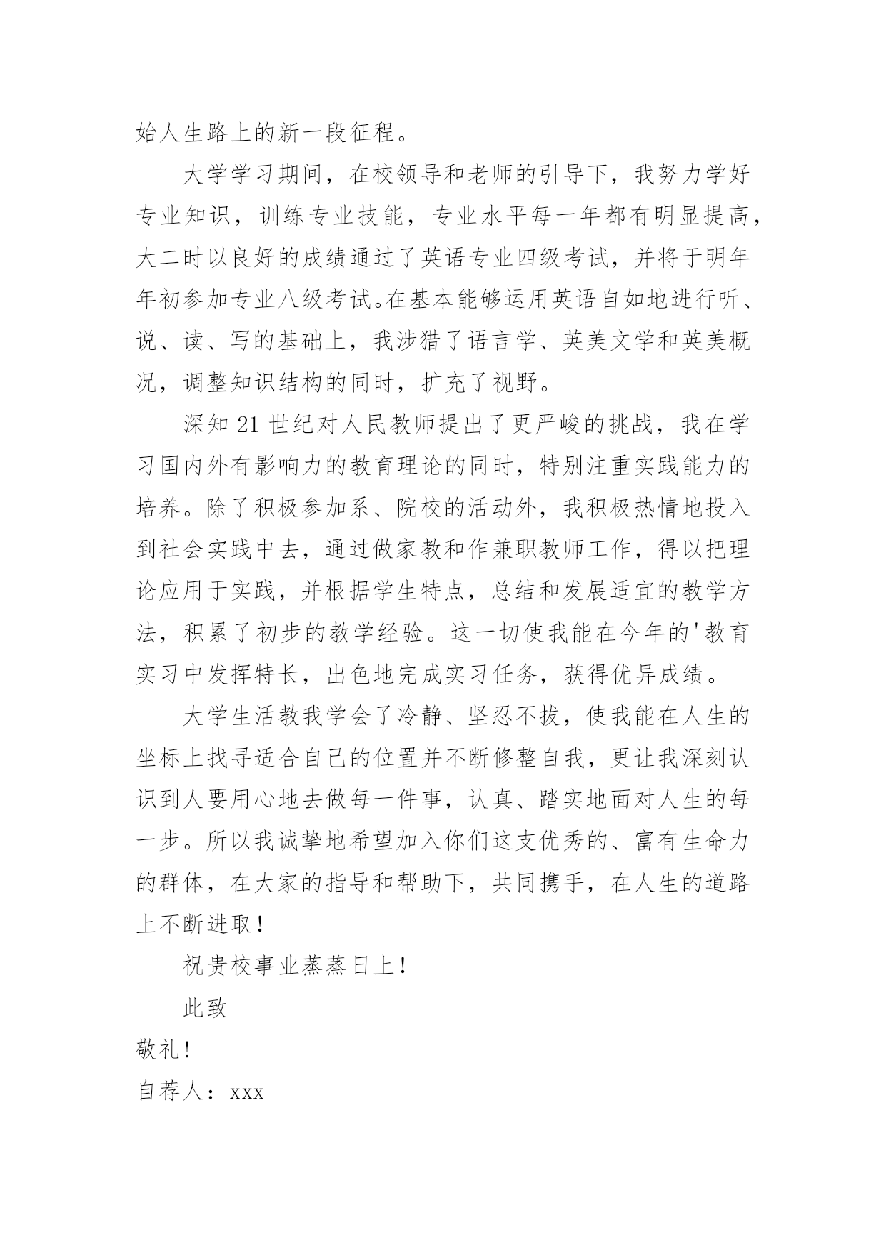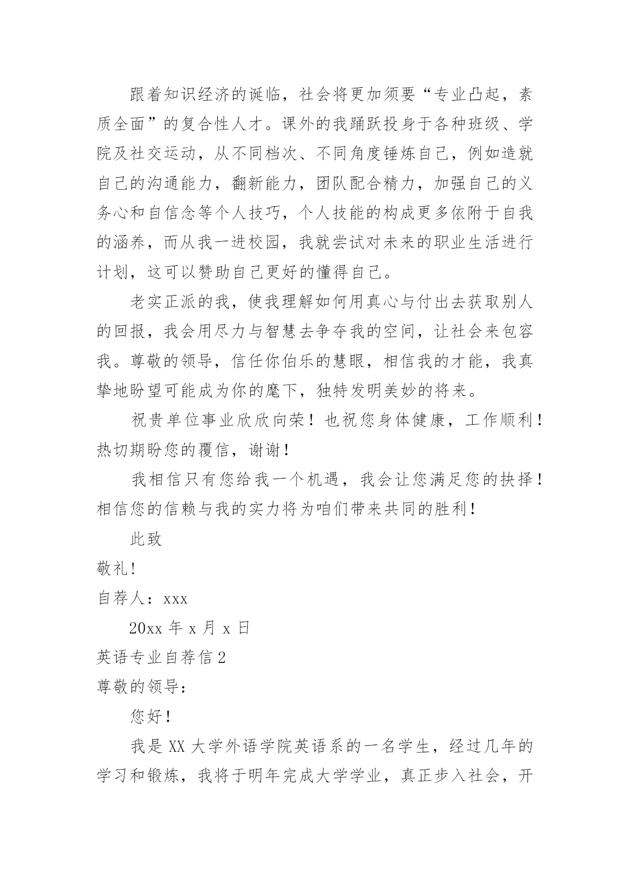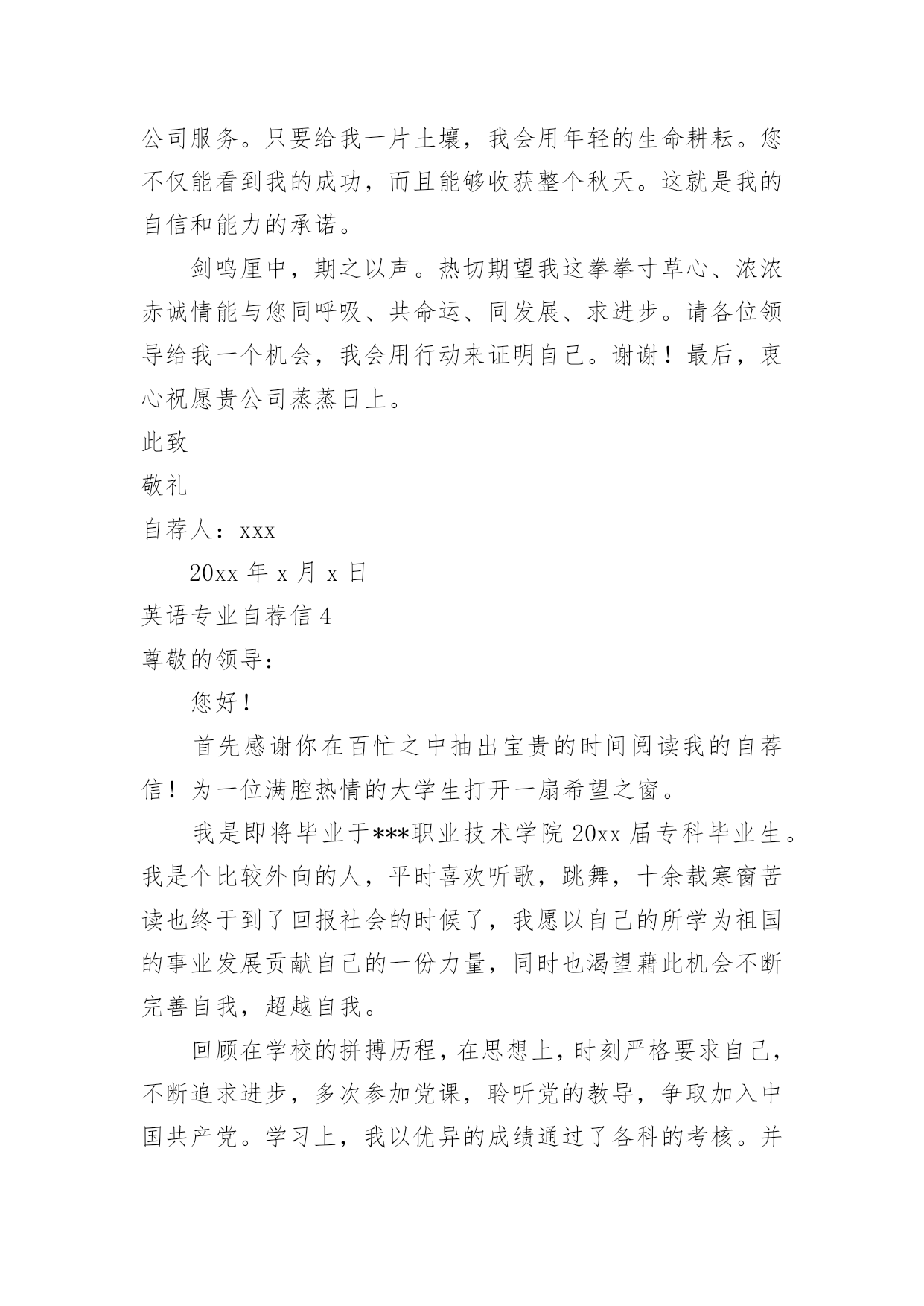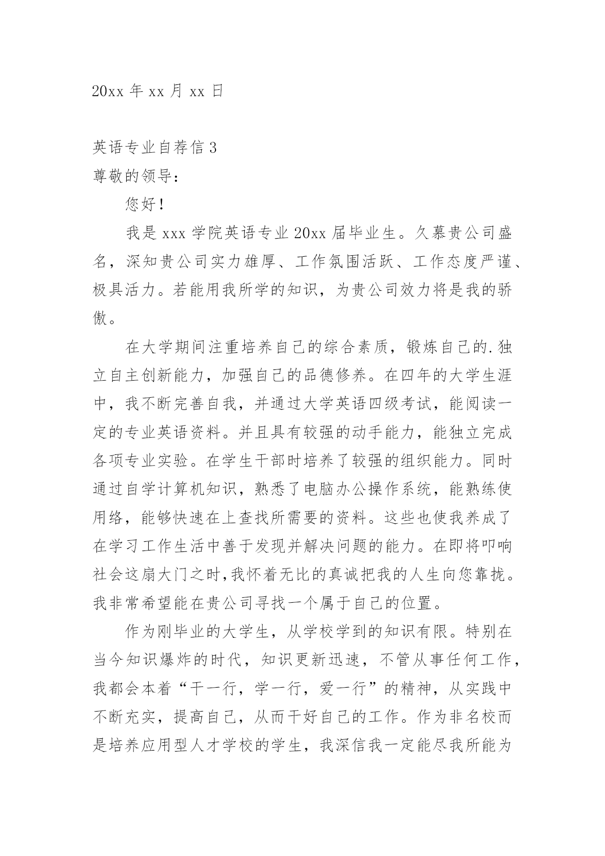 英语专业自荐信 英语专业自荐信在当下的中国社会,自荐信十分的重要,自荐信可以展示出自己的才干和优势。那么什么样的自荐信才是有效的呢?下面是小编为大家整理的英语专业自荐信,欢迎阅读,希望大家能够喜欢。英语专业自荐信1尊敬的领导:我十分感激你在百忙之中惠阅我的自荐资料!我叫葛磊,来自安徽淮北,今年24岁,现为淮北师范大学本国语学院英语专业毕业学生。在大学四年的时间岁月里,我更是惜时如金,一直从各方面严厉地要求自己。由于本人深知未来就是“知识就是力气”的社会,我应用本专业常识跟自己感兴致的领域的信息,对有关信息进行剖析并得出自己的论断,控制相关范畴的动态,熟习相干企业的用人需乞降治理作风,更重要是能够培育晋升自己分析信息能力的程度。除了实现大学里面的'教养纲要请求,并且获得成就优良总评之外,我还大批浏览各方面的知识,通过看报、听播送、看电视、上、与老师、同窗探讨等等,不仅扩展自己的知识面、增加见识,而且辅助自己准确地建立了人生观、价值观:对社会做出自己的奉献!跟着知识经济的诞临,社会将更加须要“专业凸起,素质全面”的复合性人才。课外的我踊跃投身于各种班级、学院及社交运动,从不同档次、不同角度锤炼自己,例如造就自己的沟通能力,翻新能力,团队配合精力,加强自己的义务心和自信念等个人技巧,个人技能的构成更多依附于自我的涵养,而从我一进校园,我就尝试对未来的职业生活进行计划,这可以赞助自己更好的懂得自己。老实正派的我,使我理解如何用真心与付出去获取别人的回报,我会用尽力与智慧去争夺我的空间,让社会来包容我。尊敬的领导,信任你伯乐的慧眼,相信我的才能,我真挚地盼望可能成为你的麾下,独特发明美妙的将来。祝贵单位事业欣欣向荣!也祝您身体健康,工作顺利!热切期盼您的覆信,谢谢!我相信只有您给我一个机遇,我会让您满足您的抉择!相信您的信赖与我的实力将为咱们带来共同的胜利!此致敬礼!自荐人:xxx20xx年x月x日英语专业自荐信2尊敬的领导:您好!我是XX大学外语学院英语系的一名学生,经过几年的学习和锻炼,我将于明年完成大学学业,真正步入社会,开始人生路上的新一段征程。大学学习期间,在校领导和老师的引导下,我努力学好专业知识,训练专业技能,专业水平每一年都有明显提高,大二时以良好的成绩通过了英语专业四级考试,并将于明年年初参加专业八级考试。在基本能够运用英语自如地进行听、说、读、写的基础上,我涉猎了语言学、英美文学和英美概况,调整知识结构的同时,扩充了视野。深知21世纪对人民教师提出了更严峻的挑战,我在学习国内外有影响力的教育理论的同时,特别注重实践能力的培养。除了积极参加系、院校的活动外,我积极热情地投入到社会实践中去,通过做家教和作兼职教师工作,得以把理论应用于实践,并根据学生特点,总结和发展适宜的教学方法,积累了初步的教学经验。这一切使我能在今年的'教育实习中发挥特长,出色地完成实习任务,获得优异成绩。大学生活教我学会了冷静、坚忍不拔,使我能在人生的坐标上找寻适合自己的位置并不断修整自我,更让我深刻认识到人要用心地去做每一件事,认真、踏实地面对人生的每一步。所以我诚挚地希望加入你们这支优秀的、富有生命力的群体,在大家的指导和帮助下,共同携手,在人生的道路上不断进取!祝贵校事业蒸蒸日上!此致敬礼!自荐人:xxx20xx年xx月xx日英语专业自荐信3尊敬的领导:您好!我是xxx学院英语专业20xx届毕业生。久慕贵公司盛名,深知贵公司实力雄厚、工作氛围活跃、工作态度严谨、极具活力。若能用我所学的知识,为贵公司效力将是我的骄傲。在大学期间注重培养自己的综合素质,锻炼自己的.独立自主创新能力,加强自己的品德修养。在四年的大学生涯中,我不断完善自我,并通过大学英语四级考试,能阅读一定的专业英语资料。并且具有较强的动手能力,能独立完成各项专业实验。在学生干部时培养了较强的组织能力。同时通过自学计算机知识,熟悉了电脑办公操作系统,能熟练使用络,能够快速在上查找所需要的资料。这些也使我养成了在学习工作生活中善于发现并解决问题的能力。在即将叩响社会这扇大门之时,我怀着无比的真诚把我的人生向您靠拢。我非常希望能在贵公司寻找一个属于自己的位置。作为刚毕业的大学生,从学校学到的知识有限。特别在当今知识爆炸的时代,知识更新迅速,不管从事任何工作,我都会本着“干一行,学一行,爱一行”的精神,从实践中不断充实,提高自己,从而干好自己的工作。作为非名校而是培养应用型人才学校的学生,我深信我一定能尽我所能为公司服务。只要给我一片土壤,我会用年轻的生命耕耘。您不仅能看到我的成功,而且能够收获整个秋天。这就是我的自信和能力的承诺。剑鸣厘中,期之以声。热切期望我这拳拳寸草心、浓浓赤诚情能与您同呼吸、共命运、同发展、求进步。请各位领导给我一个机会,我会用行动来证明自己。谢谢!最后,衷心祝