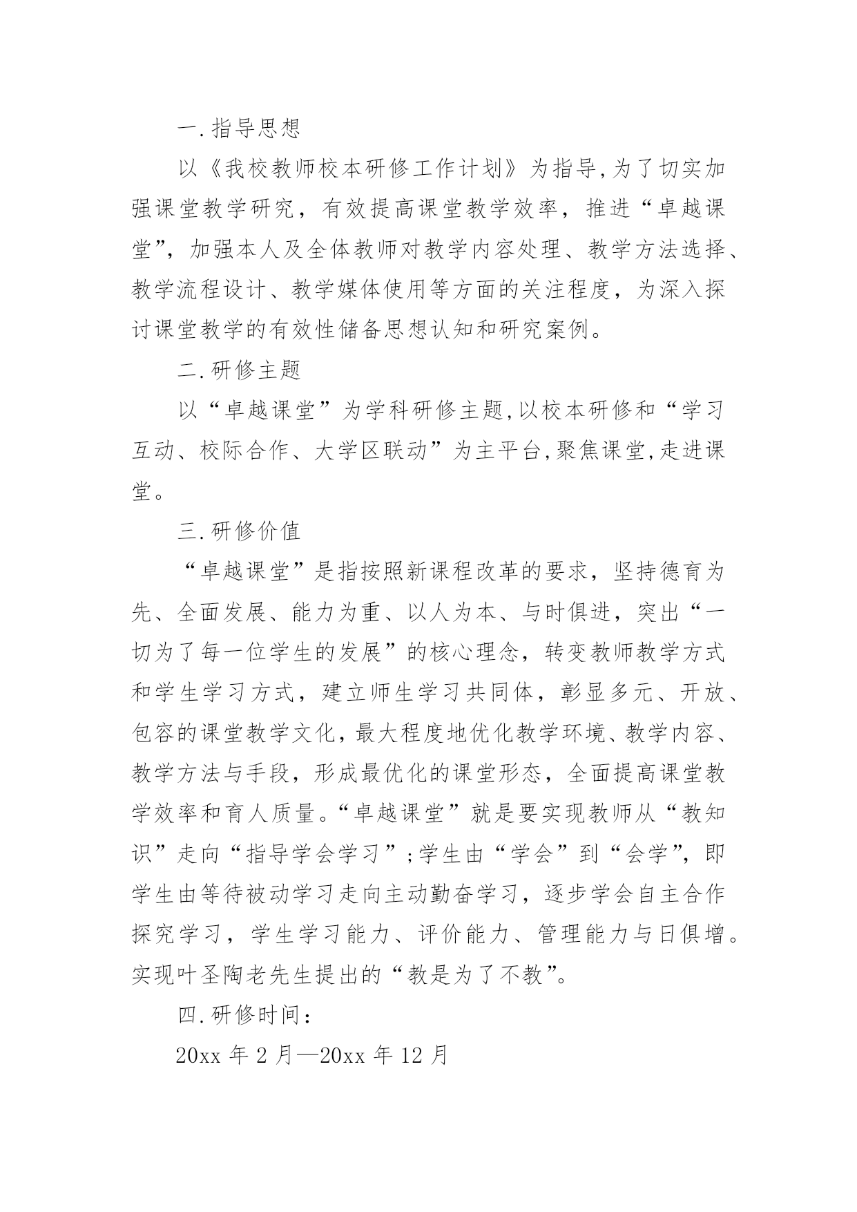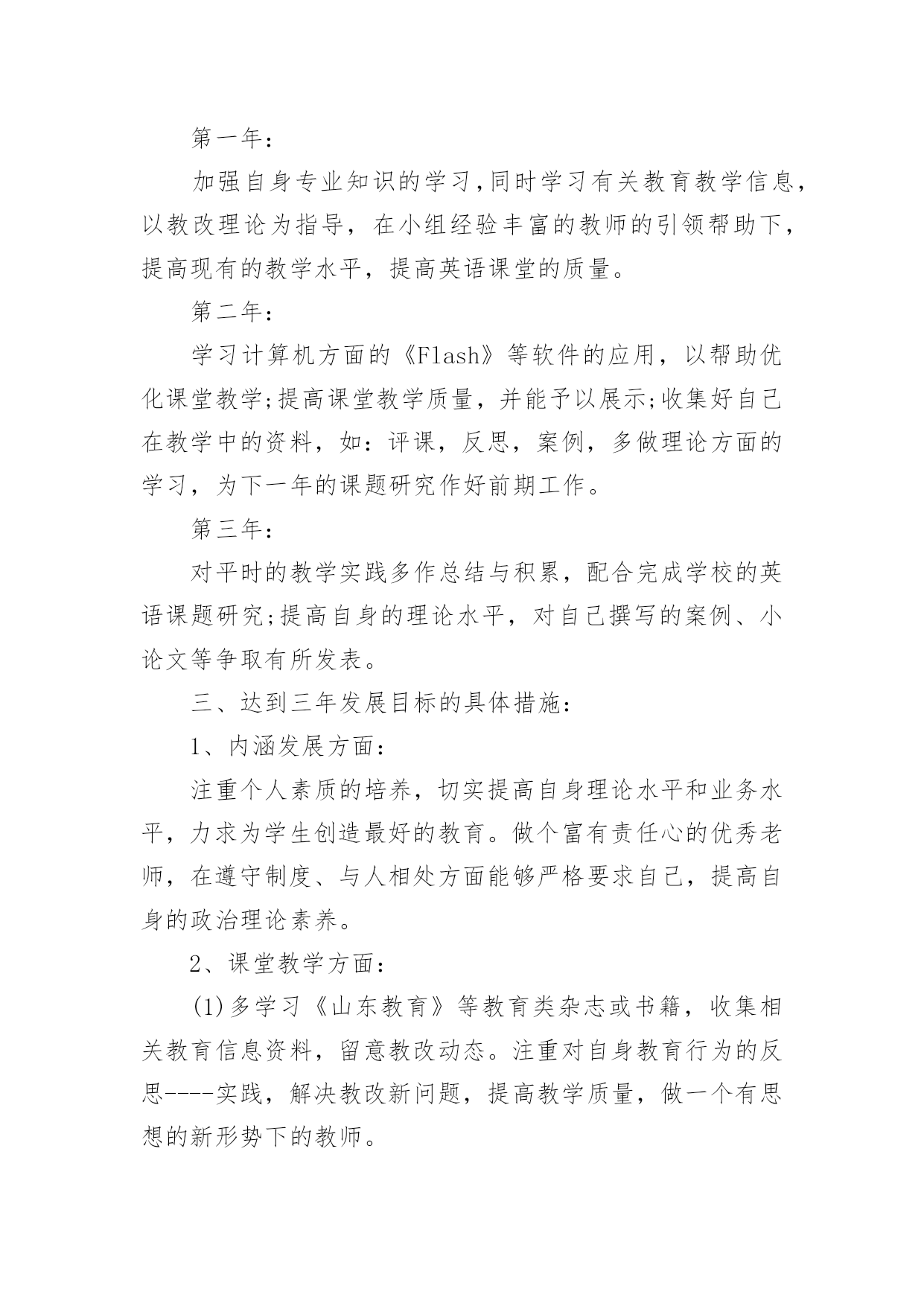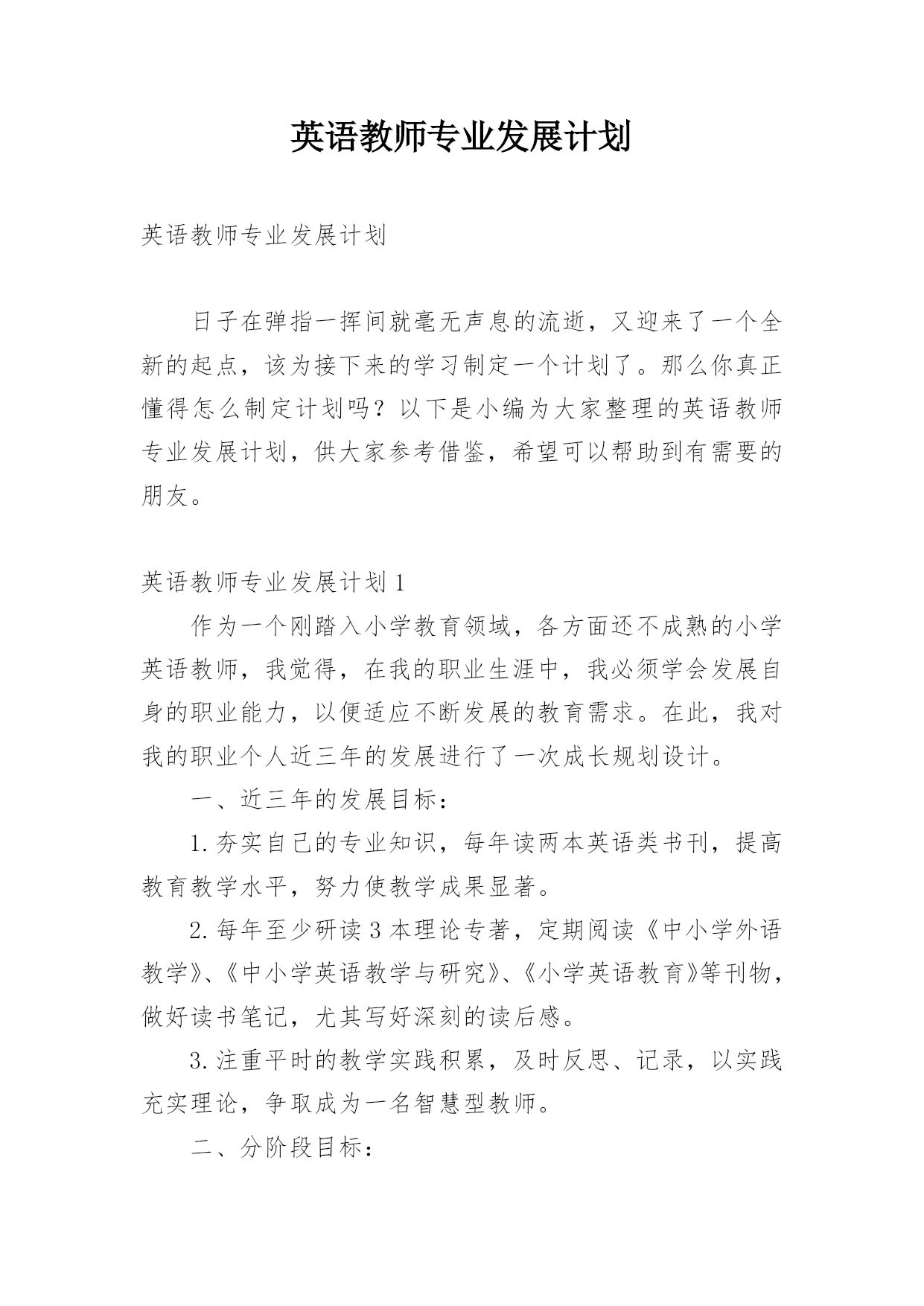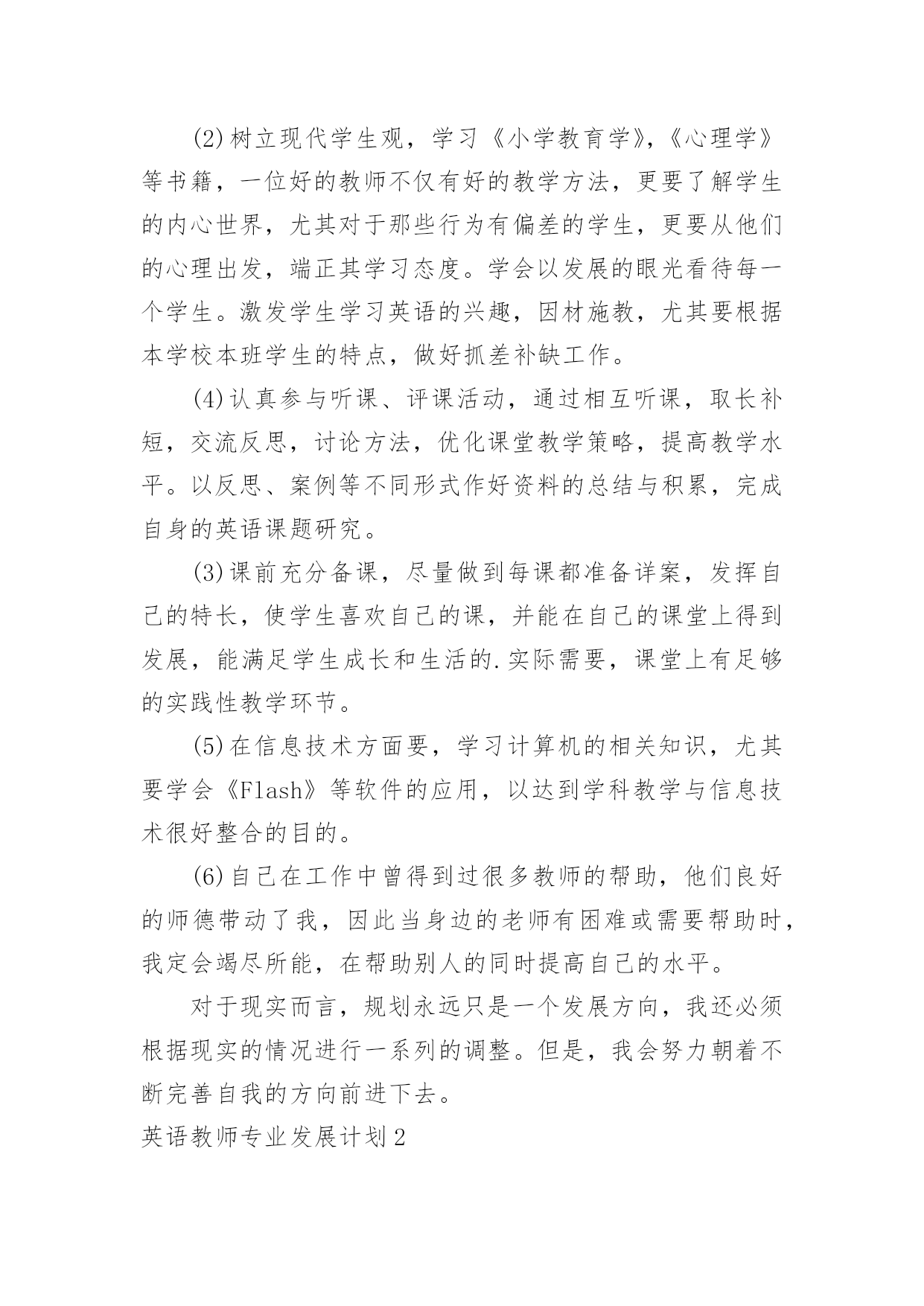 英语教师专业发展计划 英语教师专业发展计划日子在弹指一挥间就毫无声息的流逝,又迎来了一个全新的起点,该为接下来的学习制定一个计划了。那么你真正懂得怎么制定计划吗?以下是小编为大家整理的英语教师专业发展计划,供大家参考借鉴,希望可以帮助到有需要的朋友。英语教师专业发展计划1作为一个刚踏入小学教育领域,各方面还不成熟的小学英语教师,我觉得,在我的职业生涯中,我必须学会发展自身的职业能力,以便适应不断发展的教育需求。在此,我对我的职业个人近三年的发展进行了一次成长规划设计。一、近三年的发展目标:1.夯实自己的专业知识,每年读两本英语类书刊,提高教育教学水平,努力使教学成果显著。2.每年至少研读3本理论专著,定期阅读《中小学外语教学》、《中小学英语教学与研究》、《小学英语教育》等刊物,做好读书笔记,尤其写好深刻的读后感。3.注重平时的教学实践积累,及时反思、记录,以实践充实理论,争取成为一名智慧型教师。二、分阶段目标:第一年:加强自身专业知识的学习,同时学习有关教育教学信息,以教改理论为指导,在小组经验丰富的教师的引领帮助下,提高现有的教学水平,提高英语课堂的质量。第二年:学习计算机方面的《Flash》等软件的应用,以帮助优化课堂教学;提高课堂教学质量,并能予以展示;收集好自己在教学中的资料,如:评课,反思,案例,多做理论方面的学习,为下一年的课题研究作好前期工作。第三年:对平时的教学实践多作总结与积累,配合完成学校的英语课题研究;提高自身的理论水平,对自己撰写的案例、小论文等争取有所发表。三、达到三年发展目标的具体措施:1、内涵发展方面:注重个人素质的培养,切实提高自身理论水平和业务水平,力求为学生创造最好的教育。做个富有责任心的优秀老师,在遵守制度、与人相处方面能够严格要求自己,提高自身的政治理论素养。2、课堂教学方面:(1)多学习《山东教育》等教育类杂志或书籍,收集相关教育信息资料,留意教改动态。注重对自身教育行为的反思----实践,解决教改新问题,提高教学质量,做一个有思想的新形势下的教师。(2)树立现代学生观,学习《小学教育学》,《心理学》等书籍,一位好的教师不仅有好的教学方法,更要了解学生的内心世界,尤其对于那些行为有偏差的学生,更要从他们的心理出发,端正其学习态度。学会以发展的眼光看待每一个学生。激发学生学习英语的兴趣,因材施教,尤其要根据本学校本班学生的特点,做好抓差补缺工作。(4)认真参与听课、评课活动,通过相互听课,取长补短,交流反思,讨论方法,优化课堂教学策略,提高教学水平。以反思、案例等不同形式作好资料的总结与积累,完成自身的英语课题研究。(3)课前充分备课,尽量做到每课都准备详案,发挥自己的特长,使学生喜欢自己的课,并能在自己的课堂上得到发展,能满足学生成长和生活的.实际需要,课堂上有足够的实践性教学环节。(5)在信息技术方面要,学习计算机的相关知识,尤其要学会《Flash》等软件的应用,以达到学科教学与信息技术很好整合的目的。(6)自己在工作中曾得到过很多教师的帮助,他们良好的师德带动了我,因此当身边的老师有困难或需要帮助时,我定会竭尽所能,在帮助别人的同时提高自己的水平。对于现实而言,规划永远只是一个发展方向,我还必须根据现实的情况进行一系列的调整。但是,我会努力朝着不断完善自我的方向前进下去。英语教师专业发展计划2一.指导思想以《我校教师校本研修工作计划》为指导,为了切实加强课堂教学研究,有效提高课堂教学效率,推进“卓越课堂”,加强本人及全体教师对教学内容处理、教学方法选择、教学流程设计、教学媒体使用等方面的关注程度,为深入探讨课堂教学的有效性储备思想认知和研究案例。二.研修主题以“卓越课堂”为学科研修主题,以校本研修和“学习互动、校际合作、大学区联动”为主平台,聚焦课堂,走进课堂。三.研修价值“卓越课堂”是指按照新课程改革的要求,坚持德育为先、全面发展、能力为重、以人为本、与时俱进,突出“一切为了每一位学生的发展”的核心理念,转变教师教学方式和学生学习方式,建立师生学习共同体,彰显多元、开放、包容的课堂教学文化,最大程度地优化教学环境、教学内容、教学方法与手段,形成最优化的课堂形态,全面提高课堂教学效率和育人质量。“卓越课堂”就是要实现教师从“教知识”走向“指导学会学习”;学生由“学会”到“会学”,即学生由等待被动学习走向主动勤奋学习,逐步学会自主合作探究学习,学生学习能力、评价能力、管理能力与日俱增。实现叶圣陶老先生提出的“教是为了不教”。四.研修时间:20xx年2月—20xx年12月五.研修形式:个人学习、个人参与、学科组集体研讨。六.具体措施1、积极参加学校的常规教研活动,主动承担学校组织的卓越课堂的研究课、示范课.在实践活动中丰富自己的教学经验.每周至少听课一节,通过听课、评课等形式,不断提